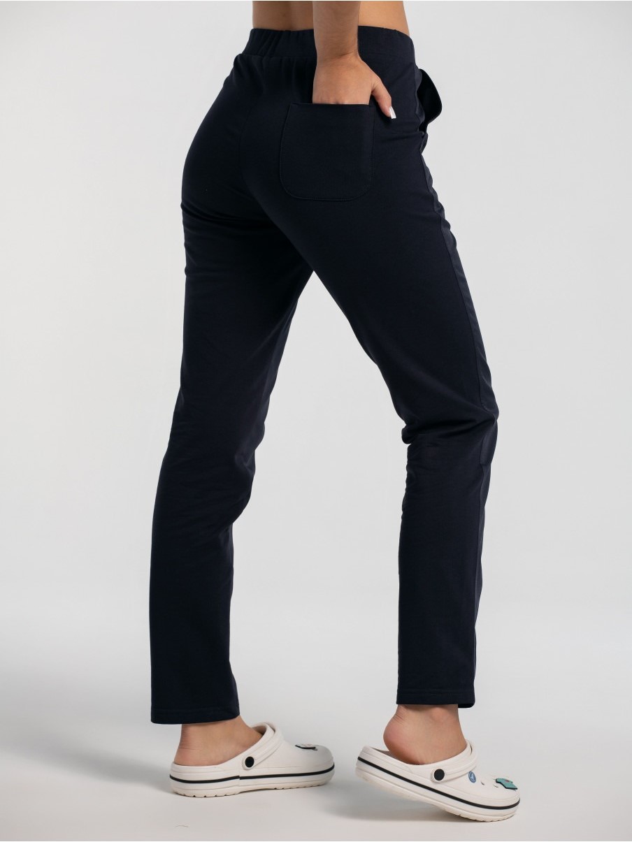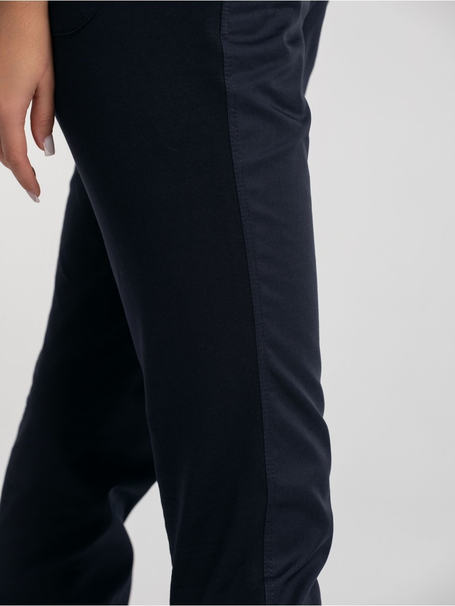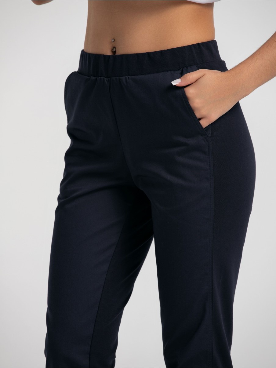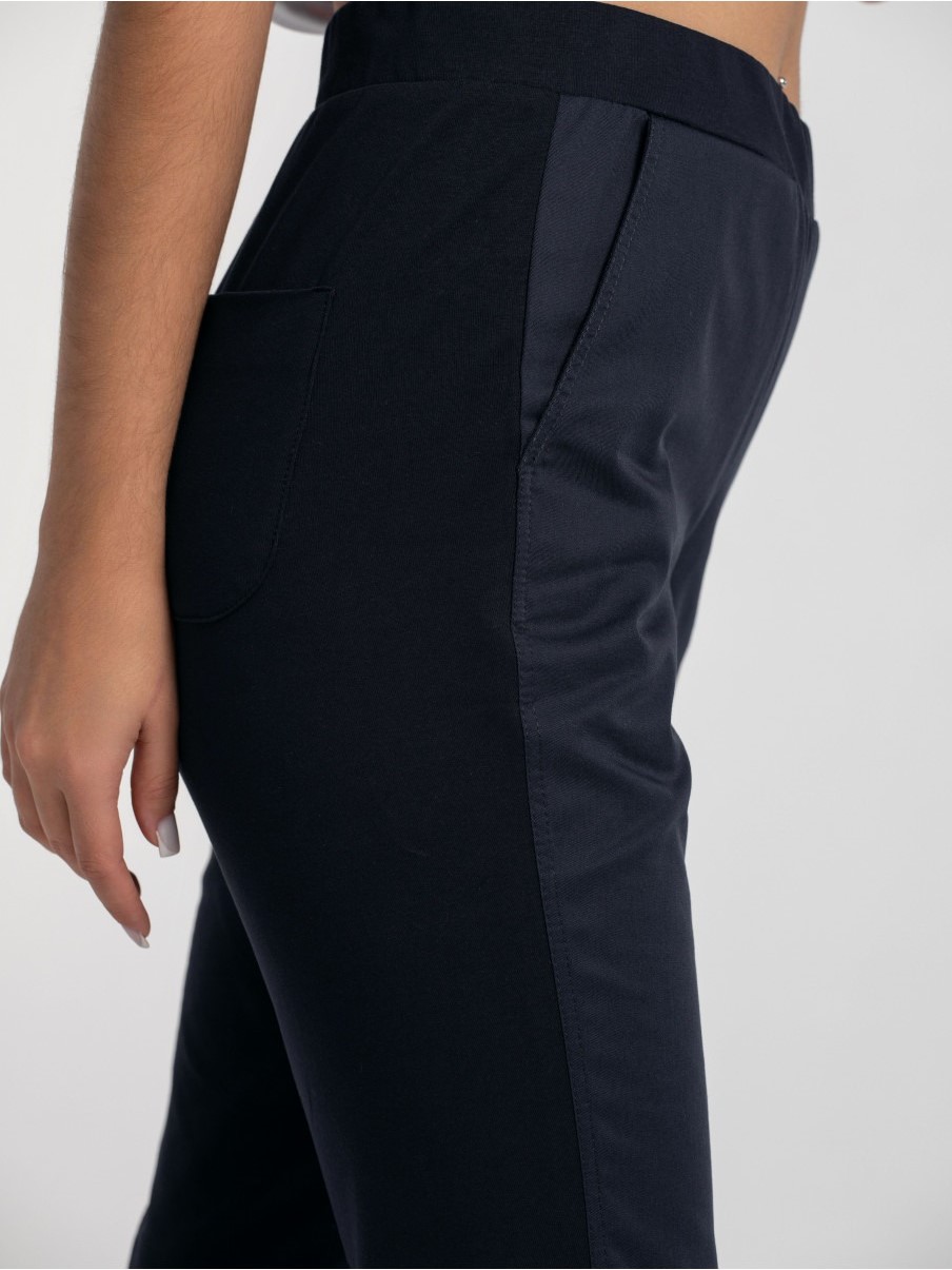 Брюки женские 7/8 комбинированные с притачным трикотажным поясом на резинке Б040. На передних половинках обработаны боковые карманы со скошенным входом в карман. Задние половинки выполнены из трикотажа. Боковые швы смещены в сторону передних половинок. На правой задней половинке обработан карман с овальным нижним краем. По верхнему краю заднего кармана выполнена вышивка - дорожка фирменного знака нитками в цвет передней половинки брюк.