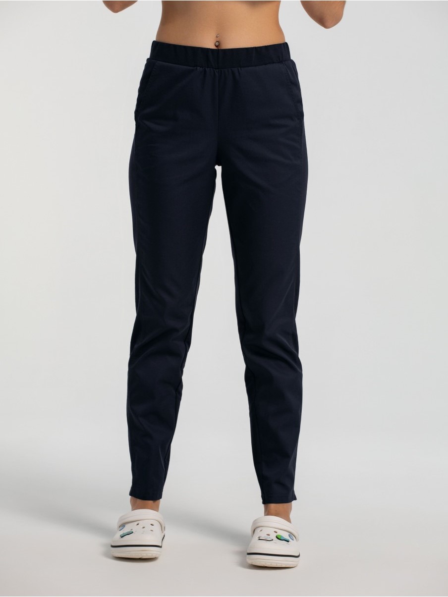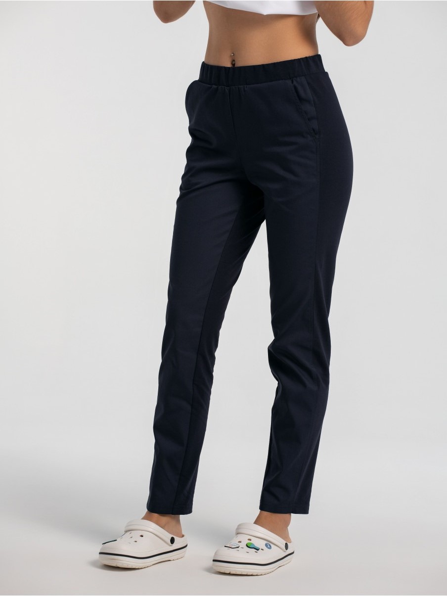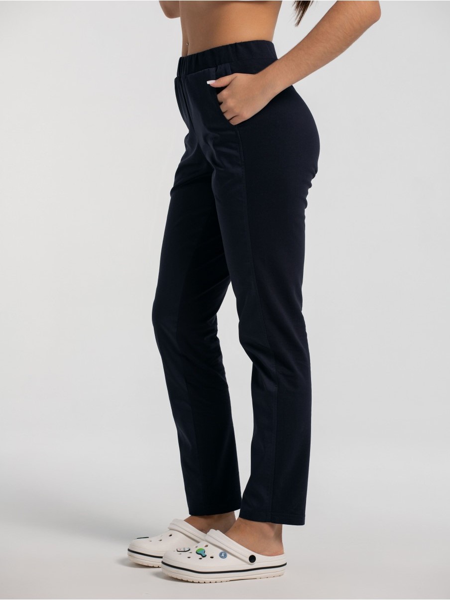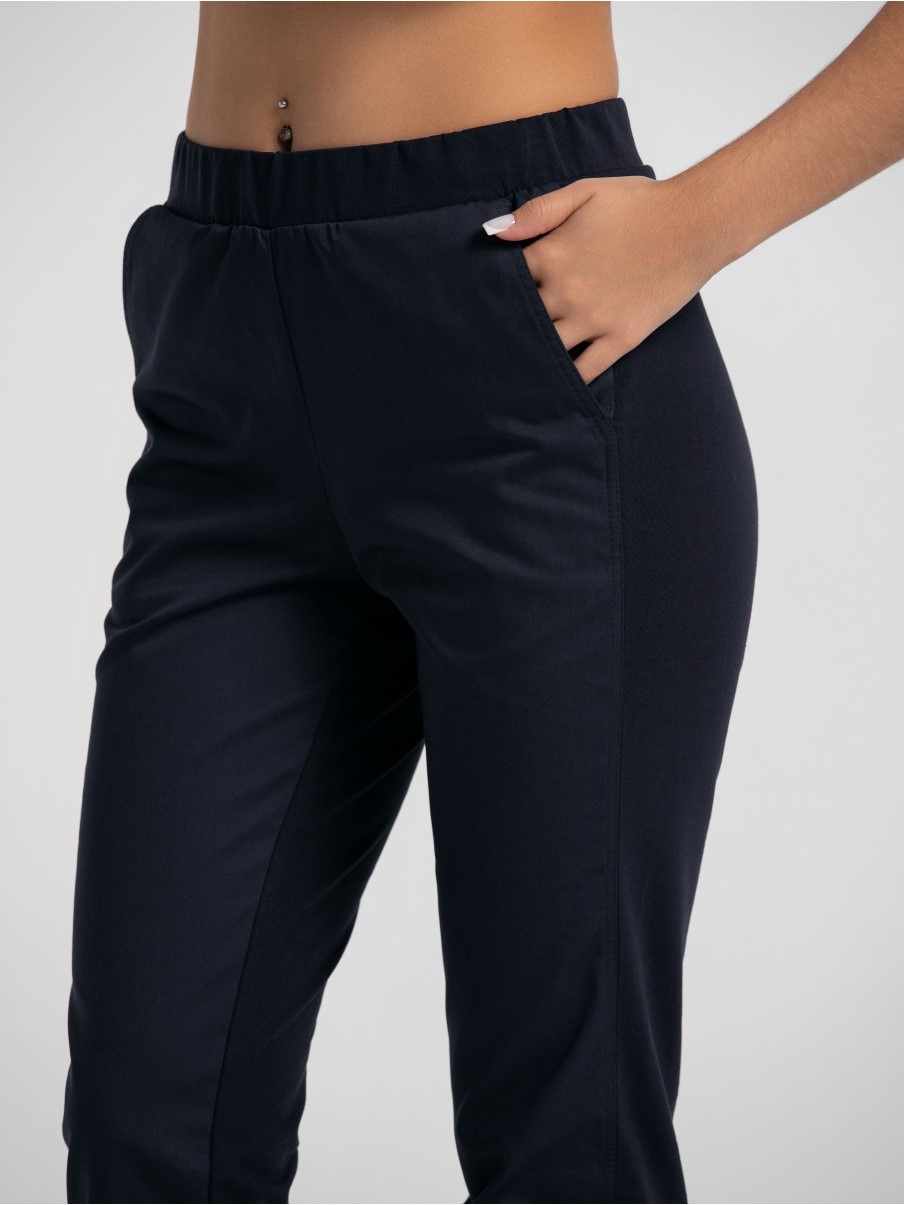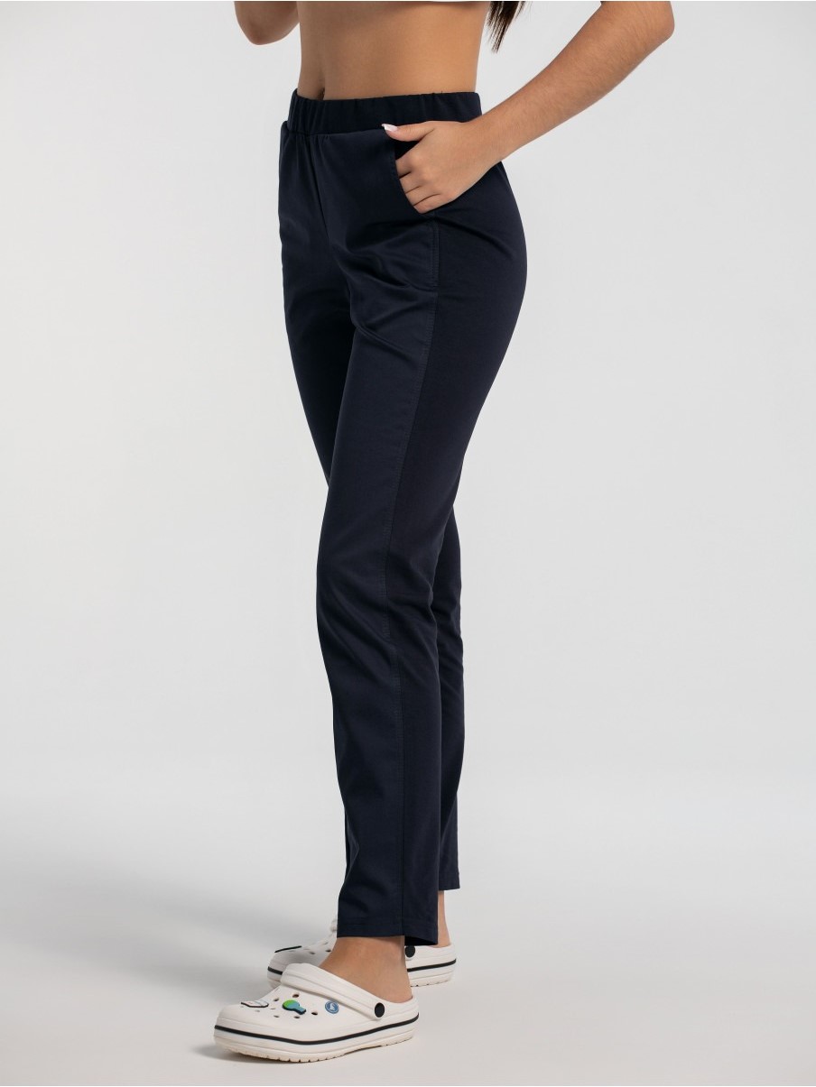 Брюки женские 7/8 комбинированные с притачным трикотажным поясом на резинке Б040. На передних половинках обработаны боковые карманы со скошенным входом в карман. Задние половинки выполнены из трикотажа. Боковые швы смещены в сторону передних половинок. На правой задней половинке обработан карман с овальным нижним краем. По верхнему краю заднего кармана выполнена вышивка - дорожка фирменного знака нитками в цвет передней половинки брюк.