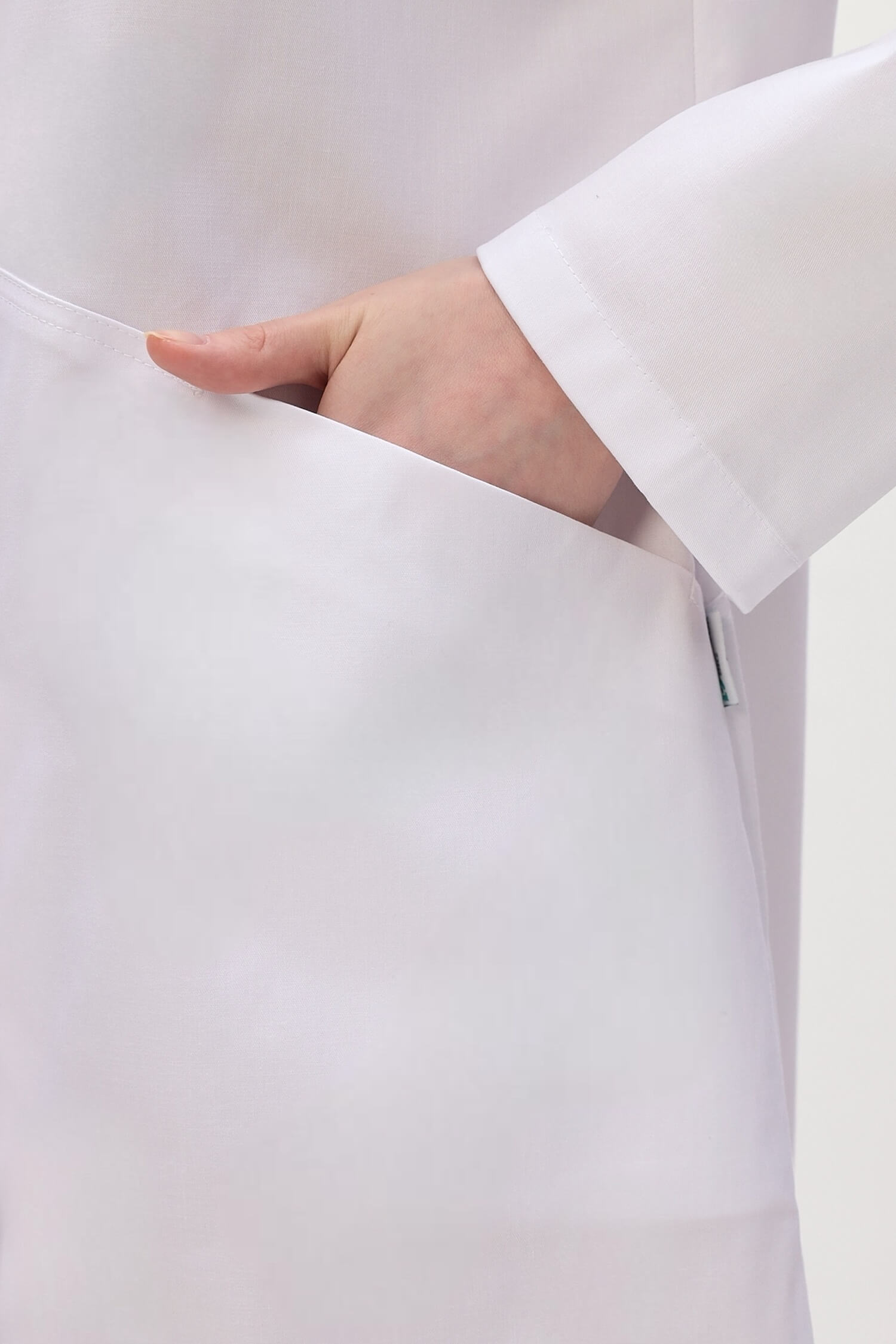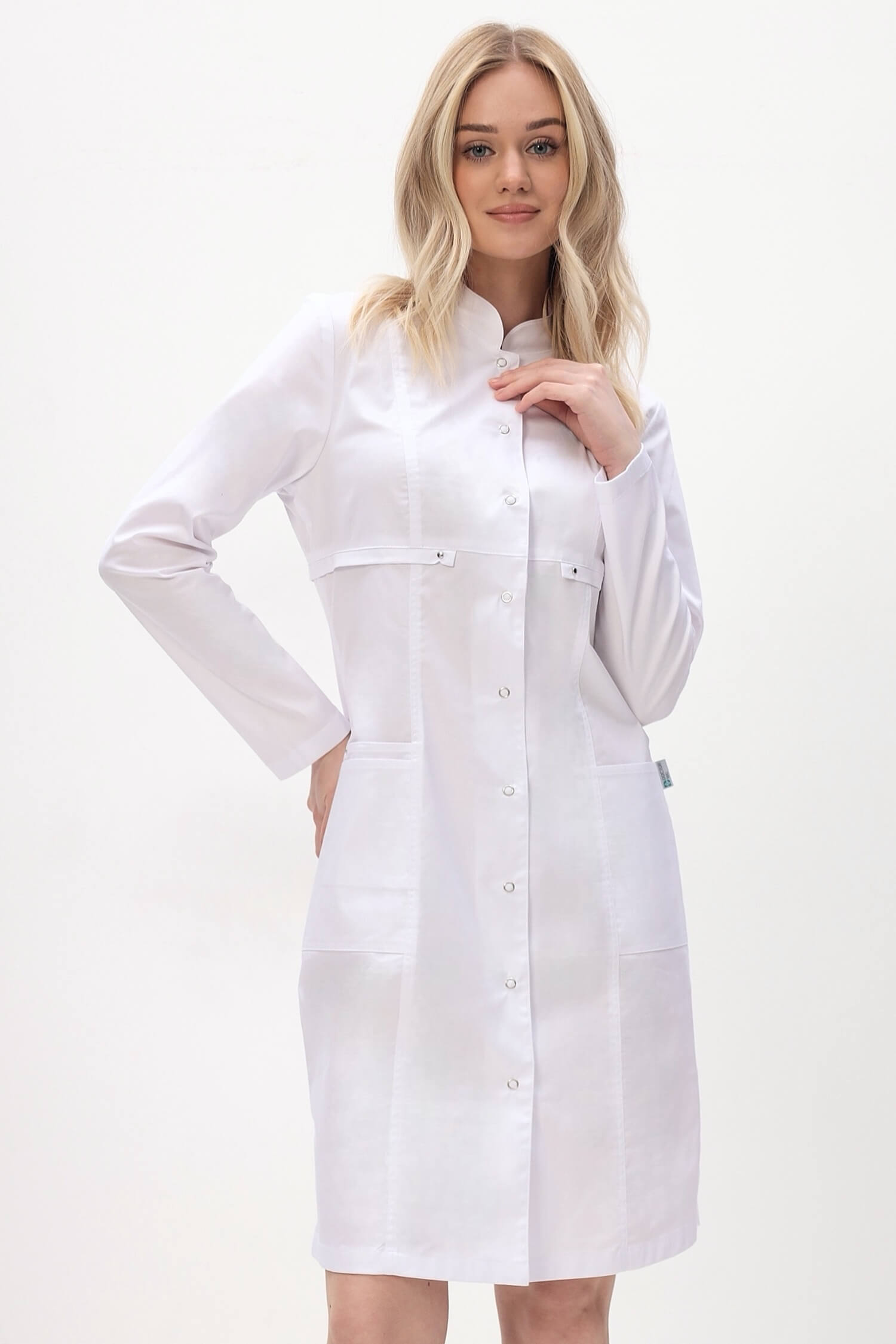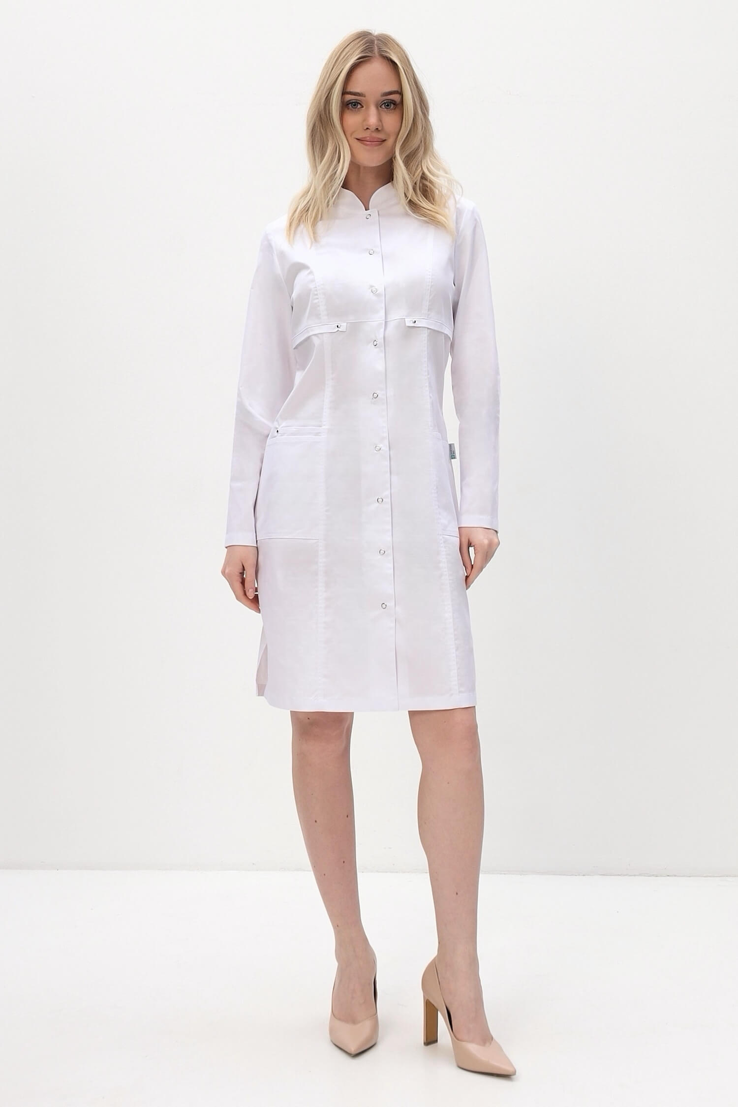 Прилегающий крой изящных линий халата подчеркнет Ваш силуэт. Узкий воротник-стойка удлинит линию шеи, тем самым добавит грации вашему образу, а высокое качество ткани Ultra подарит ощущения удобства и комфорта в повседневном использовании: длина до середины колена с небольшими боковыми разрезами, рукава имеют широкую манжету с возможностью подвернуть ее. Халат имеет 2 нижних накладных кармана, объёмного формата, внутри одного из которых расположен дополнительный, для хранения телефона или пропуска. Данная модель разработана с учетом всех тонкостей Вашей работы. Благодаря добавлению спандекса одежда меньше мнётся и приятно прилегает к телу, не сковывая движений. А высокое содержание хлопка в составе позволяет носить вещи даже в очень теплую погоду, за счет чего халат обладает большой воздухопроницаемостью и комфортен в носке.