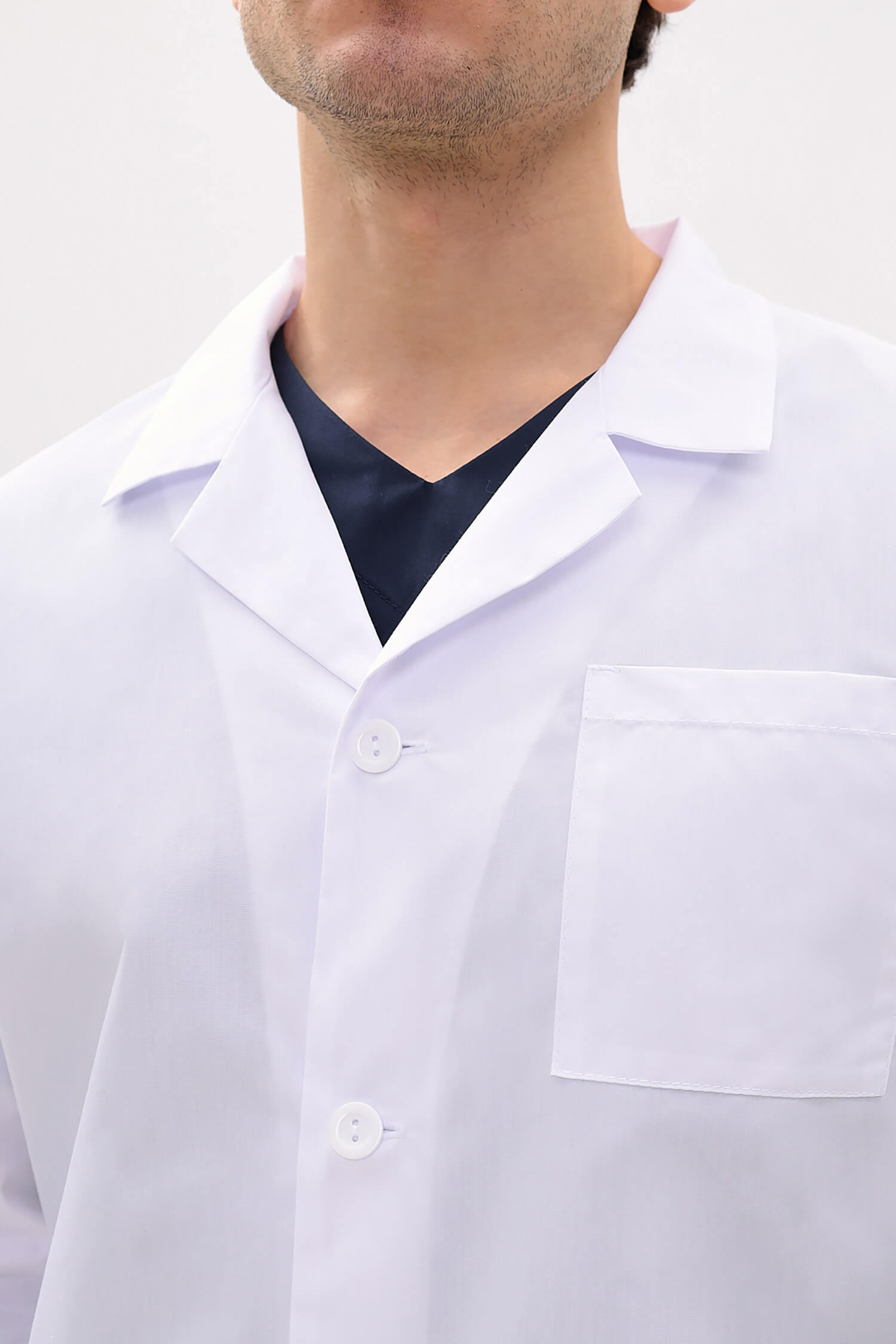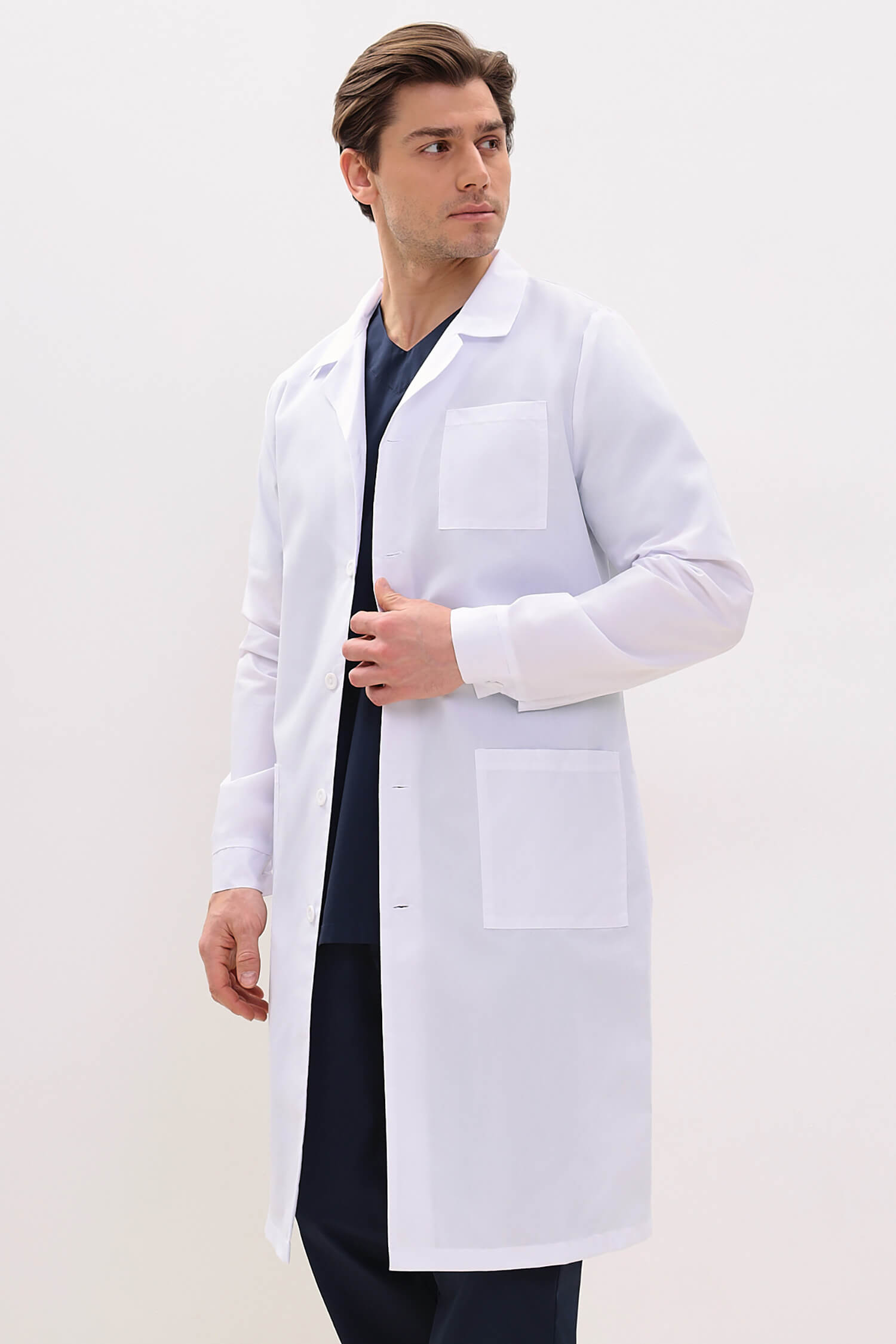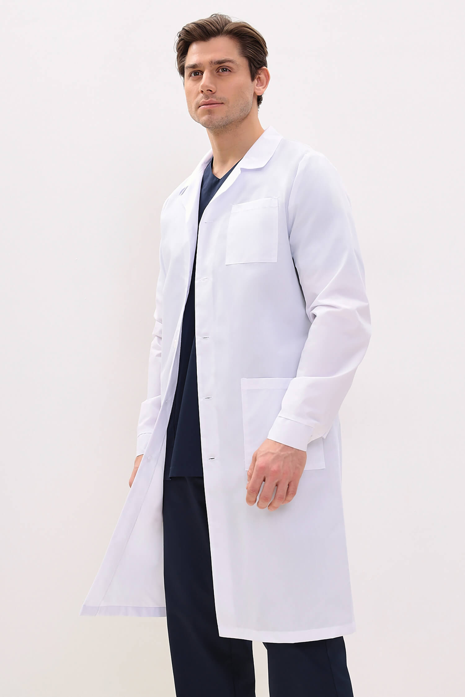 Современная модель мужского в меру укороченного медицинского халата.