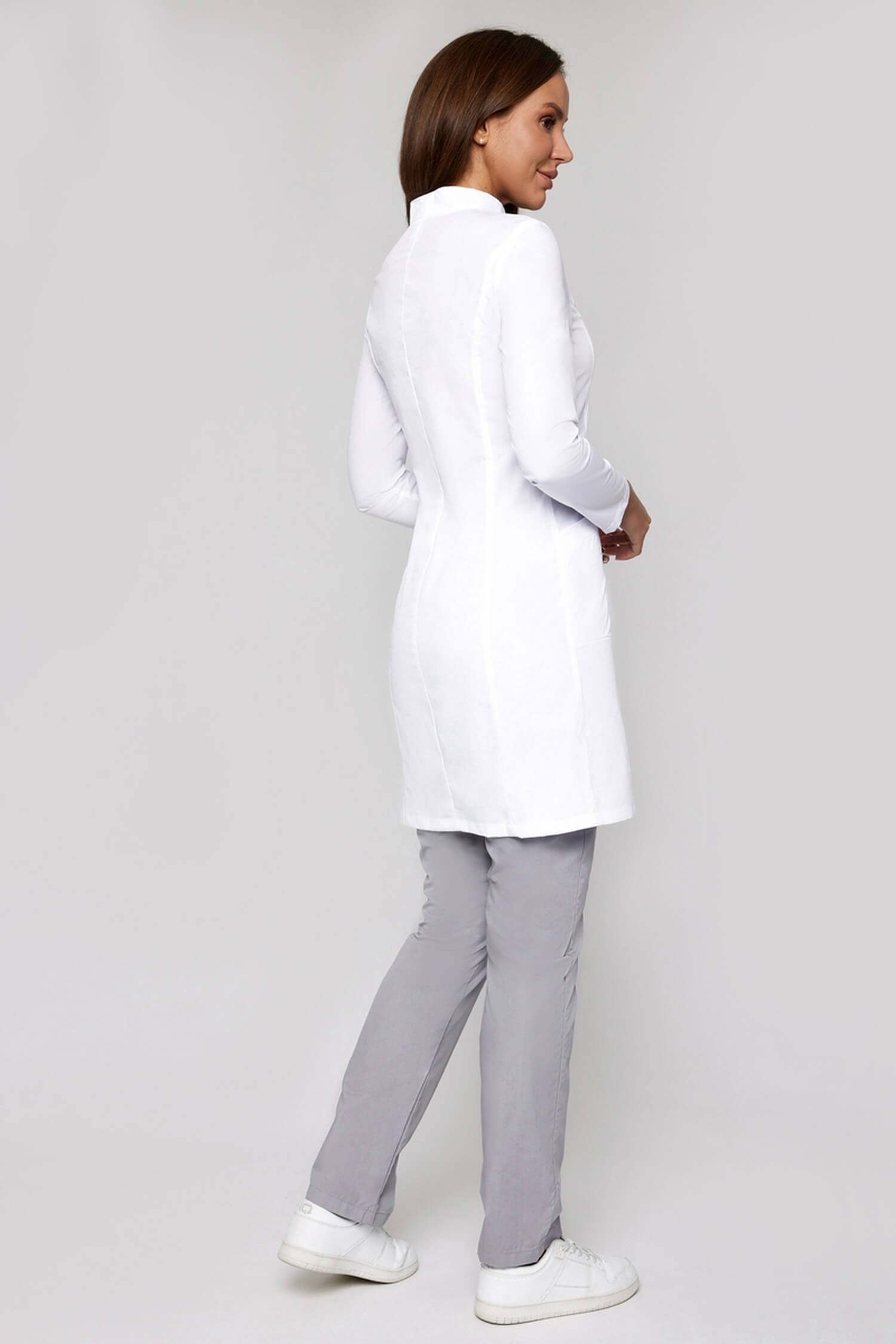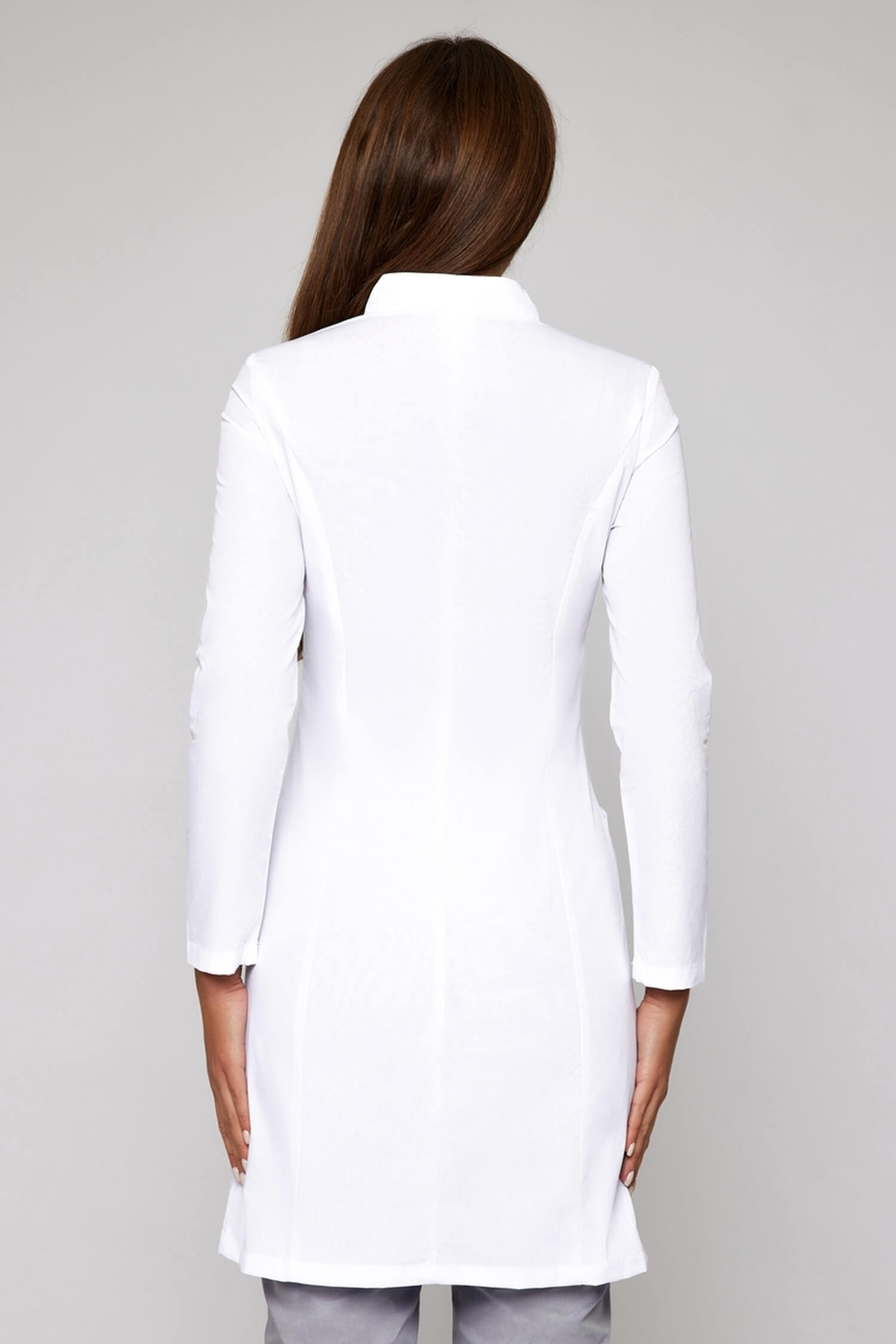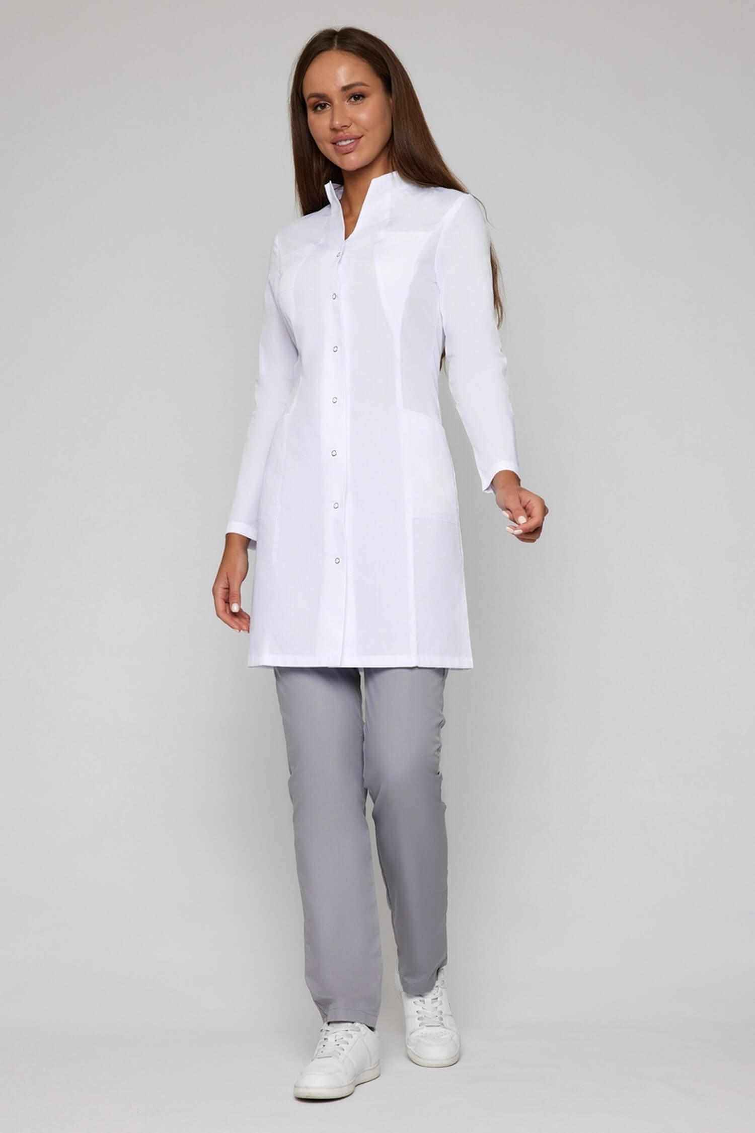 Классическая модель до колена впишется в корпоративный стиль учреждения с самым строгим дресс-кодом. Рельефы по спинке и полочке сформируют привлекательный силуэт. Стройнящий эффект медицинского халата достигается за счет вертикальных швов. Воротник-стойка добавляет образу строгости и изящества. Модель прекрасно подойдет для руководителей высшего звена. Длинный рукав и застежка на кнопках делают халат практичным и удобным.