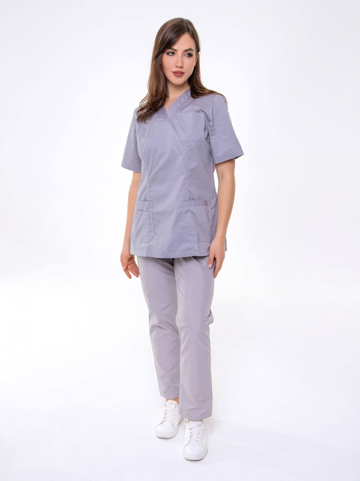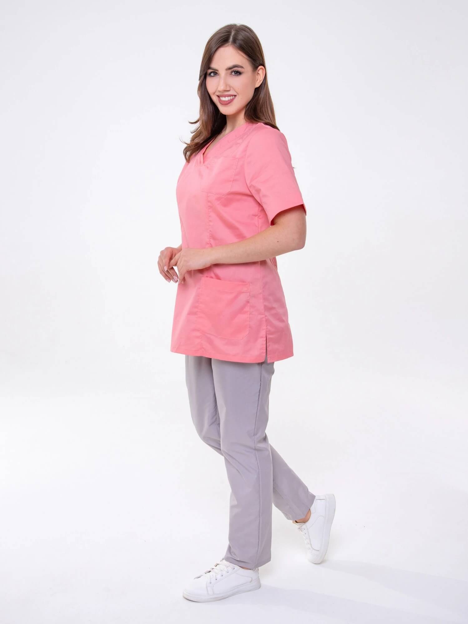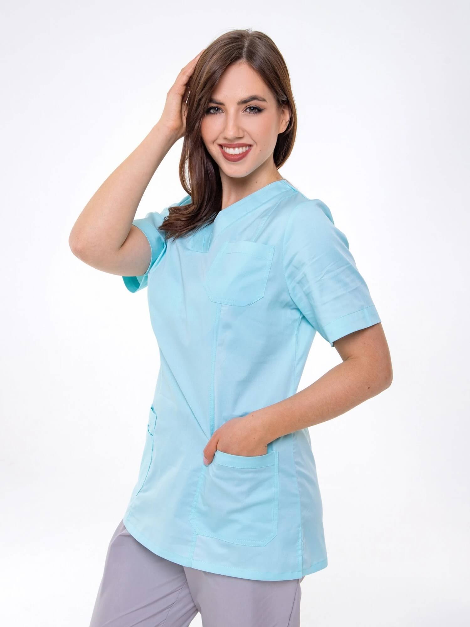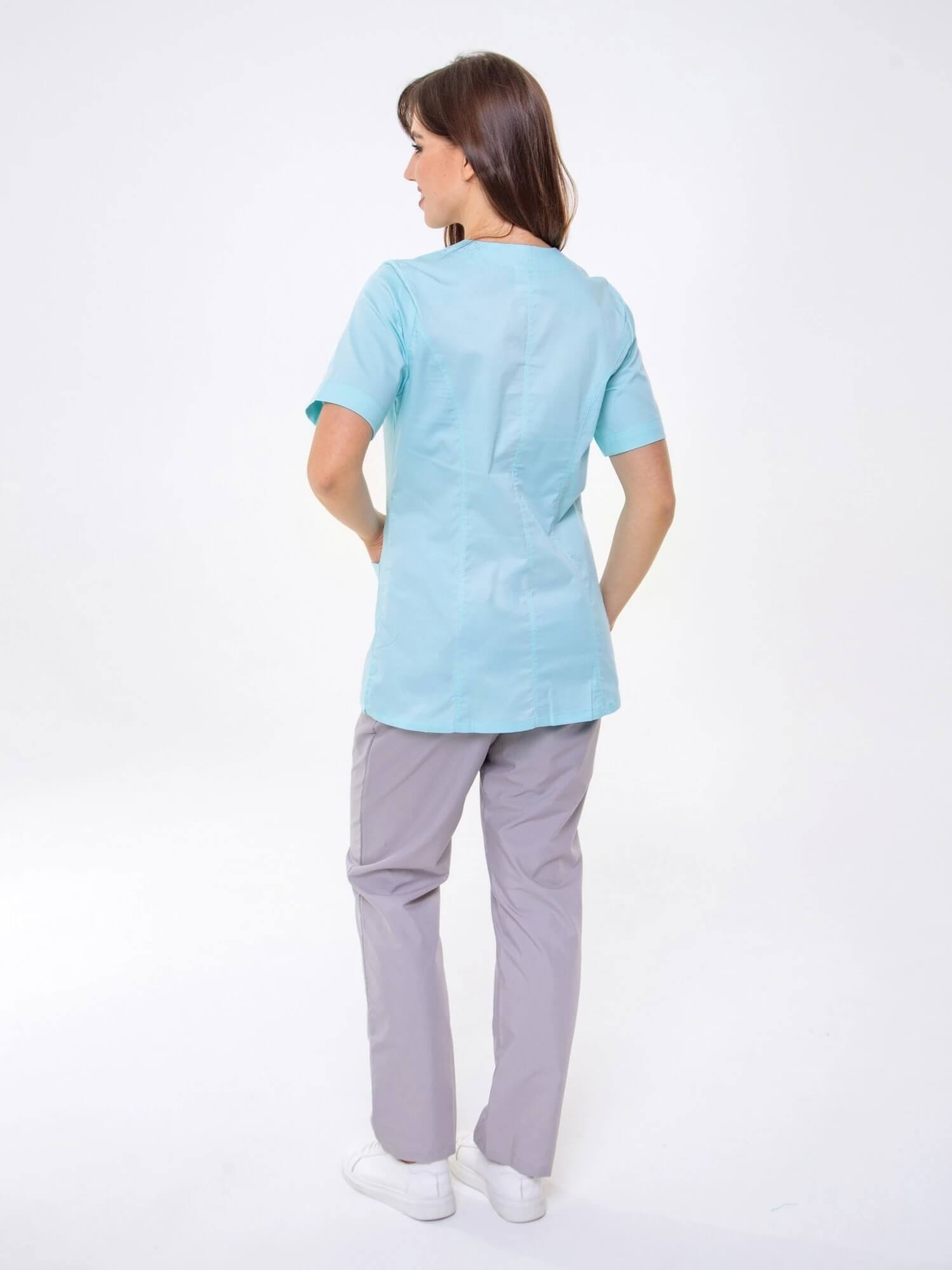 Женский жакет с рельефами, V-образным вырезом, коротким рукавом, карманами, по бокам разрезы.