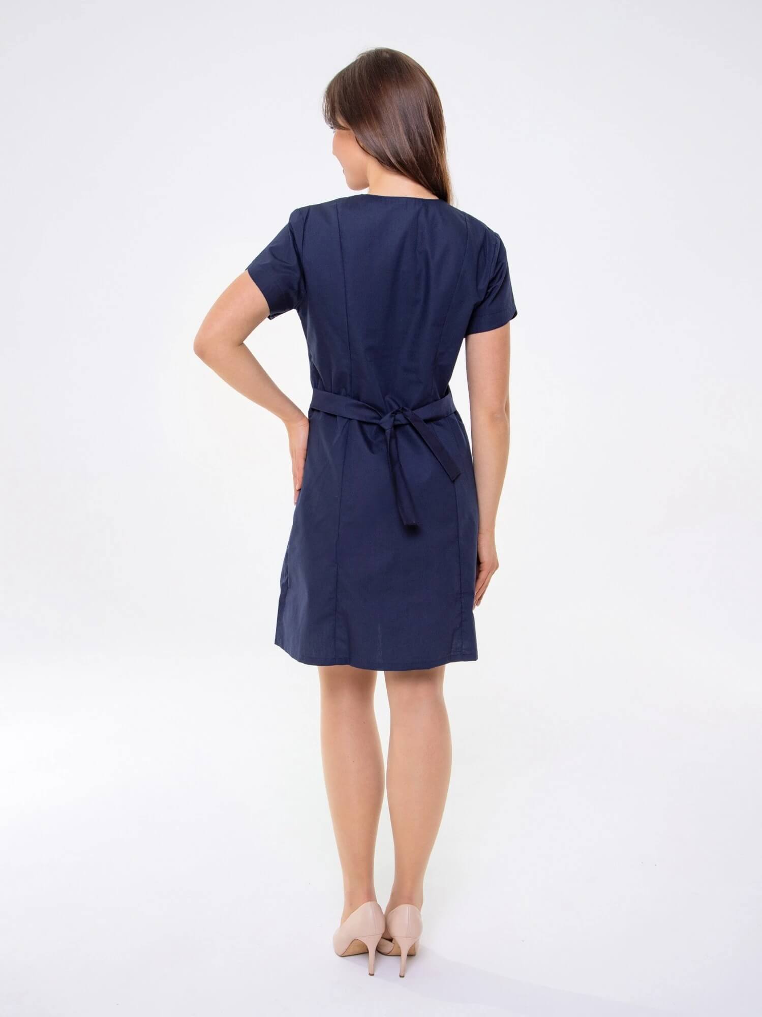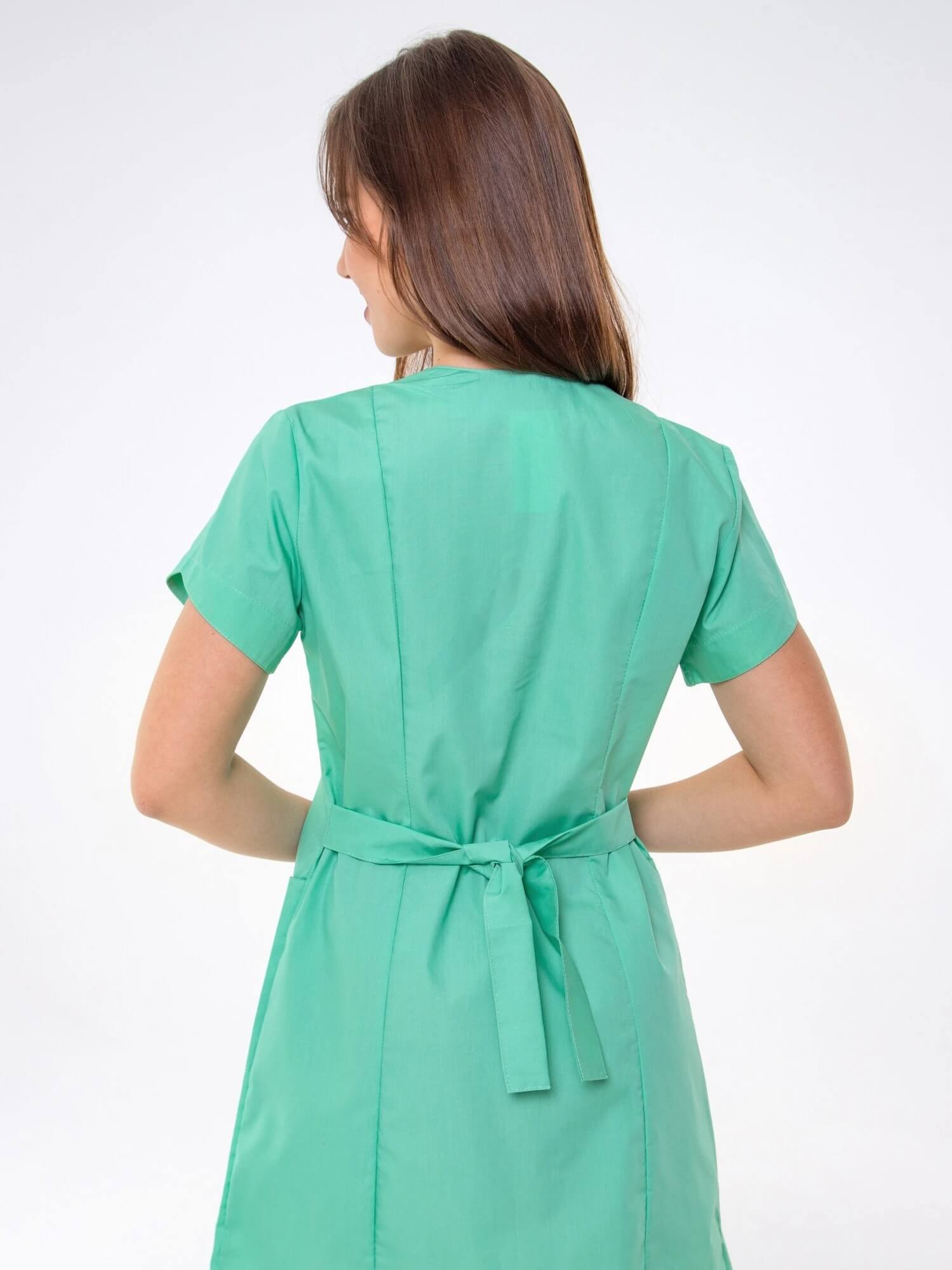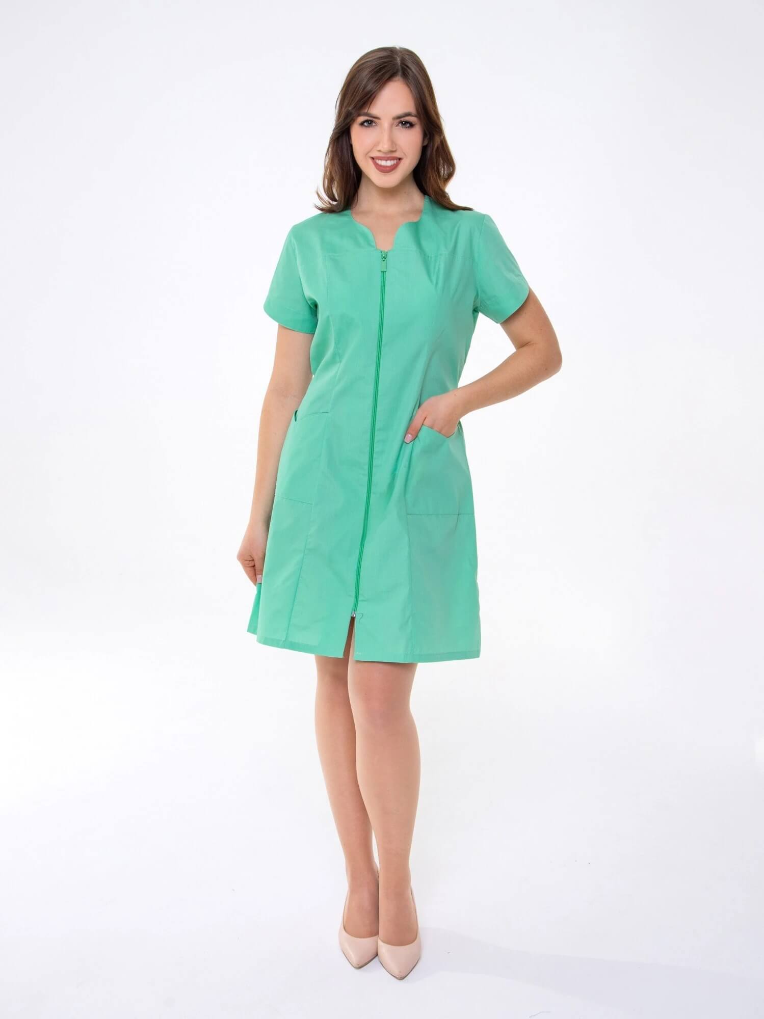 Медицинский женский халат с фигурными карманами и воротом, рельефами, коротким рукавом и центральной застежкой на молнии.