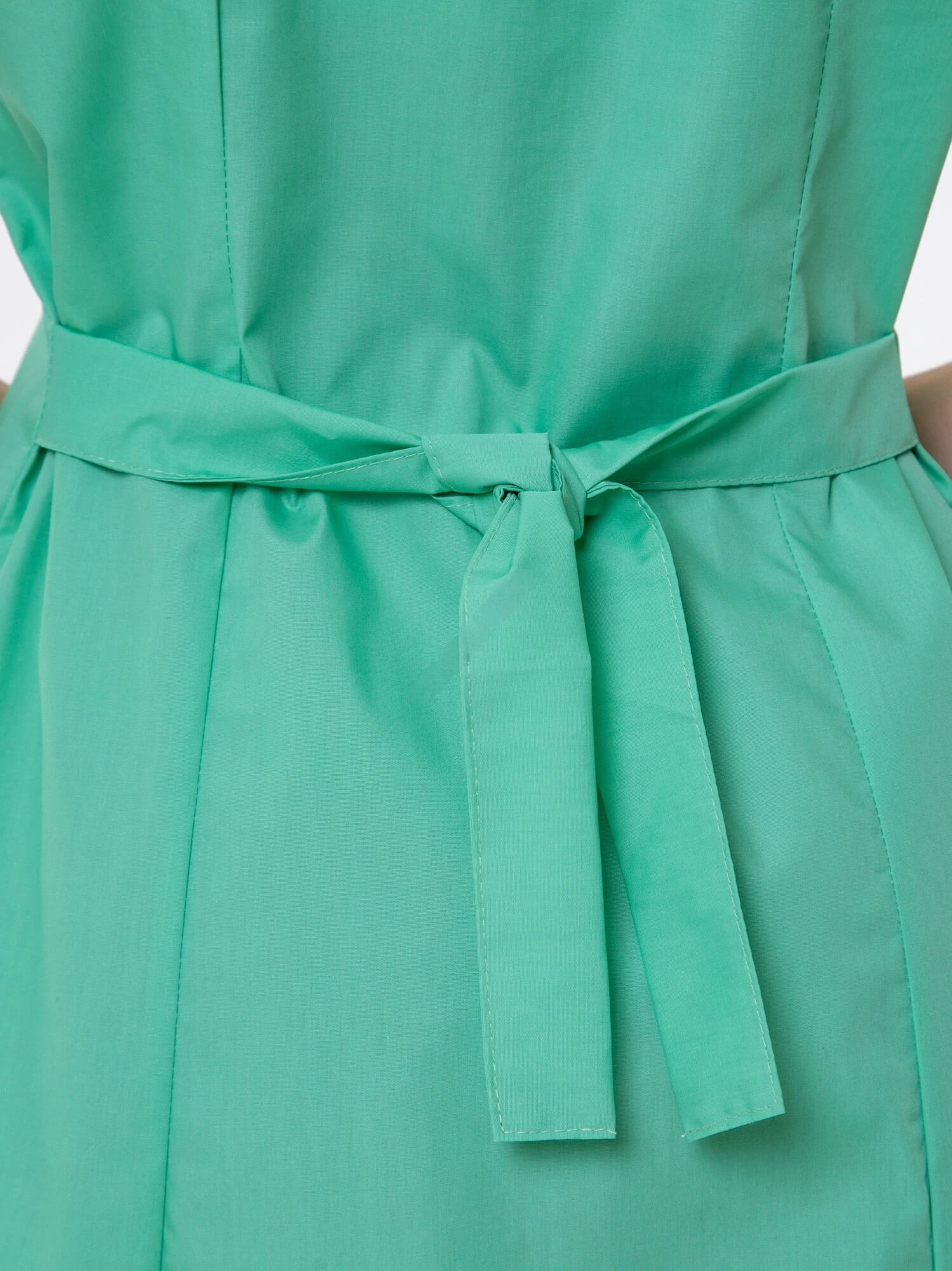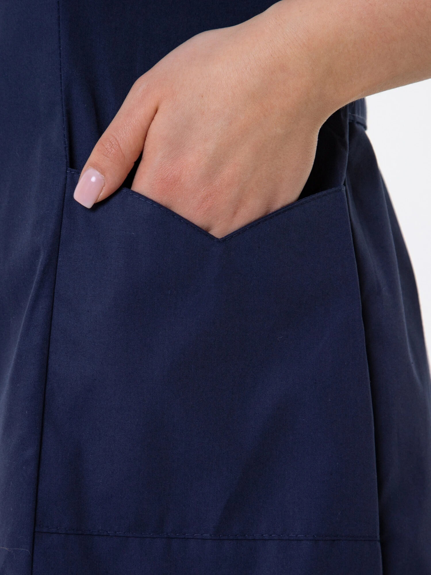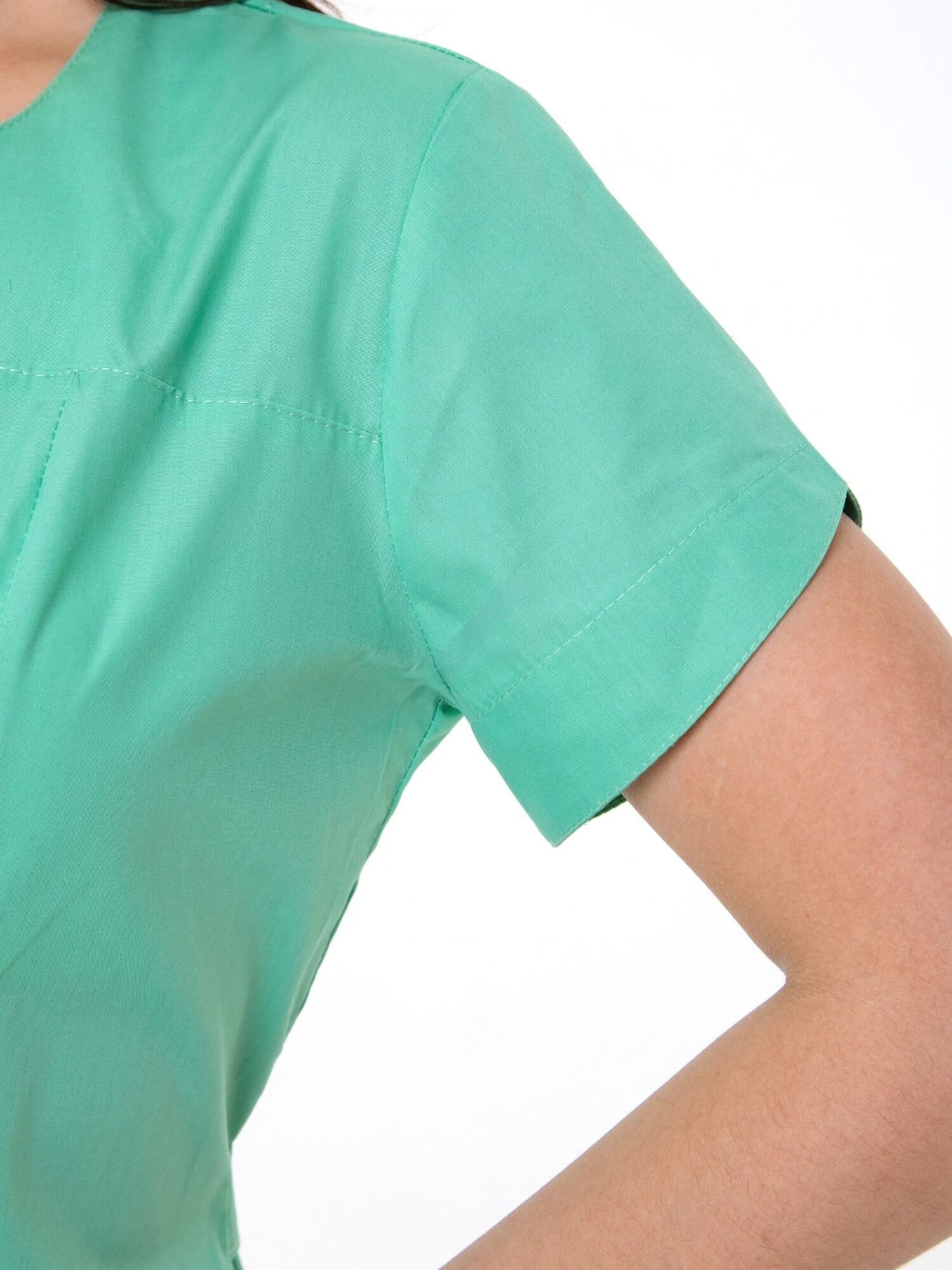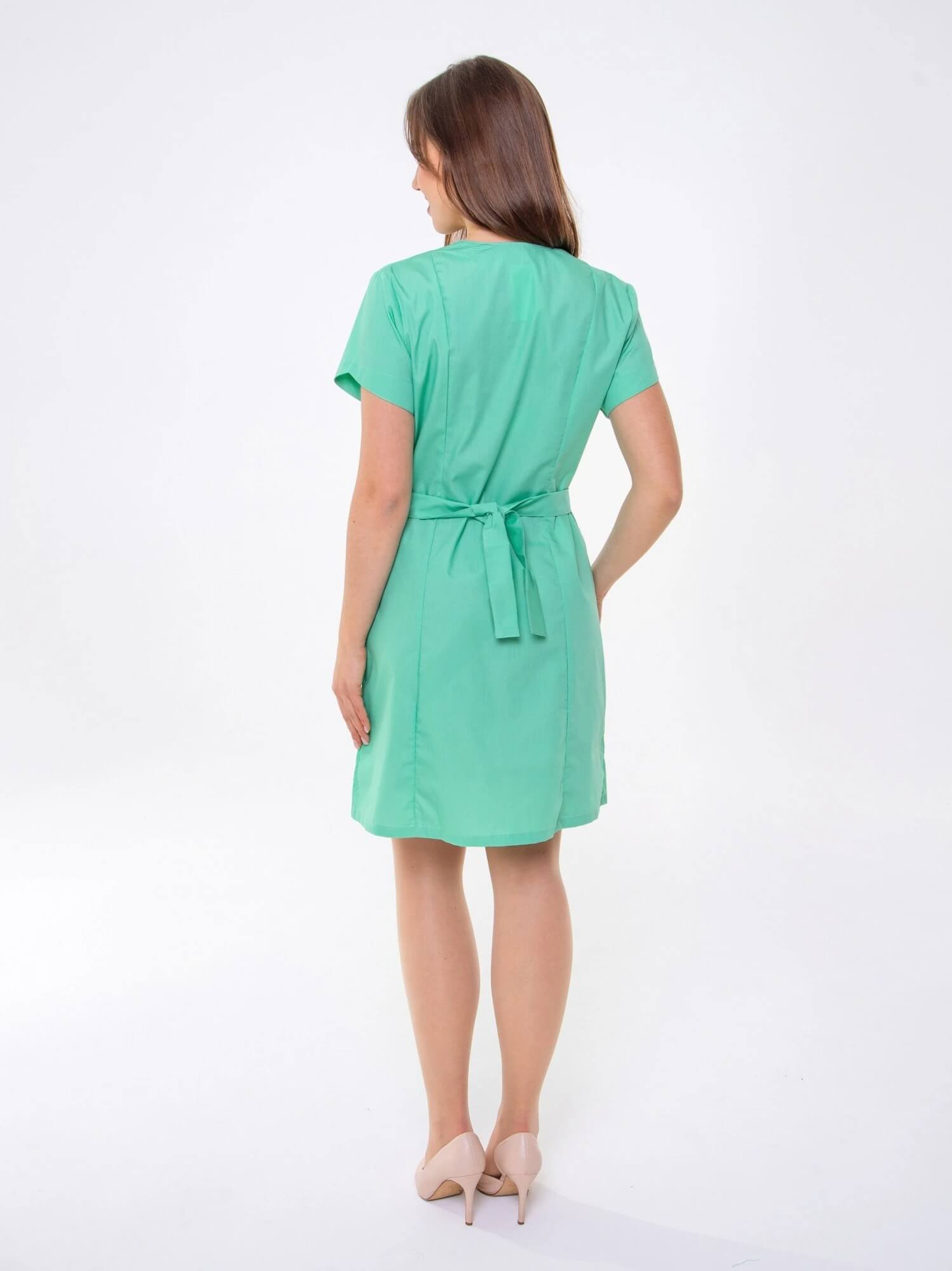Медицинский женский халат с фигурными карманами и воротом, рельефами, коротким рукавом и центральной застежкой на молнии.