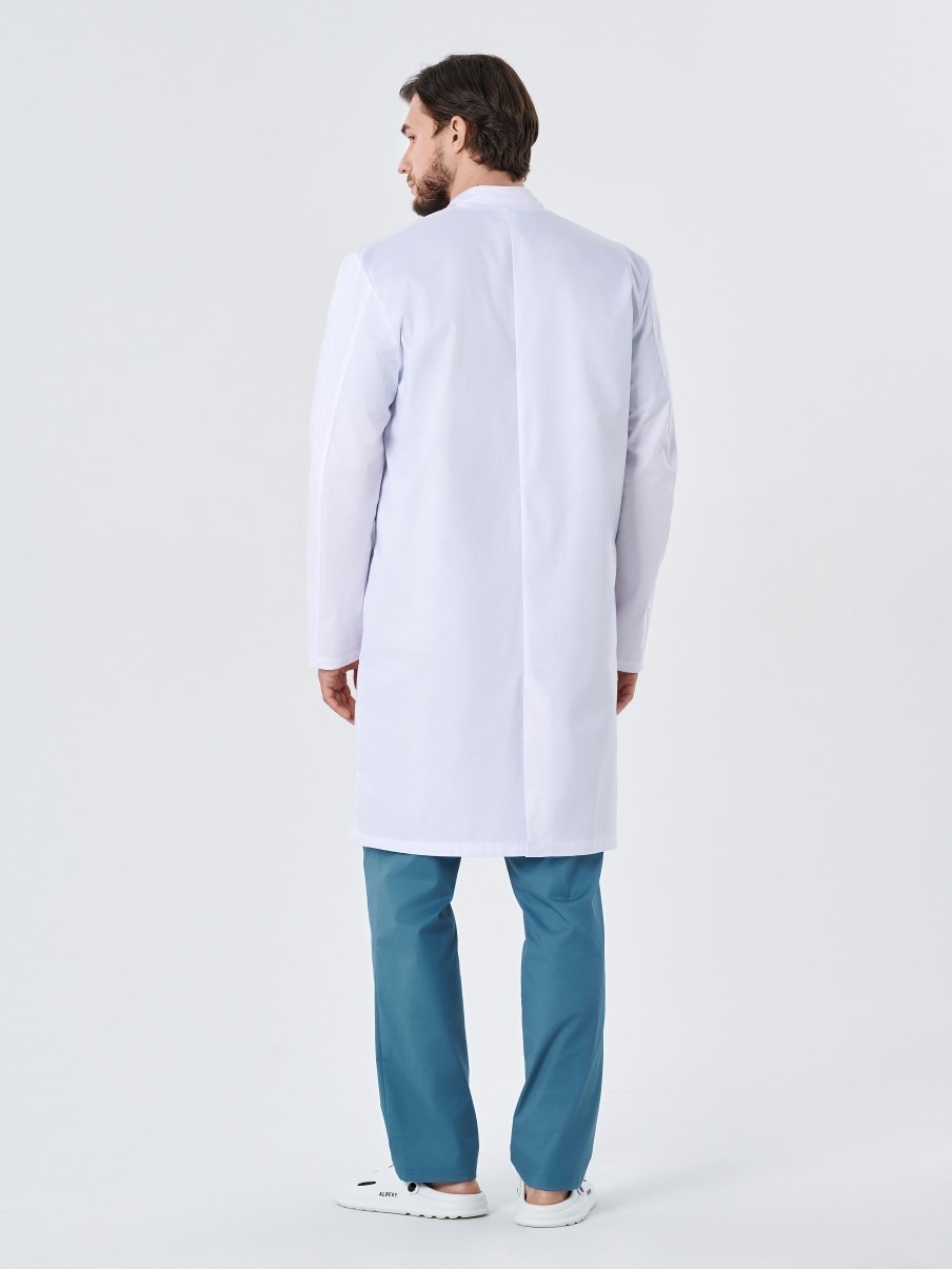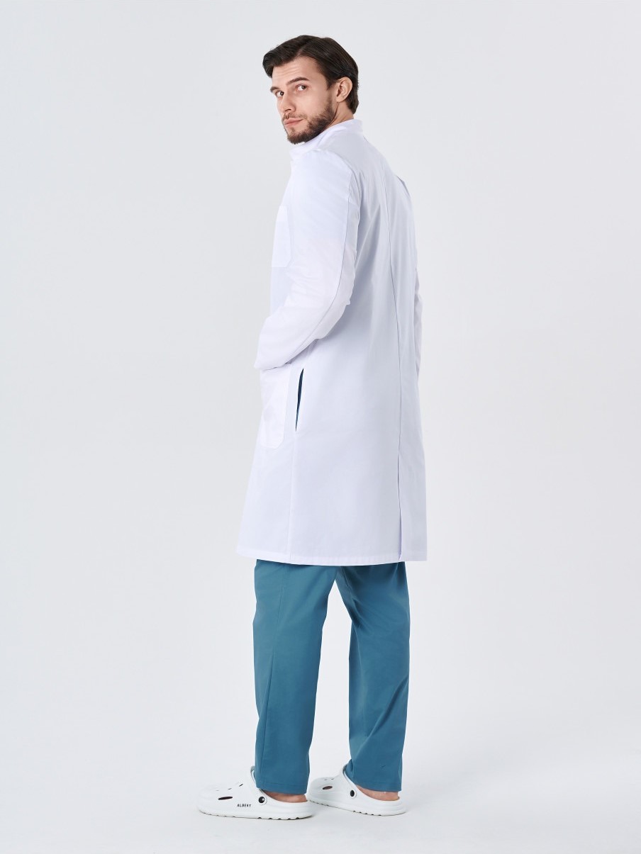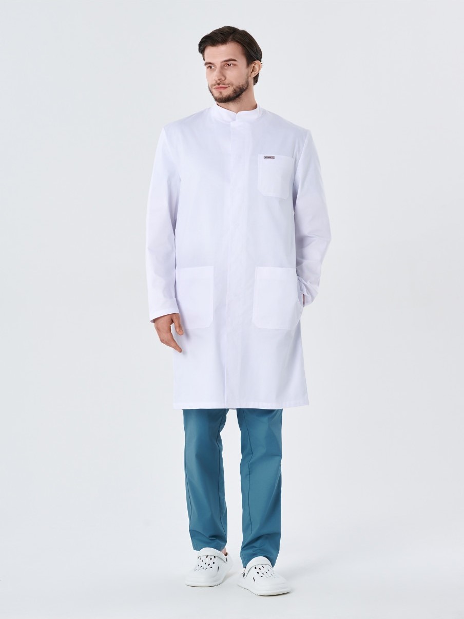 Халат медицинский мужской 245.0 прямого силуэта с центральной потайной застежкой на 7 кнопок. На полочке расположены 2 боковых кармана и 1 нагрудный карман со скошенными углами. Спинка со средним швом. В среднем шве спинки обработана шлица. В боковых швах обработаны щели для удобства. Рукава длинные двухшовные. Воротник- стойка.
