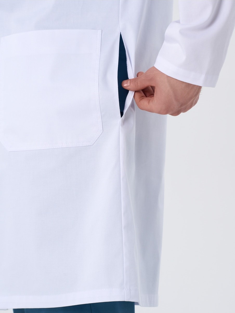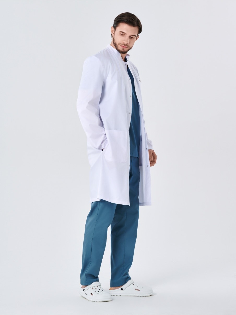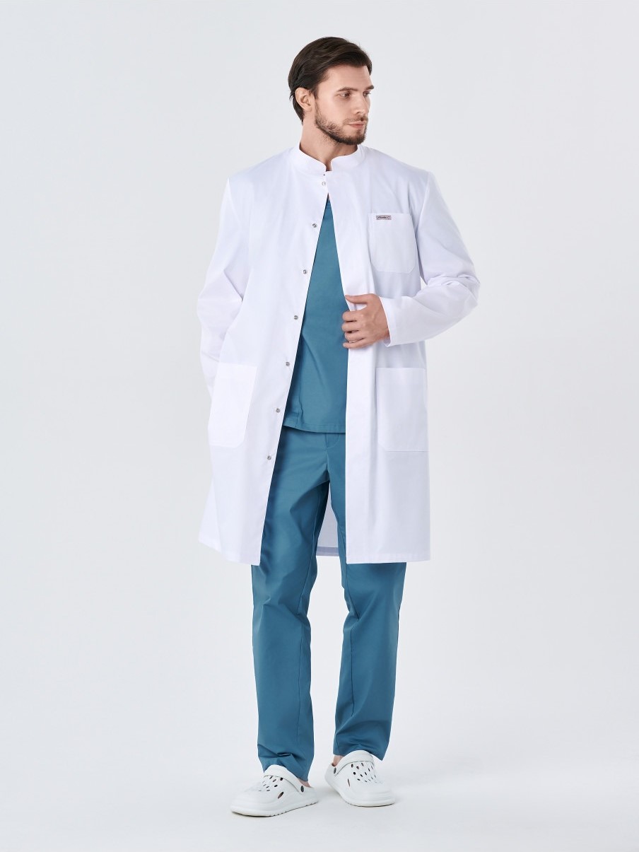 Халат медицинский мужской 245.0 прямого силуэта с центральной потайной застежкой на 7 кнопок. На полочке расположены 2 боковых кармана и 1 нагрудный карман со скошенными углами. Спинка со средним швом. В среднем шве спинки обработана шлица. В боковых швах обработаны щели для удобства. Рукава длинные двухшовные. Воротник- стойка.