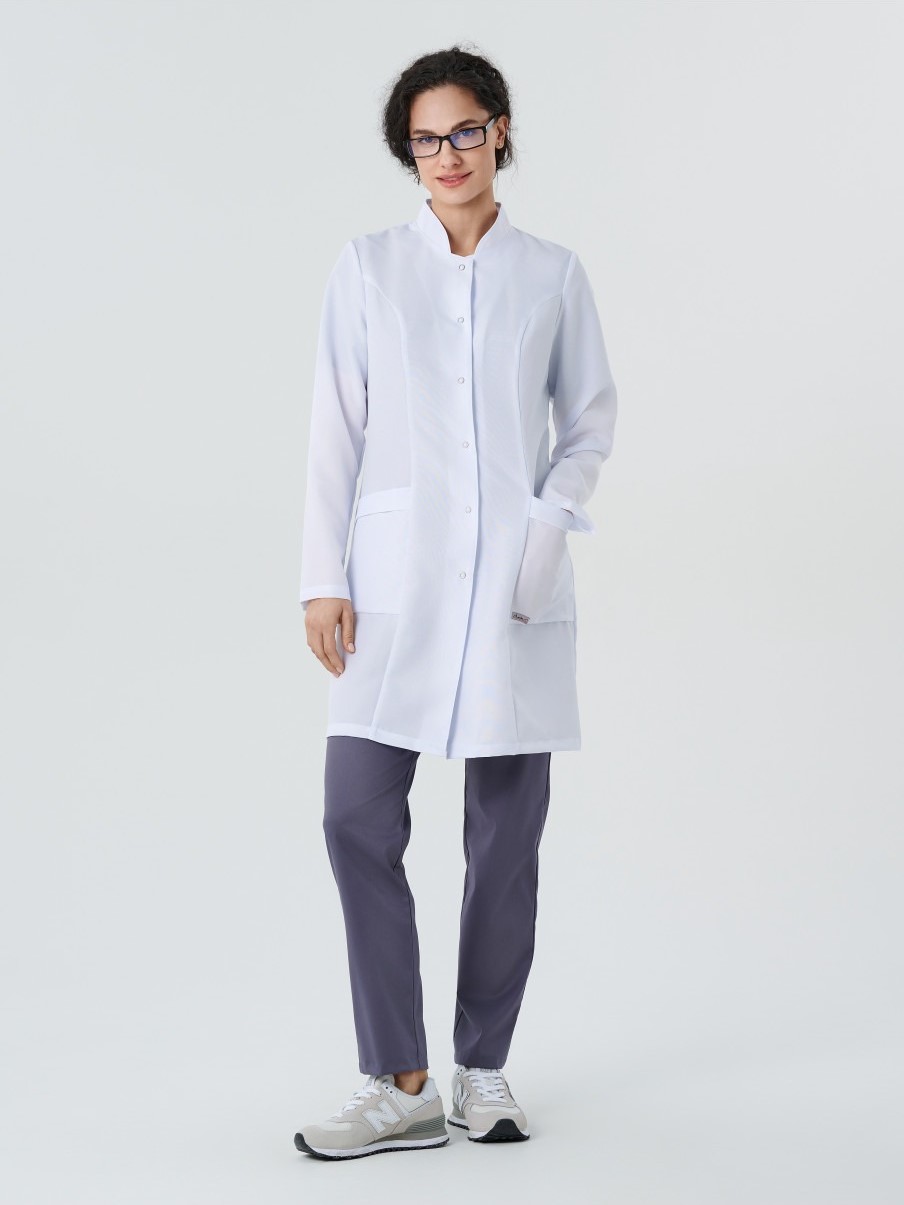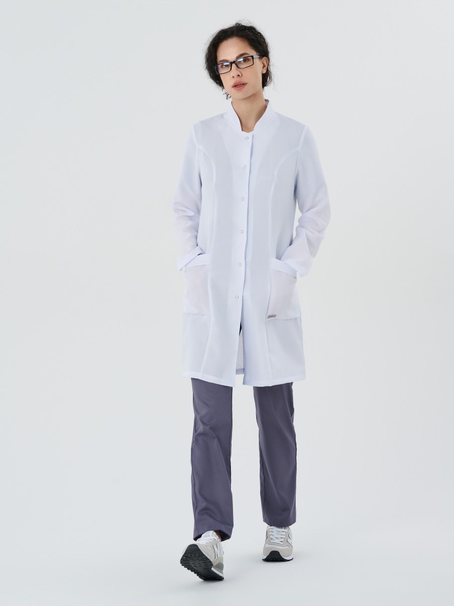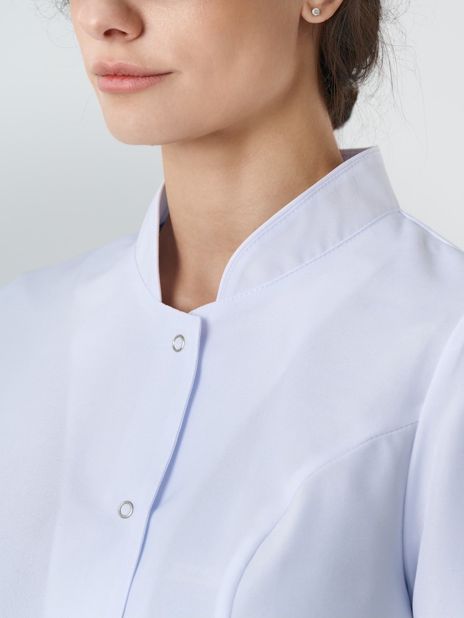 Халат медицинский женский 189.0 полуприлегающего силуэта с центральной бортовой застежкой на 6 кнопок. Изделие с воротником- стойка. На полочке расположены рельефы с проймы. В рельефы втачаны боковые карманы с цельнокроенным отворотом. На левом кармане настрочена лента с фирменным знаком. Спинка со средним швом и рельефами с проймы. На уровне линии талии в рельефы втачан хлястик на 1 кнопку. Рукава длинный. В край стойки втачан кант в цвет стойки.