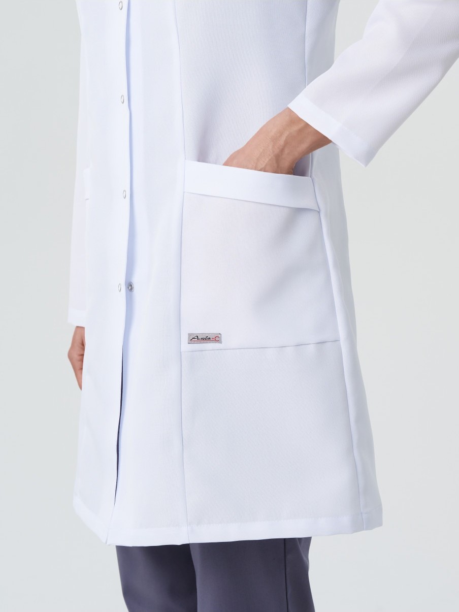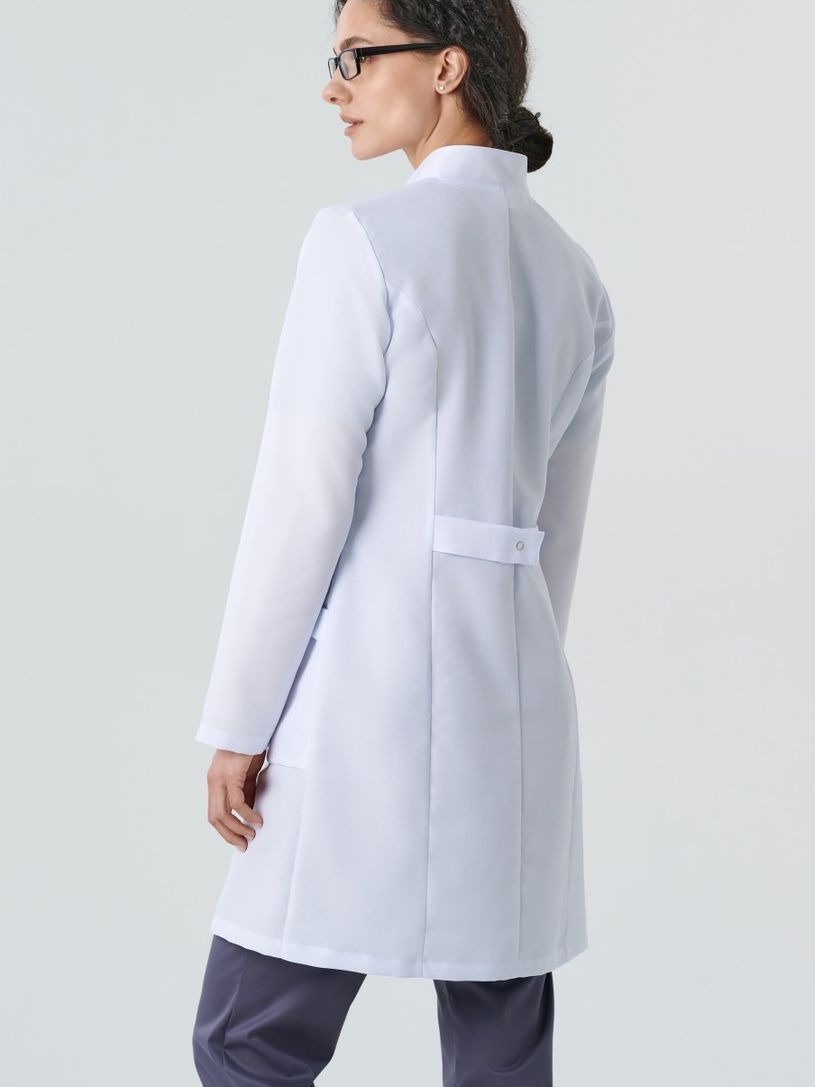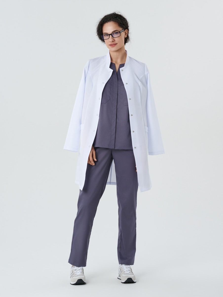 Халат медицинский женский 189.0 полуприлегающего силуэта с центральной бортовой застежкой на 6 кнопок. Изделие с воротником- стойка. На полочке расположены рельефы с проймы. В рельефы втачаны боковые карманы с цельнокроенным отворотом. На левом кармане настрочена лента с фирменным знаком. Спинка со средним швом и рельефами с проймы. На уровне линии талии в рельефы втачан хлястик на 1 кнопку. Рукава длинный. В край стойки втачан кант в цвет стойки.