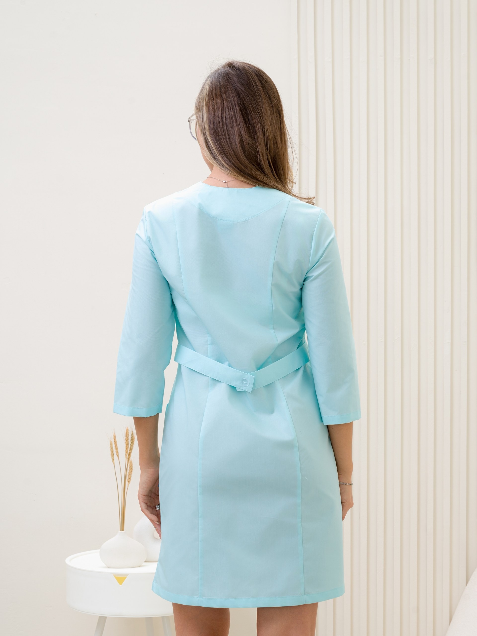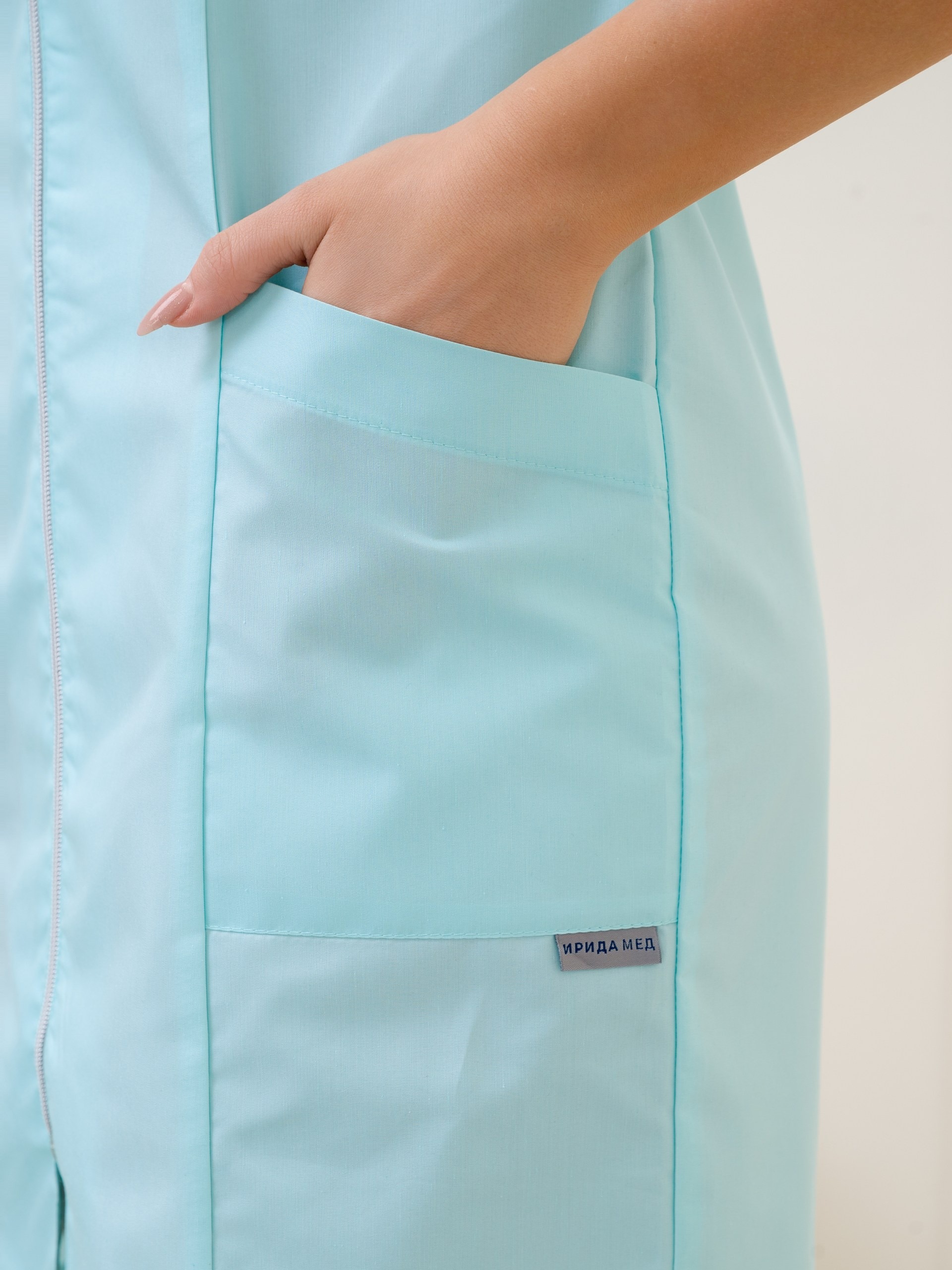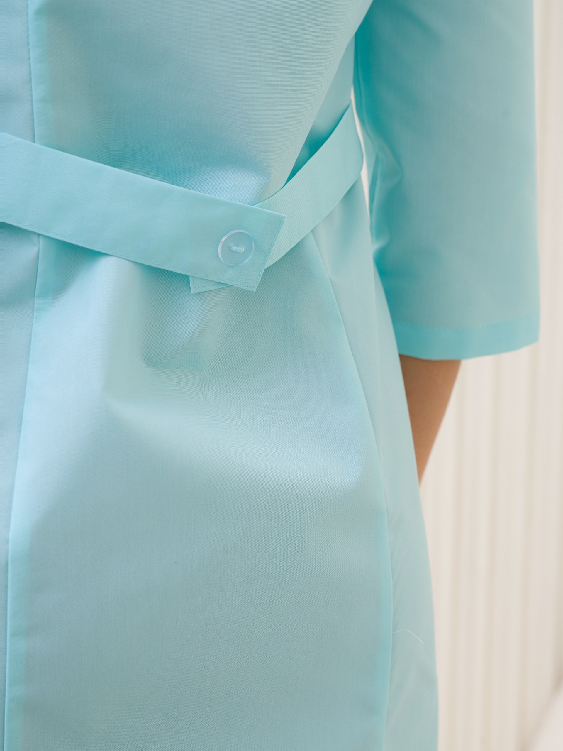Классический, медицинский, женский халат, на молнии, без воротника и рукавом 3/4. Широкий размерный ряд с 42 по 60 размер. Смесовая ткань ТиСи, с содержанием хлопка 35% и полиэфира 65%, с плотностью 120г/м2, имеющая ВО пропитку.