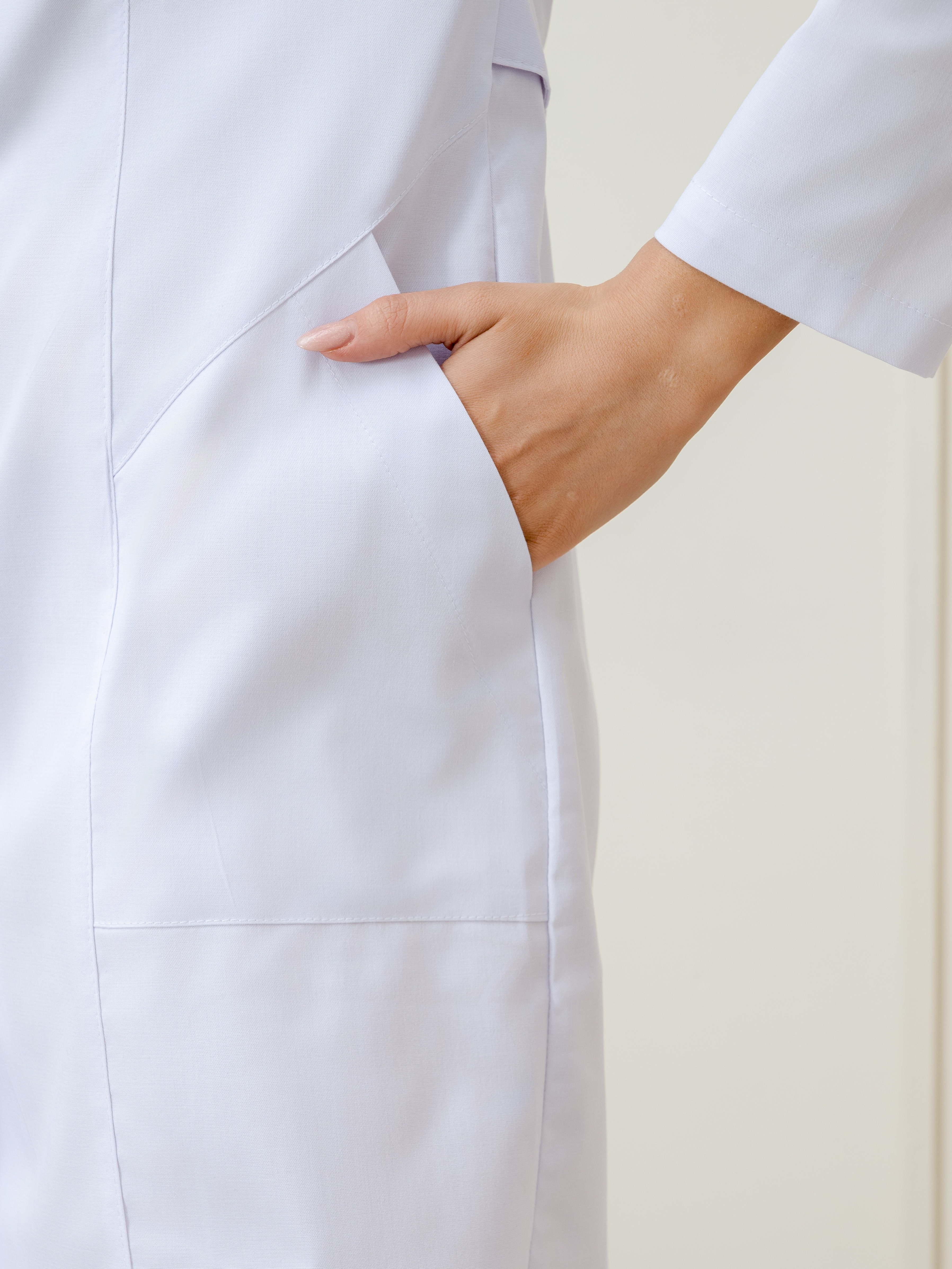 Халат лимитированной серии выполнен из уникальной ткани вискоза/стрейч. Он имеет размерный ряд от 42 до 56 и предназначен для обеспечения комфорта. Халат с длинным рукавом, английским воротником и застёжкой на кнопки.