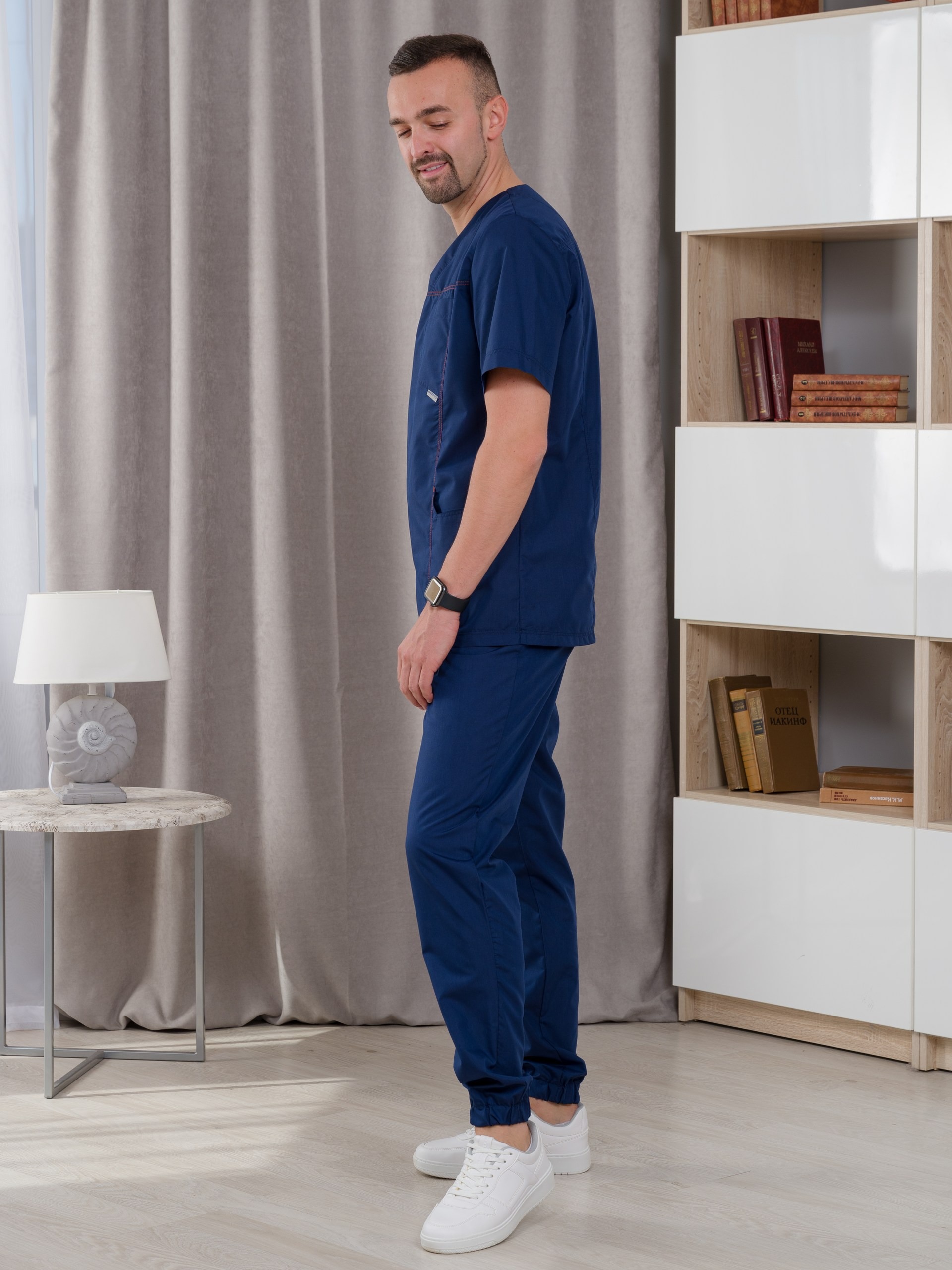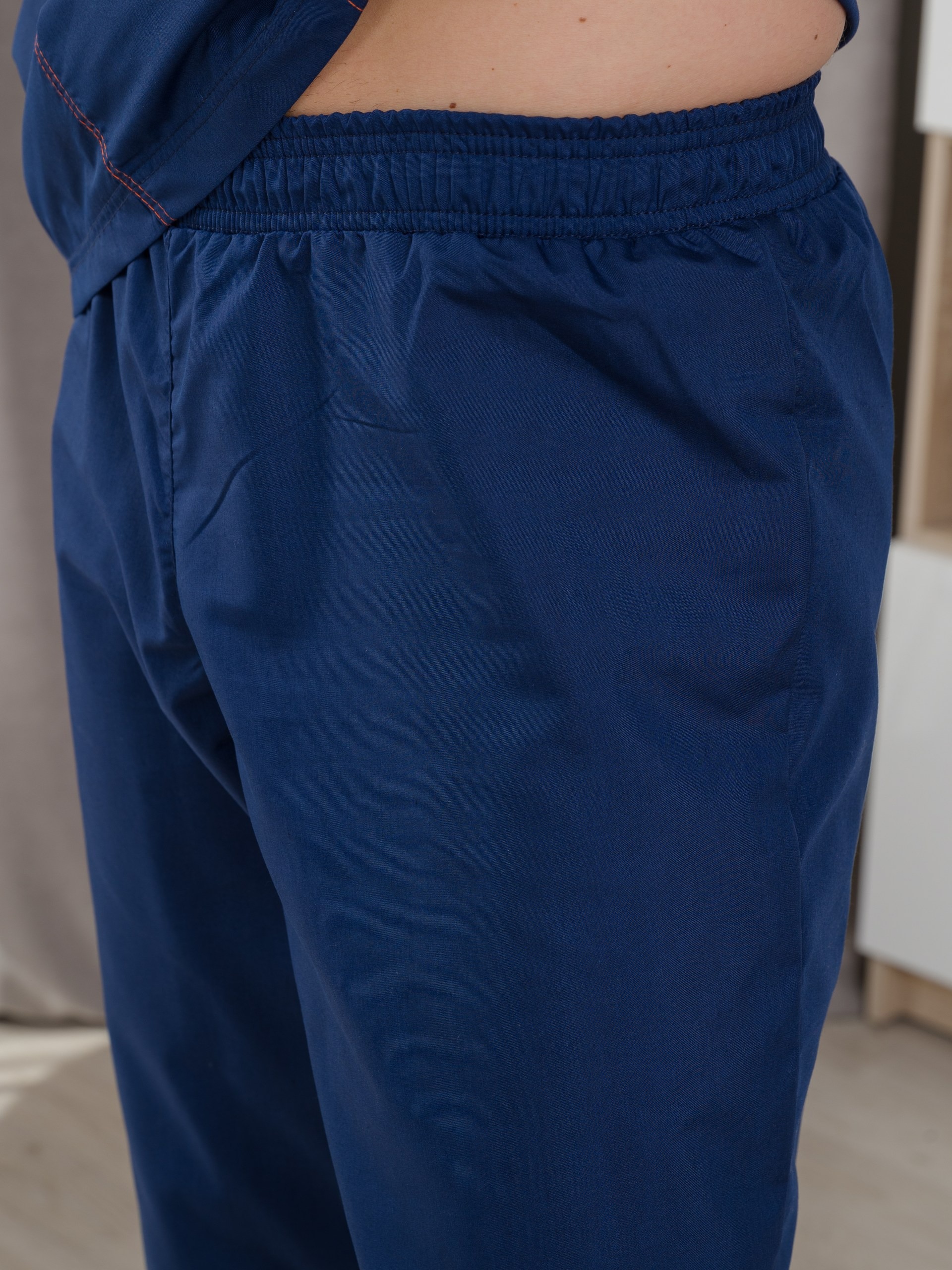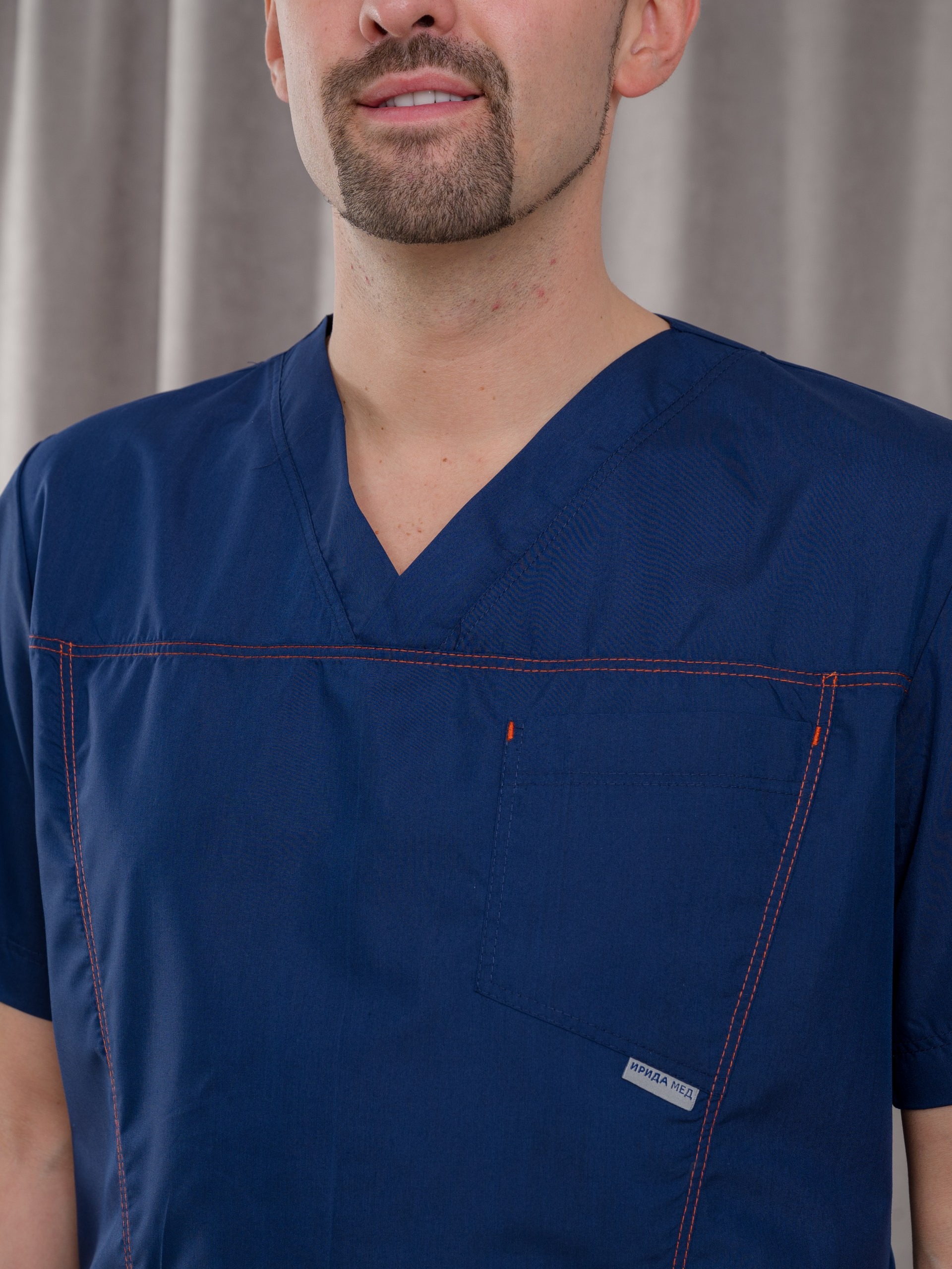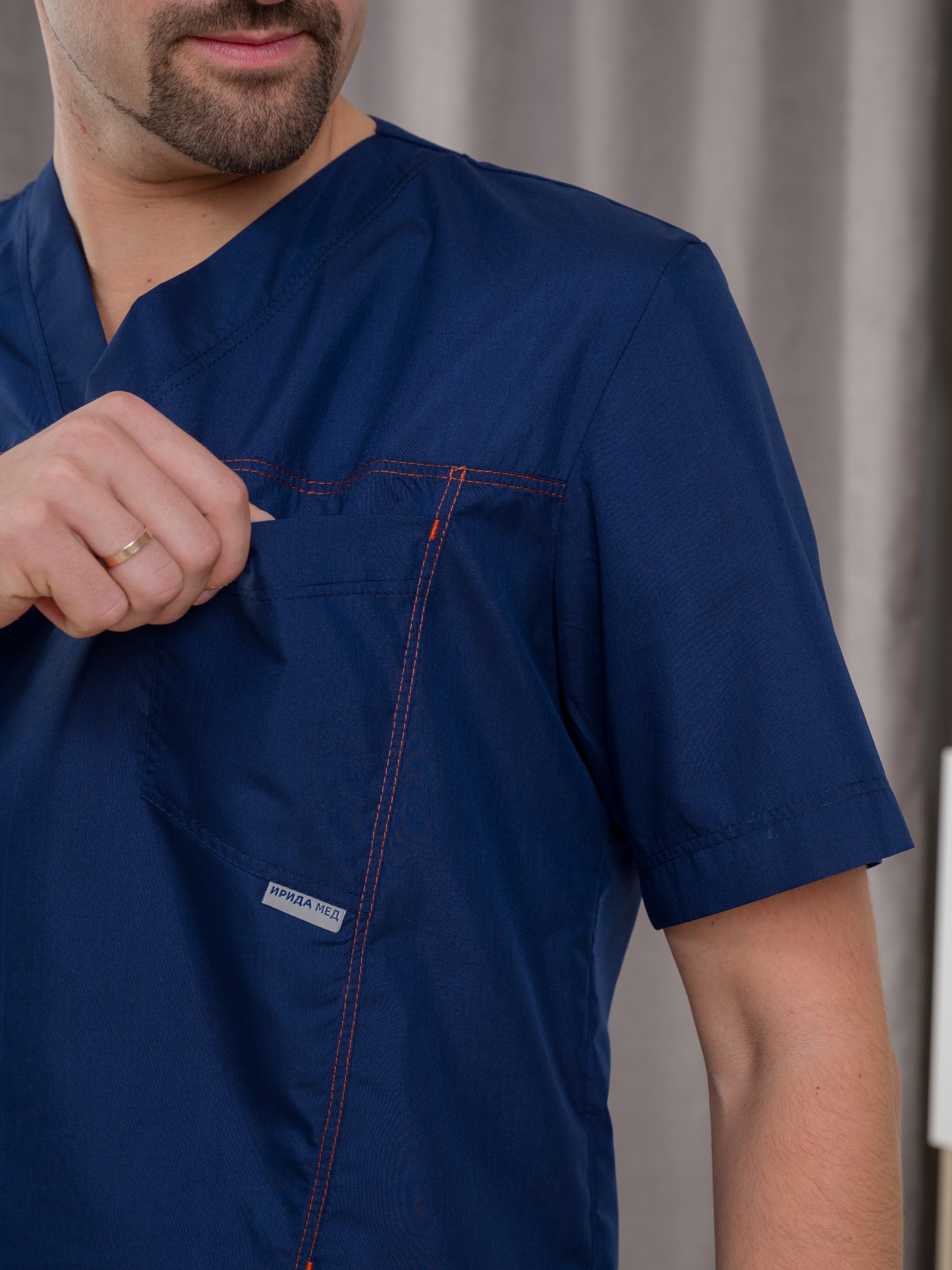 Костюм медицинский мужской из ткани тиси. Куртка полуприлегающего силуэта, V-образный вырез, рукава короткие, один нагрудный и два накладных боковых кармана, все швы отстрочены двойной строчкой. Брюки джоггеры, сзади один накладной карман, резинка широкая прострочена многоигольной машинкой.