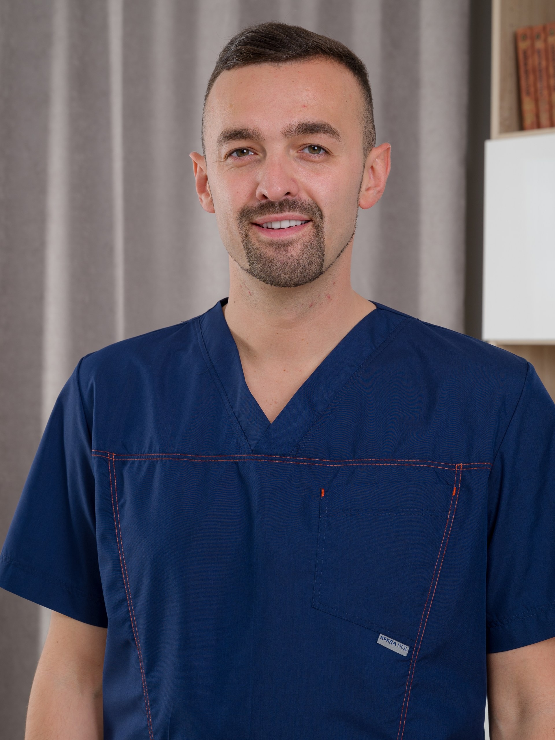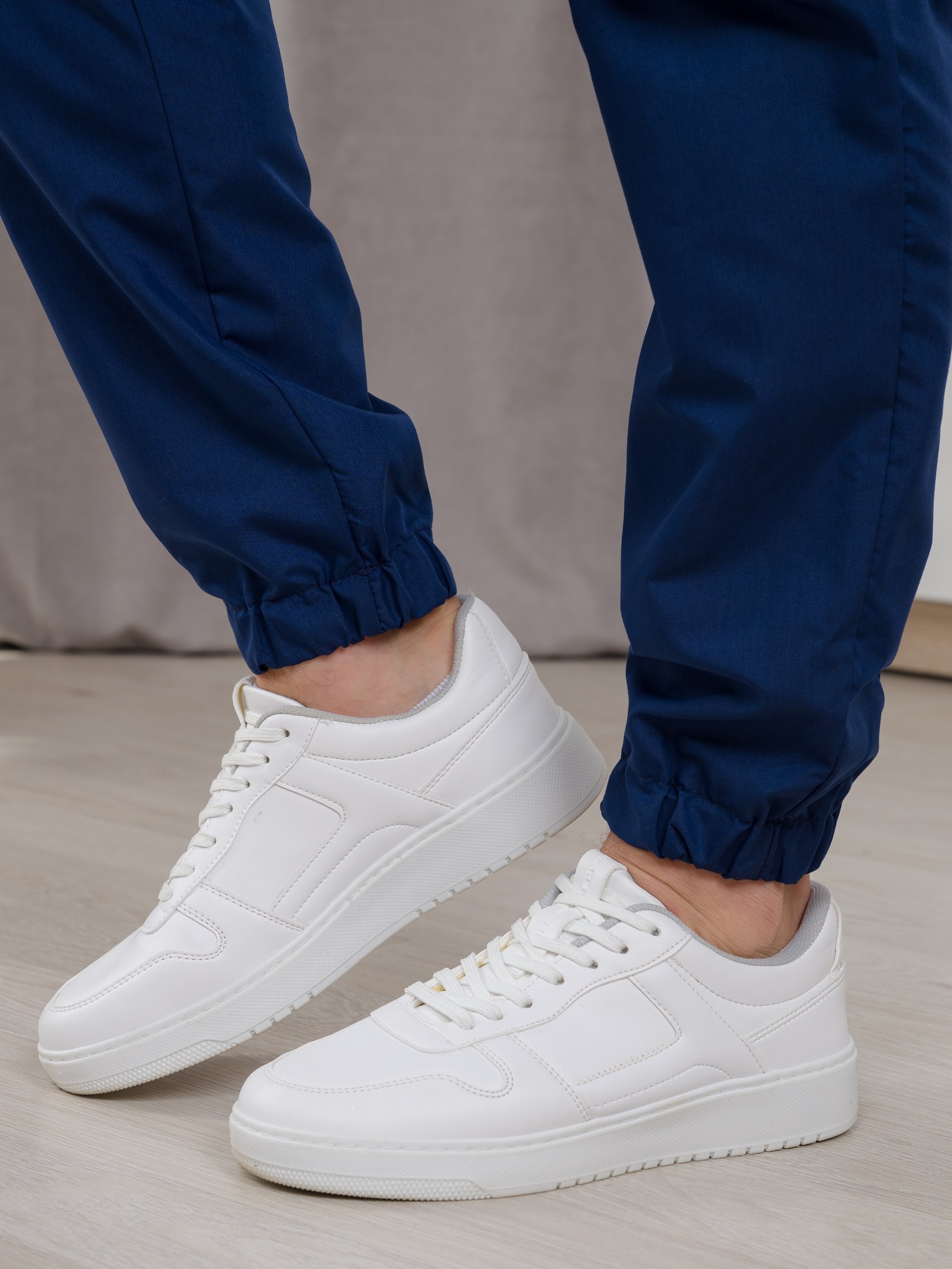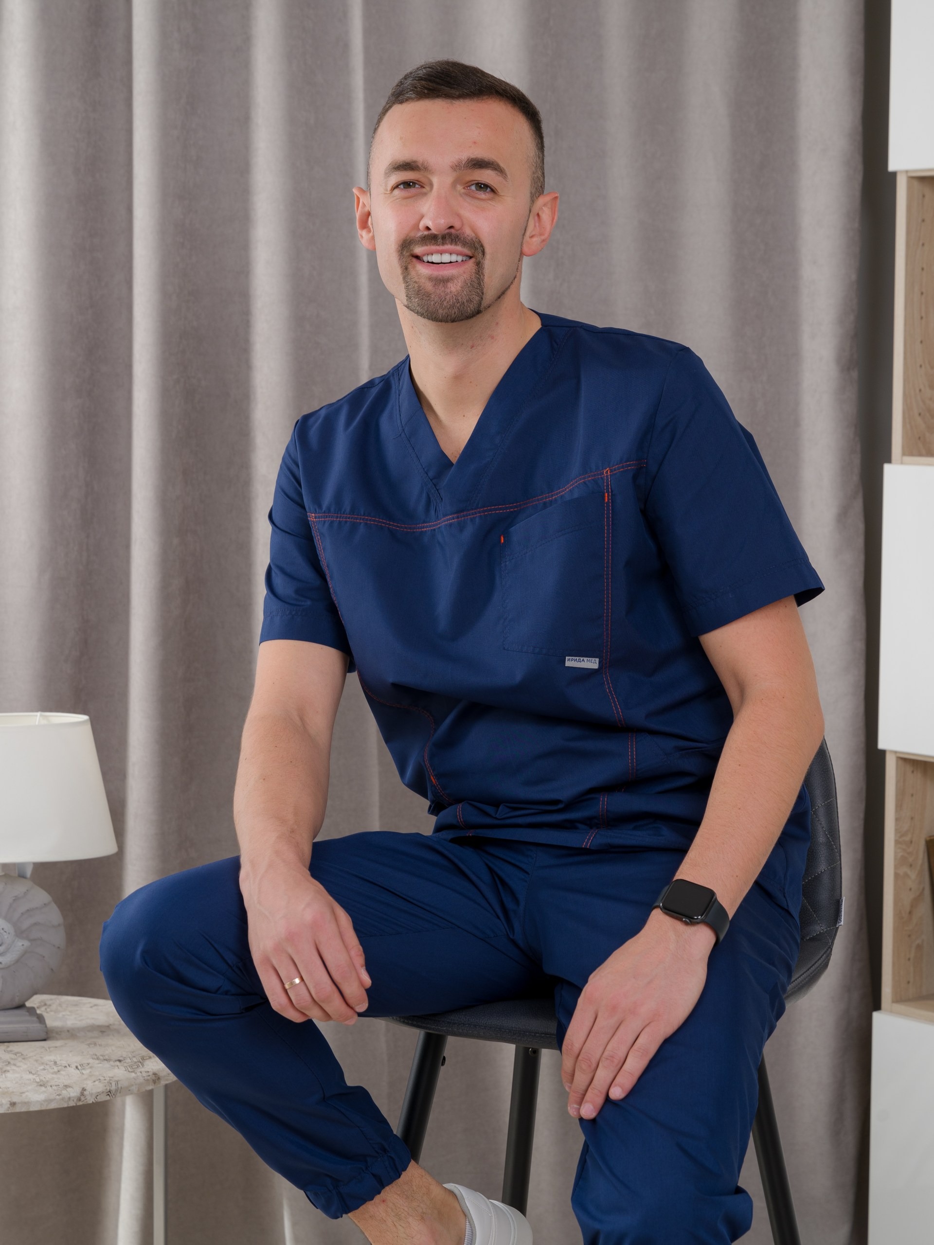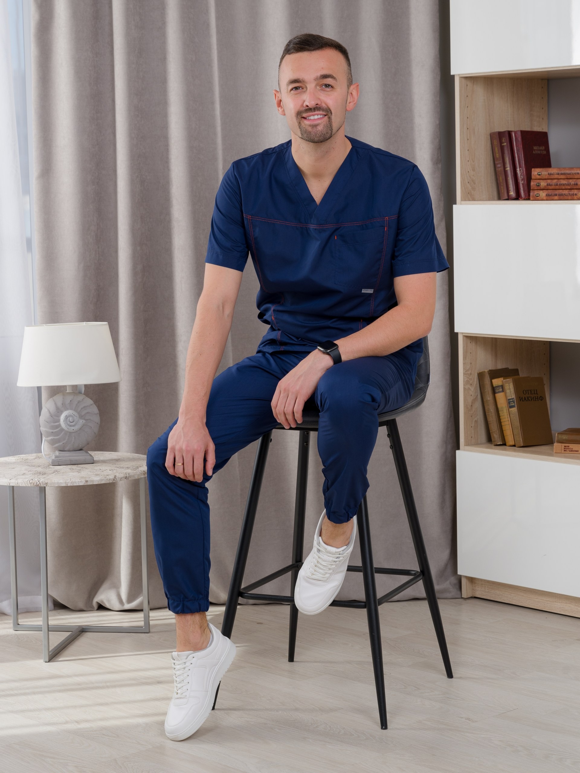 Костюм медицинский мужской из ткани тиси. Куртка полуприлегающего силуэта, V-образный вырез, рукава короткие, один нагрудный и два накладных боковых кармана, все швы отстрочены двойной строчкой. Брюки джоггеры, сзади один накладной карман, резинка широкая прострочена многоигольной машинкой.