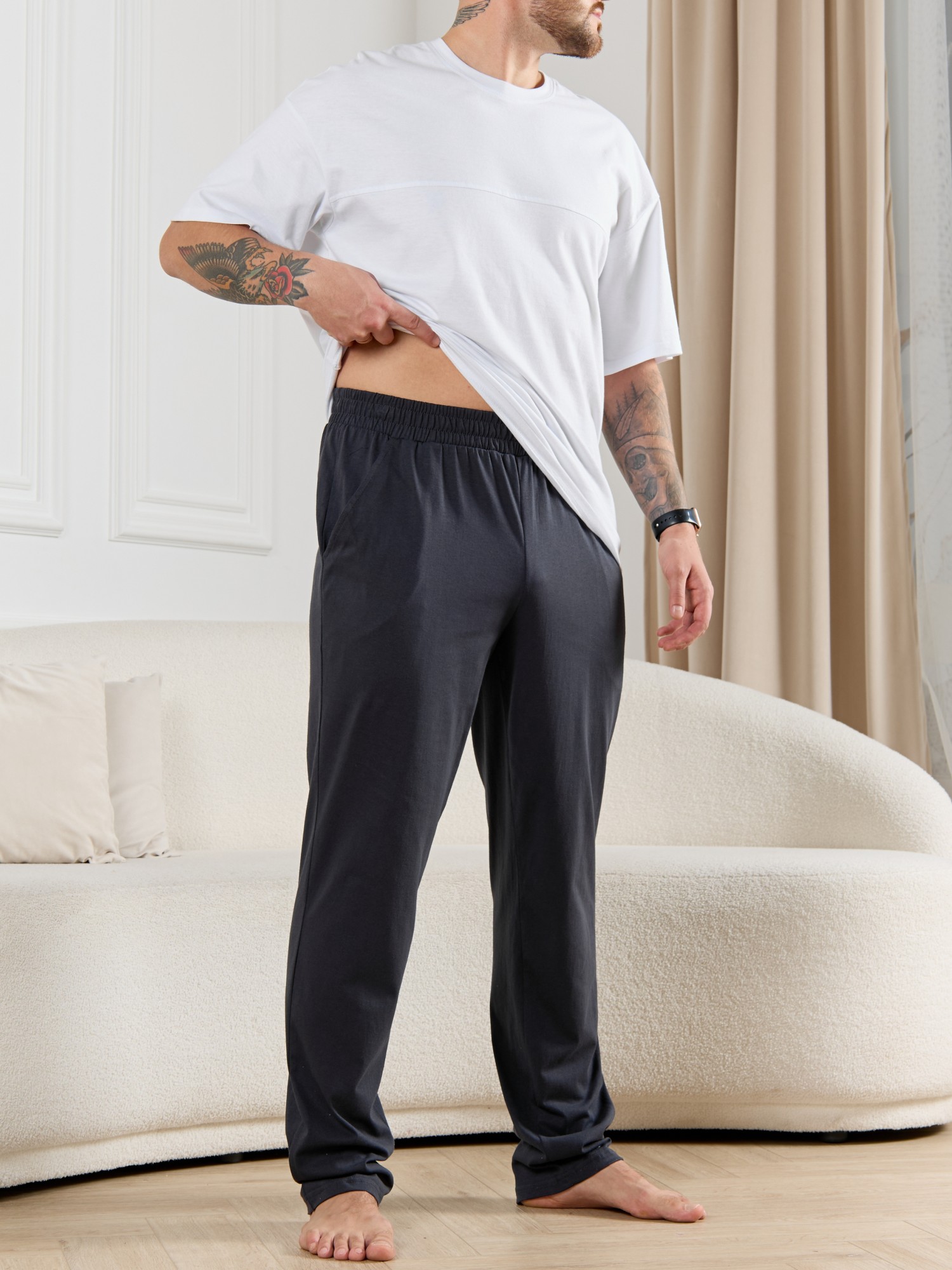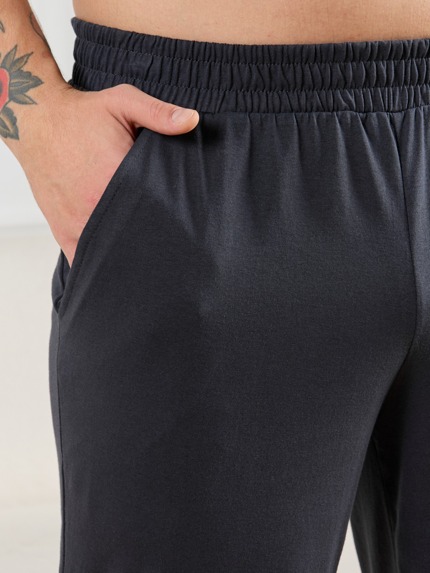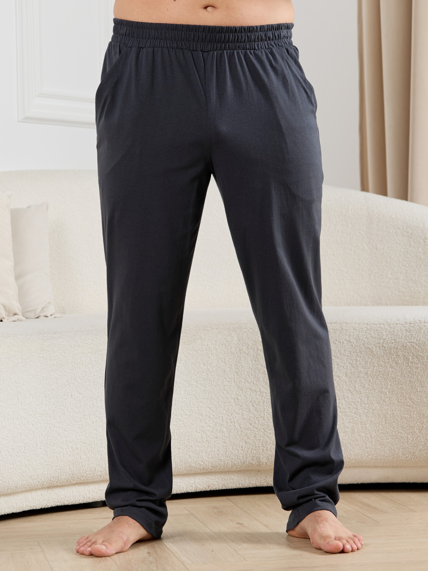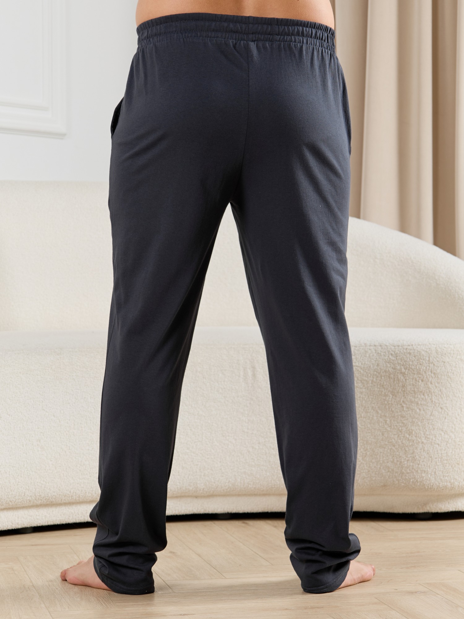 Брюки мужские из гладкокрашенго трикотажного полотна "кулирная гладь", свободного покроя, на притачном поясе с эластичной тесьмой внутри, с карманами в боковых швах. Нижние срезы обработаны подгибкой.