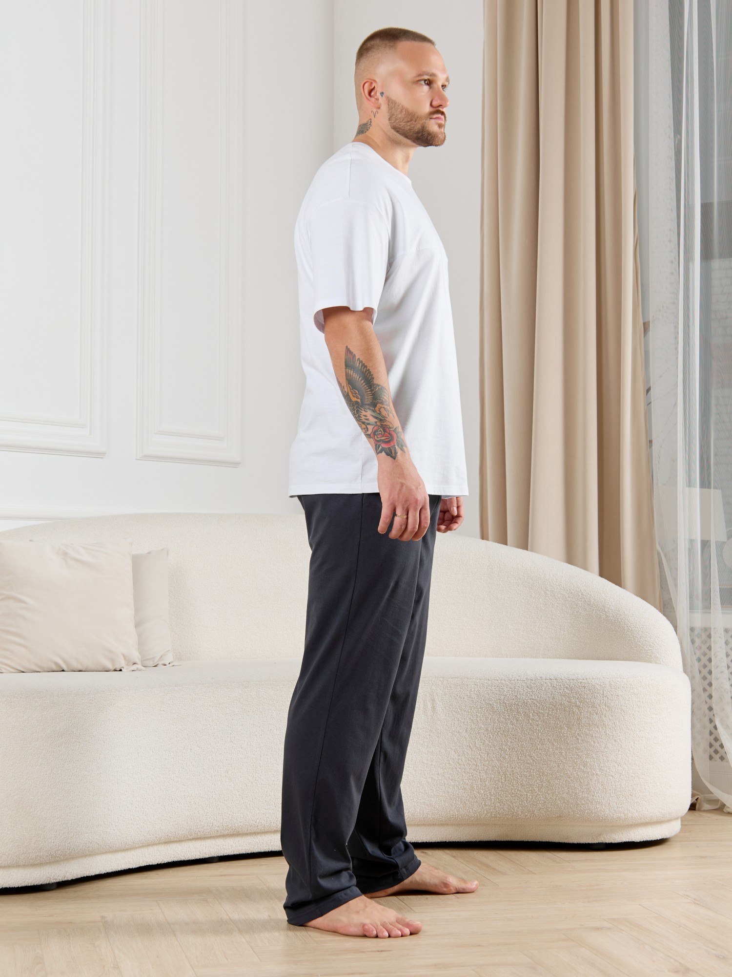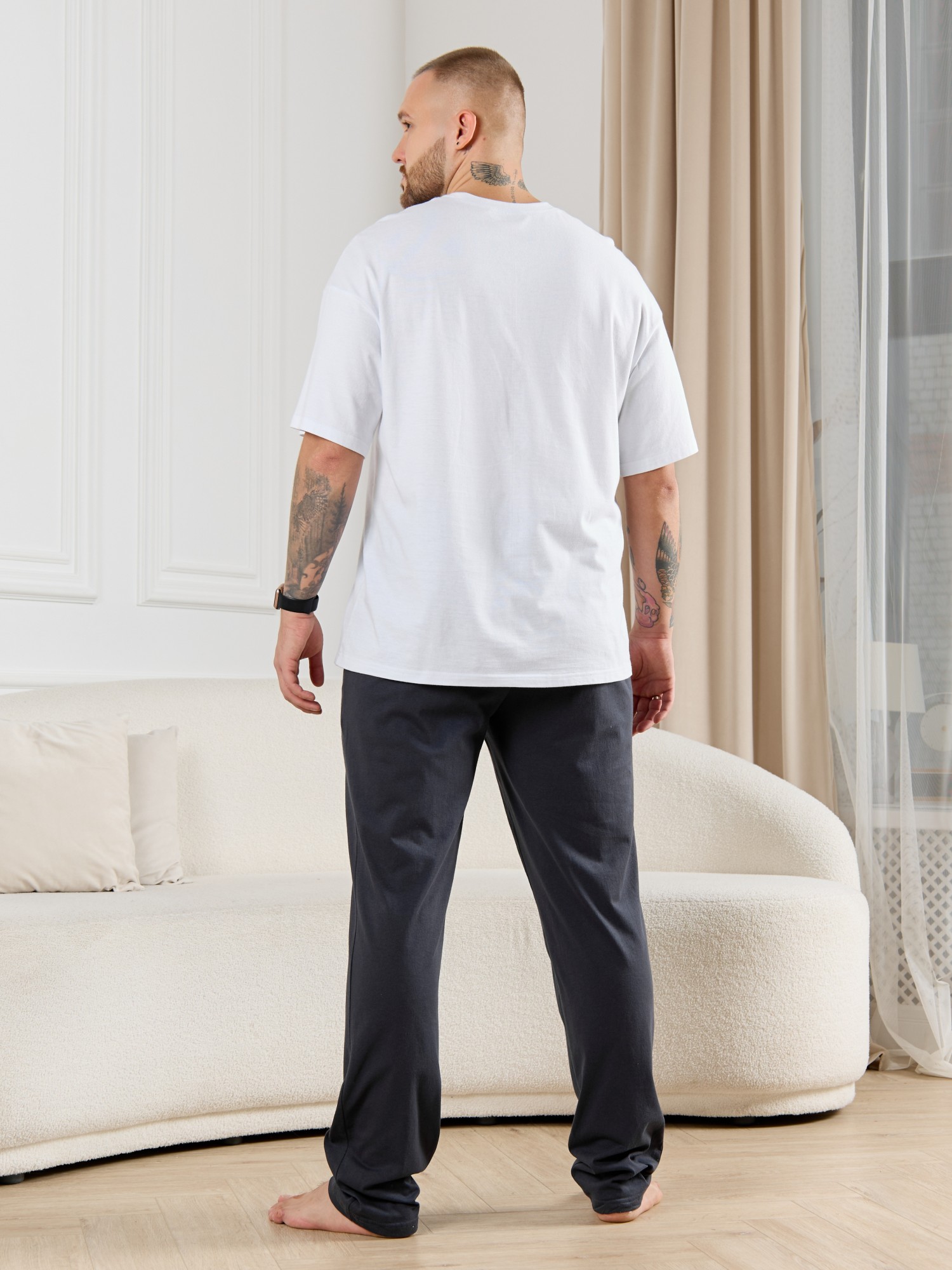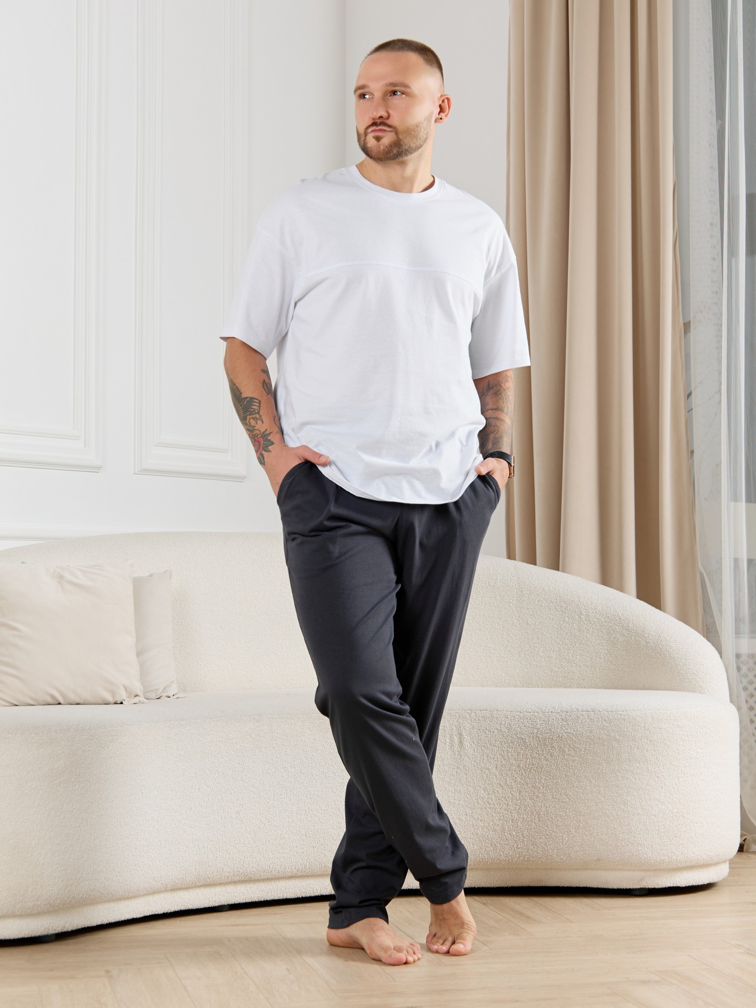 Брюки мужские из гладкокрашенго трикотажного полотна "кулирная гладь", свободного покроя, на притачном поясе с эластичной тесьмой внутри, с карманами в боковых швах. Нижние срезы обработаны подгибкой.