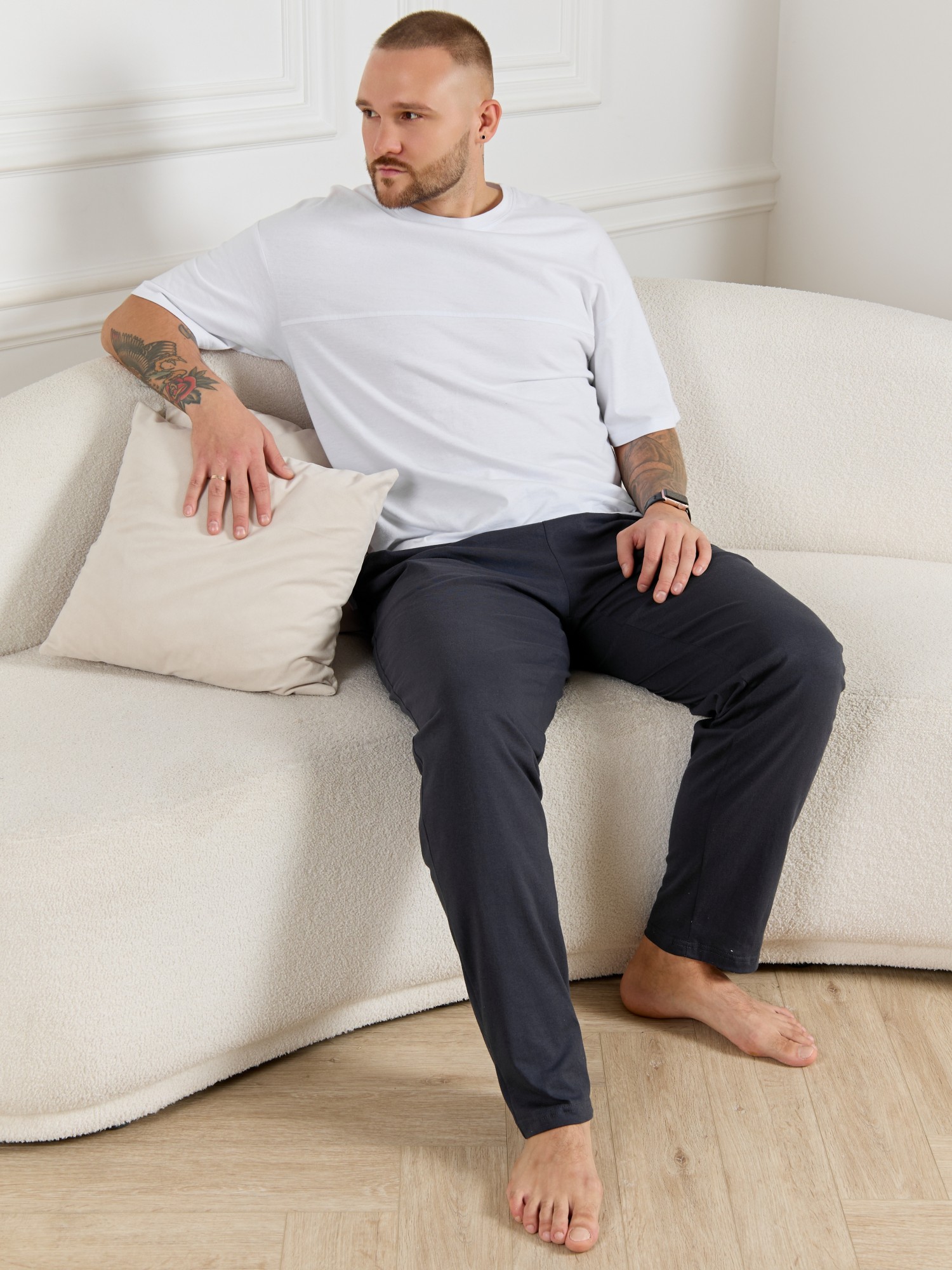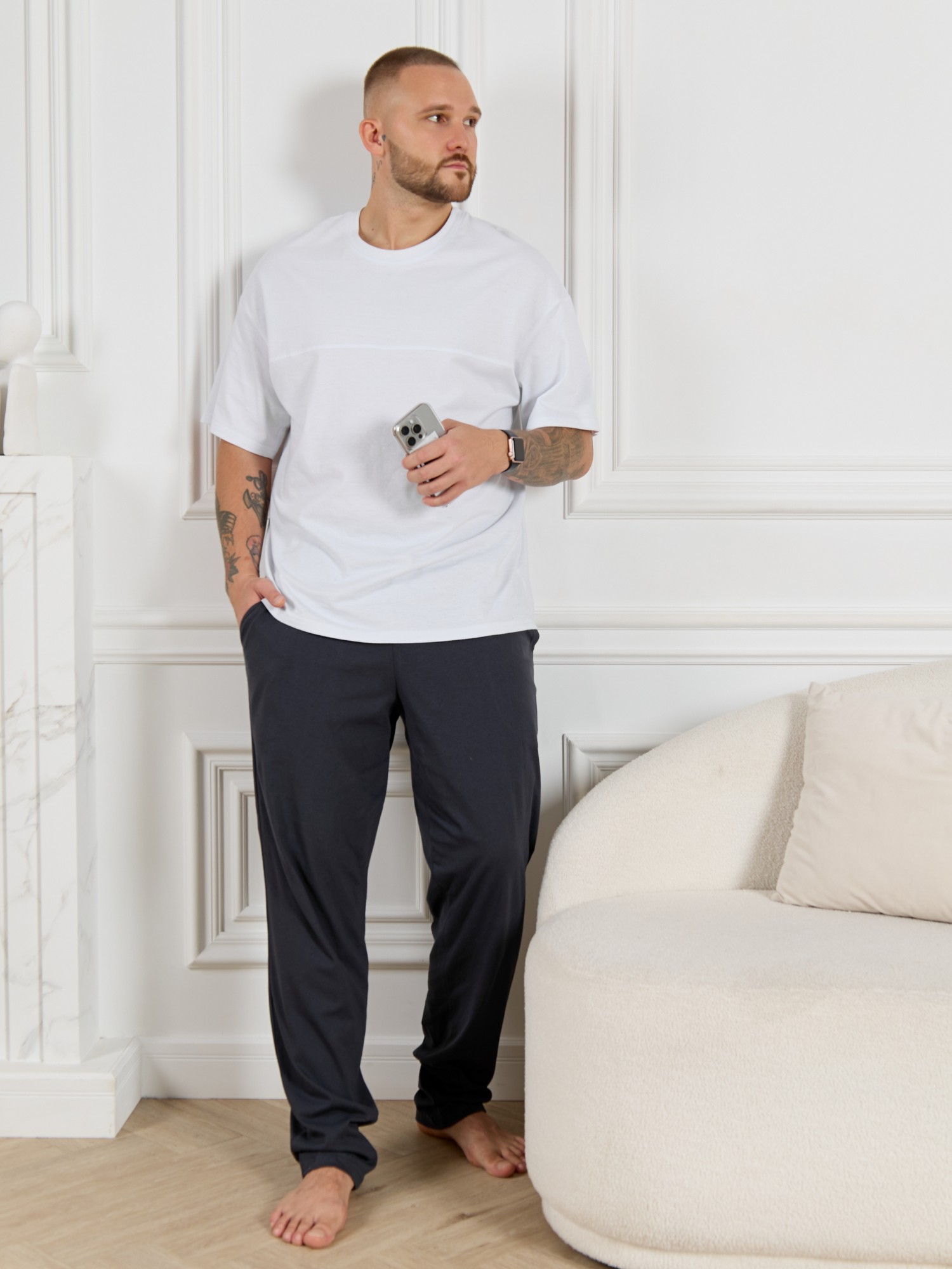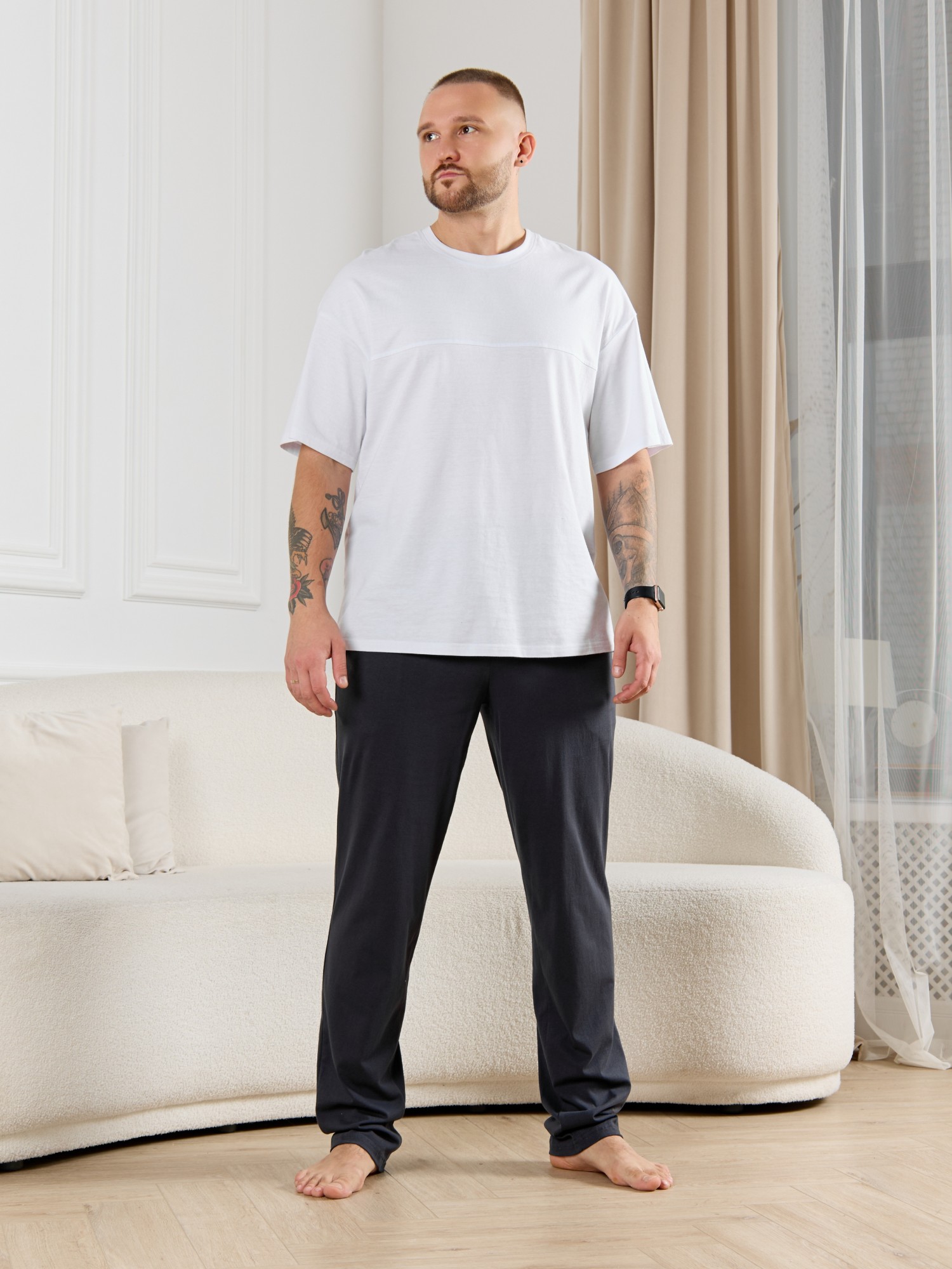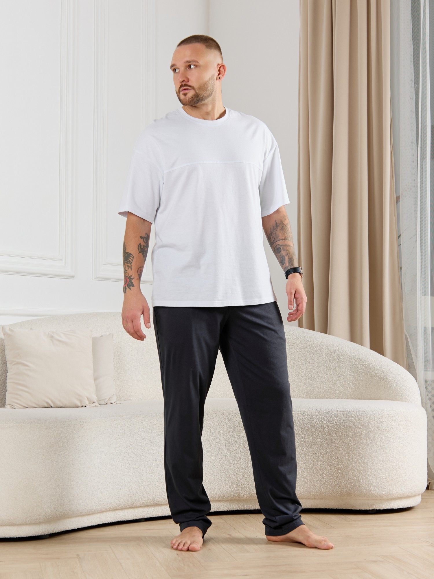 Брюки мужские из гладкокрашенго трикотажного полотна "кулирная гладь", свободного покроя, на притачном поясе с эластичной тесьмой внутри, с карманами в боковых швах. Нижние срезы обработаны подгибкой.