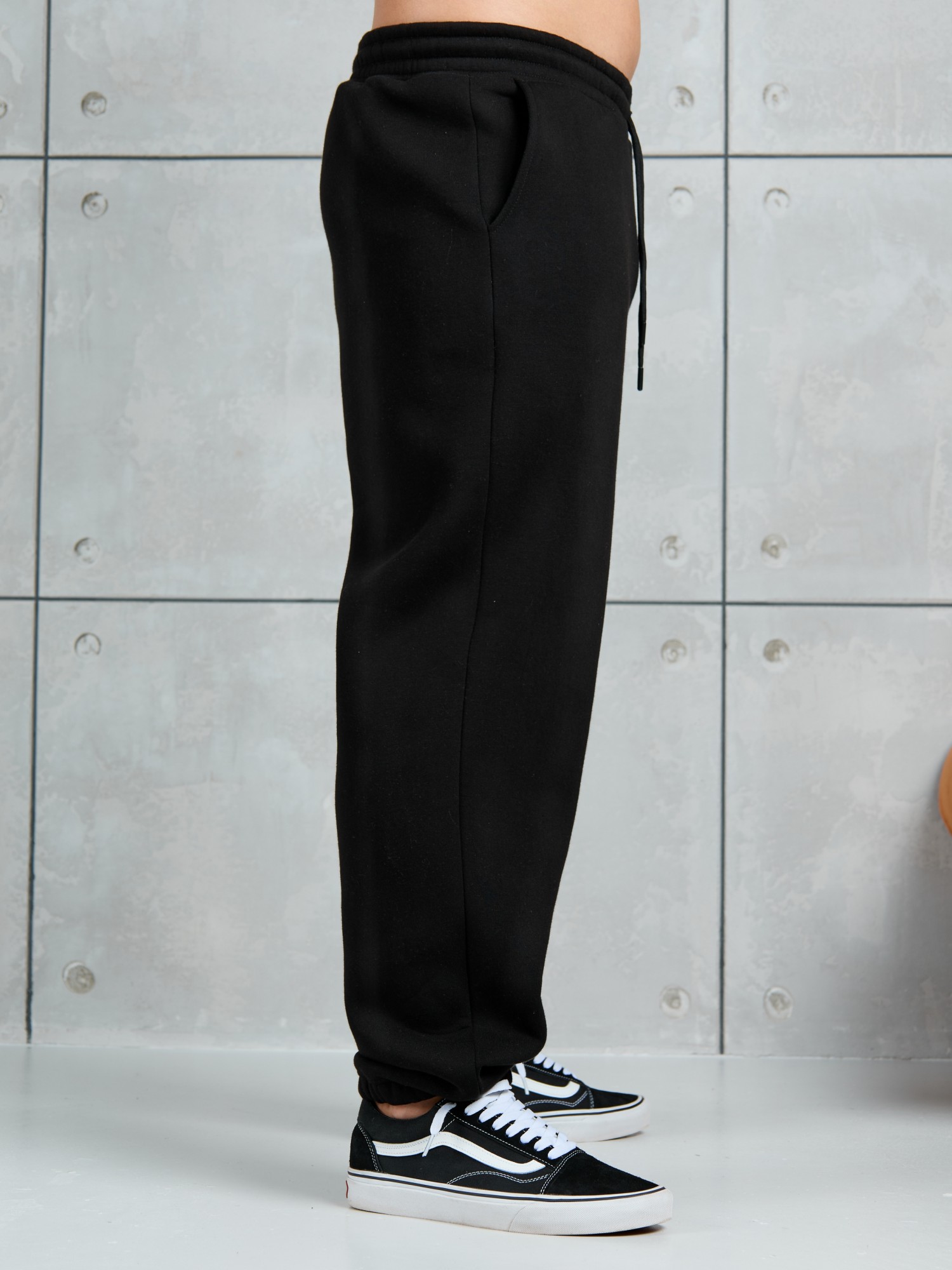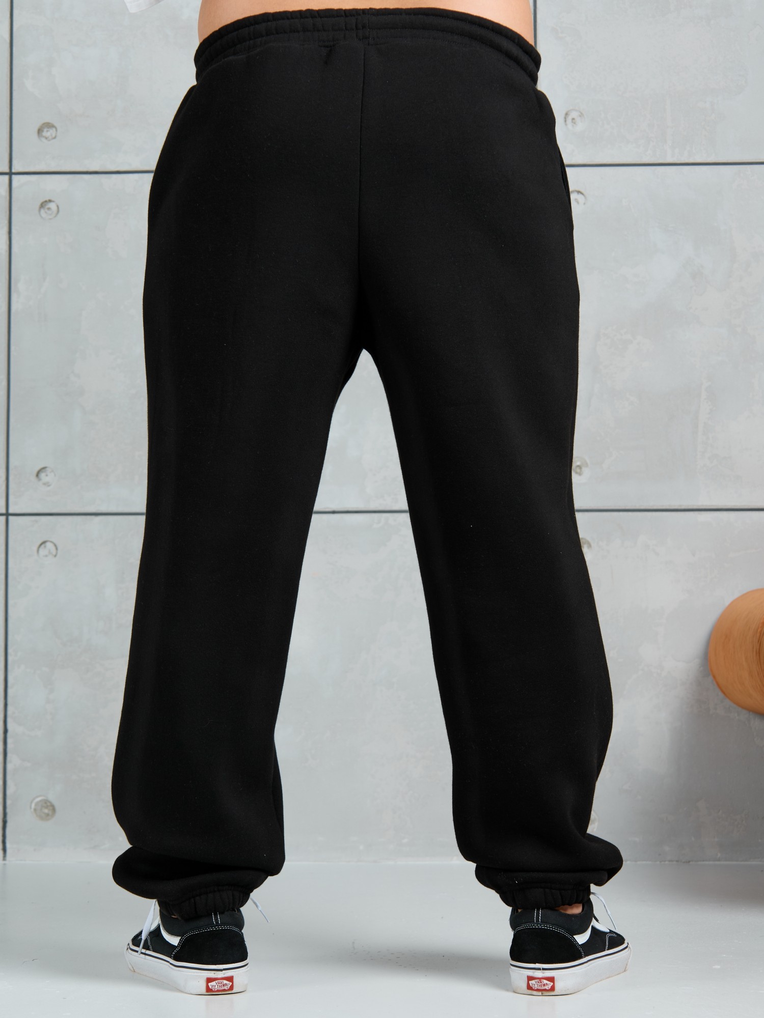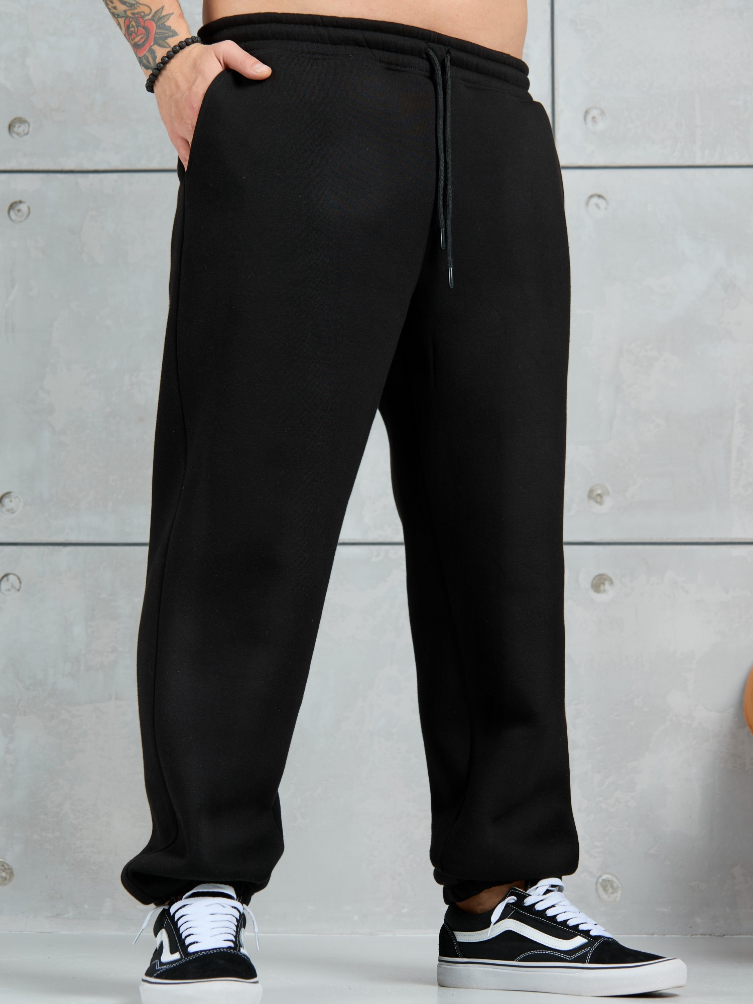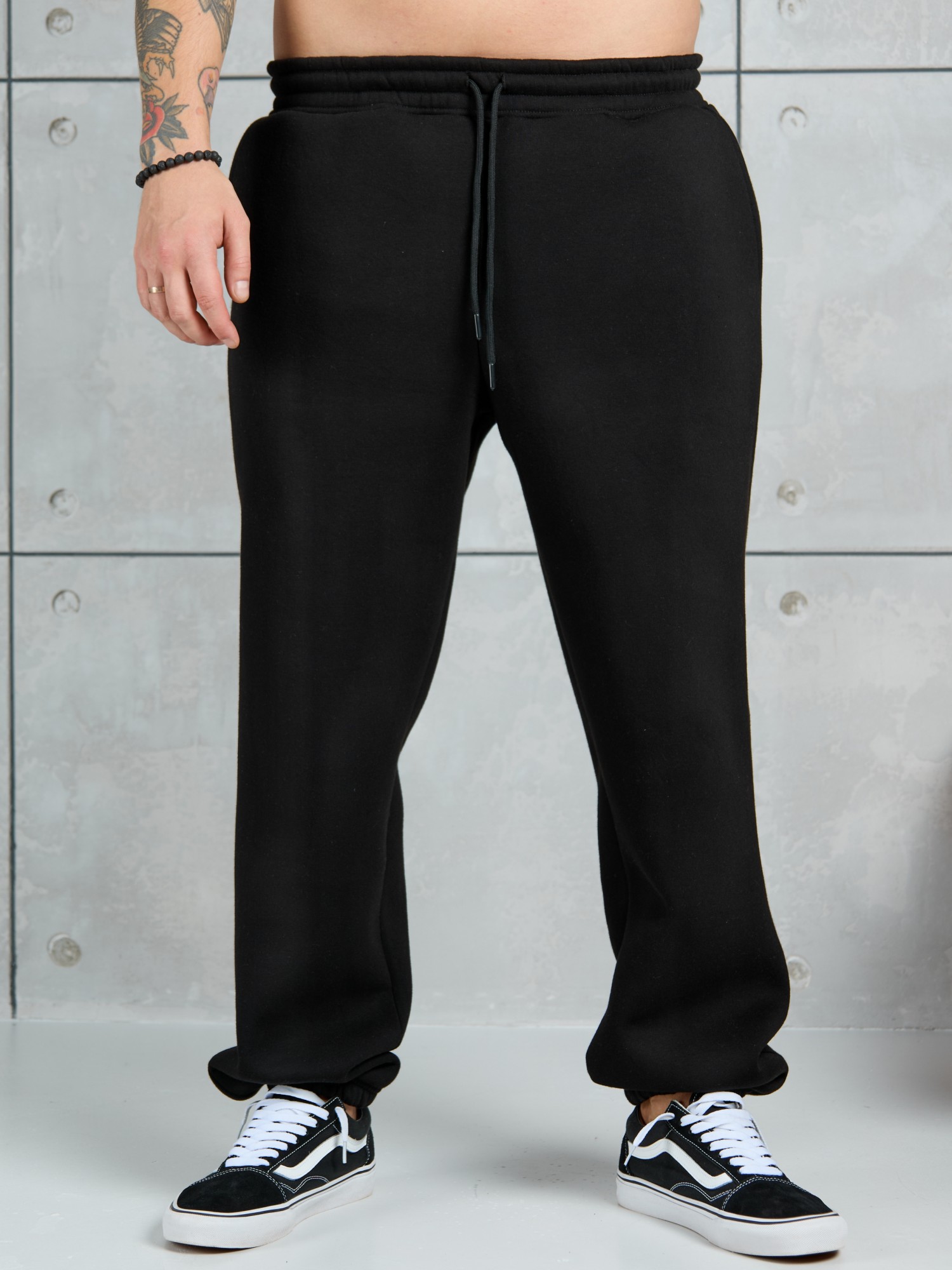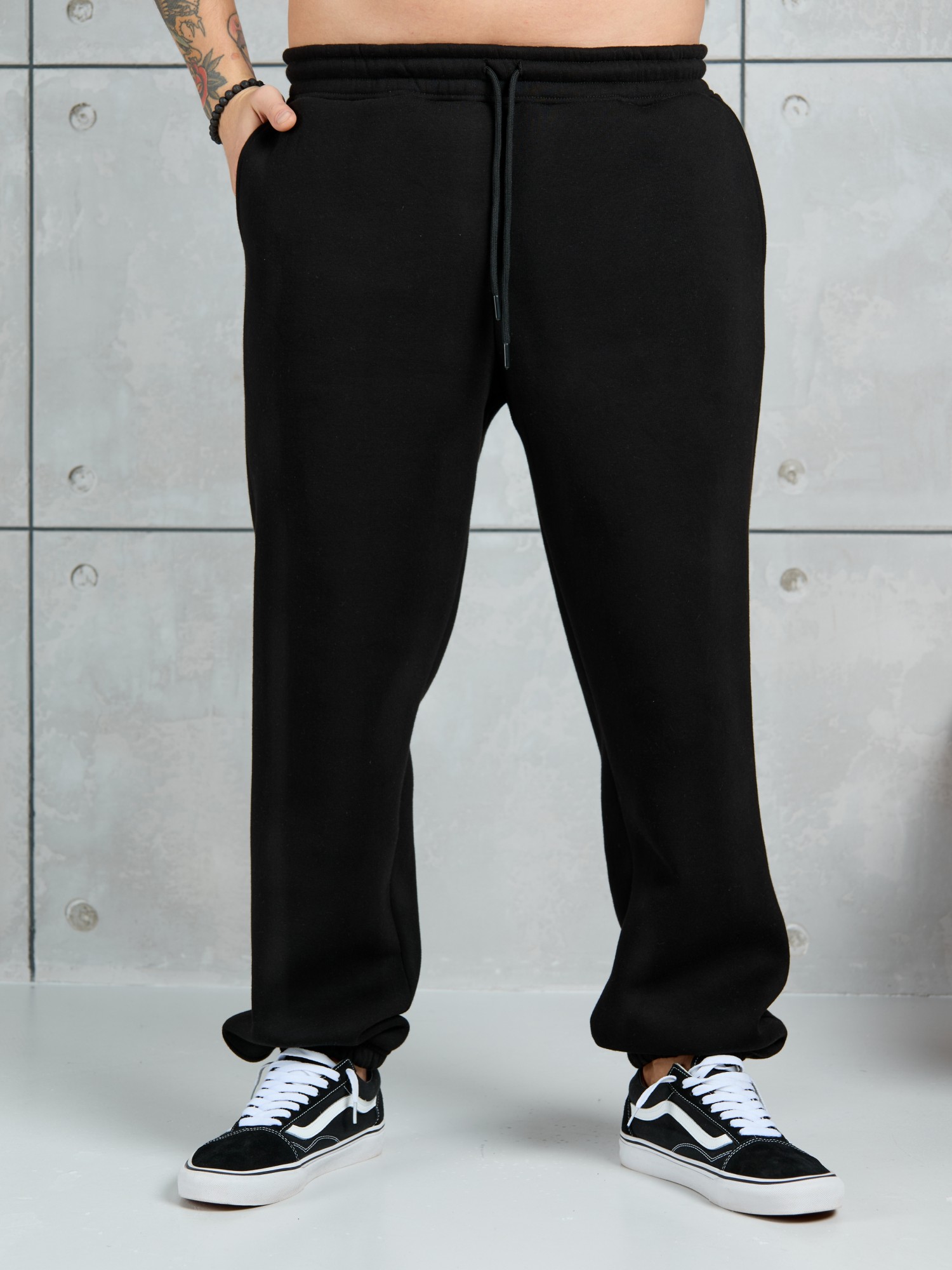 Брюки мужские из трикотажного полотна "футер-3-нитка с начесом", на притачном поясе с эластичной тесьмой внутри, с карманами в боковых швах. Нижние срезы обработаны подгибкой с эластичной тесьмой. Для регулирования степени прилегания изделия по линии талии предусмотрен декоративный шнурок, вставленный в пояс и продетый через две обметанные петли в центре.