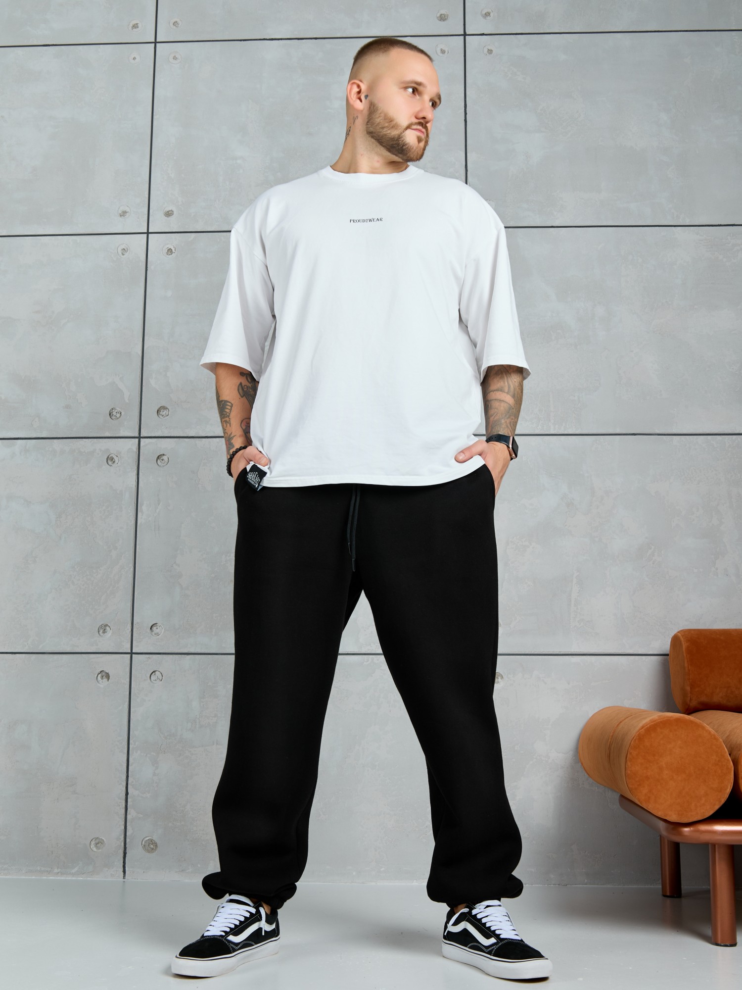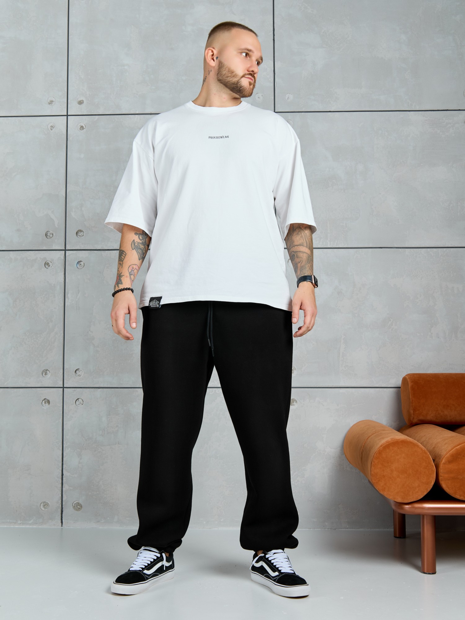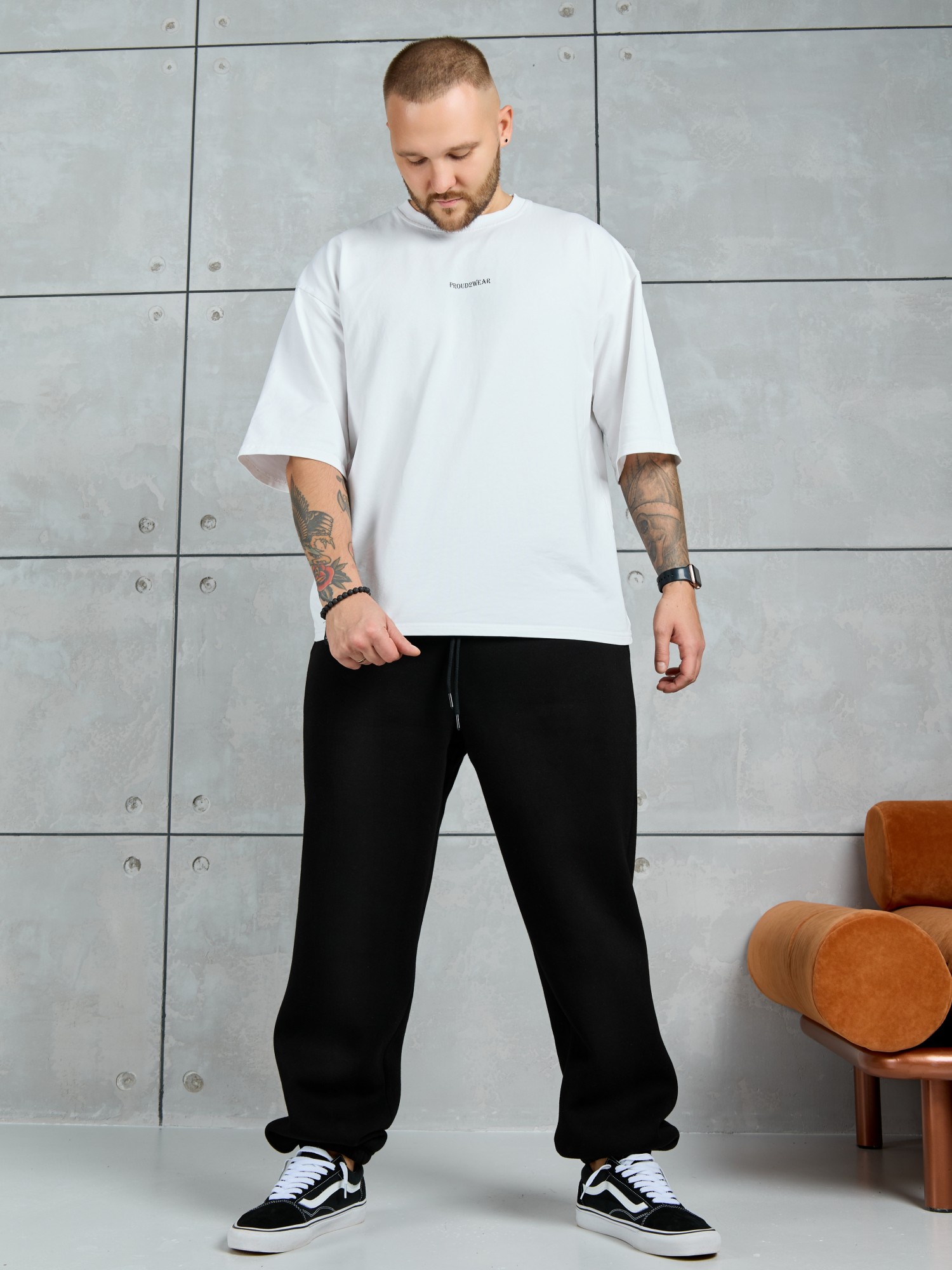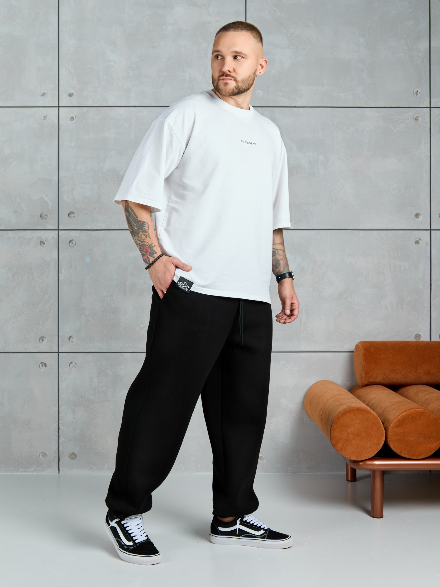 Брюки мужские из трикотажного полотна "футер-3-нитка с начесом", на притачном поясе с эластичной тесьмой внутри, с карманами в боковых швах. Нижние срезы обработаны подгибкой с эластичной тесьмой. Для регулирования степени прилегания изделия по линии талии предусмотрен декоративный шнурок, вставленный в пояс и продетый через две обметанные петли в центре.