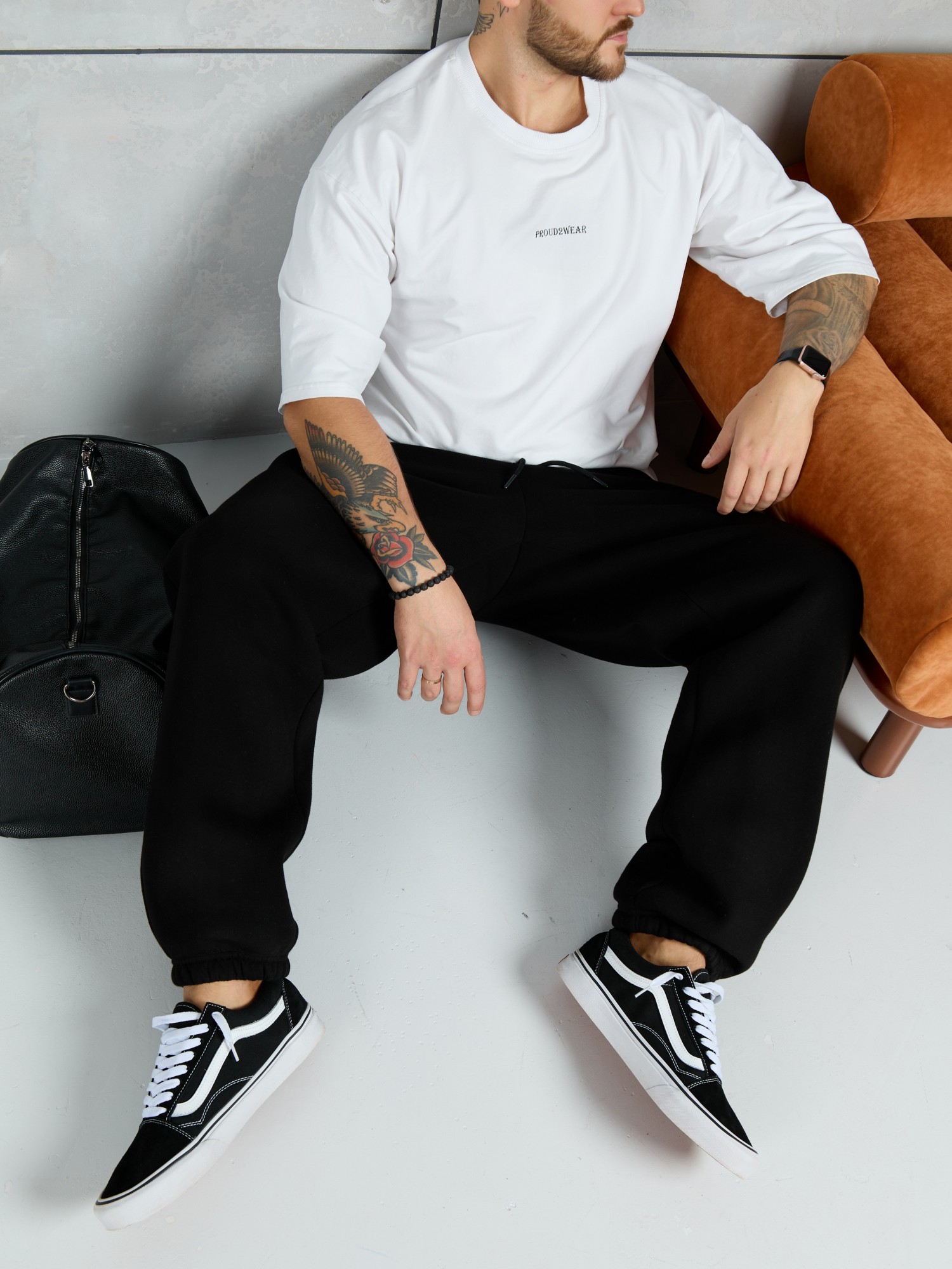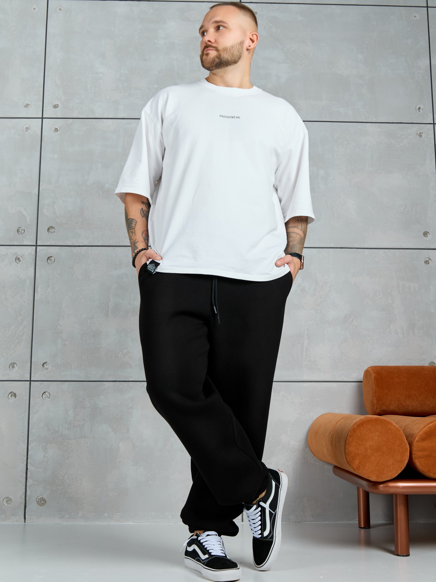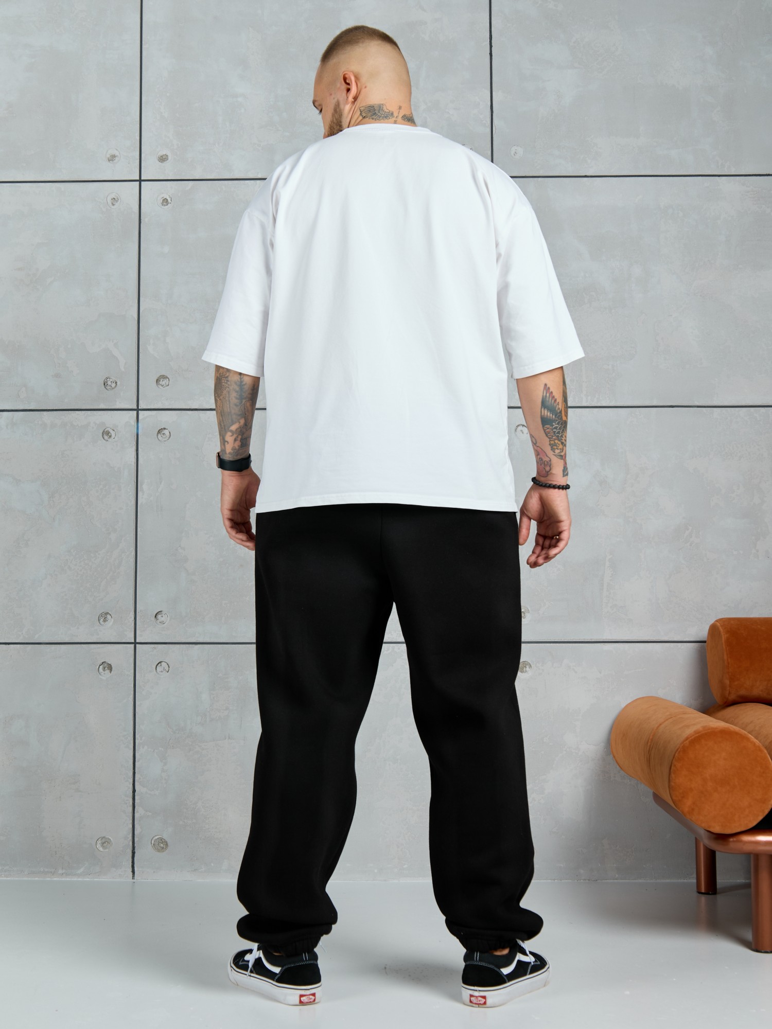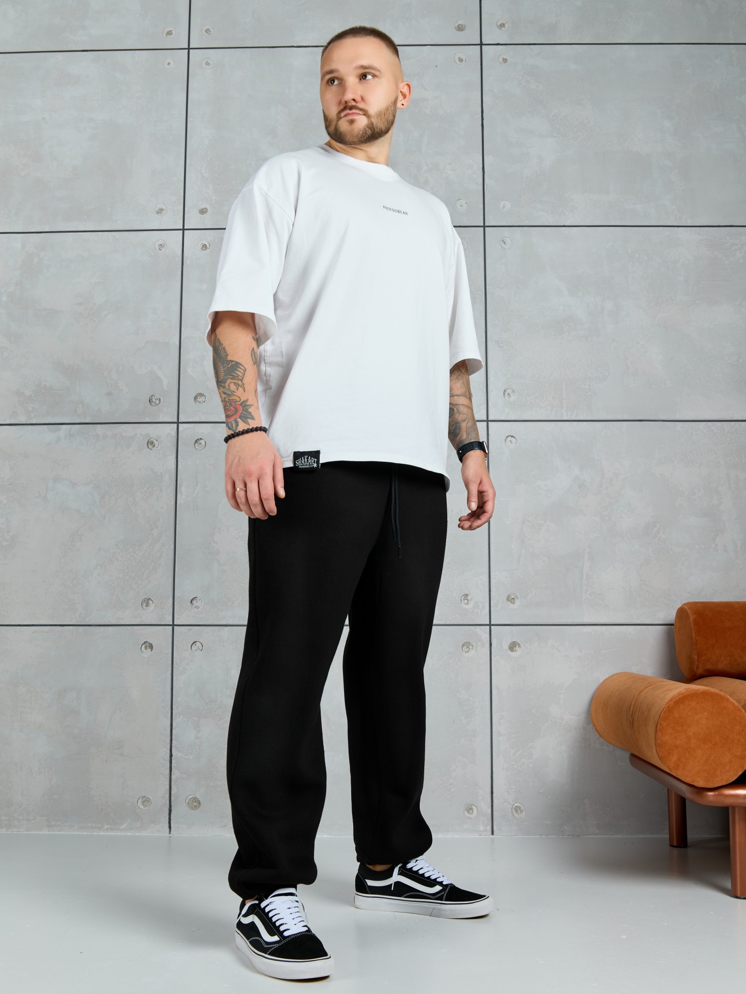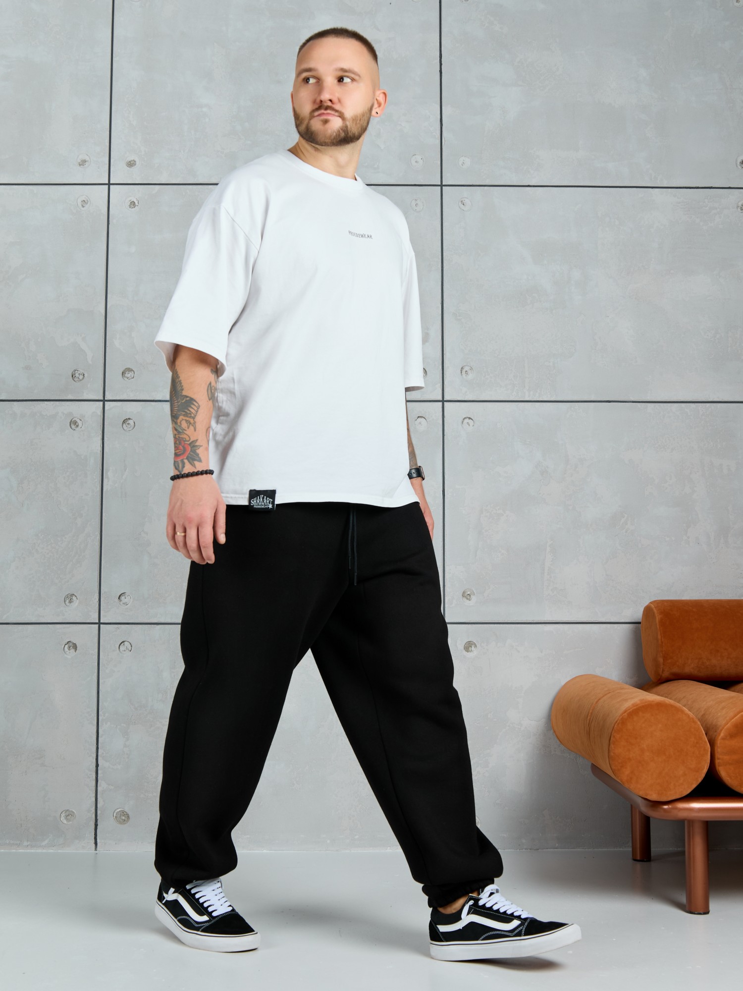 Брюки мужские из трикотажного полотна "футер-3-нитка с начесом", на притачном поясе с эластичной тесьмой внутри, с карманами в боковых швах. Нижние срезы обработаны подгибкой с эластичной тесьмой. Для регулирования степени прилегания изделия по линии талии предусмотрен декоративный шнурок, вставленный в пояс и продетый через две обметанные петли в центре.