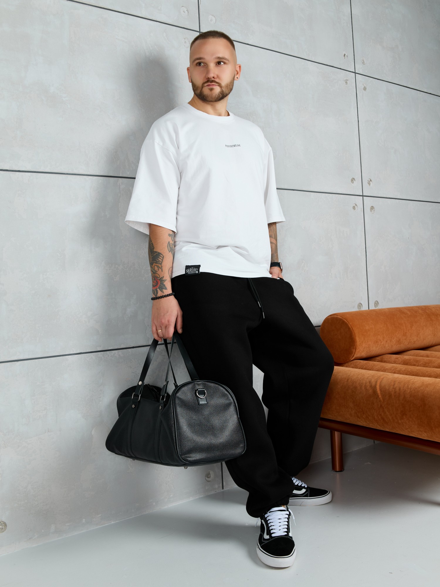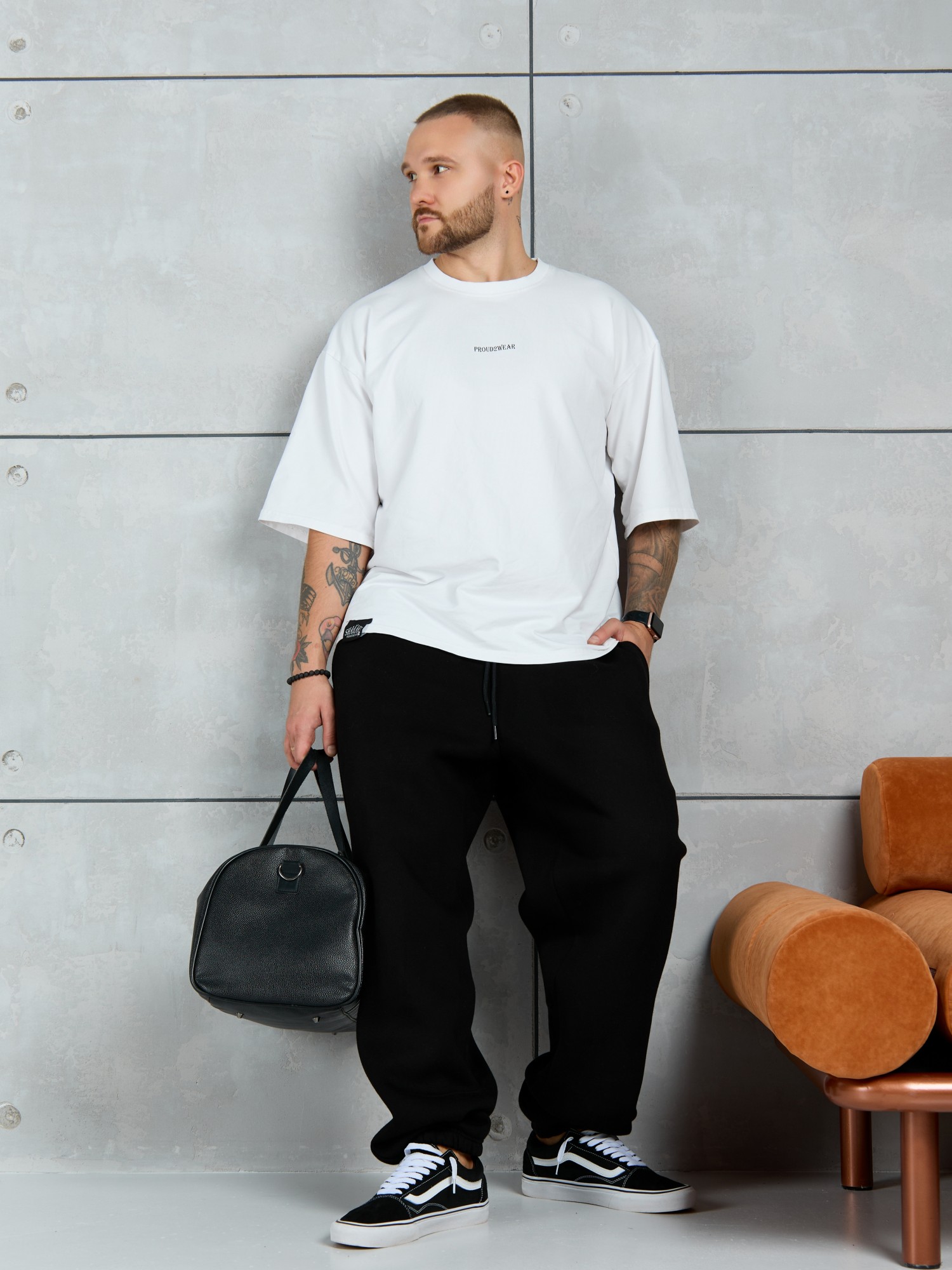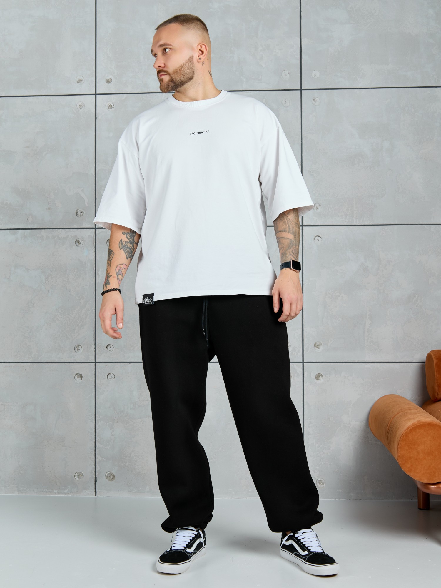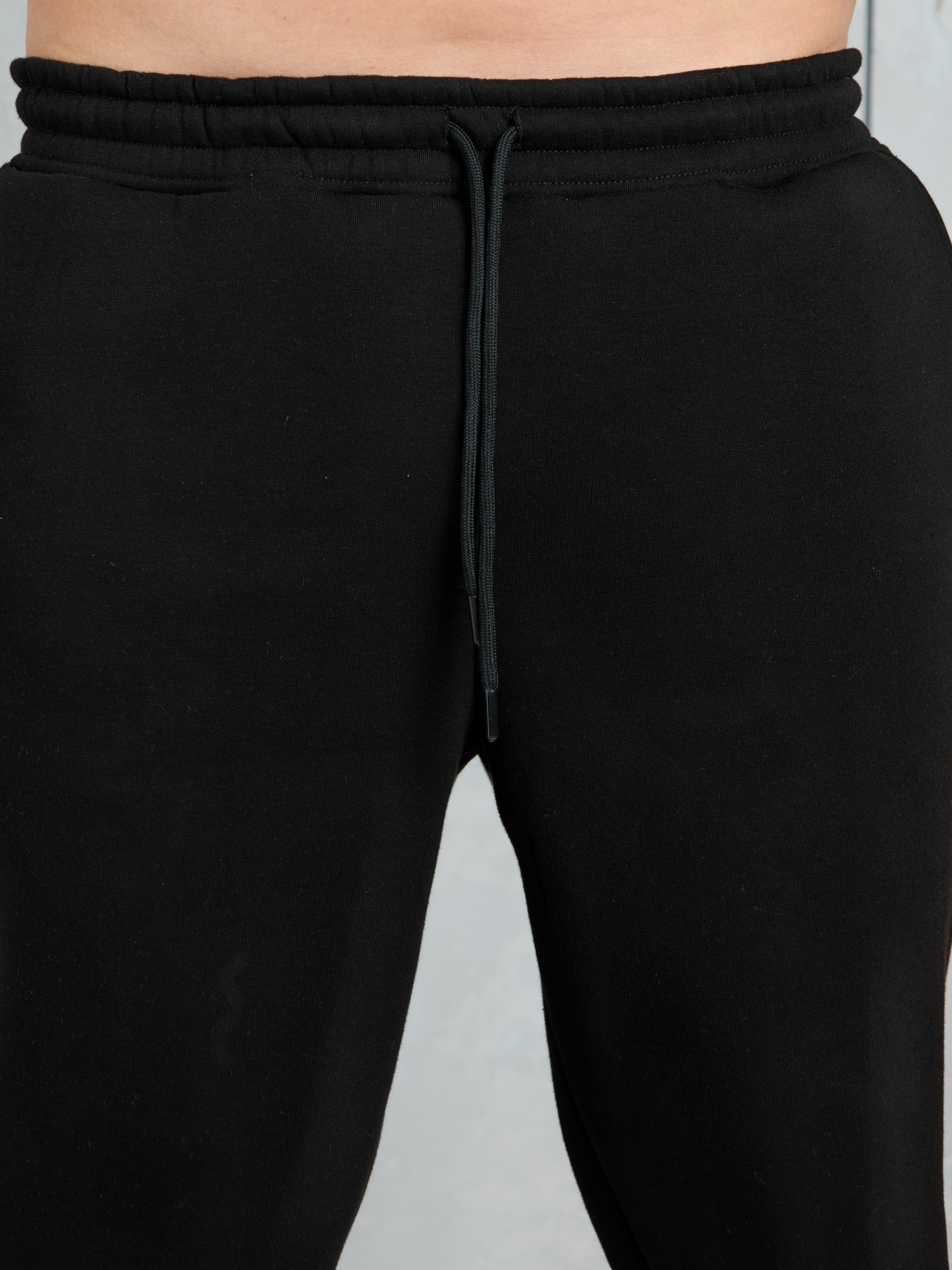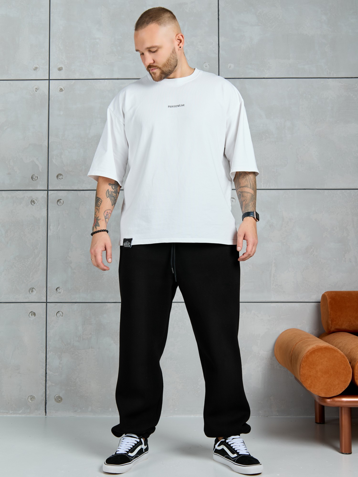 Брюки мужские из трикотажного полотна "футер-3-нитка с начесом", на притачном поясе с эластичной тесьмой внутри, с карманами в боковых швах. Нижние срезы обработаны подгибкой с эластичной тесьмой. Для регулирования степени прилегания изделия по линии талии предусмотрен декоративный шнурок, вставленный в пояс и продетый через две обметанные петли в центре.