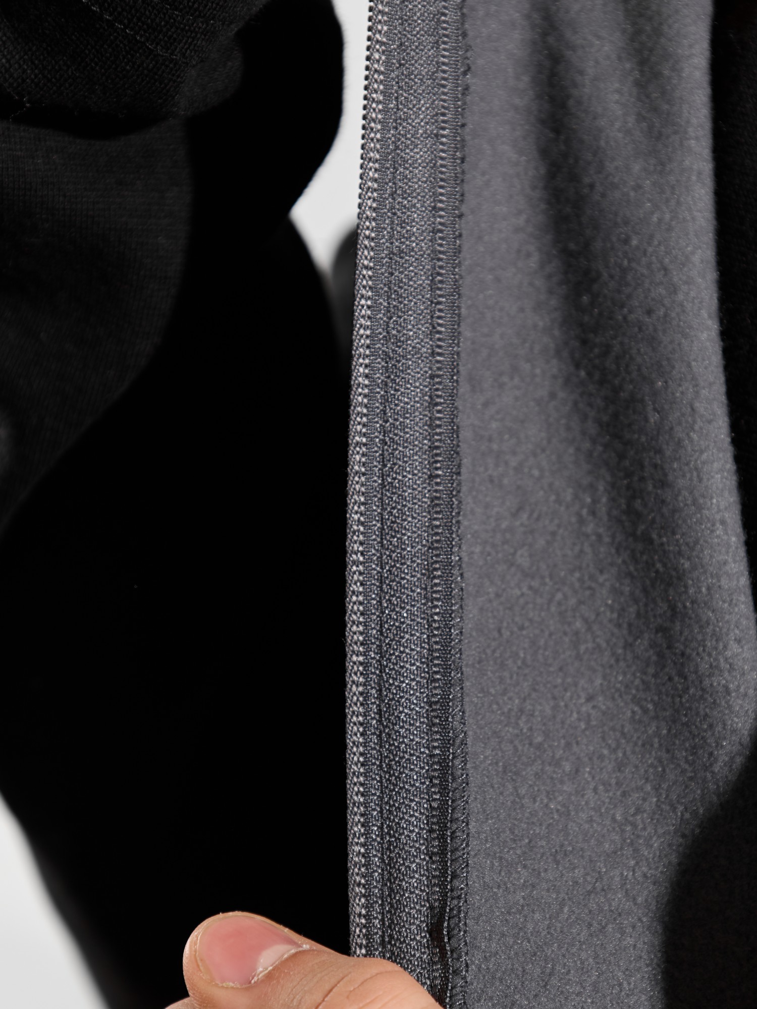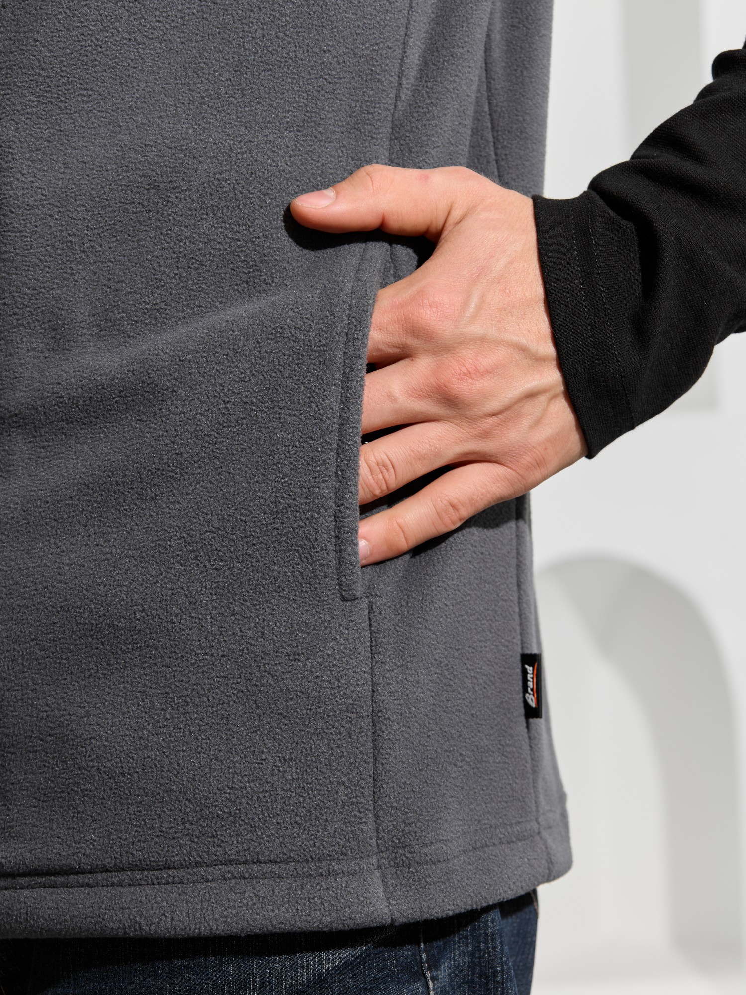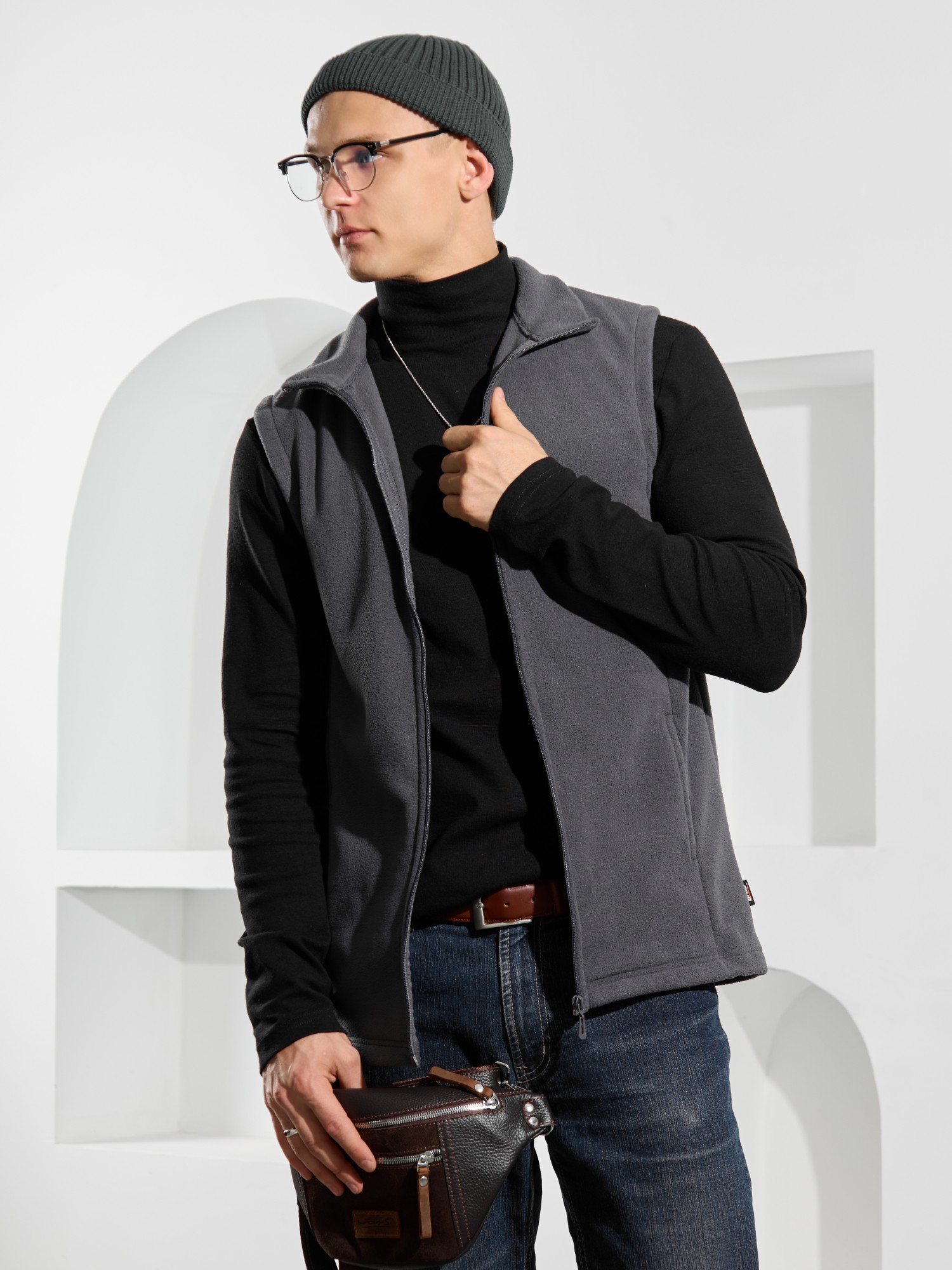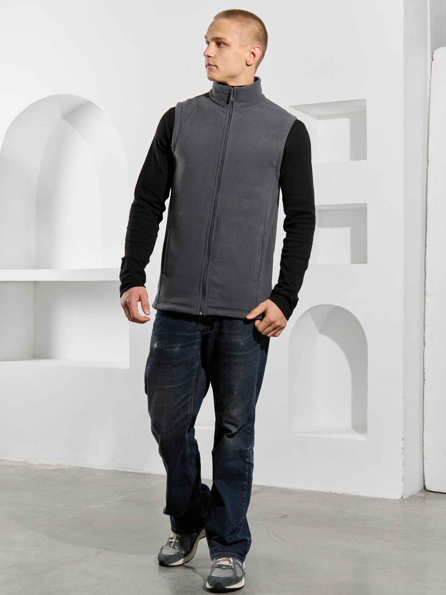 Жилет мужской из флиса, прилегающего силуэта, с воротником-стойкой , центральной боротовой застежкой на тесьму "молния" и вертикальными рельефами на полочках, в швах которых обработаны карманы. Проймы и низ изделия обработаны подгибкой. В нижней части левого бокового шва вставлен небольшой декоративный элемент из репсовой ленты.