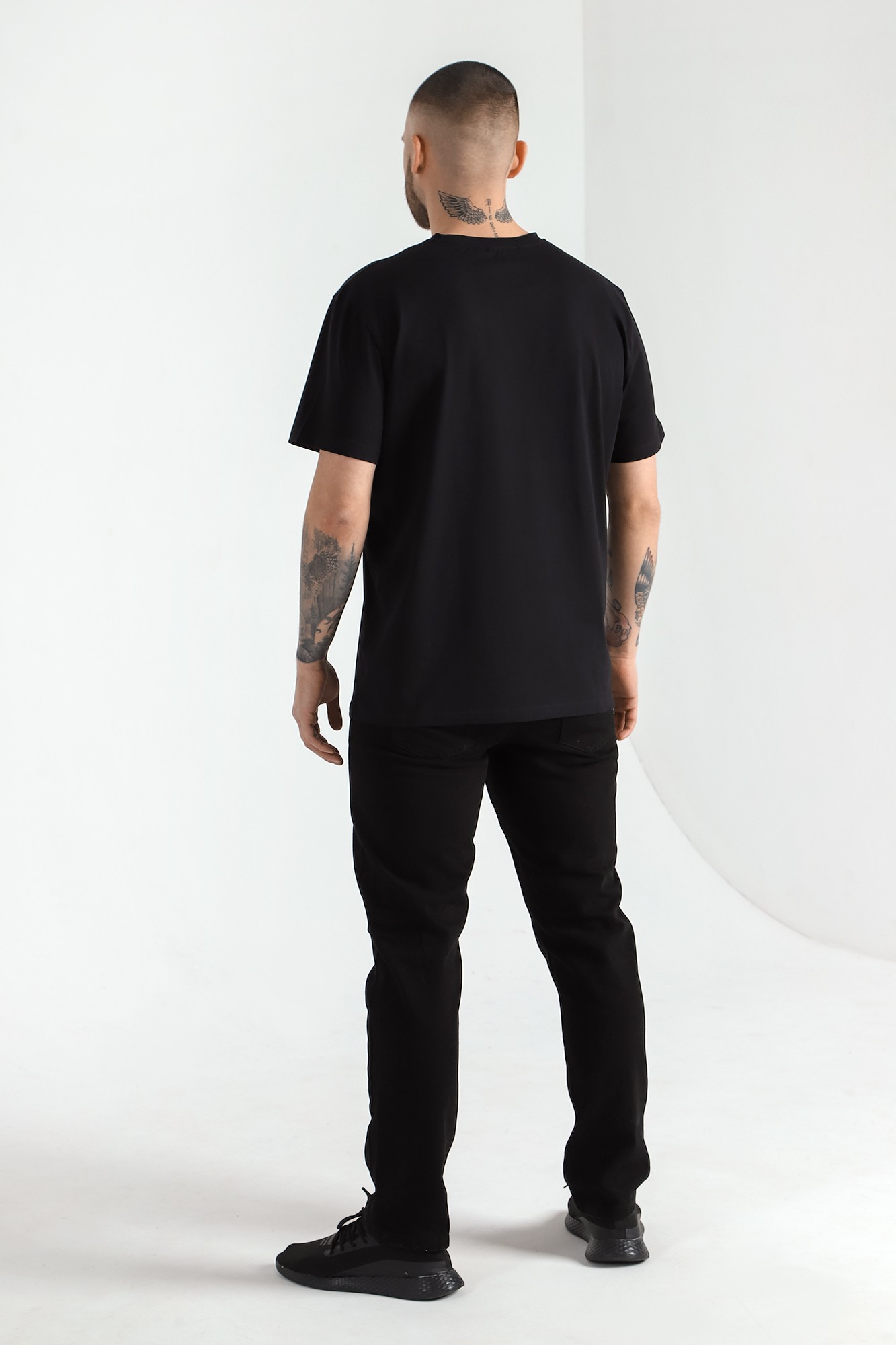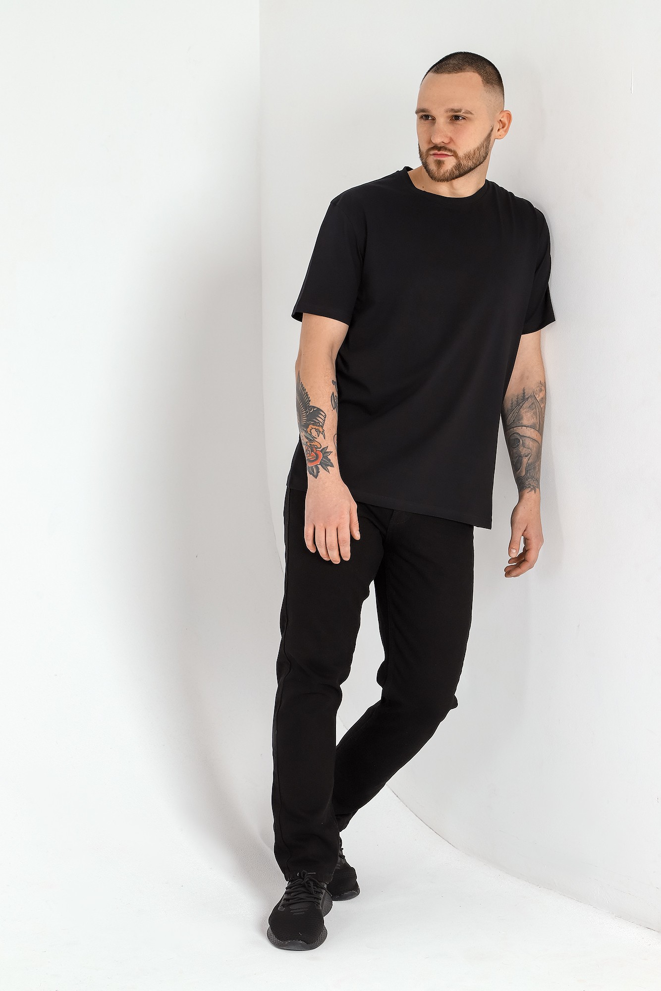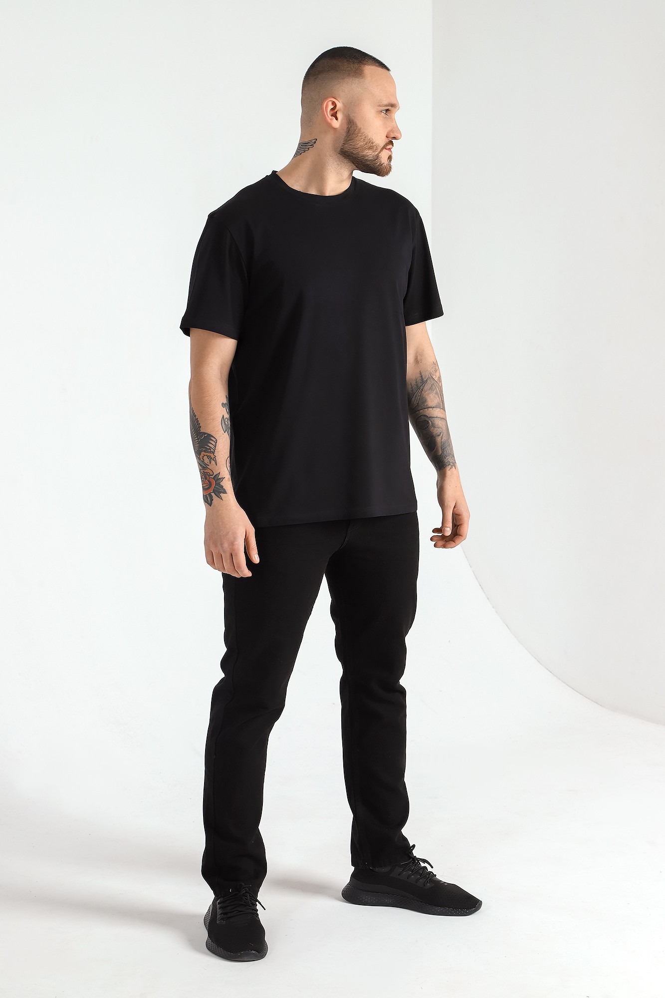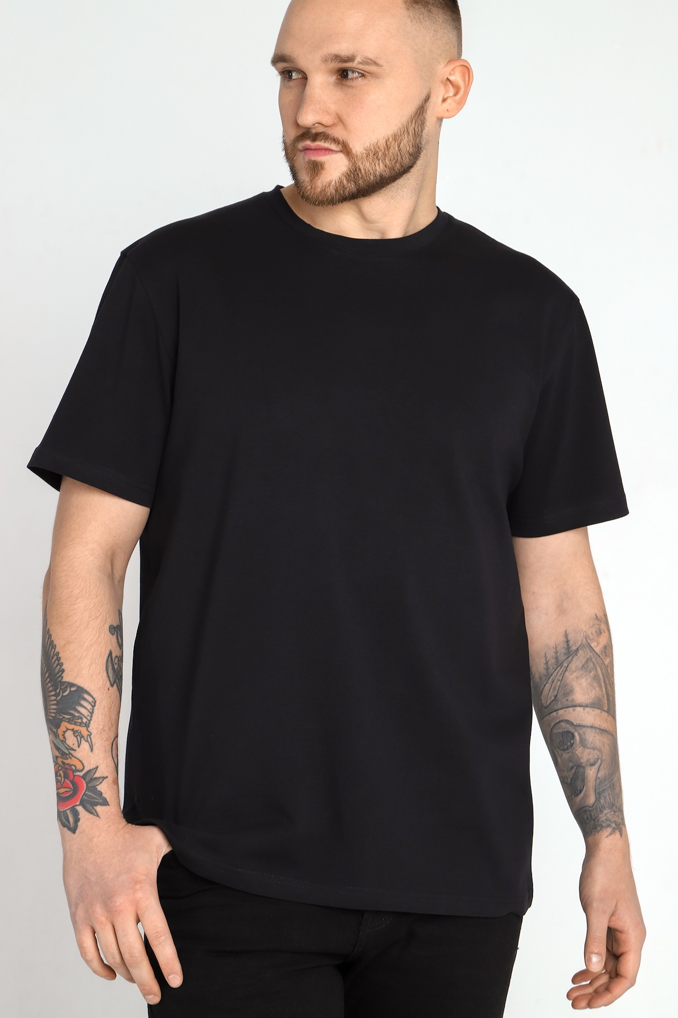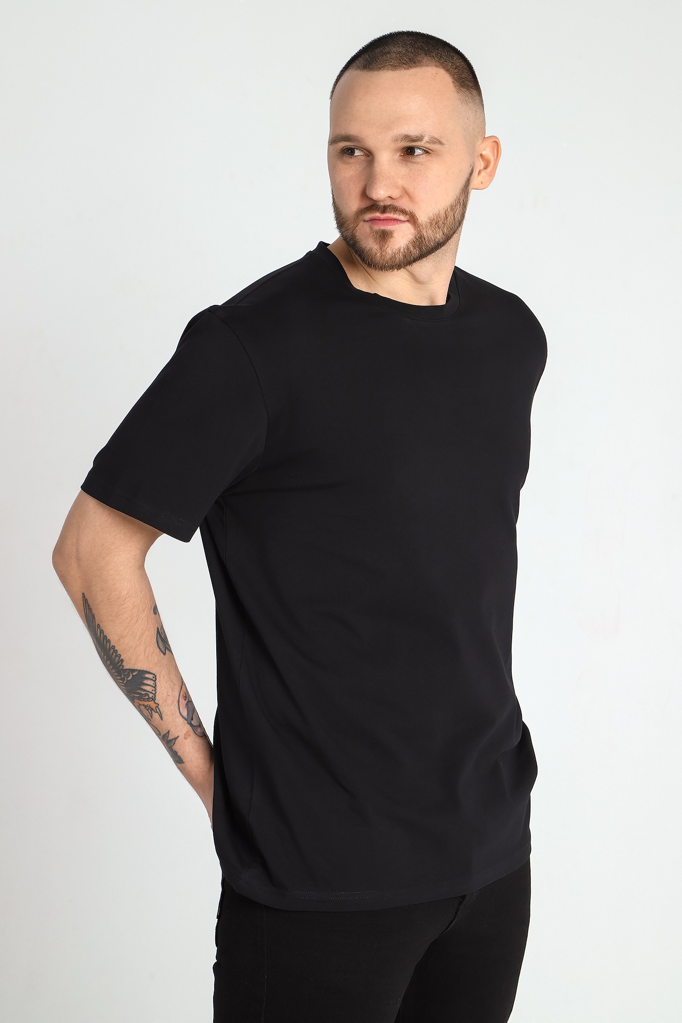 Базовая однотонная мужская футболка прямого силуэта без принта. Выполнена из трикотажного полотна: хлопкового с добавлением лайкры. Горловина округлой формы с усилителем горловины спинки.