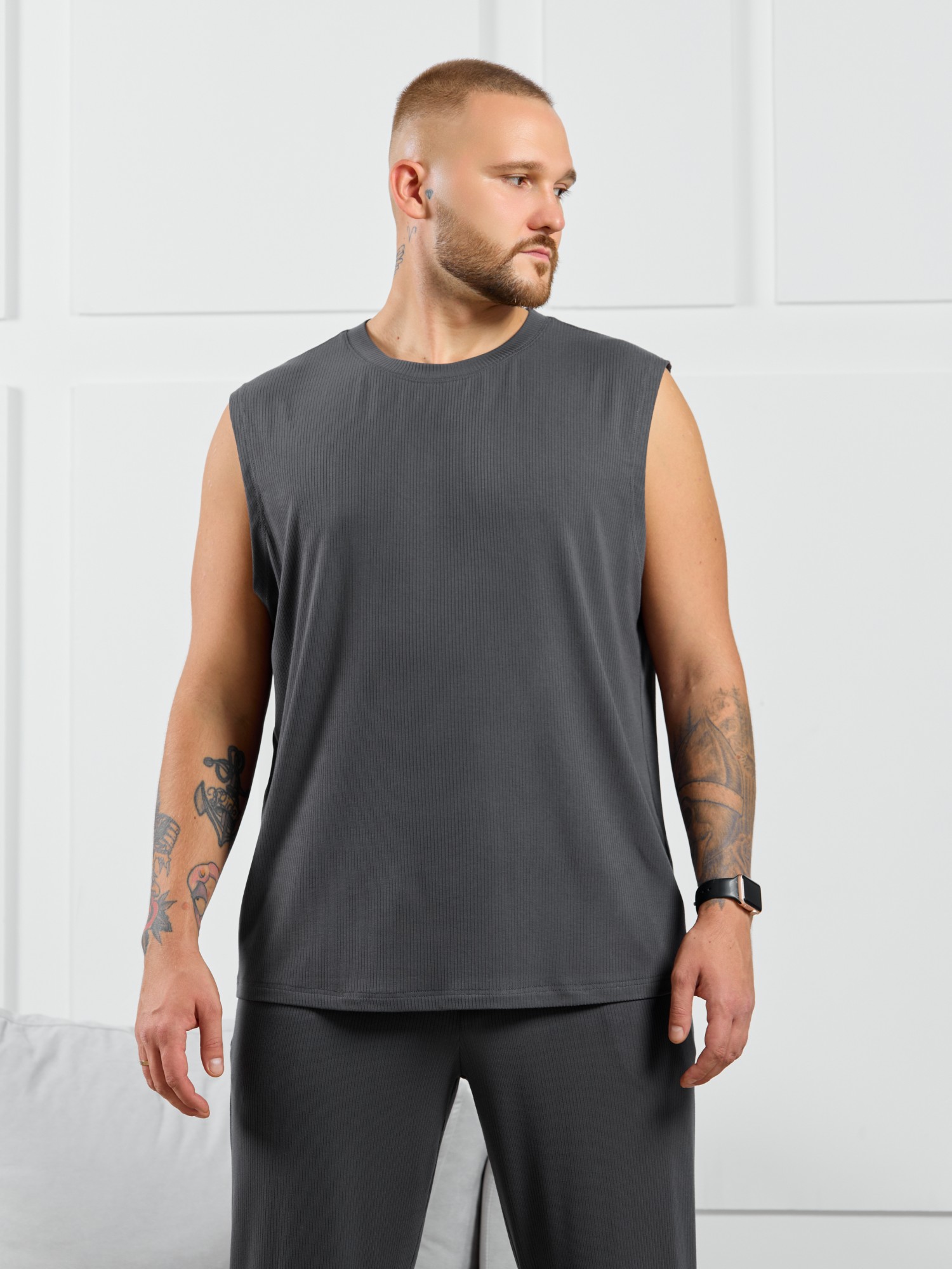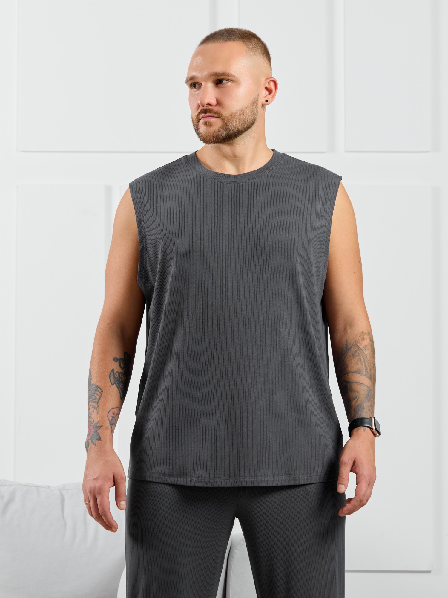 Майка мужская из пластичного однотонного трикотажного полотна в рубчик, приятного к телу. Модель свободная, с широкой спущенной линией плеч, глубокой проймой. Может подойти для отдыха, прогулок и занятий в спортзале.
