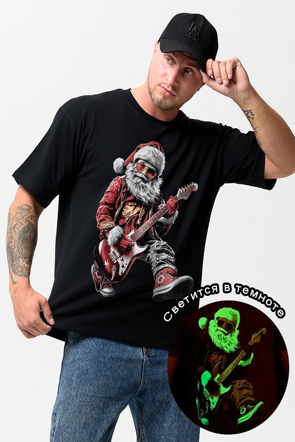 Особенность: принт светится в темноте! В ультрафиолетовом свете или полной темноте Санта засияет зелёным свечением — идеально для новогодних вечеринок, концертов или просто для wow-эффекта. Футболка из мягкого хлопкового трикотажа , oversize-крой для комфорта, круглый вырез.