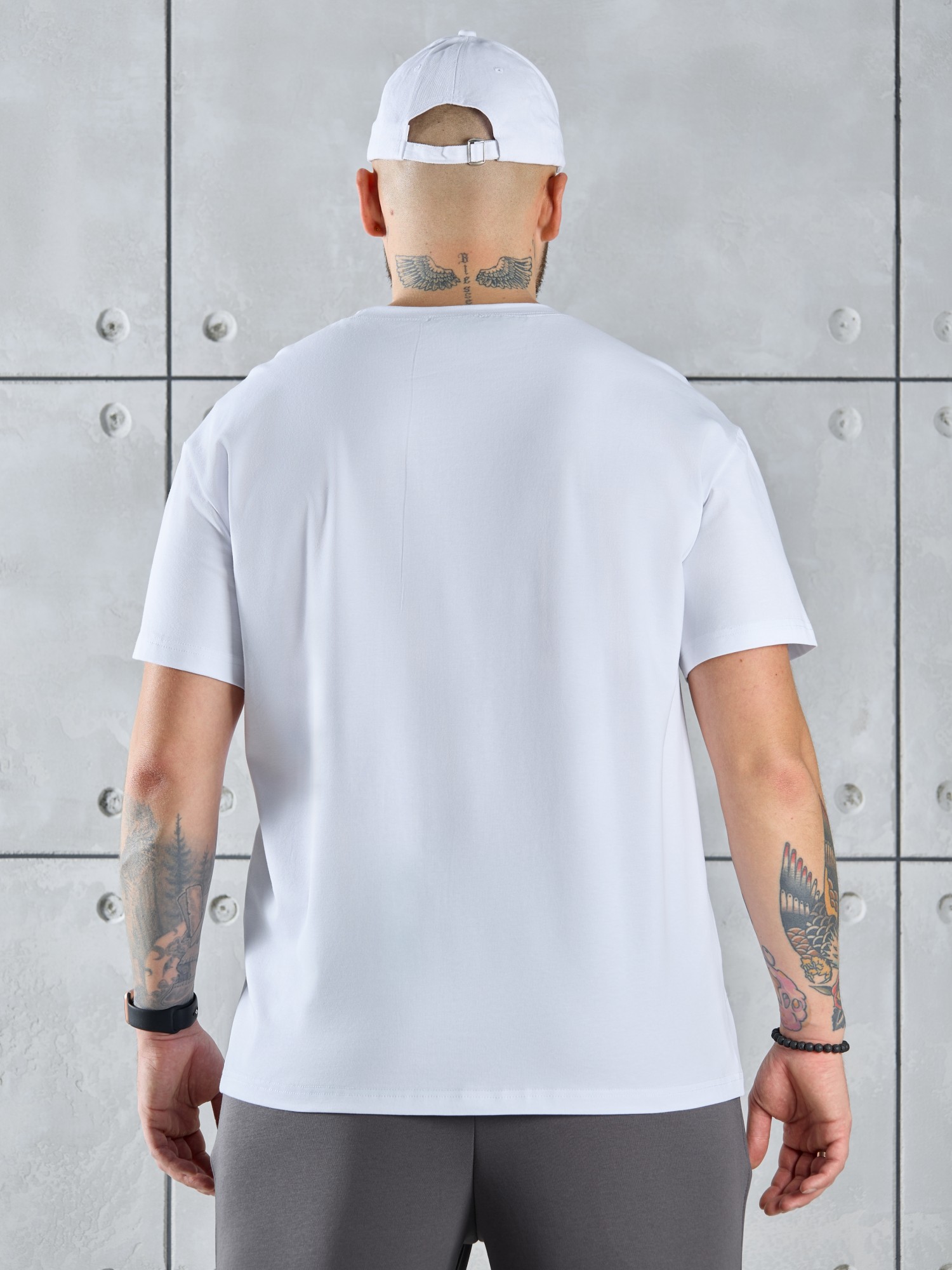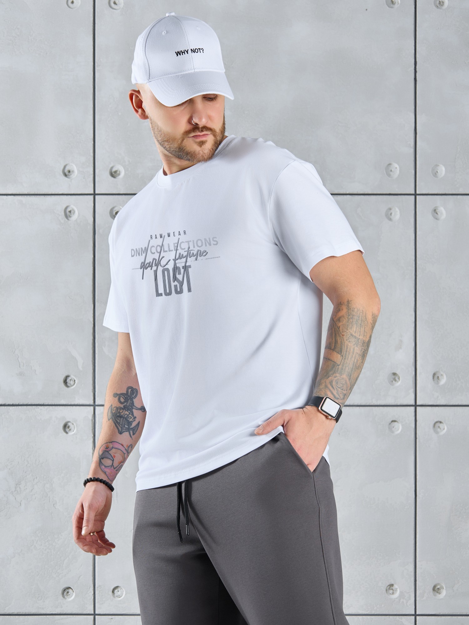 Футболка мужская из гладкокрашеного трикотажного полотна "кулирка с лайкрой" классического покроя со слегка удлиненными плечевыми швами, короткими втачными рукавами, и горловиной овальной формы, обработанной втачной планкой. На детали переда - принт, выполненный в технике шелкографии. По горловине настрочена двойная отделочная строчка. Низ рукавов и изделия обработаны подгибкой.