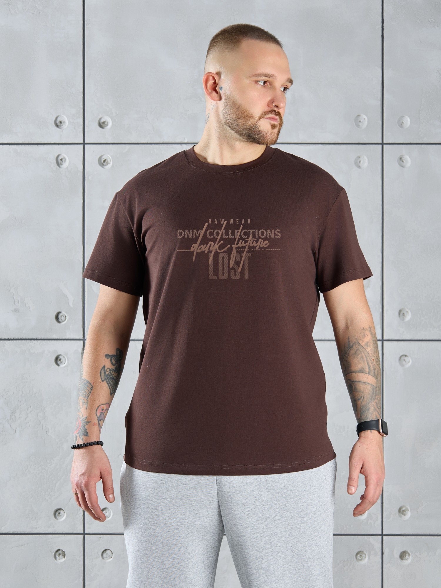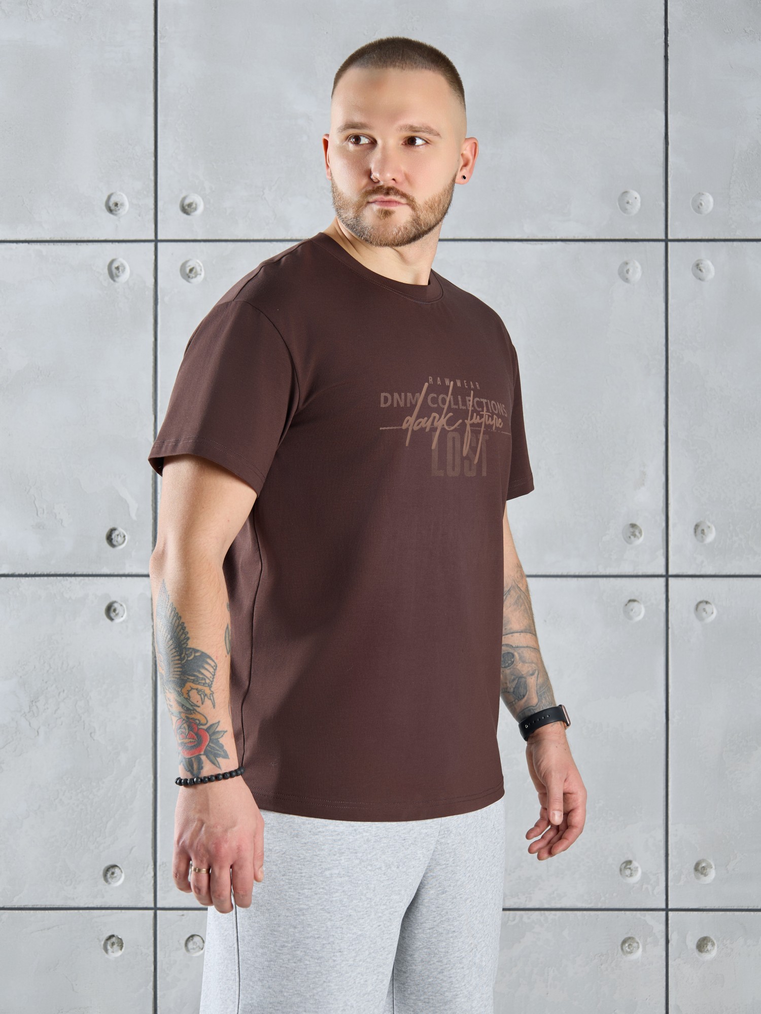 Футболка мужская из гладкокрашеного трикотажного полотна "кулирка с лайкрой" классического покроя со слегка удлиненными плечевыми швами, короткими втачными рукавами, и горловиной овальной формы, обработанной втачной планкой. На детали переда - принт, выполненный в технике шелкографии. По горловине настрочена двойная отделочная строчка. Низ рукавов и изделия обработаны подгибкой.