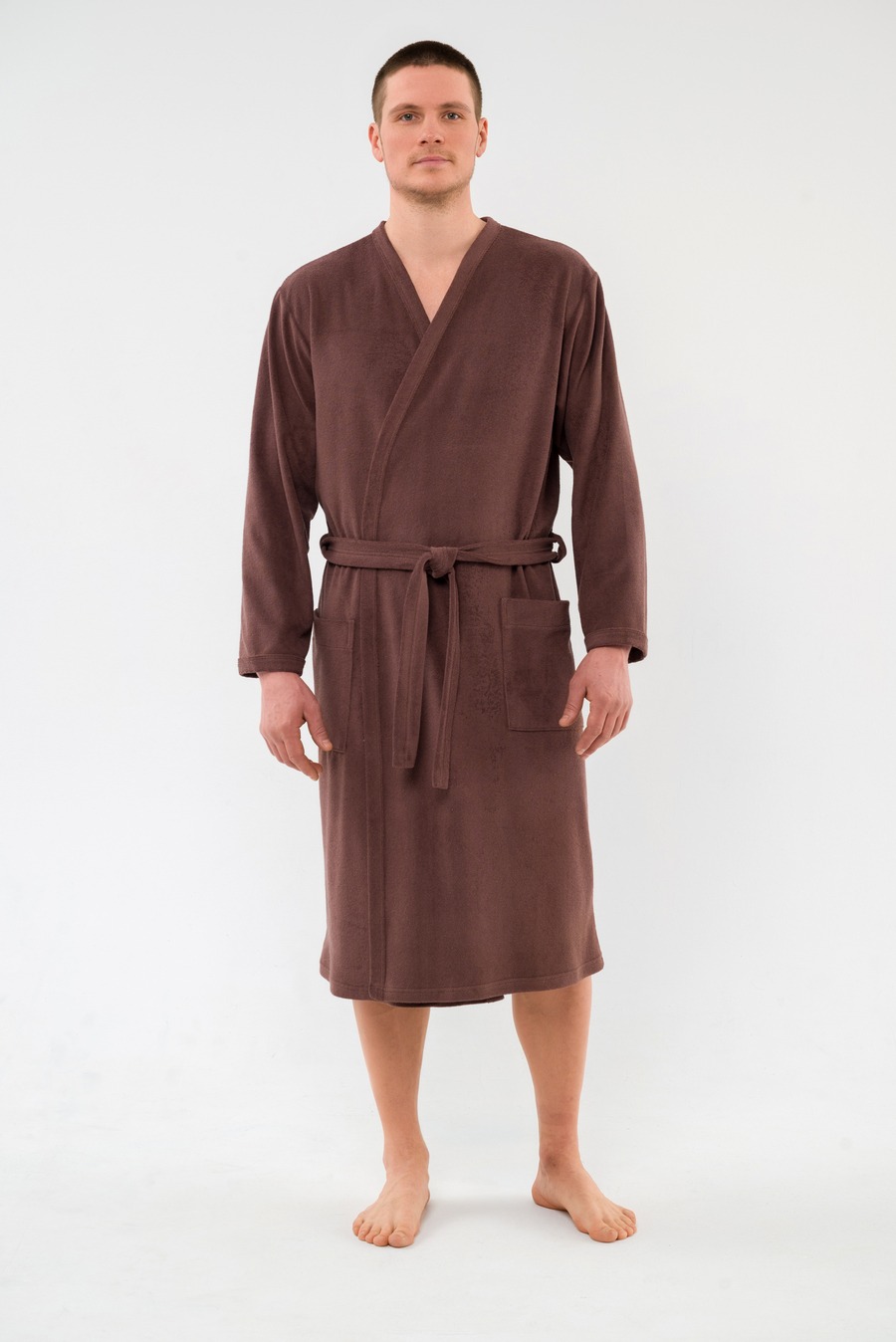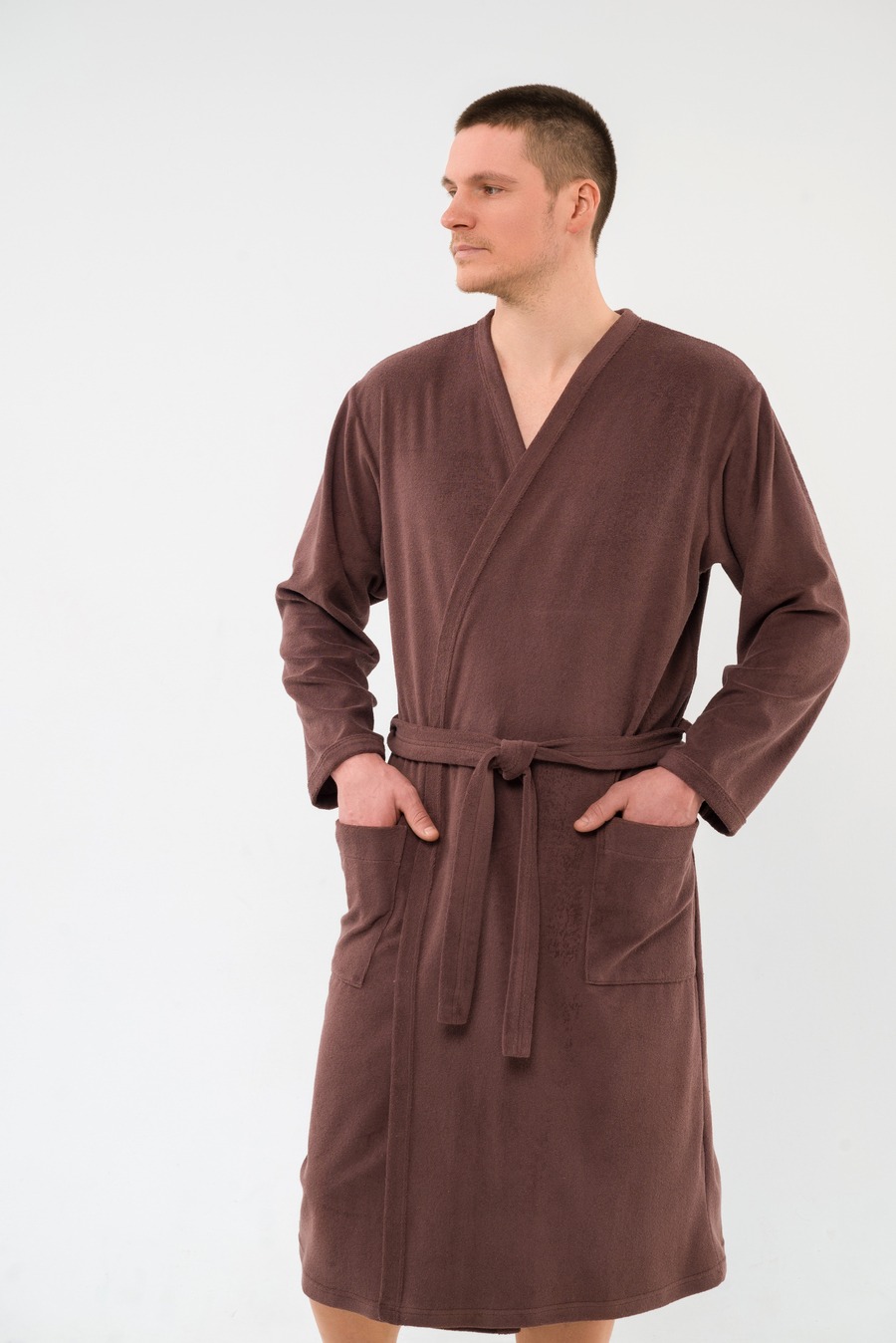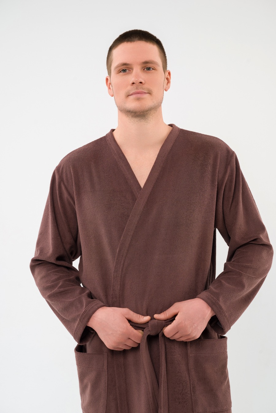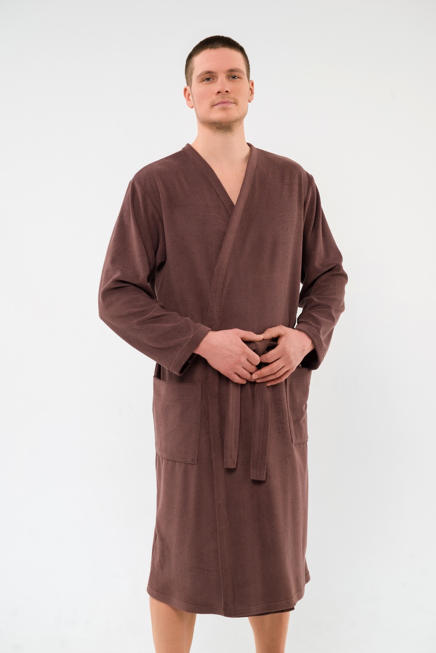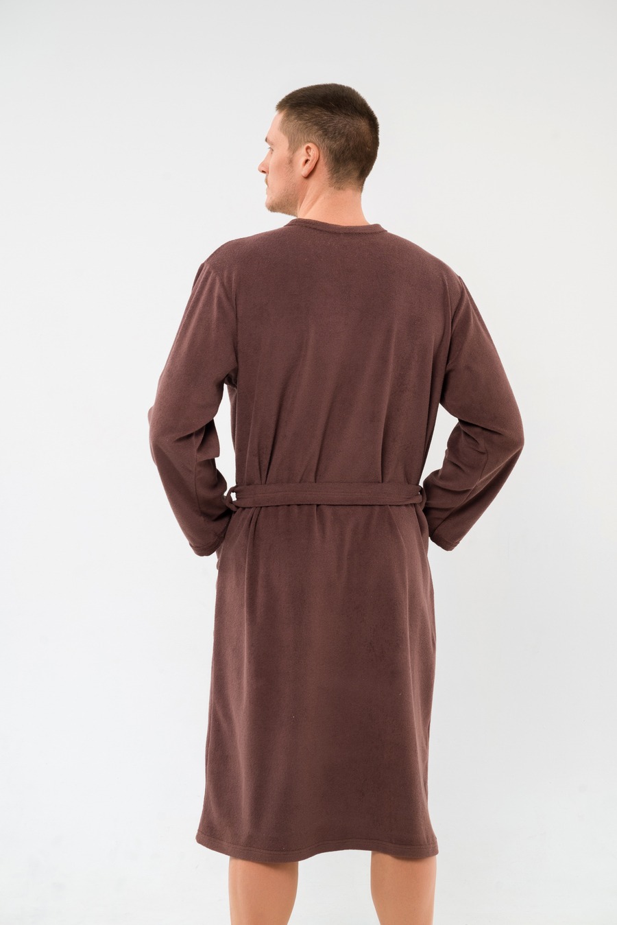 Халат мужской из махры Ренат темно-коричневый макси на запах, с длинными рукавами.