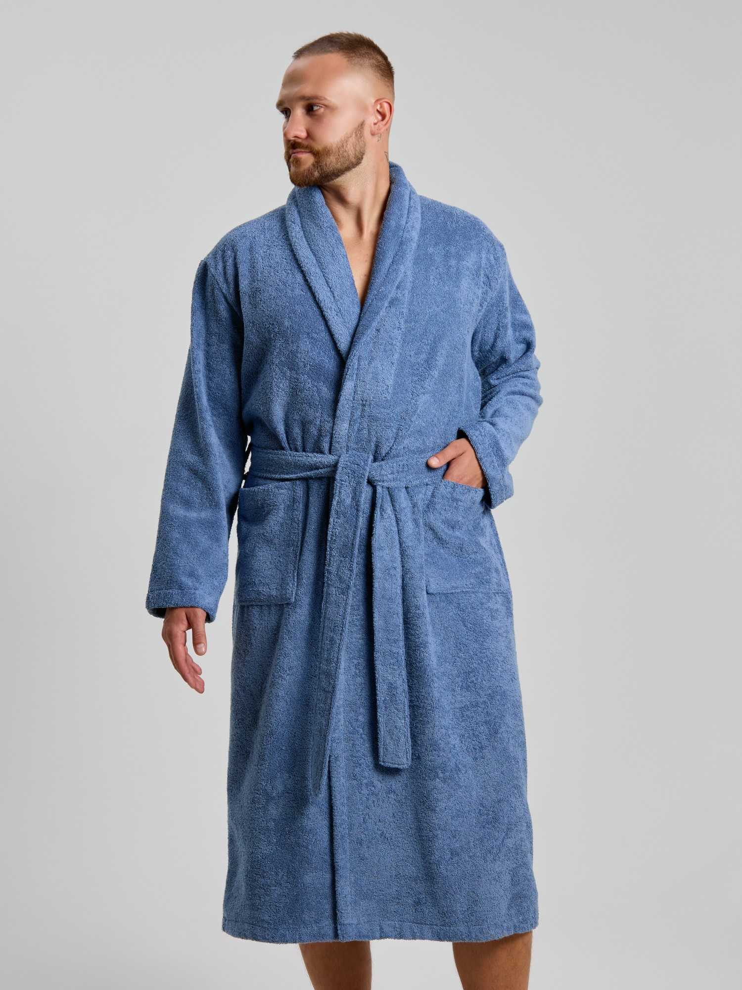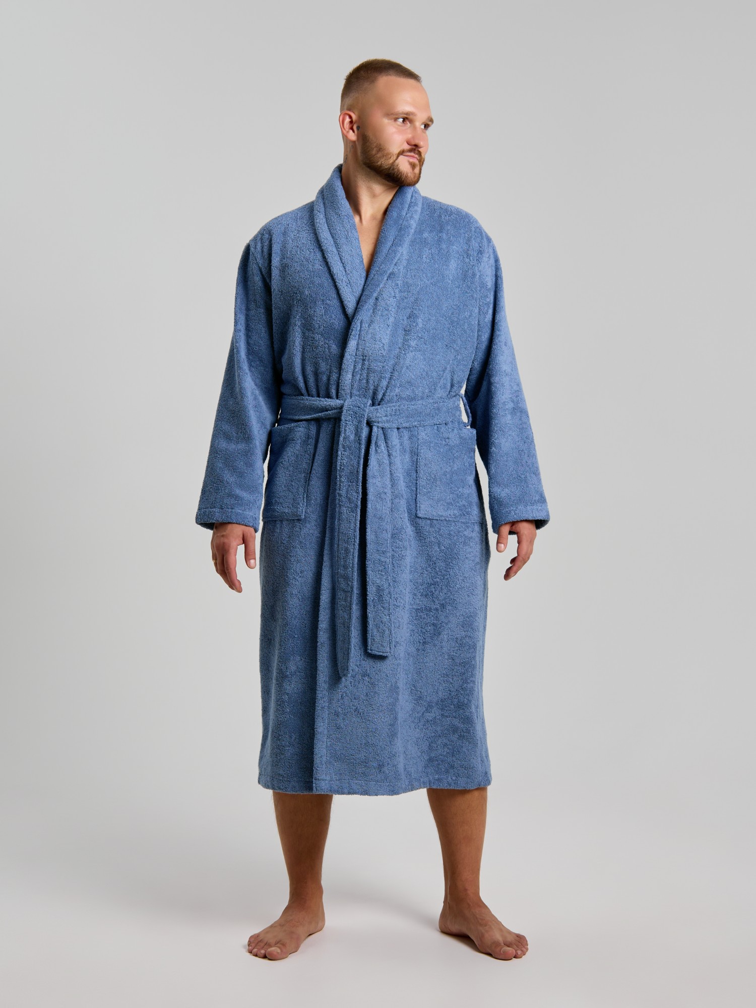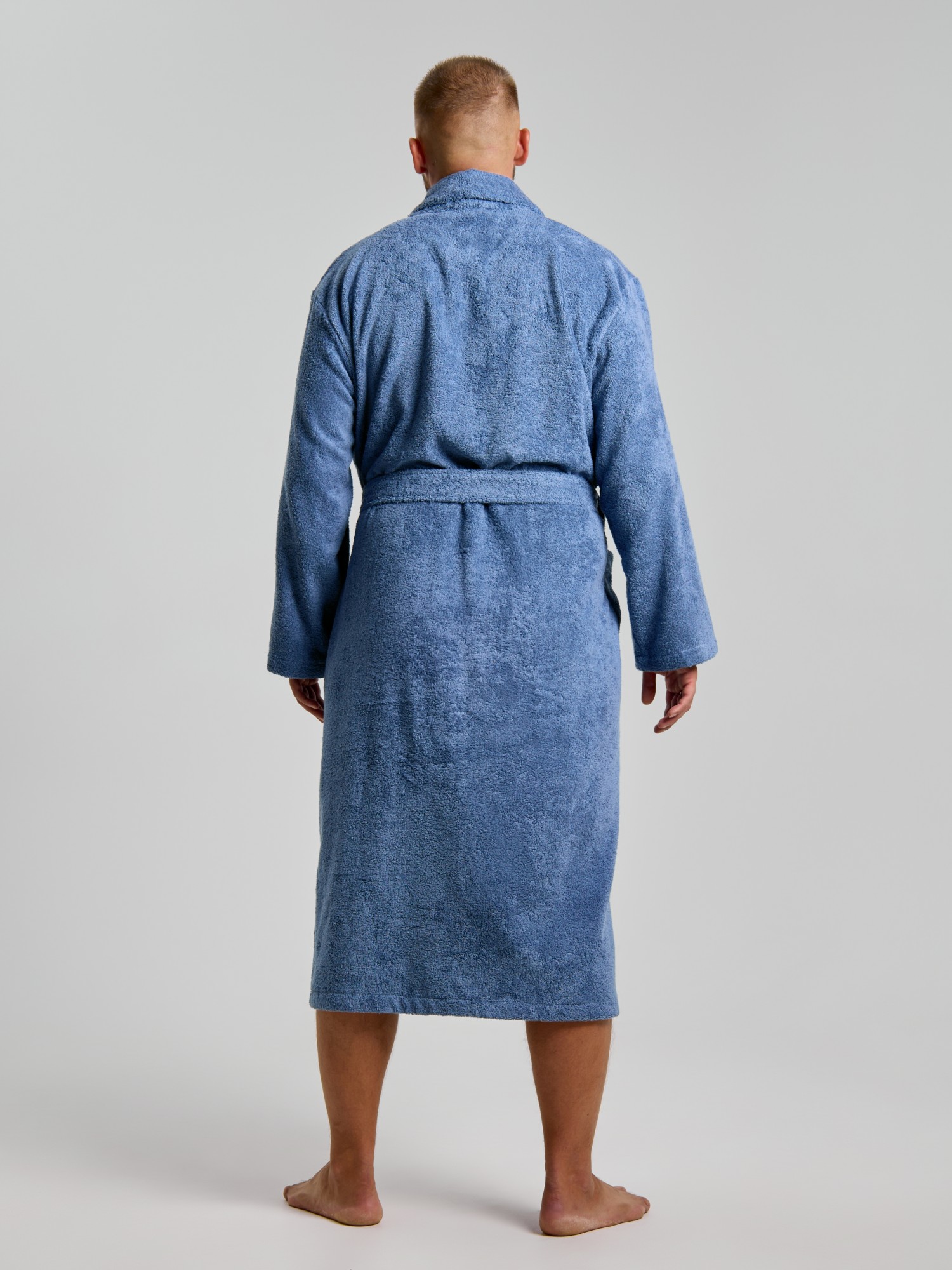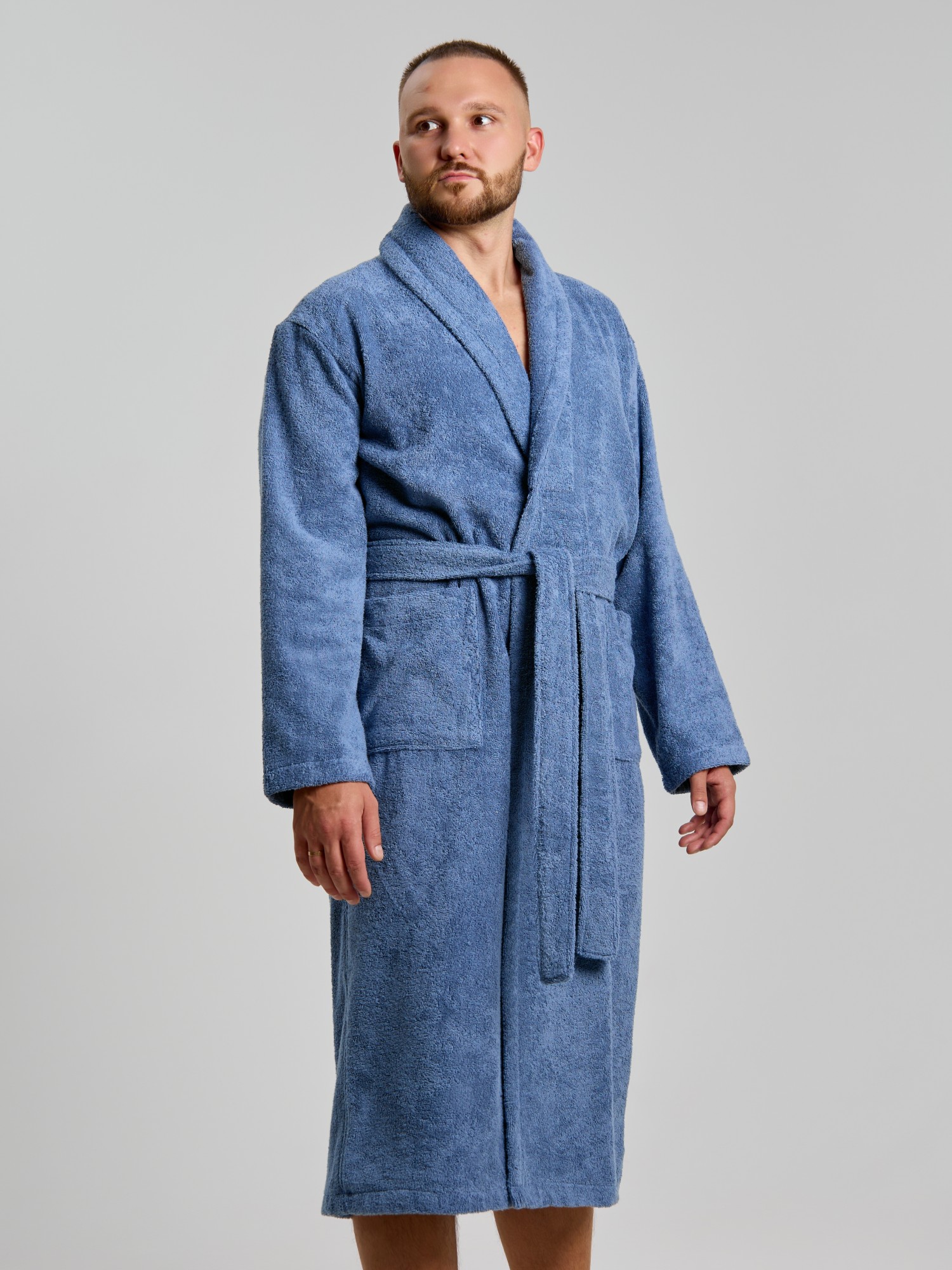 Мужской халат из двустороннего махрового хлопкового полотна. Модель на запах, с поясом в шлёвках, с боковыми карманами, с воротником "шаль", с петлей-вешалкой по горловине спинки.
