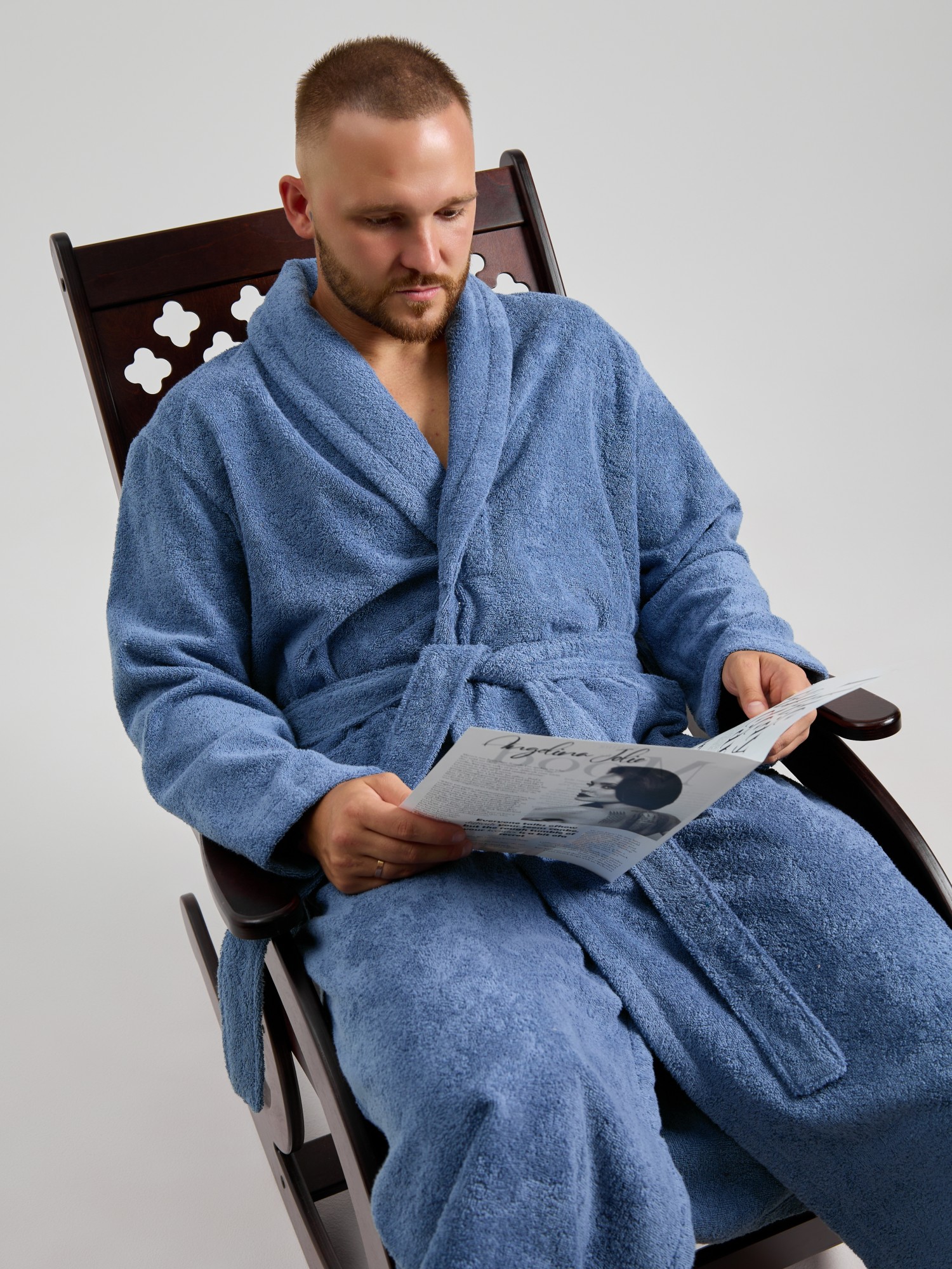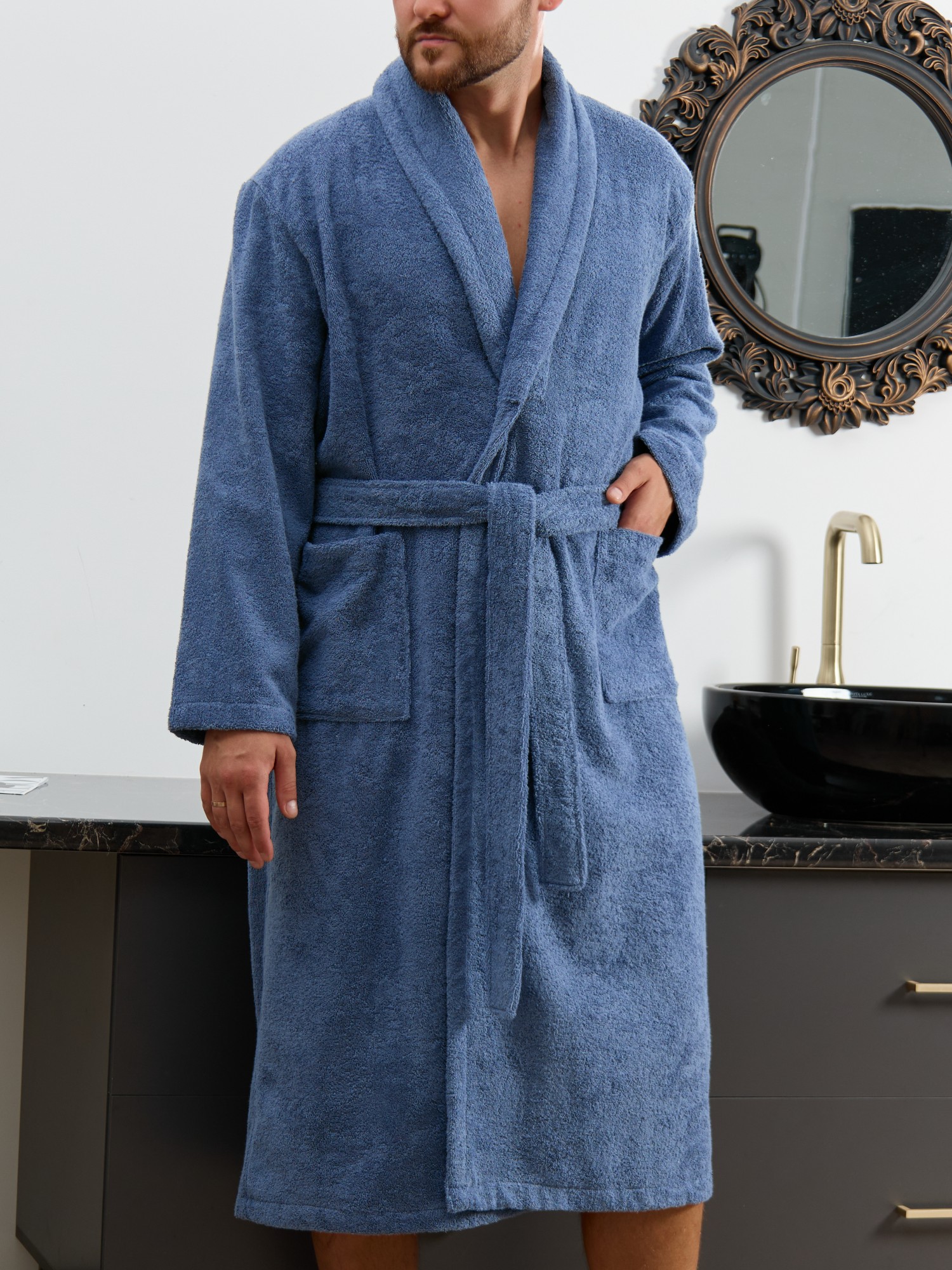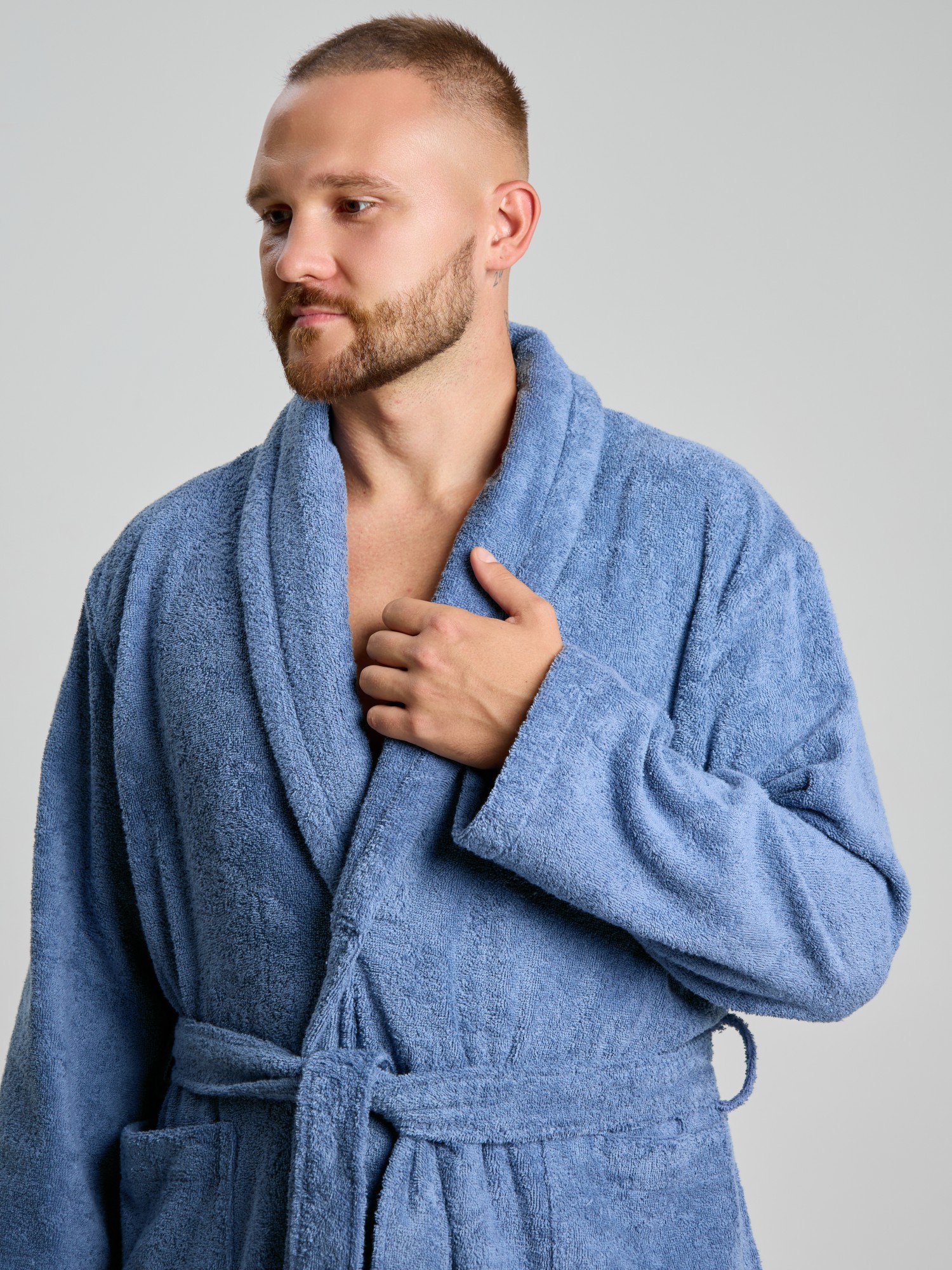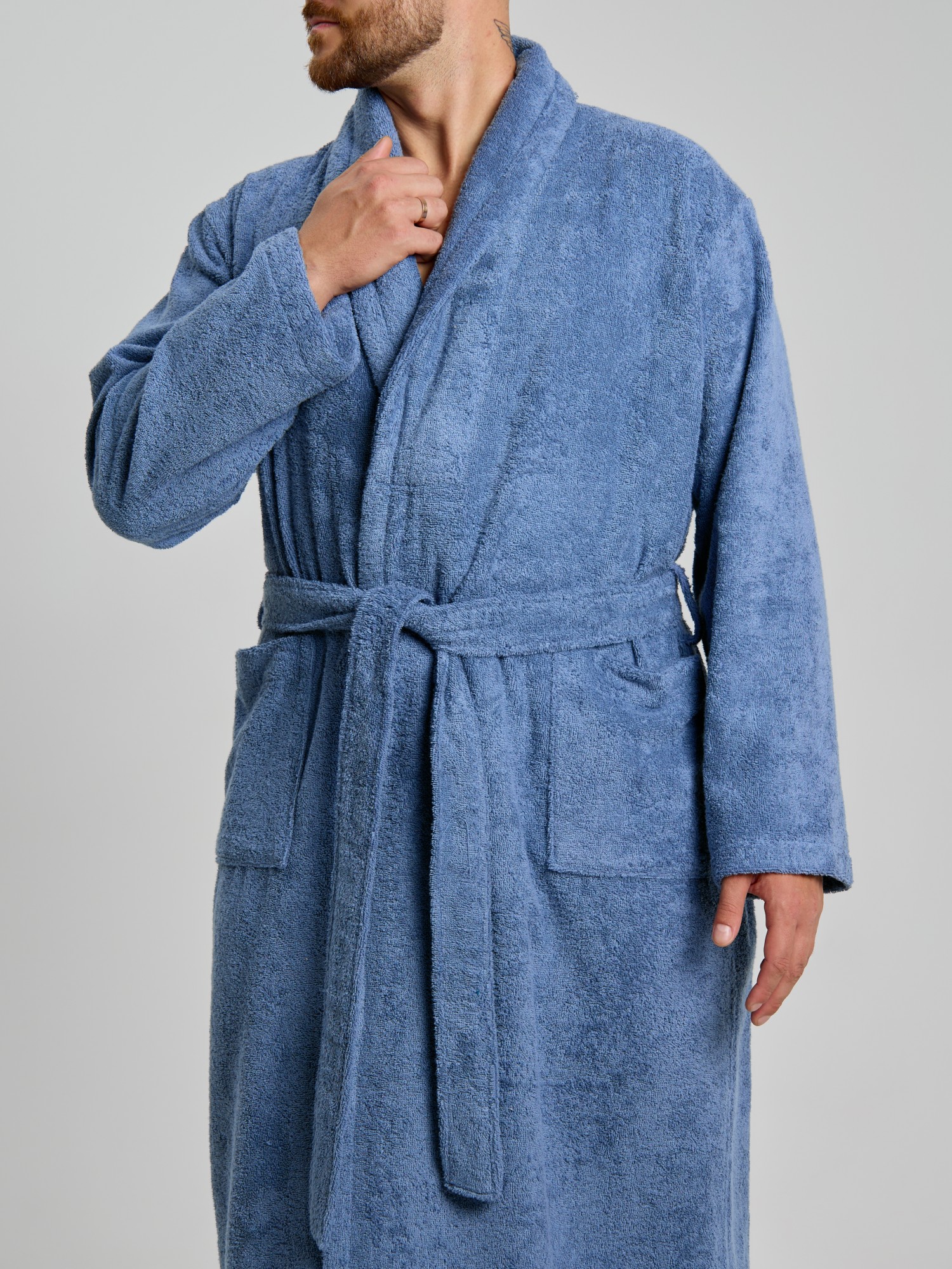 Мужской халат из двустороннего махрового хлопкового полотна. Модель на запах, с поясом в шлёвках, с боковыми карманами, с воротником "шаль", с петлей-вешалкой по горловине спинки.