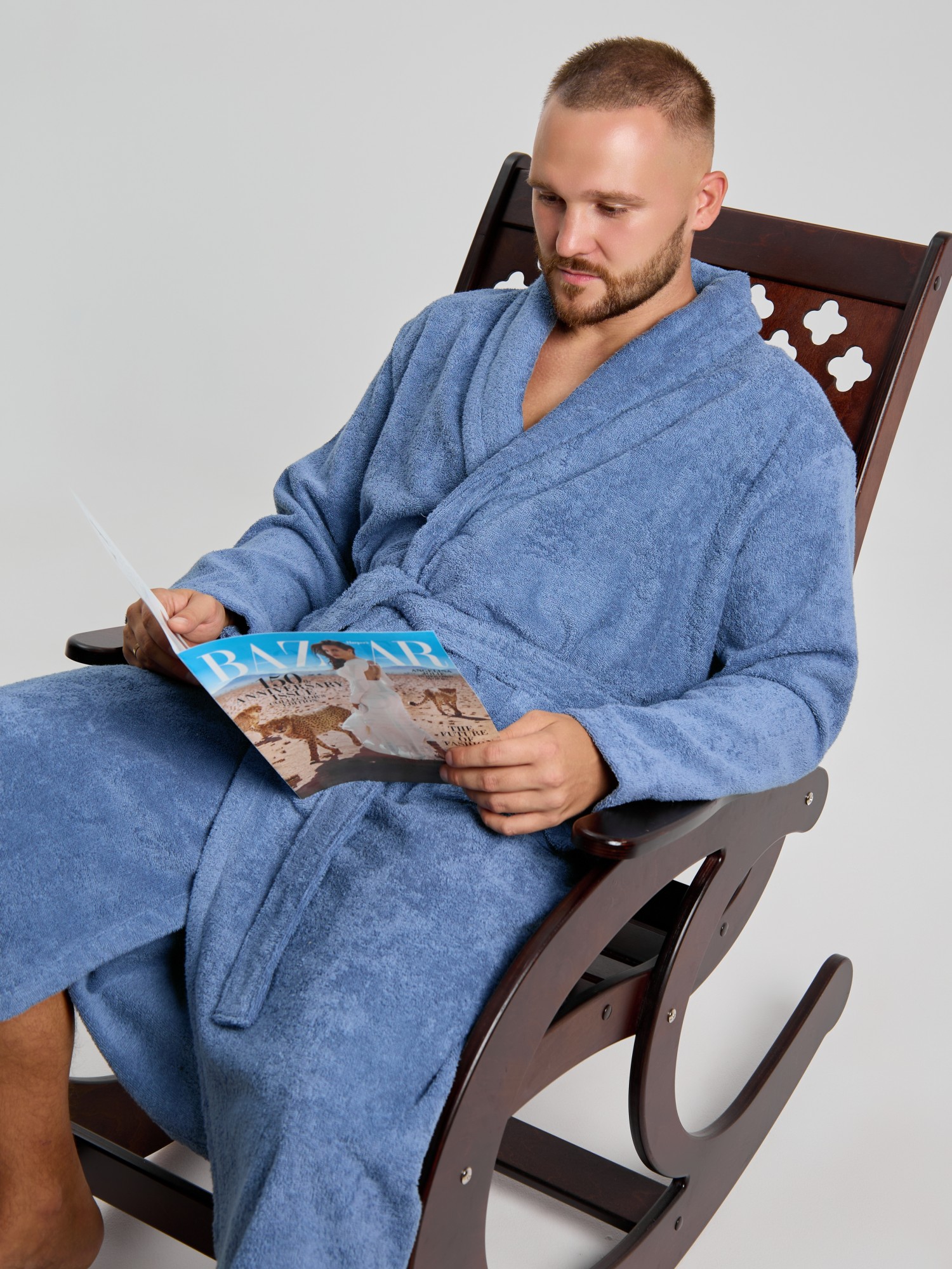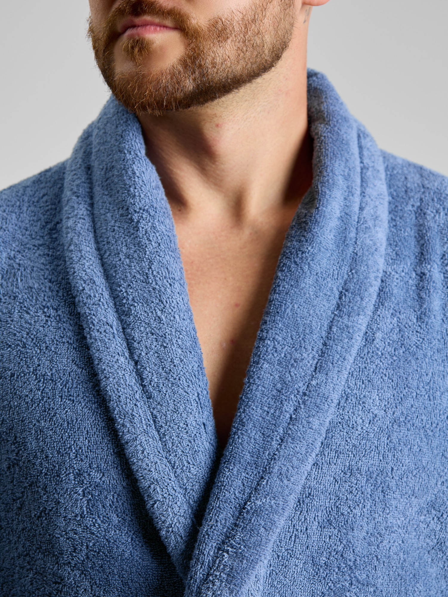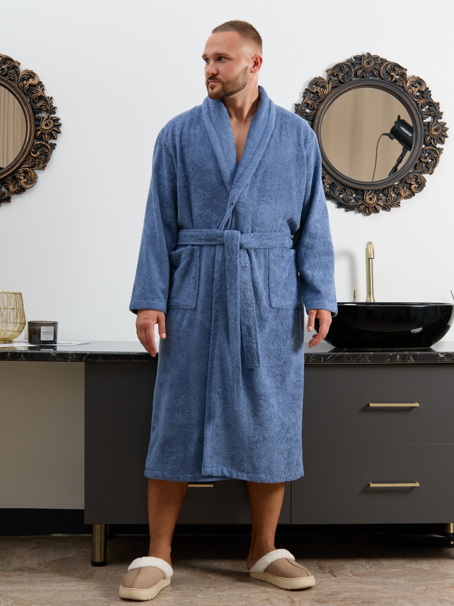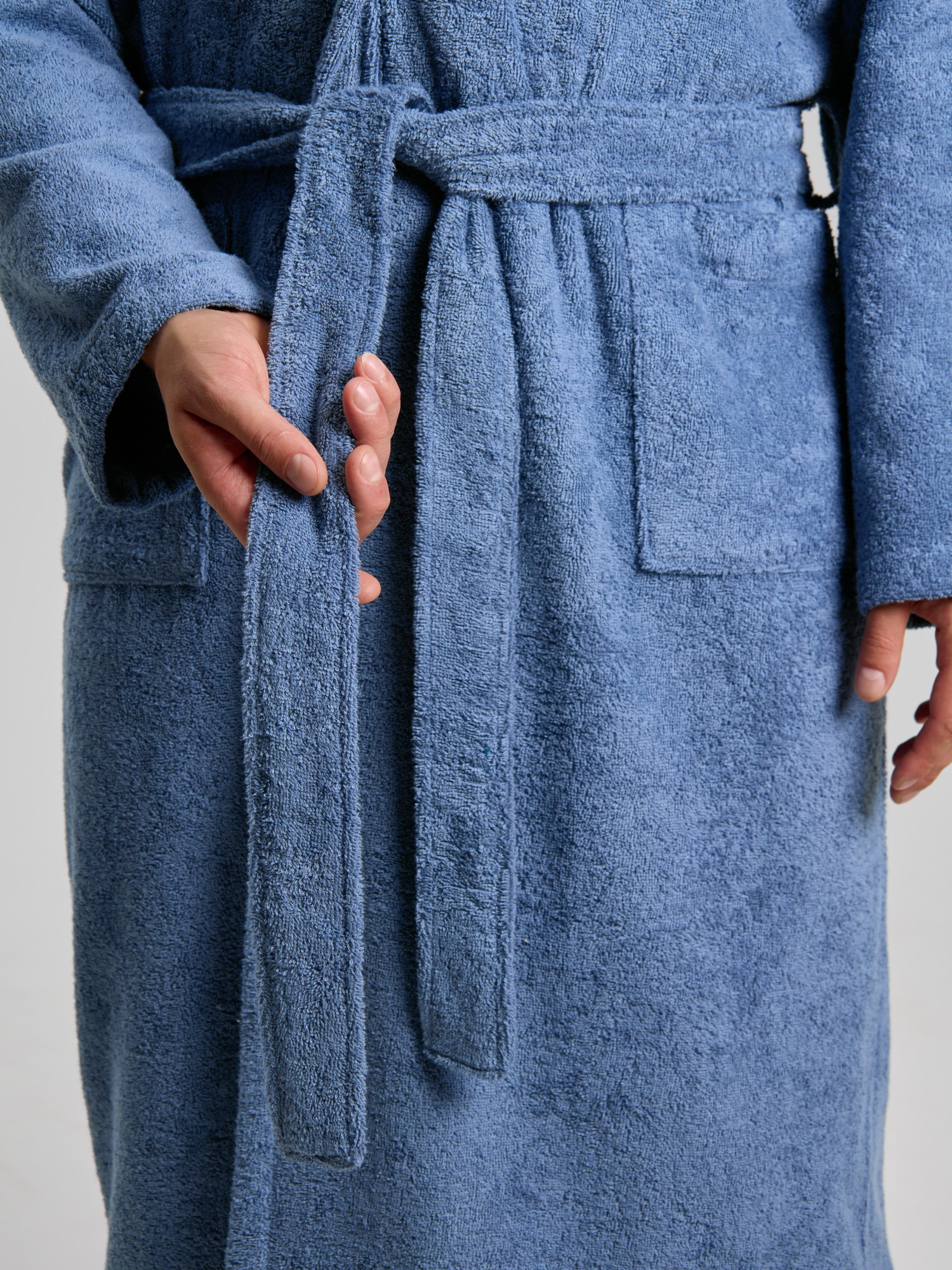 Мужской халат из двустороннего махрового хлопкового полотна. Модель на запах, с поясом в шлёвках, с боковыми карманами, с воротником "шаль", с петлей-вешалкой по горловине спинки.