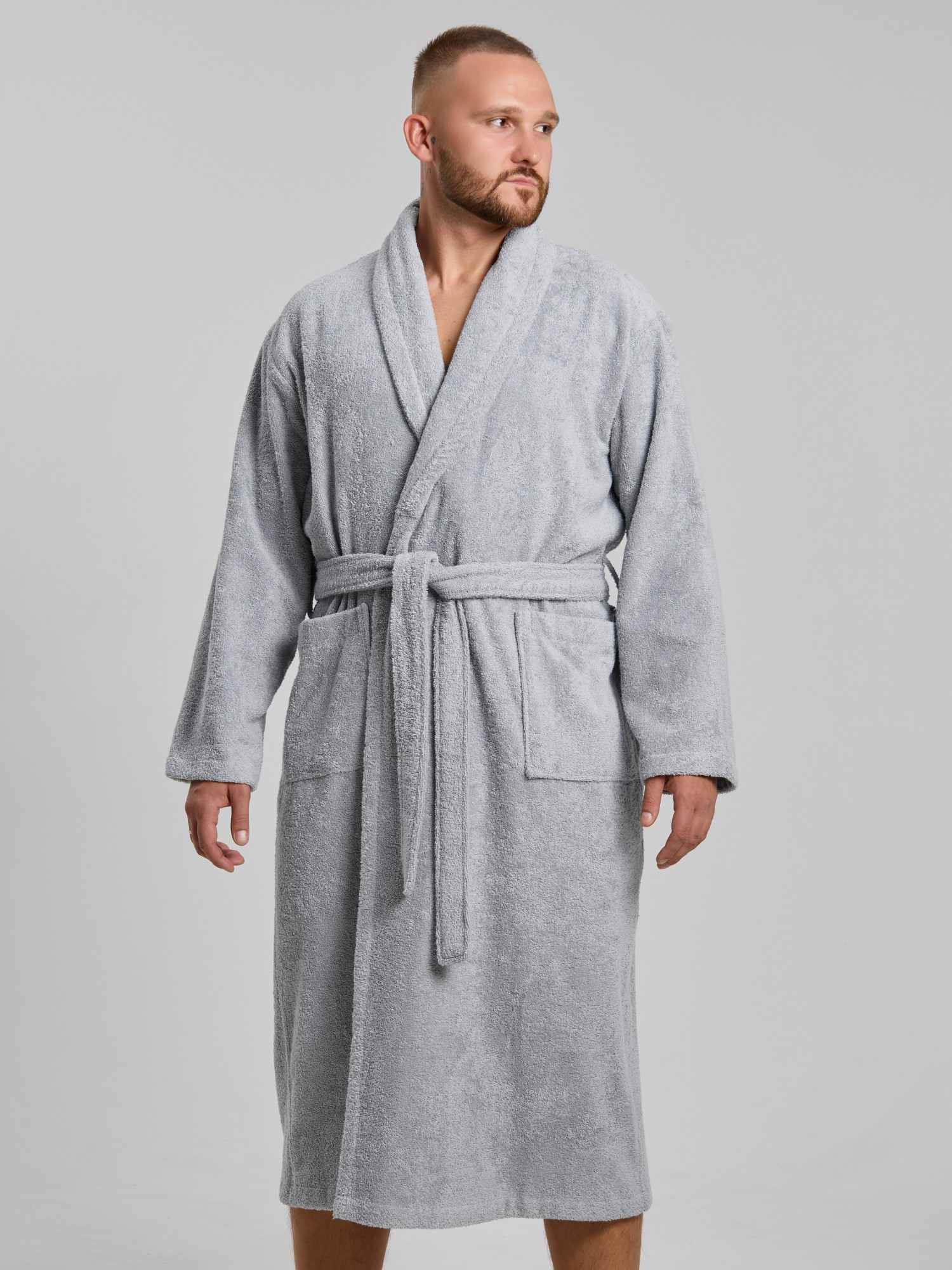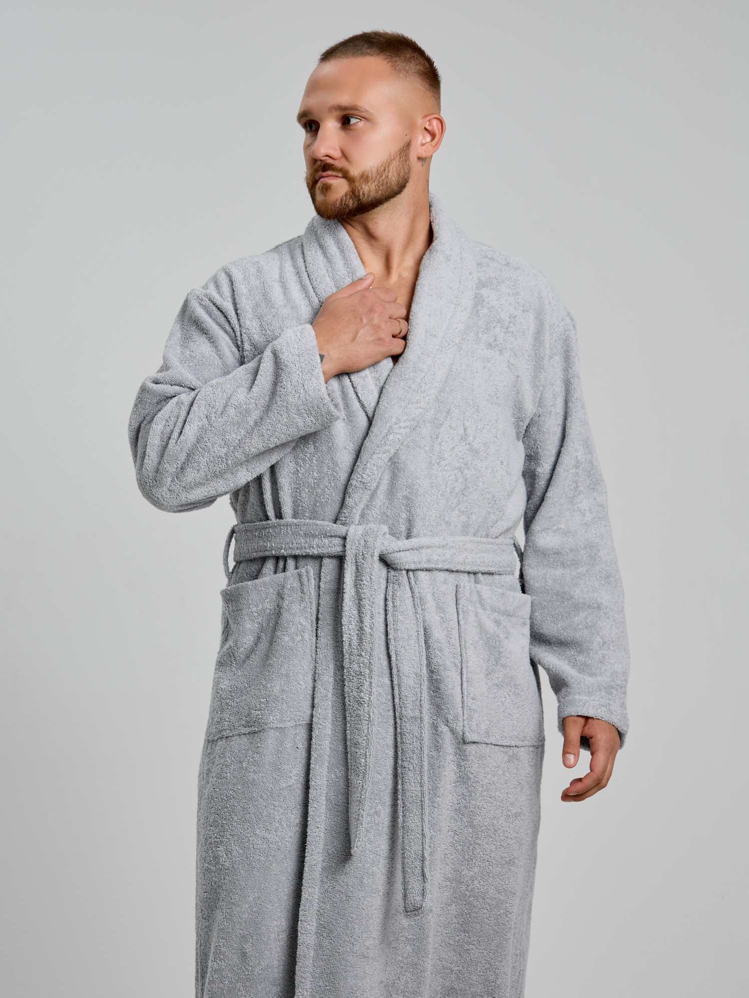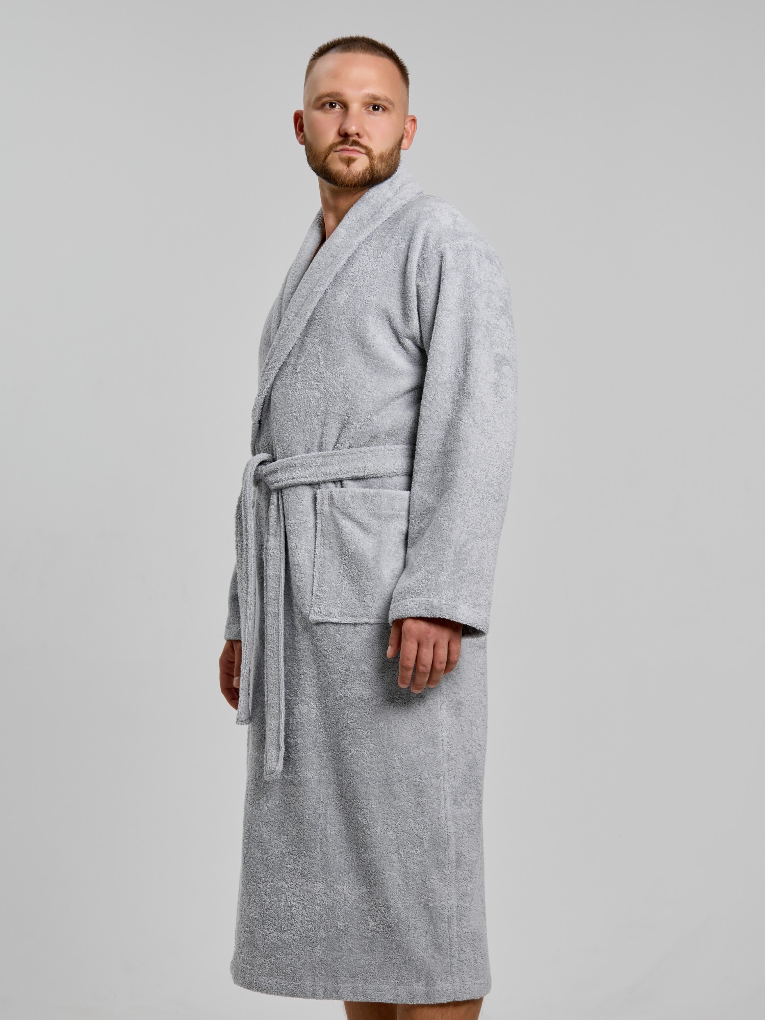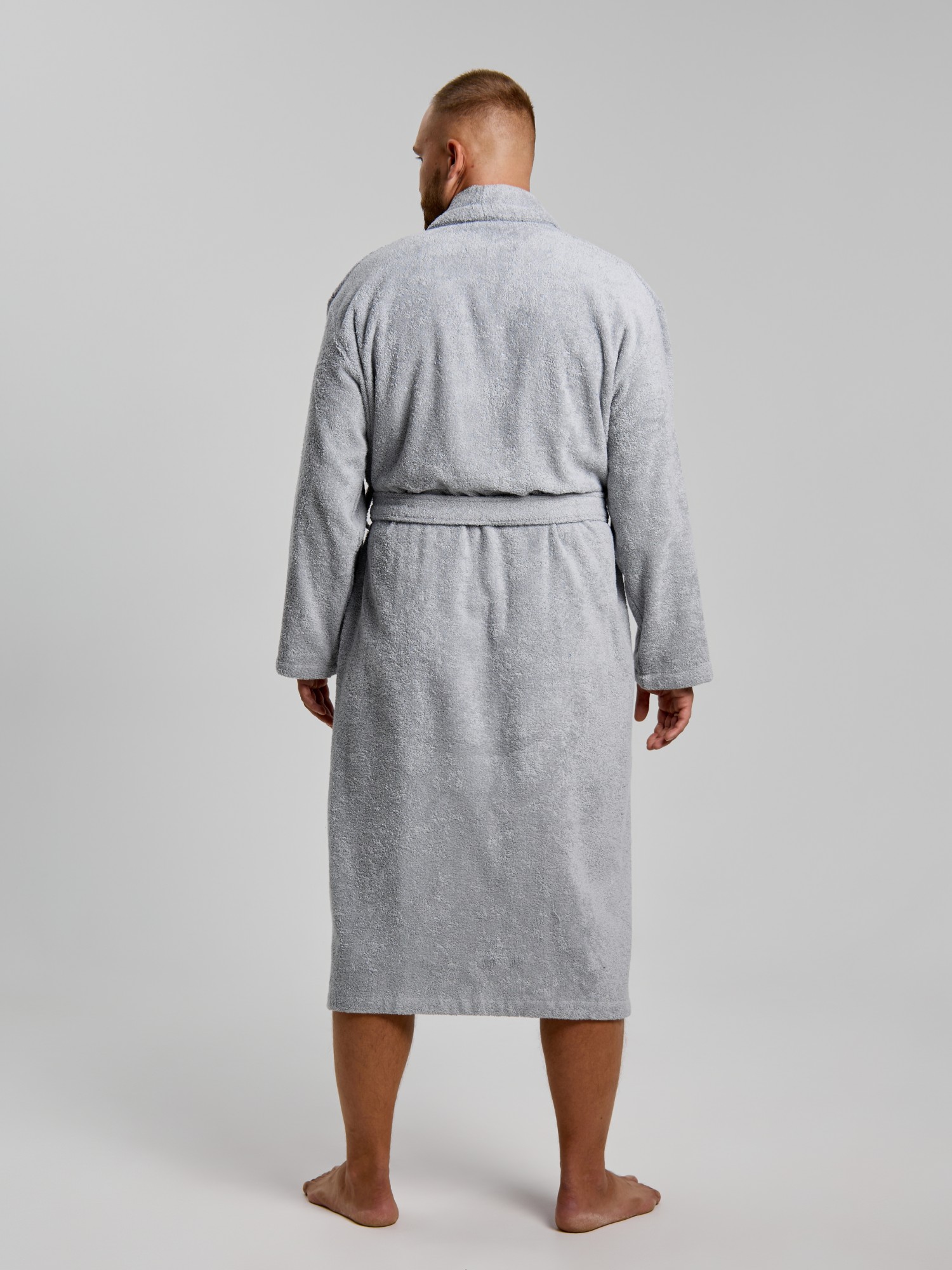 Мужской халат из двустороннего махрового хлопкового полотна. Модель на запах, с поясом в шлёвках, с боковыми карманами, с воротником "шаль", с петлей-вешалкой по горловине спинки.