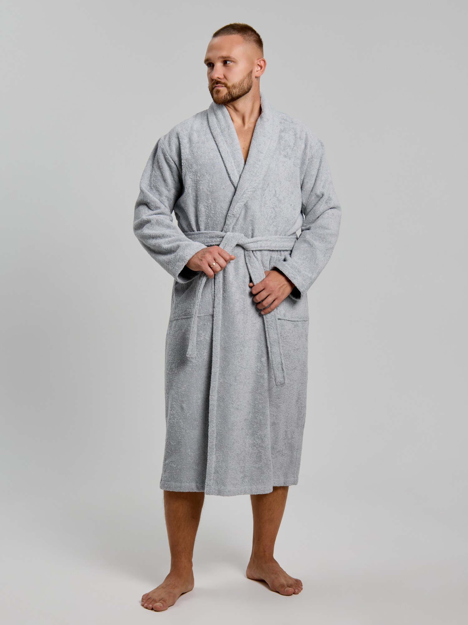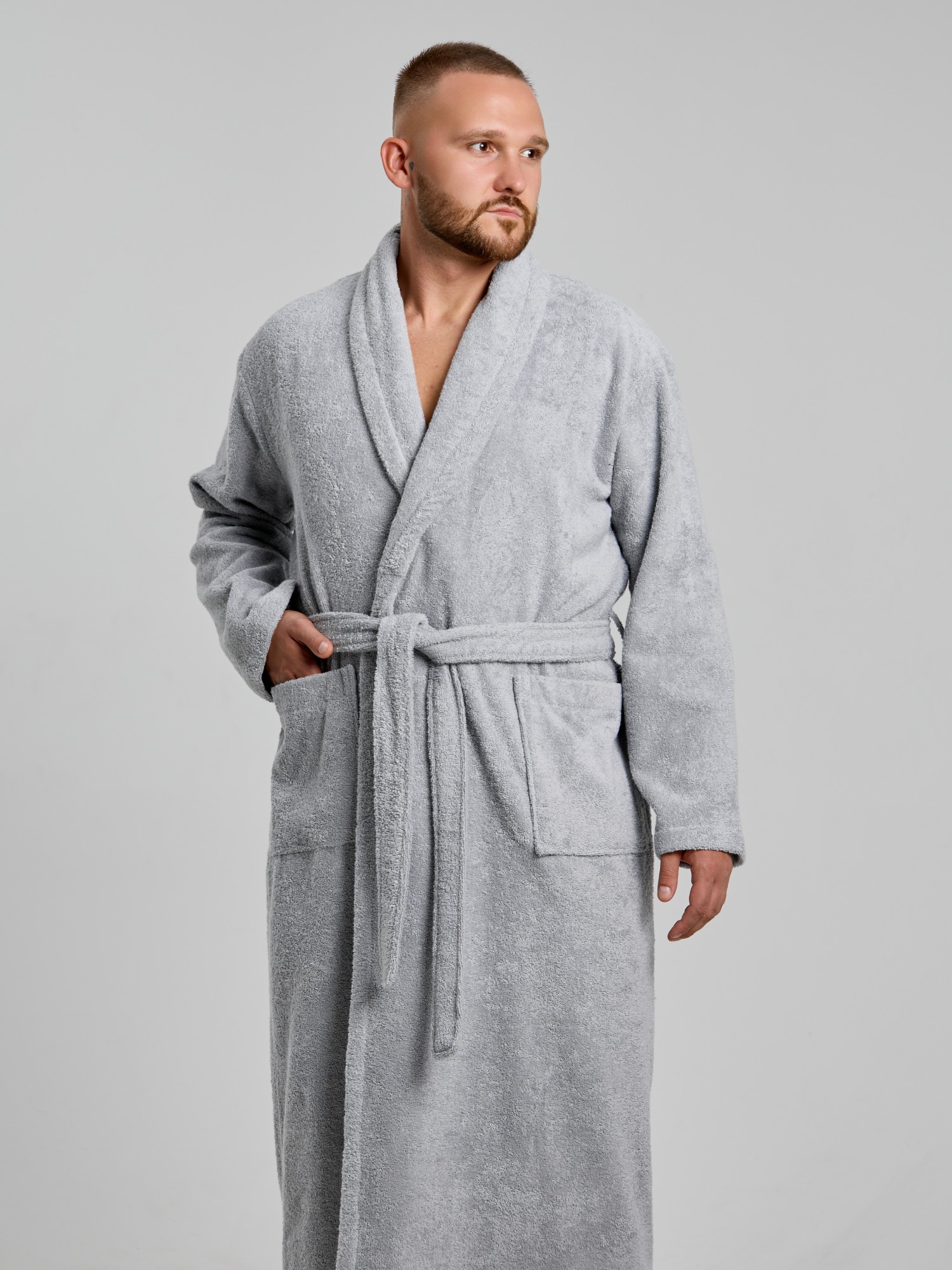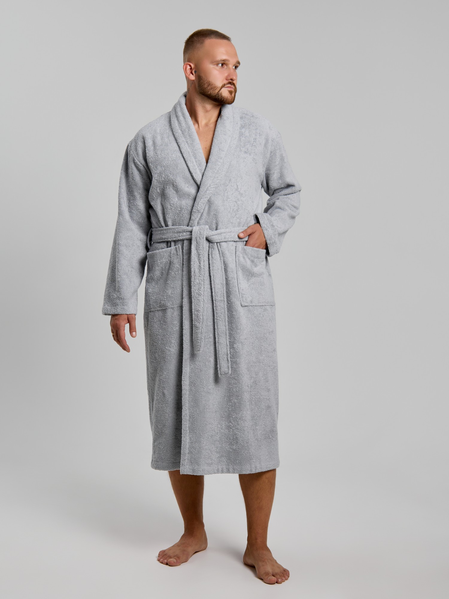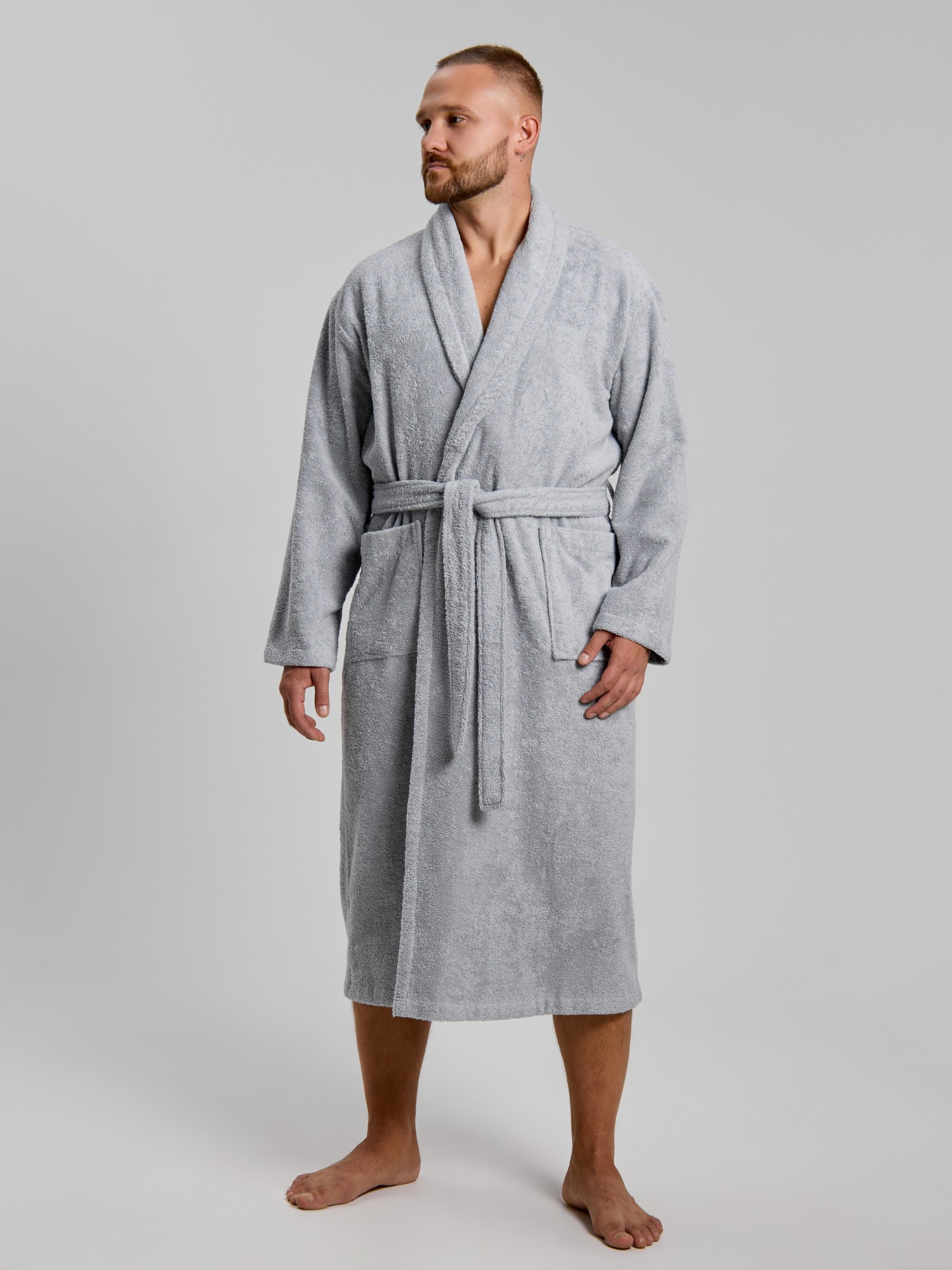 Мужской халат из двустороннего махрового хлопкового полотна. Модель на запах, с поясом в шлёвках, с боковыми карманами, с воротником "шаль", с петлей-вешалкой по горловине спинки.
