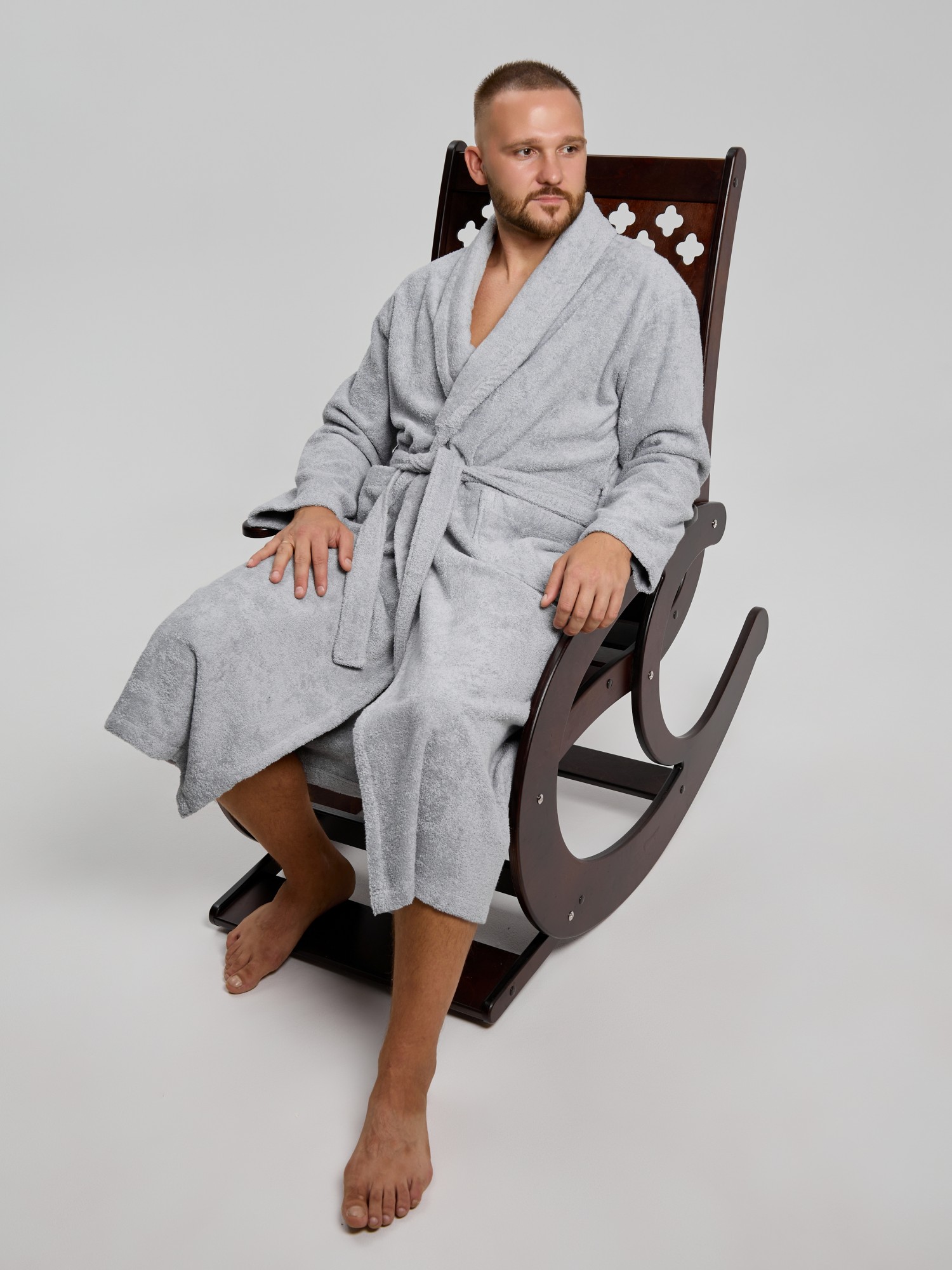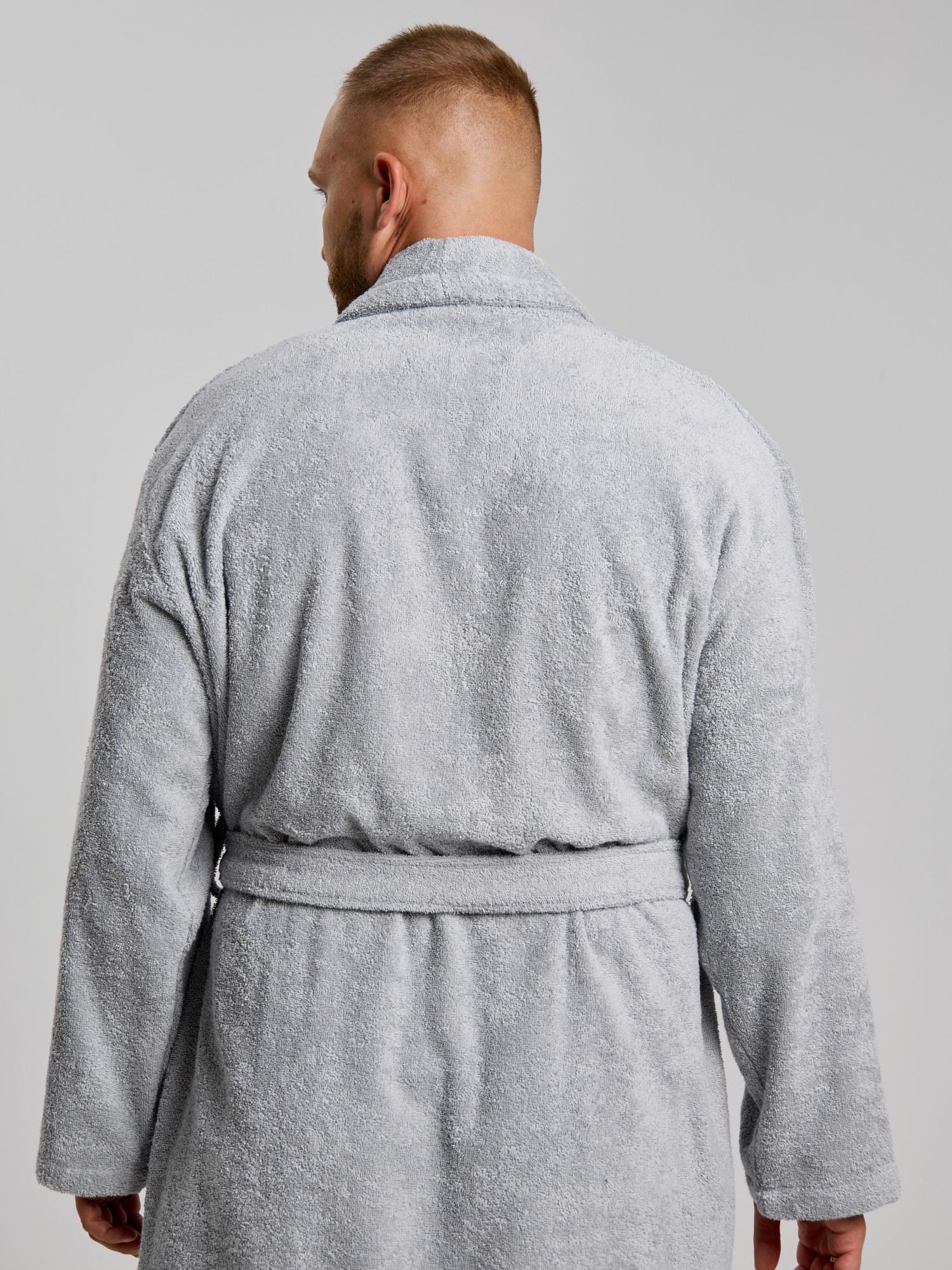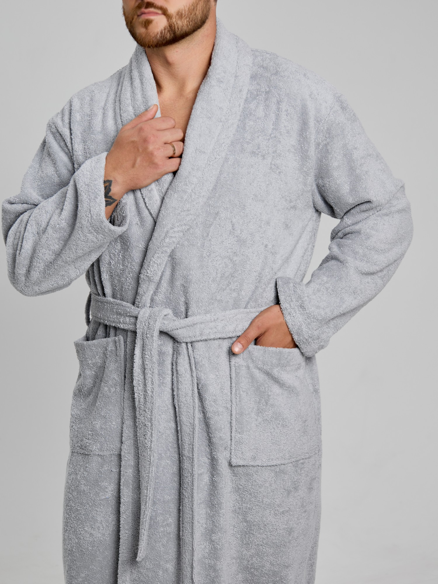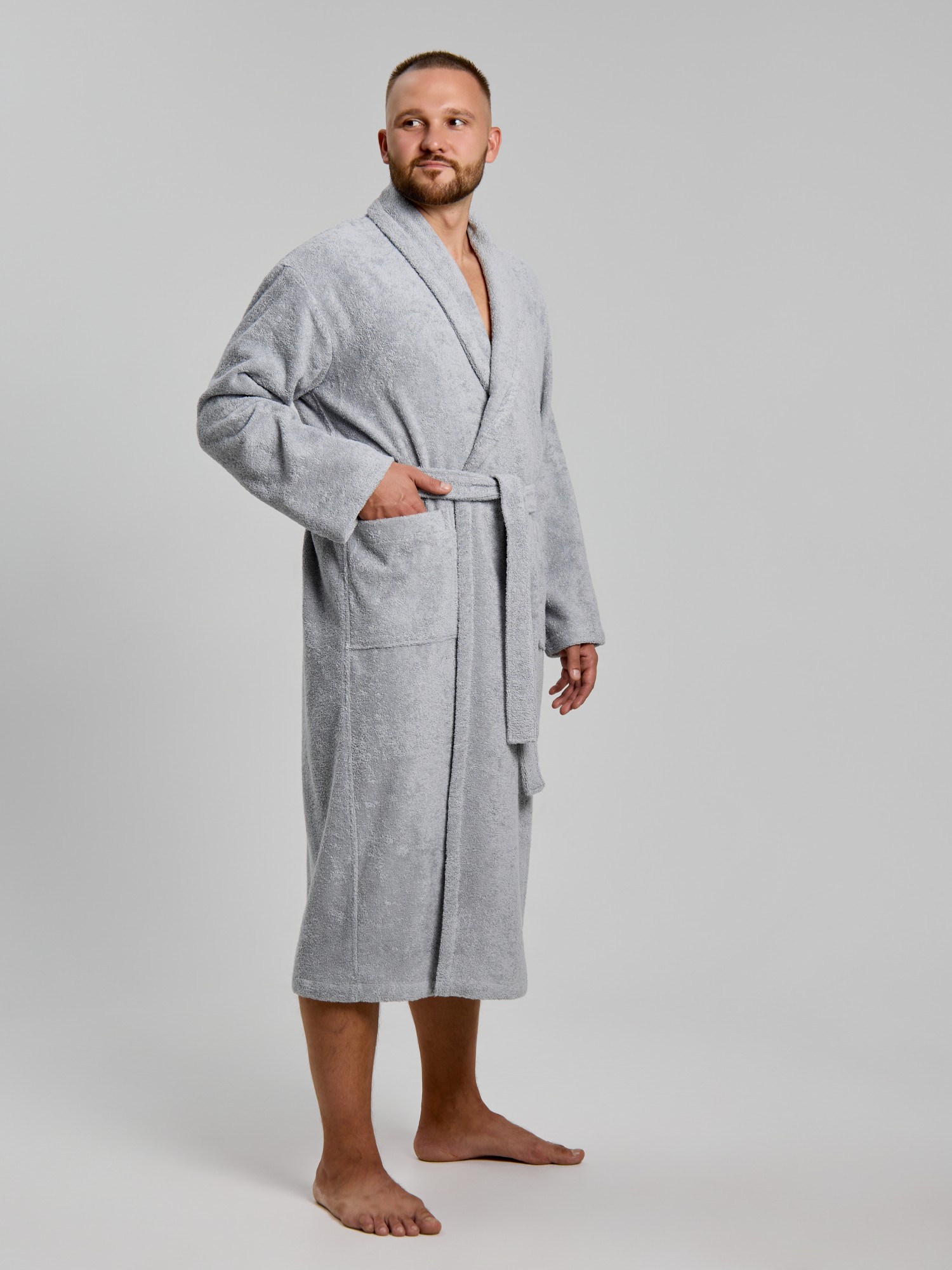 Мужской халат из двустороннего махрового хлопкового полотна. Модель на запах, с поясом в шлёвках, с боковыми карманами, с воротником "шаль", с петлей-вешалкой по горловине спинки.