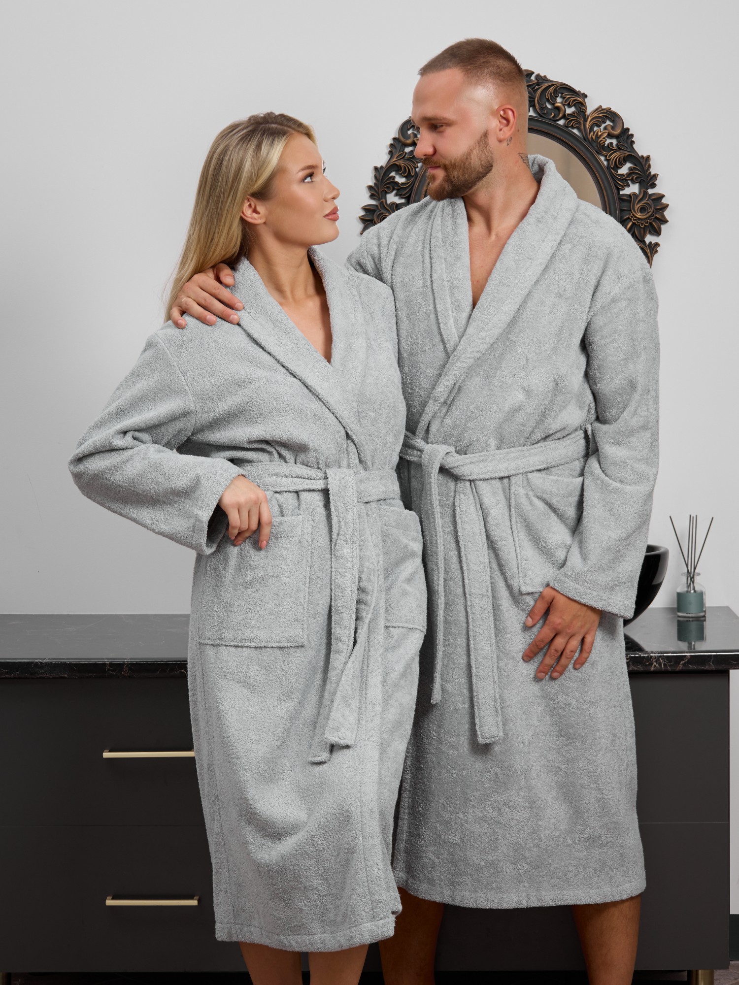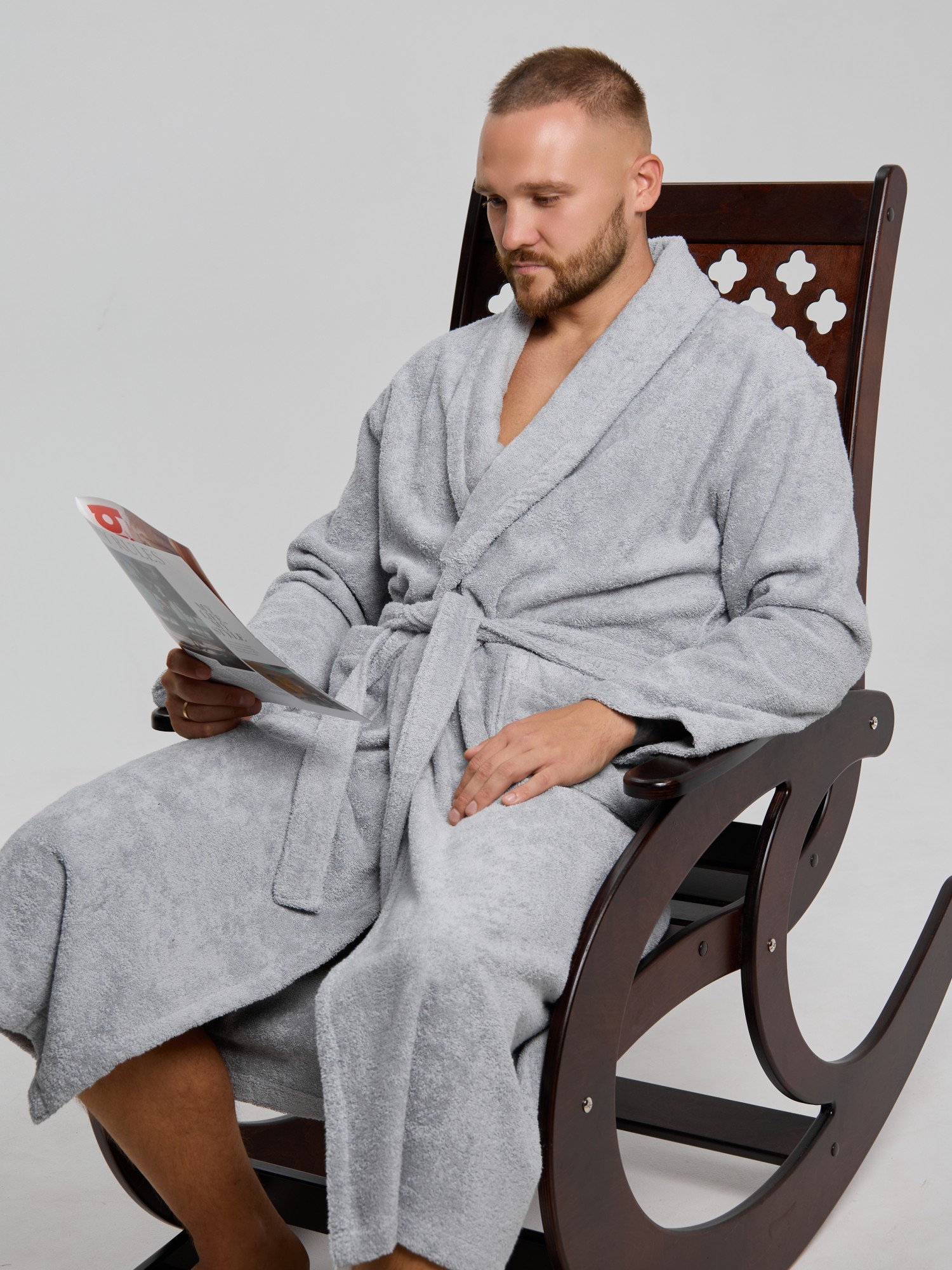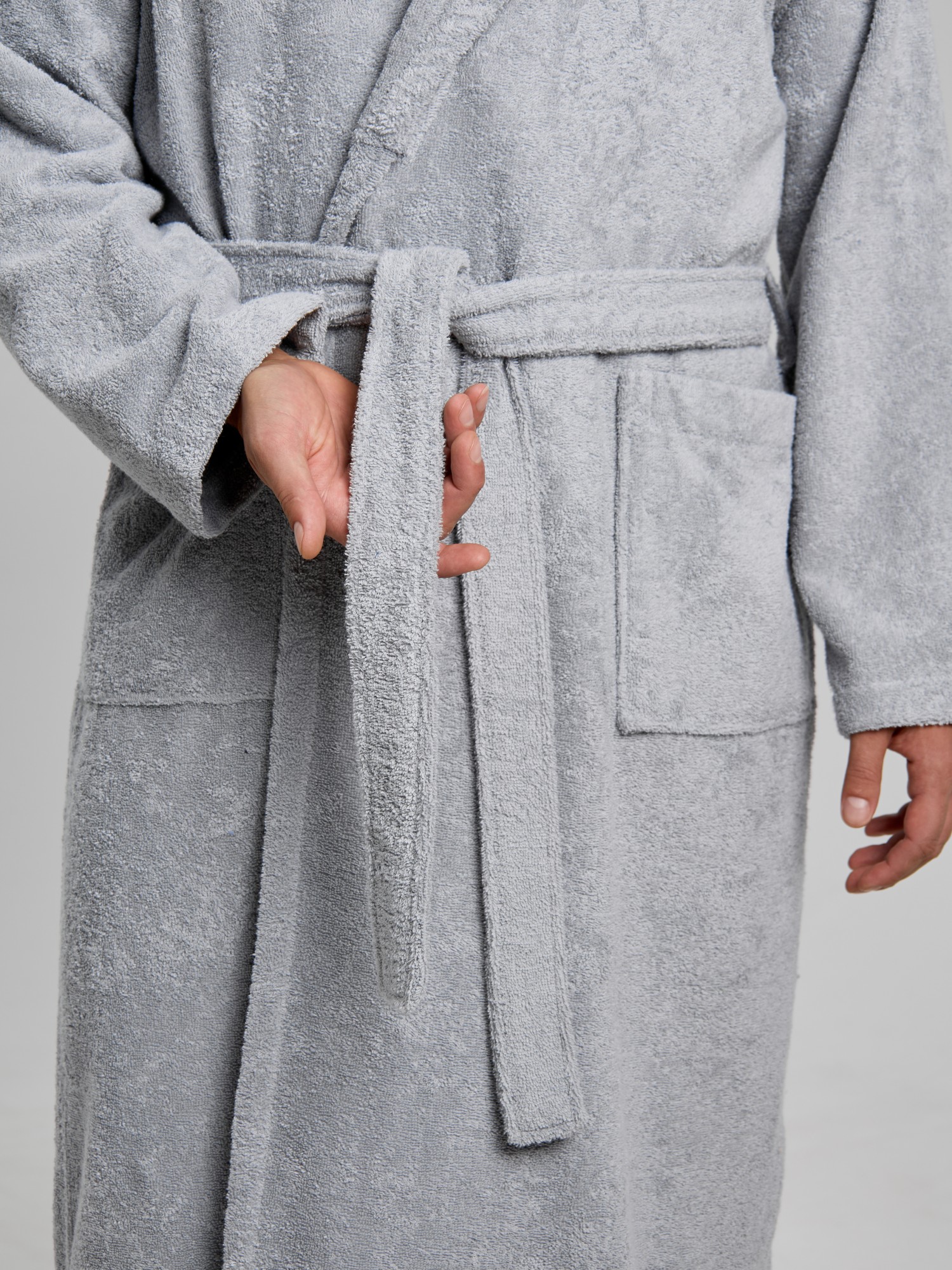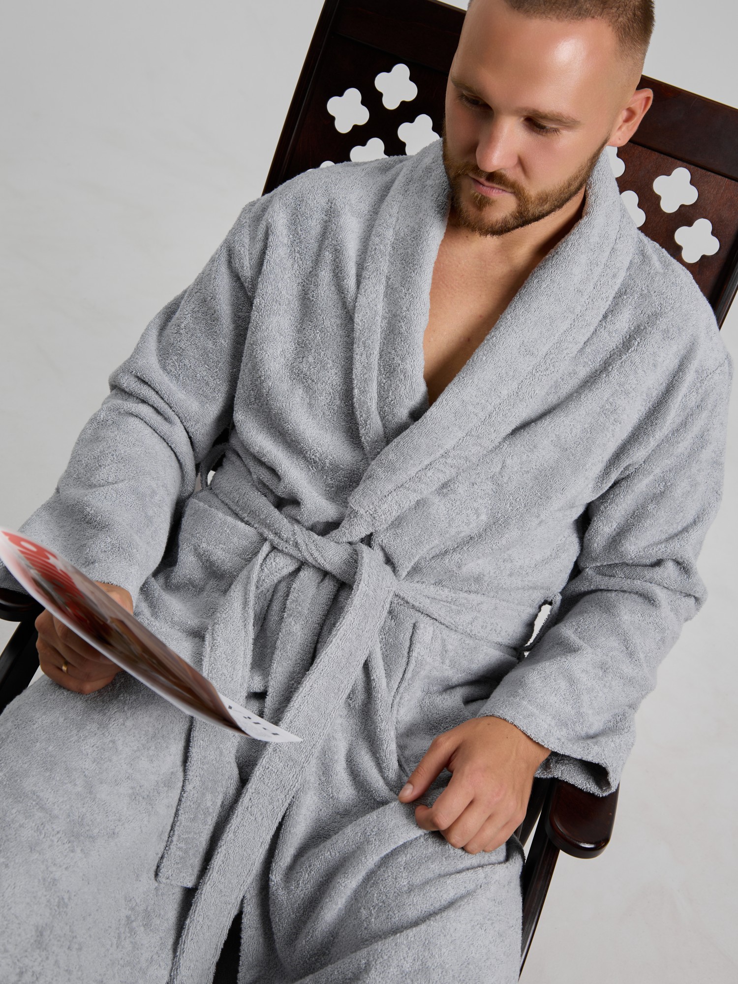 Мужской халат из двустороннего махрового хлопкового полотна. Модель на запах, с поясом в шлёвках, с боковыми карманами, с воротником "шаль", с петлей-вешалкой по горловине спинки.