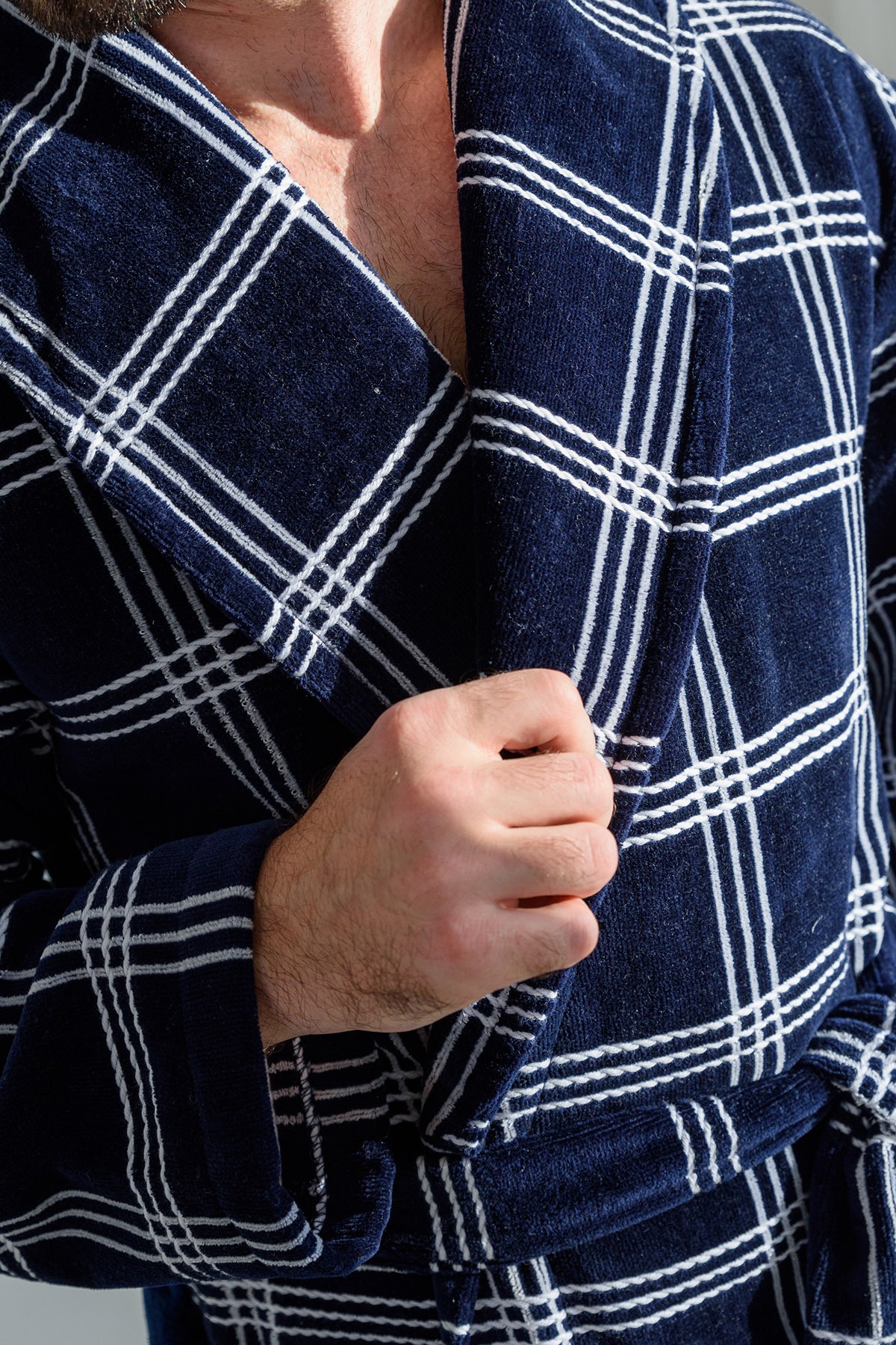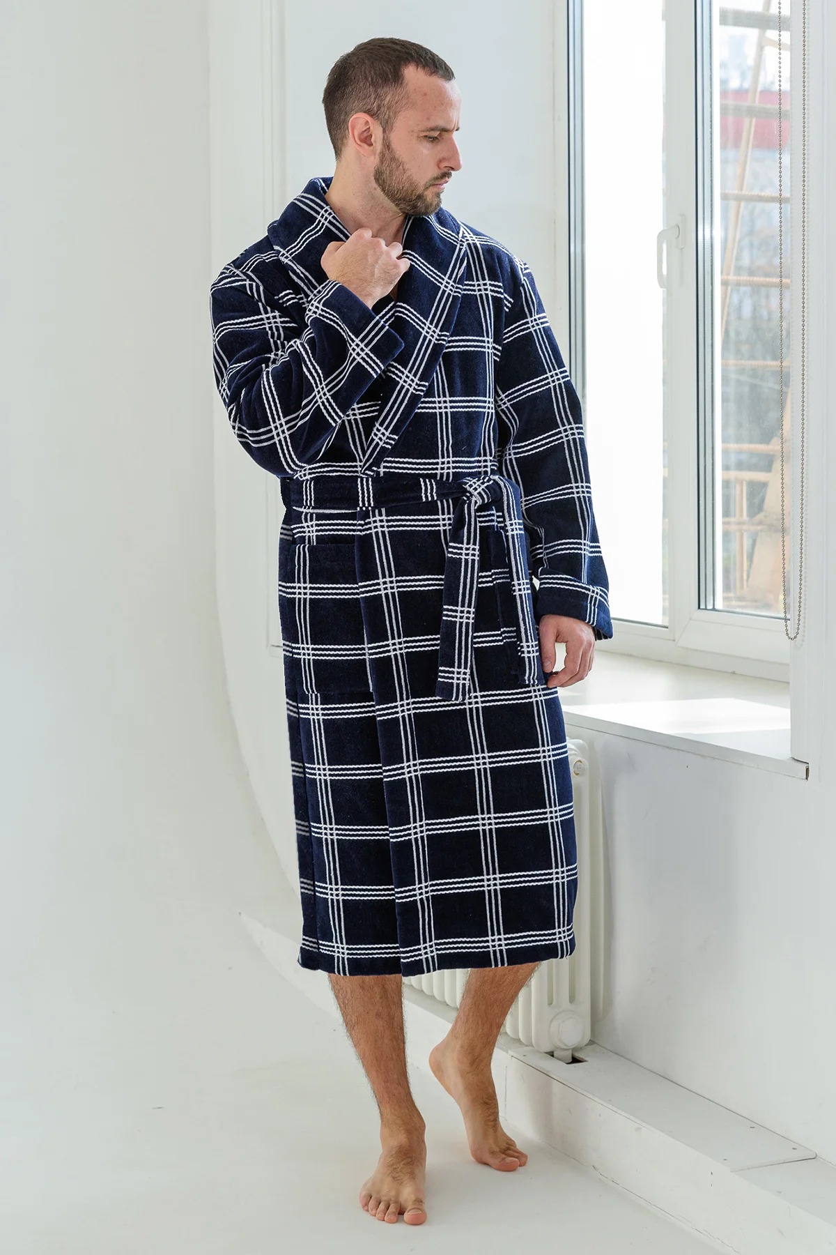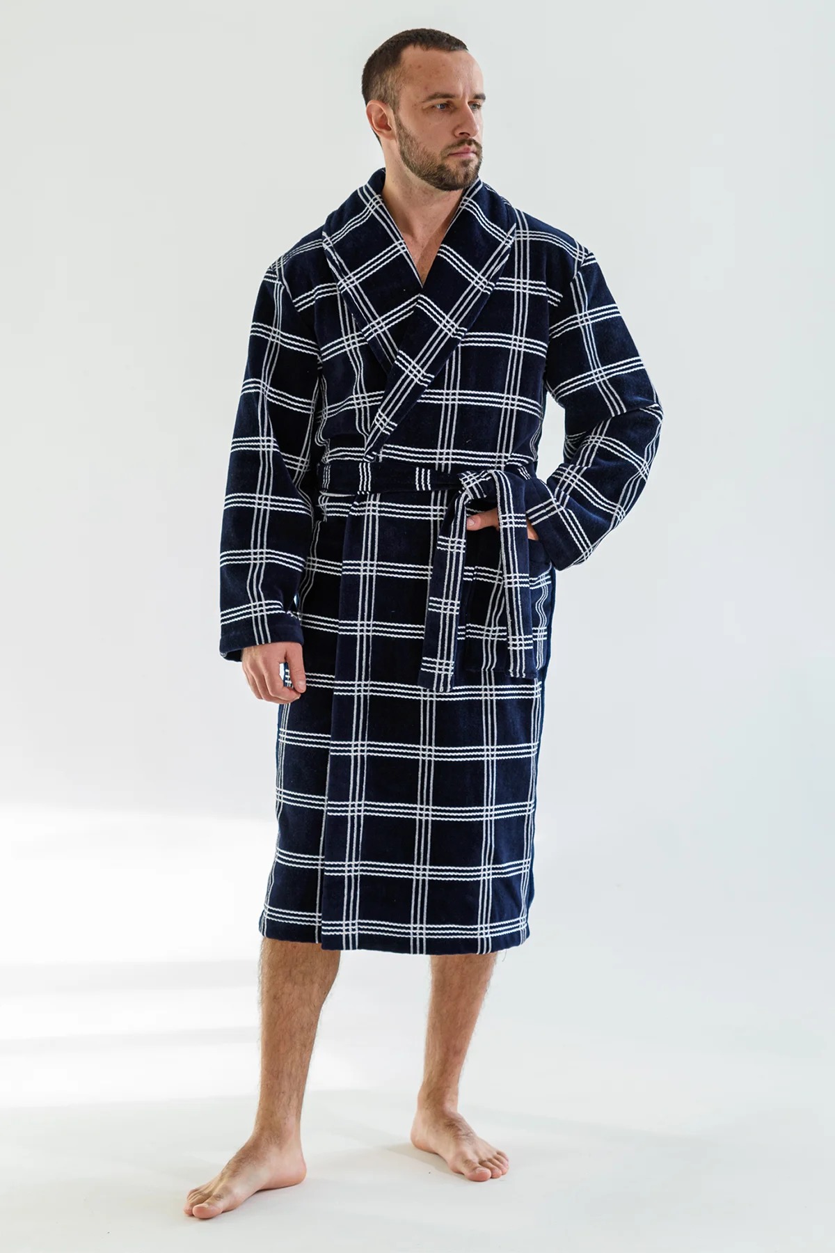 Классический домашний мужской халат "Спенсер-2" 2200-М изготовлен из плотной х/б двухсторонней махровой ткани, с рисунком «клетка». Запашной халат прямого силуэта, базового покроя с втачными руками, воротником – «Шаль», накладными карманами и навесным поясом, длиной ниже колена.