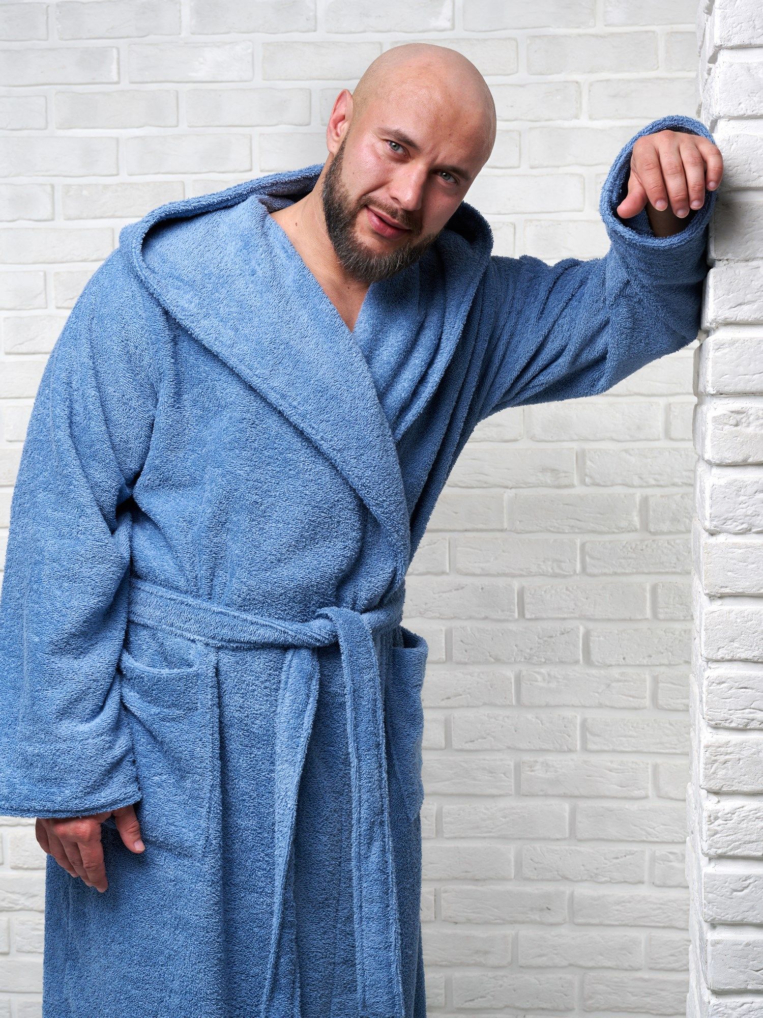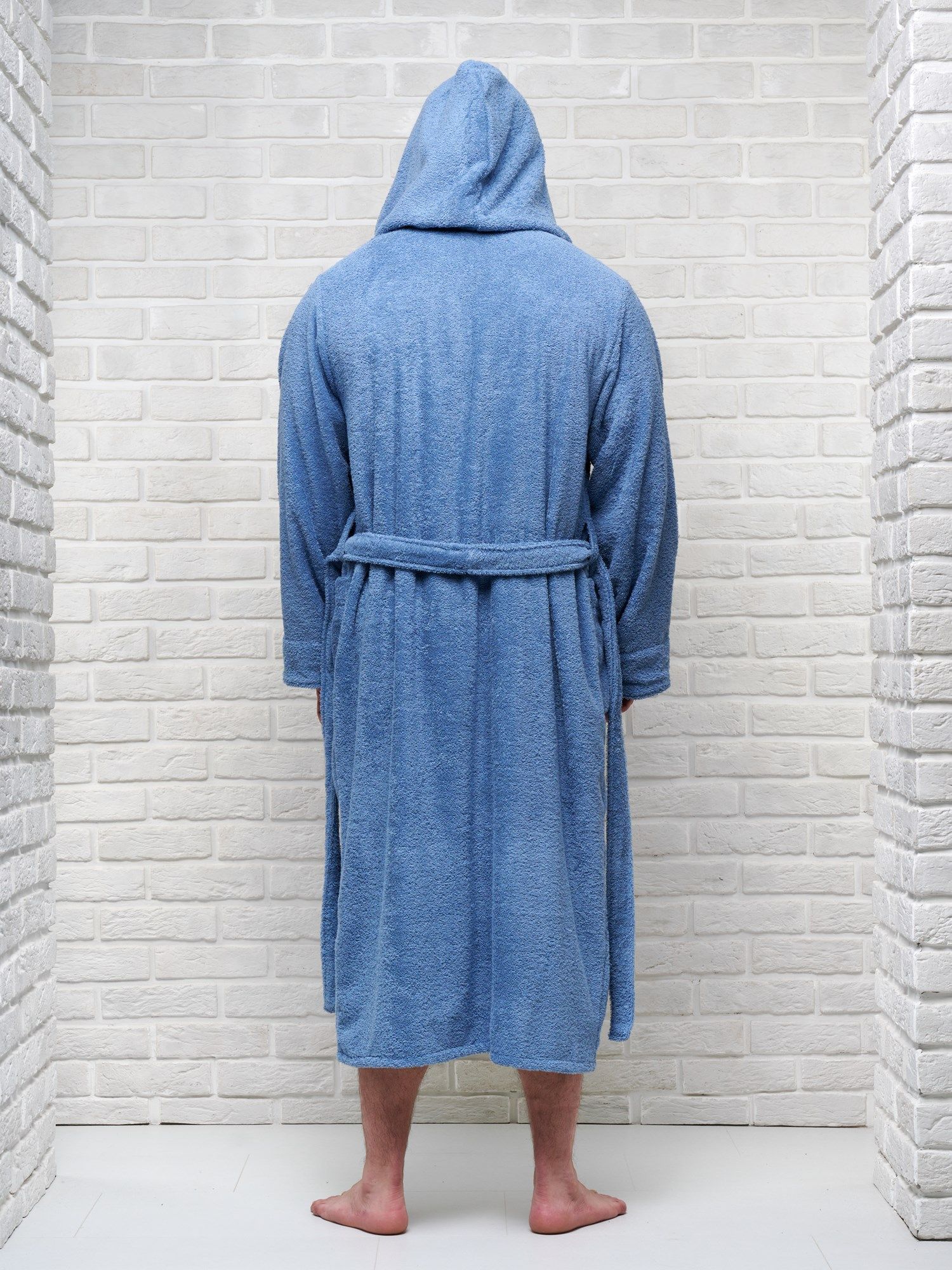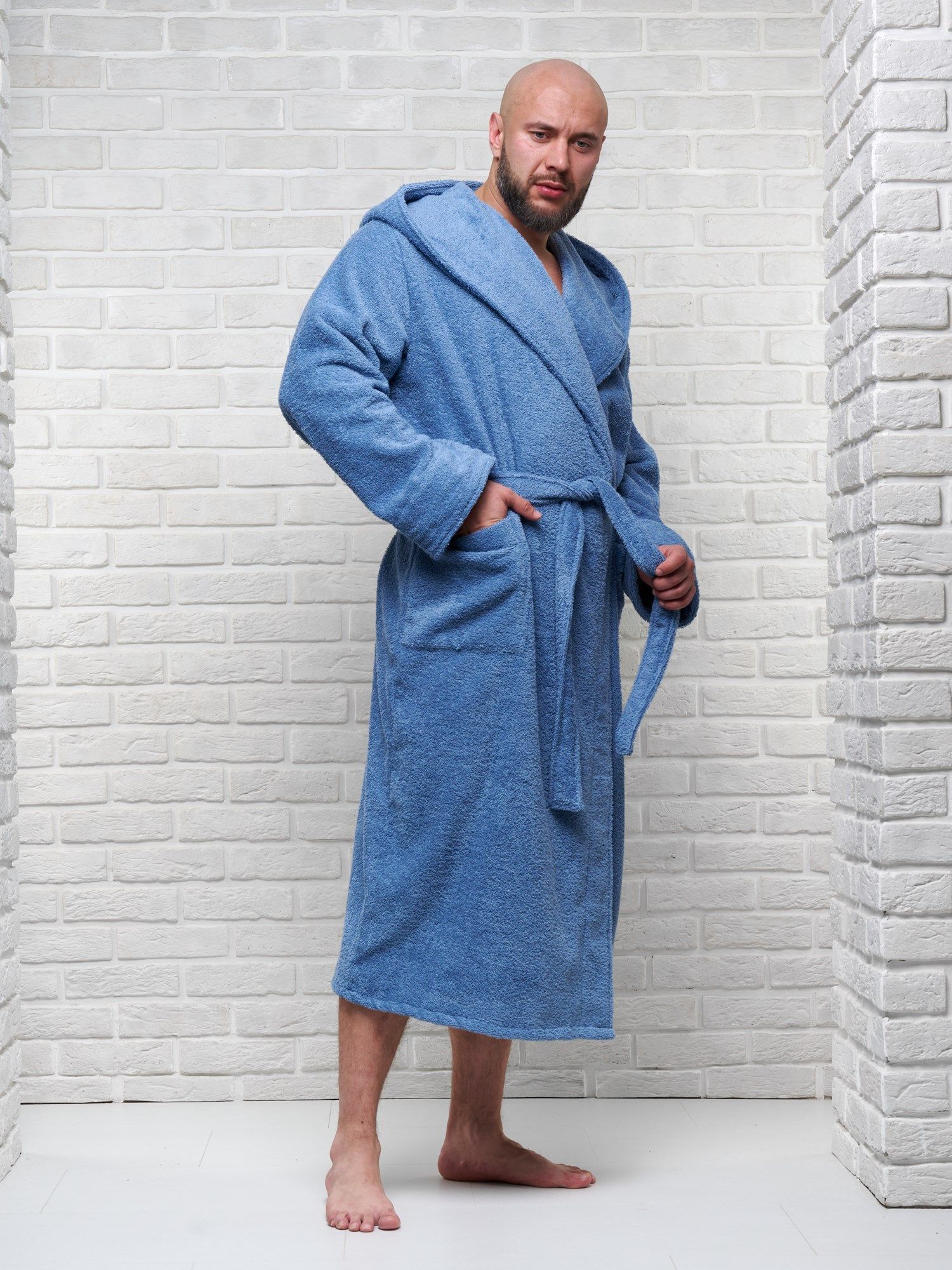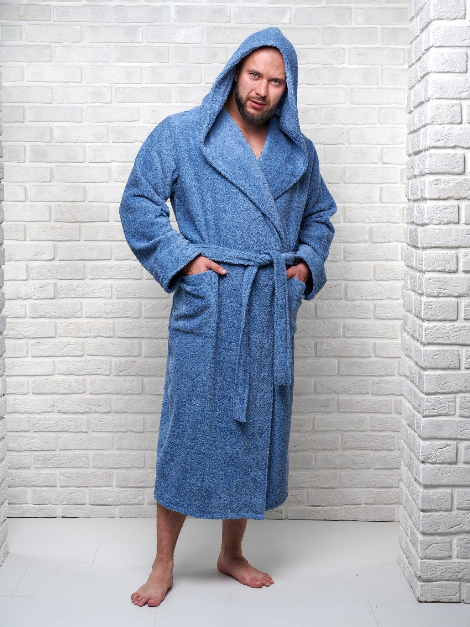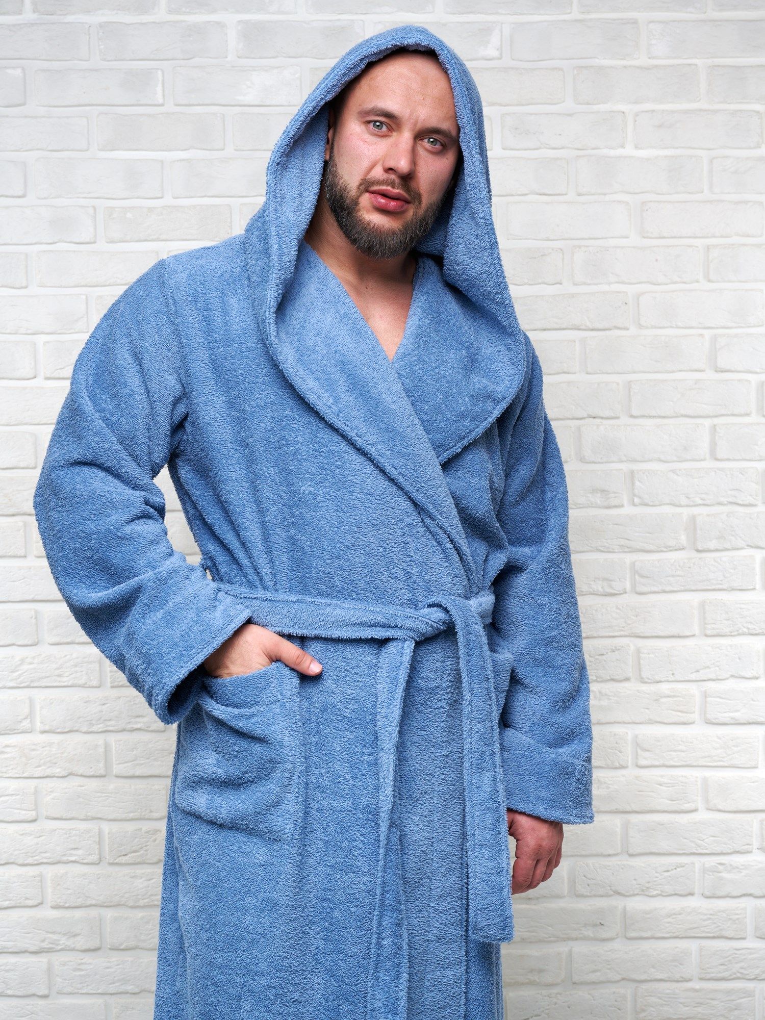 Модель халата с поясом позволяет ему быть универсальным и подходит к любому типу телосложения, скрывая недостатки и подчеркивая достоинства фигуры. Наличие карманов делает его практичным для ношения дома, в бане или сауне, а также на отдыхе.