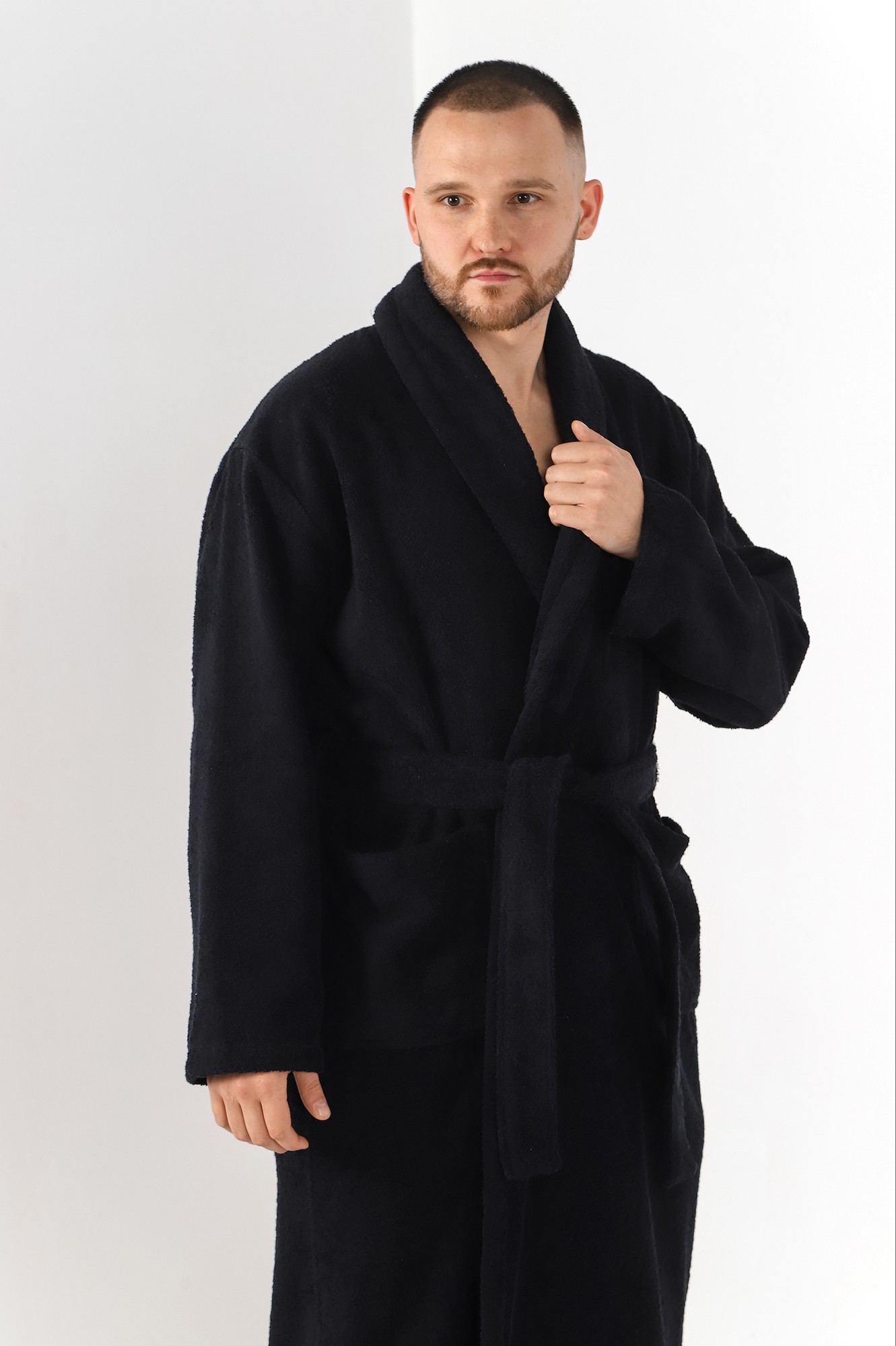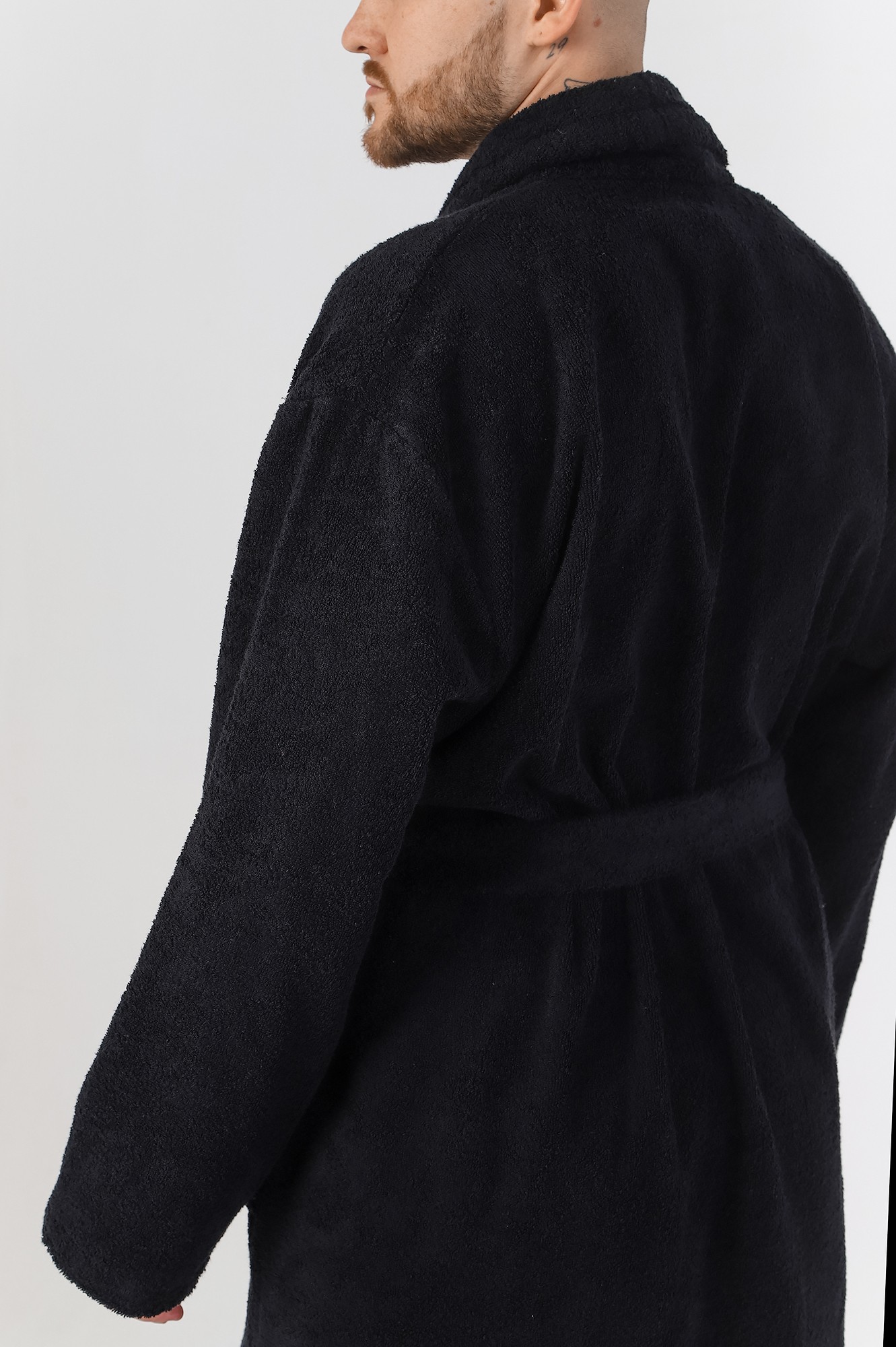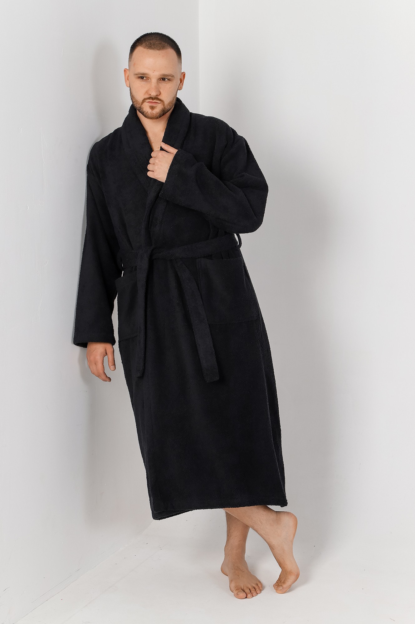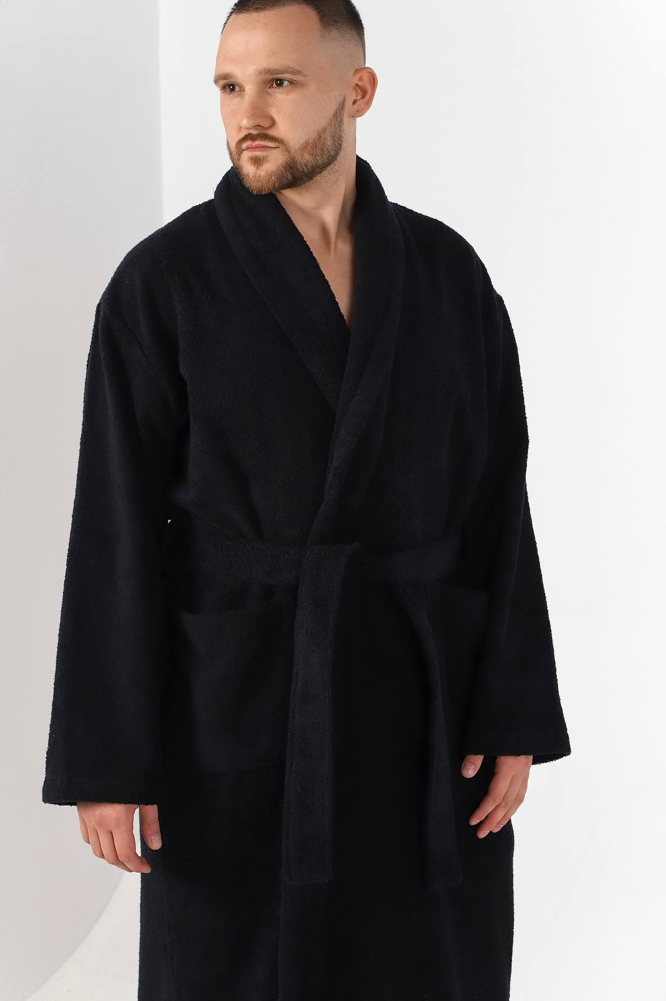 Мужской халат из двустороннего махрового хлопкового полотна. Модель на запах, с поясом в шлёвках, с боковыми карманами, с воротником "шаль", с петлей-вешалкой по горловине спинки.