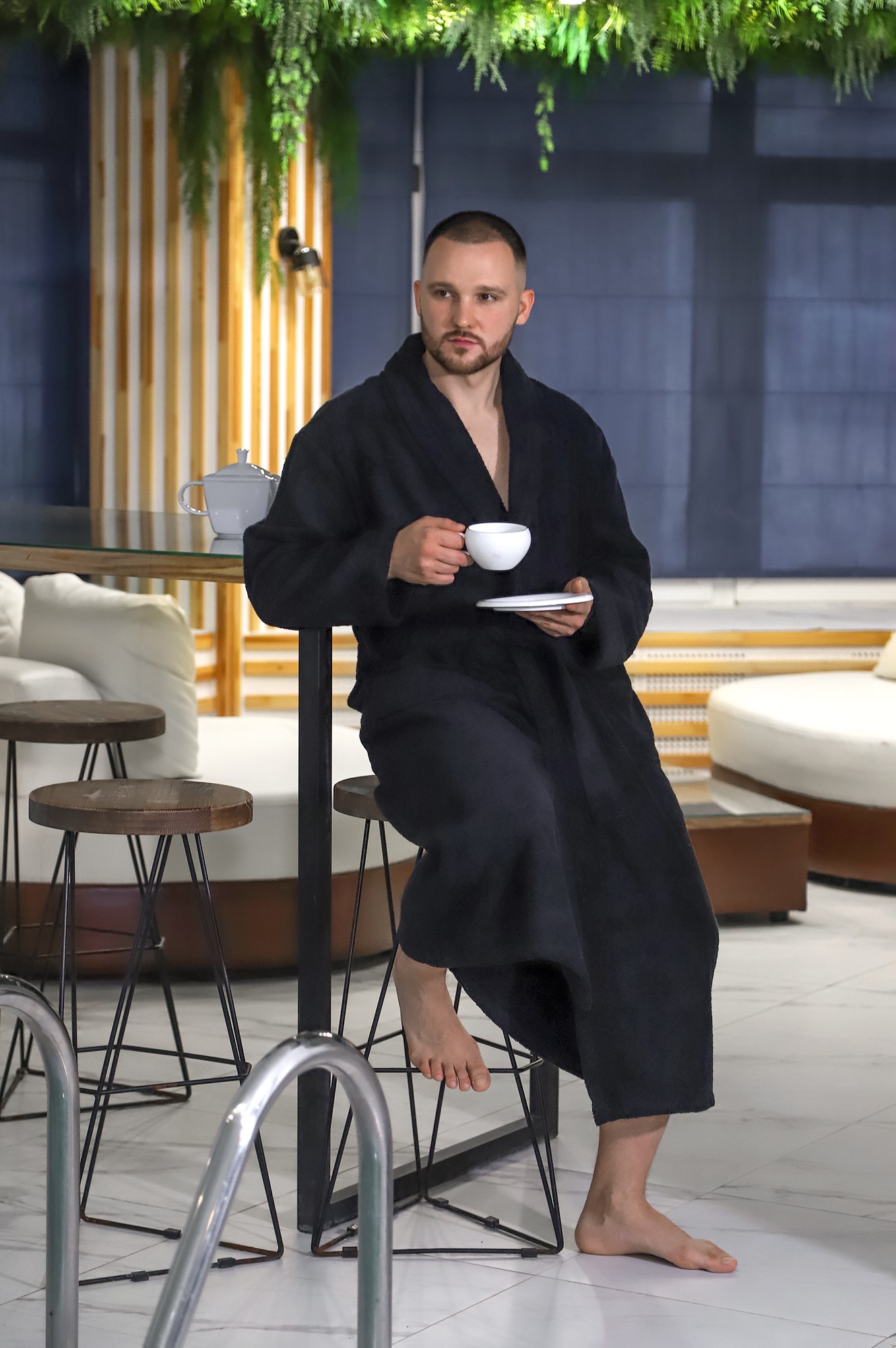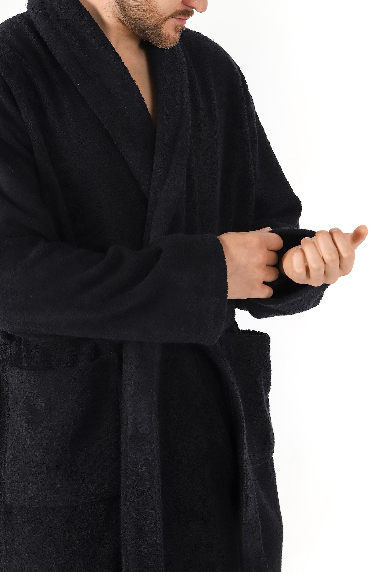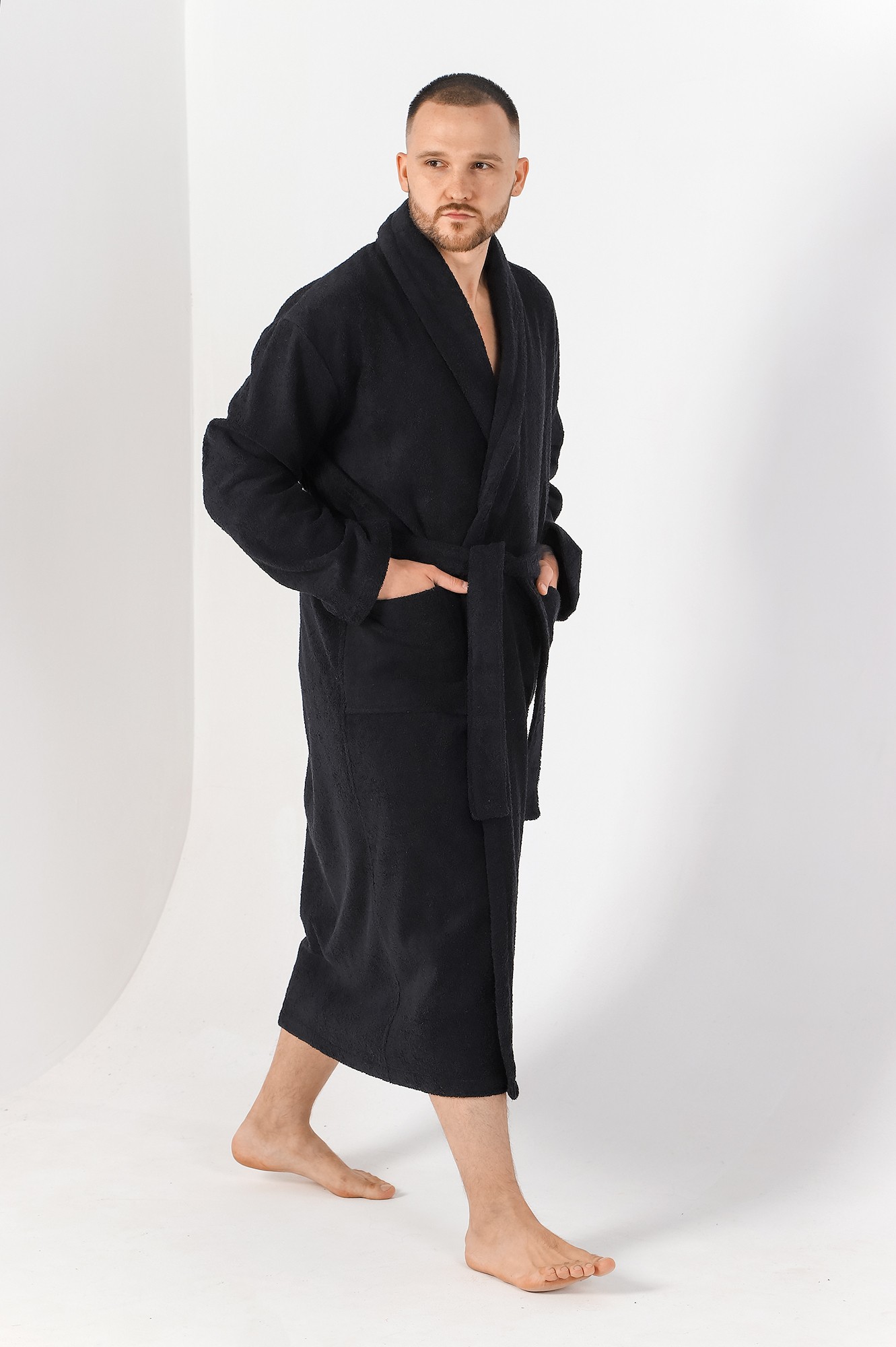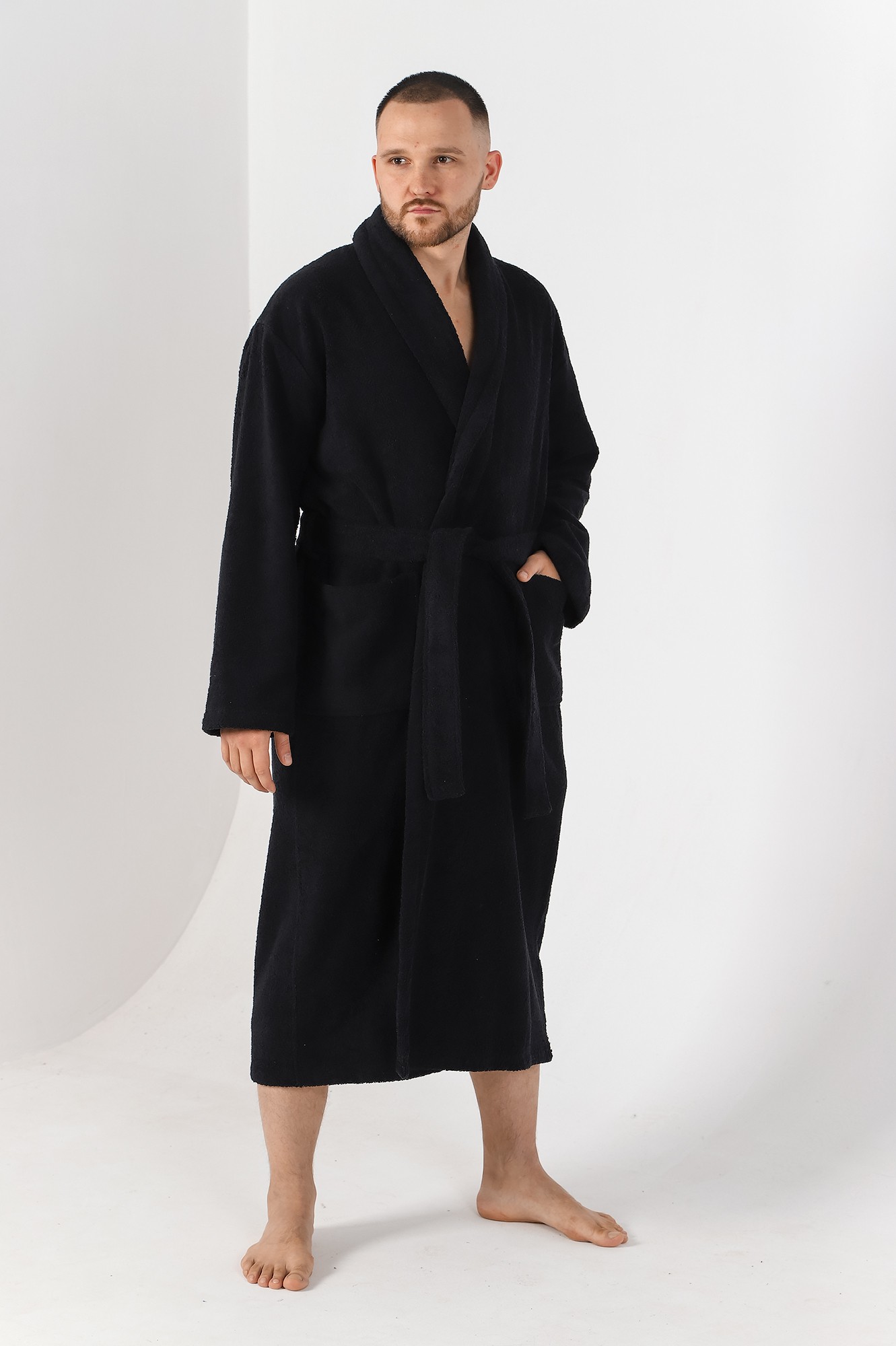 Мужской халат из двустороннего махрового хлопкового полотна. Модель на запах, с поясом в шлёвках, с боковыми карманами, с воротником "шаль", с петлей-вешалкой по горловине спинки.