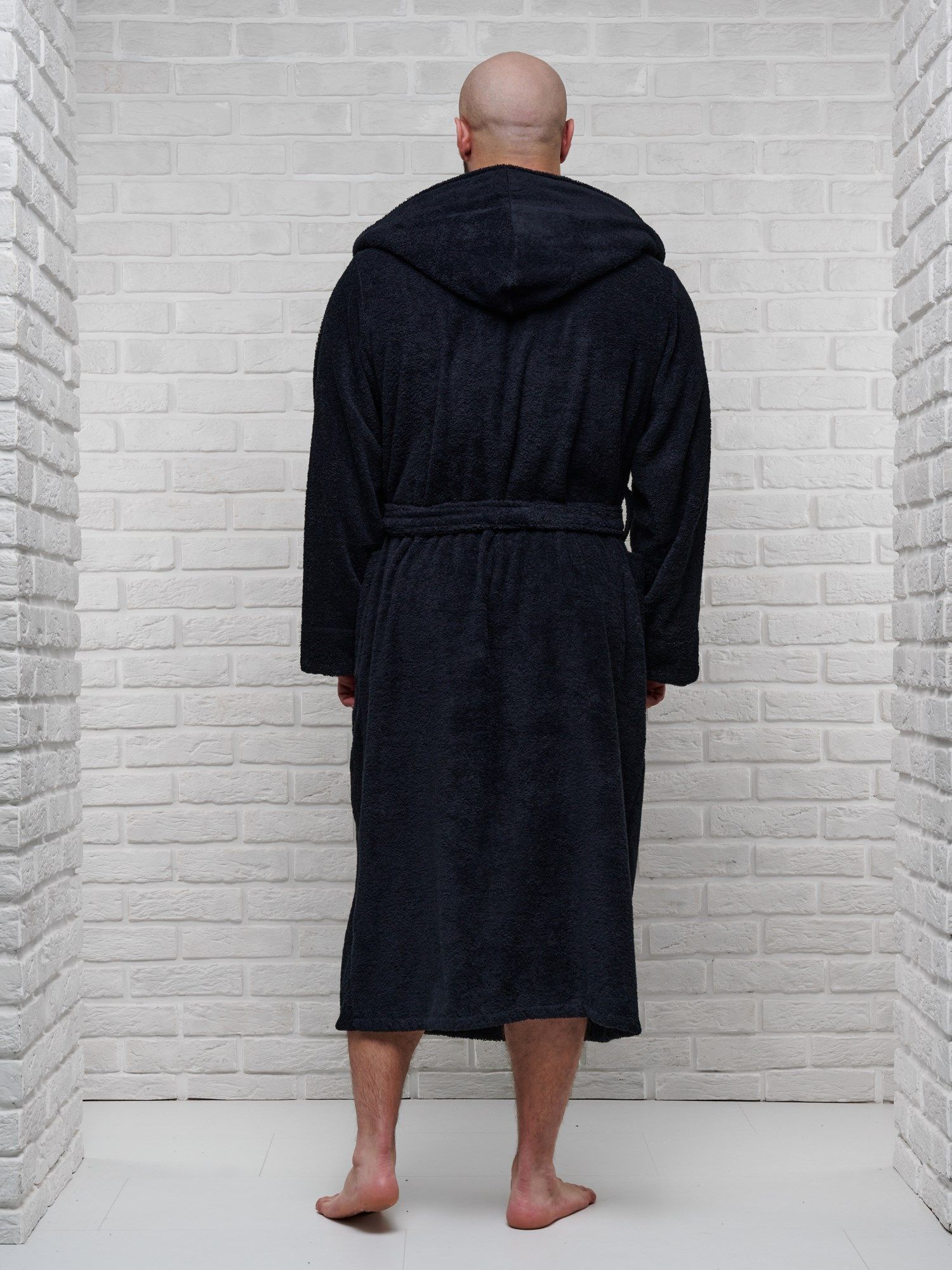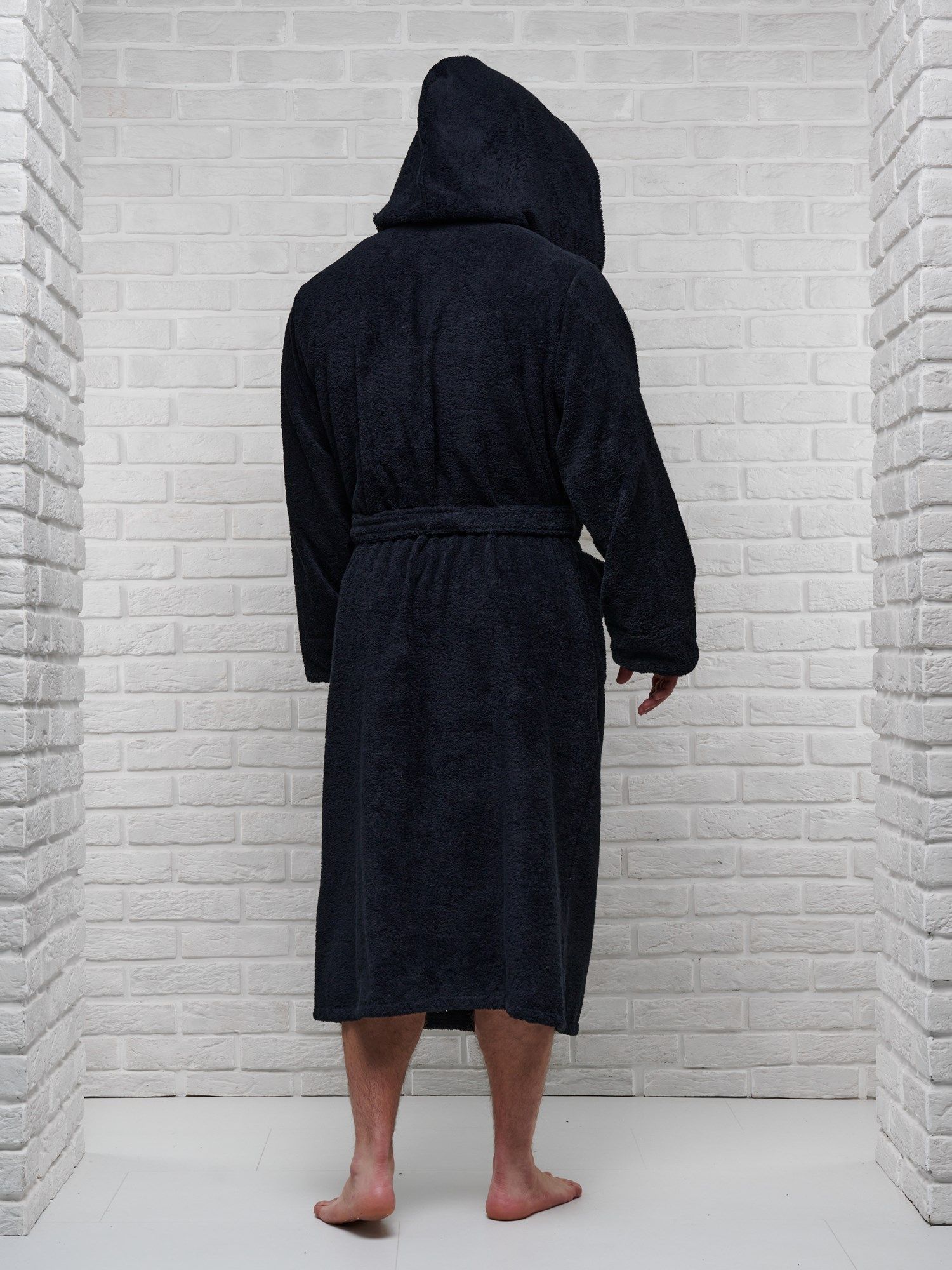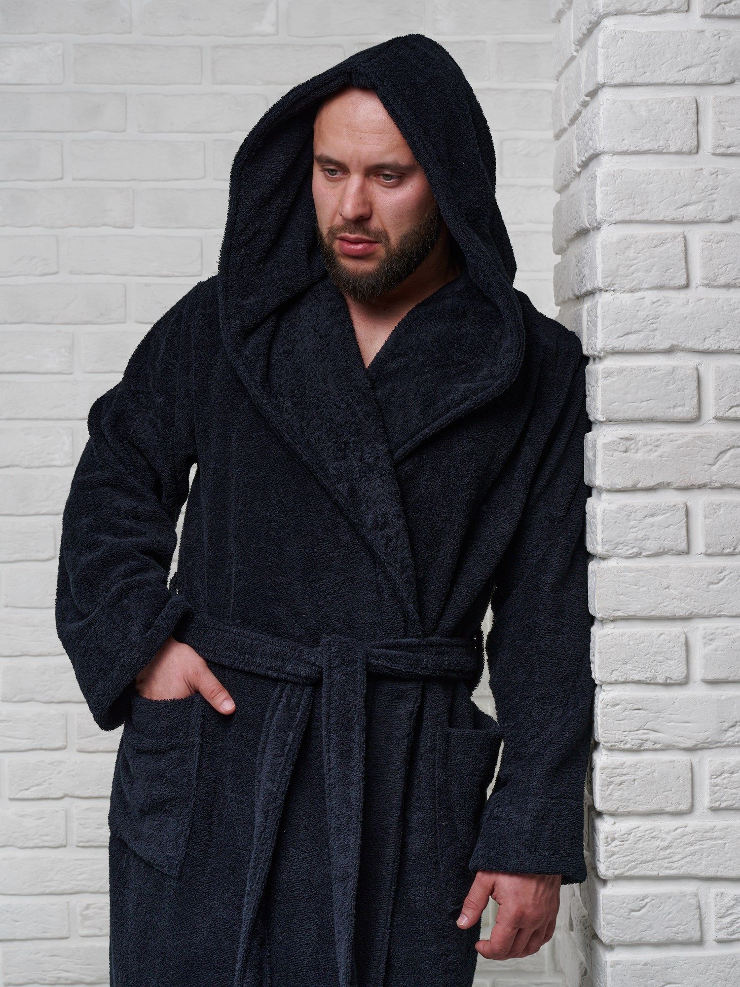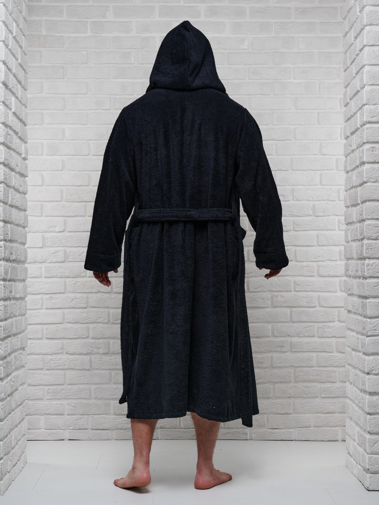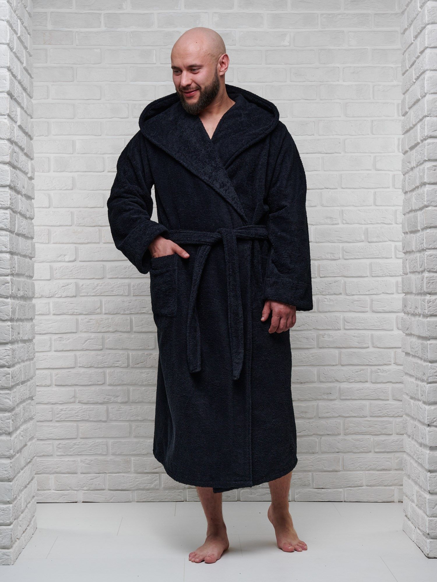 Модель халата с поясом позволяет ему быть универсальным и подходит к любому типу телосложения, скрывая недостатки и подчеркивая достоинства фигуры. Наличие карманов делает его практичным для ношения дома, в бане или сауне, а также на отдыхе.