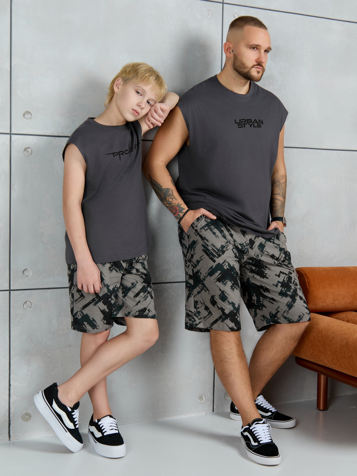 Костюм мужской, состоящий из майки и шорт. Майка однотонная с принтом на груди; модель свободная, со спущенной линией плеч и углубленной проймой. Шорты из полотна с набивным рисунком эксклюзивного дизайна, с боковыми карманами с обтачными входами, на притачном поясе с отстроченной эластичной тесьмой.