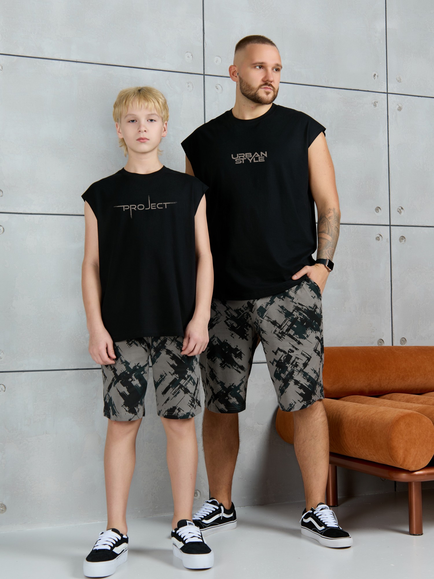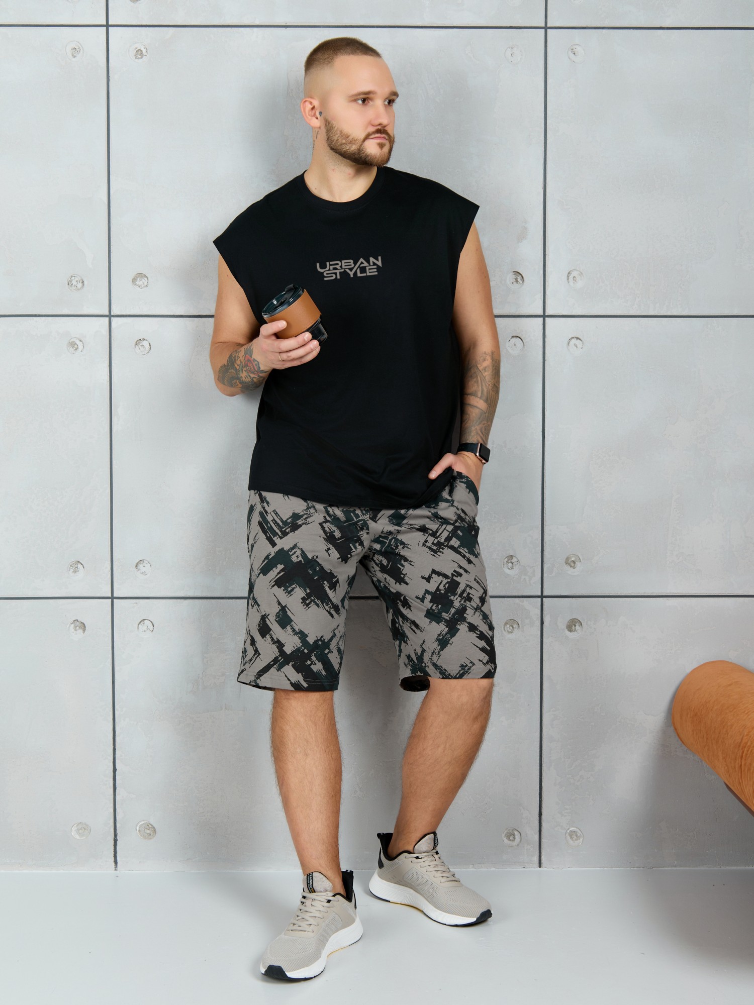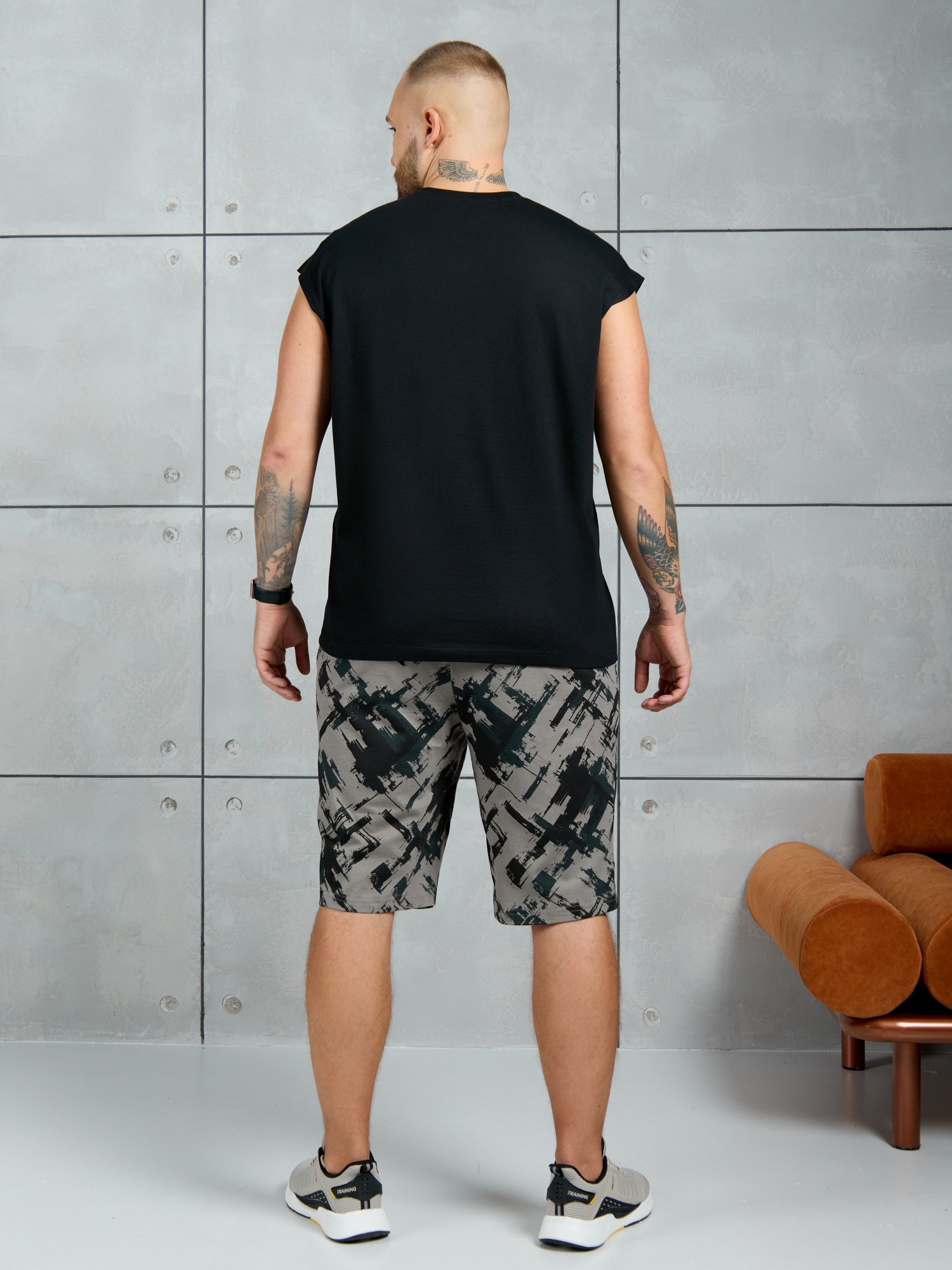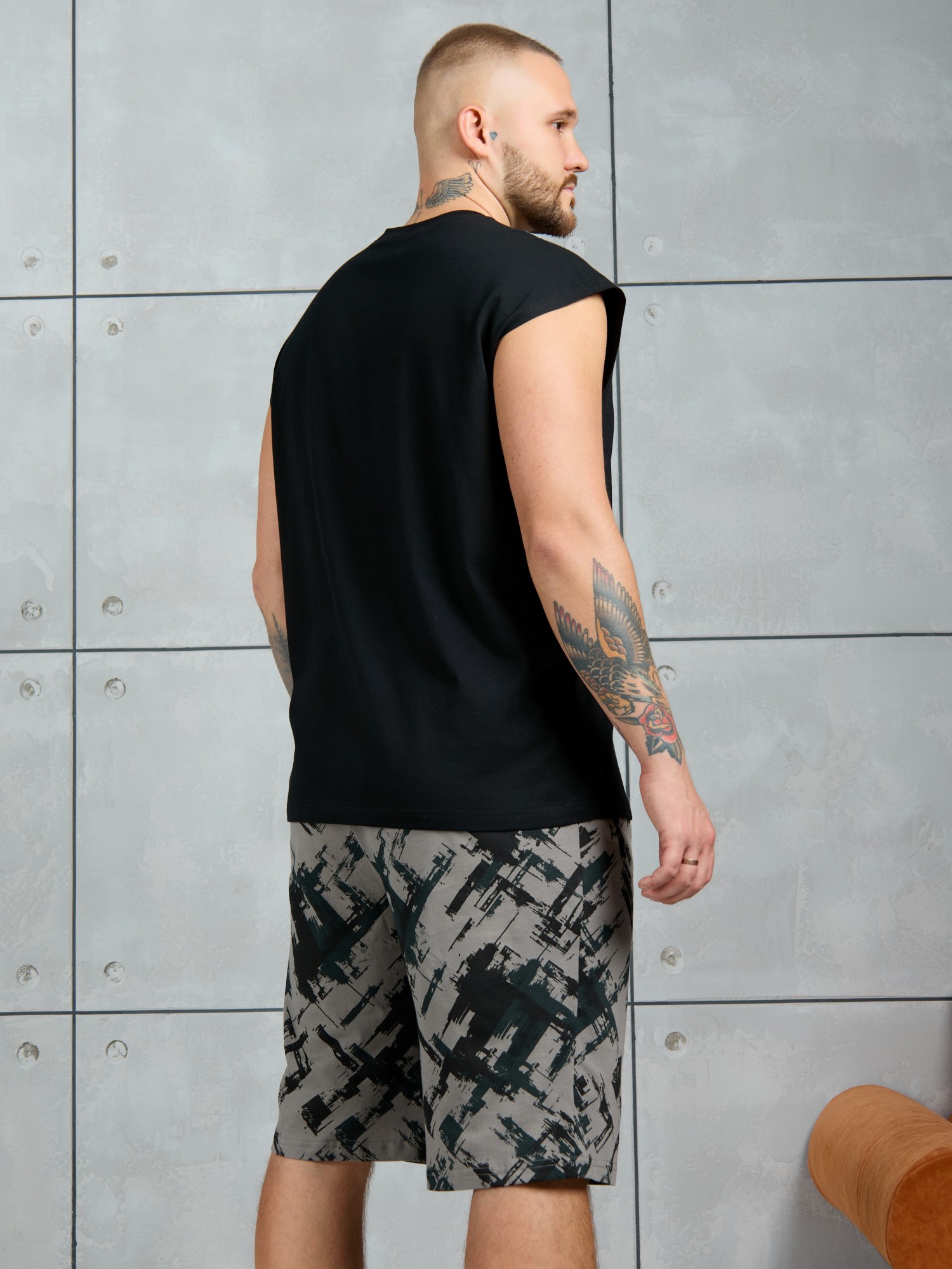 Костюм мужской, состоящий из майки и шорт. Майка однотонная с принтом на груди; модель свободная, со спущенной линией плеч и углубленной проймой. Шорты из полотна с набивным рисунком эксклюзивного дизайна, с боковыми карманами с обтачными входами, на притачном поясе с отстроченной эластичной тесьмой.