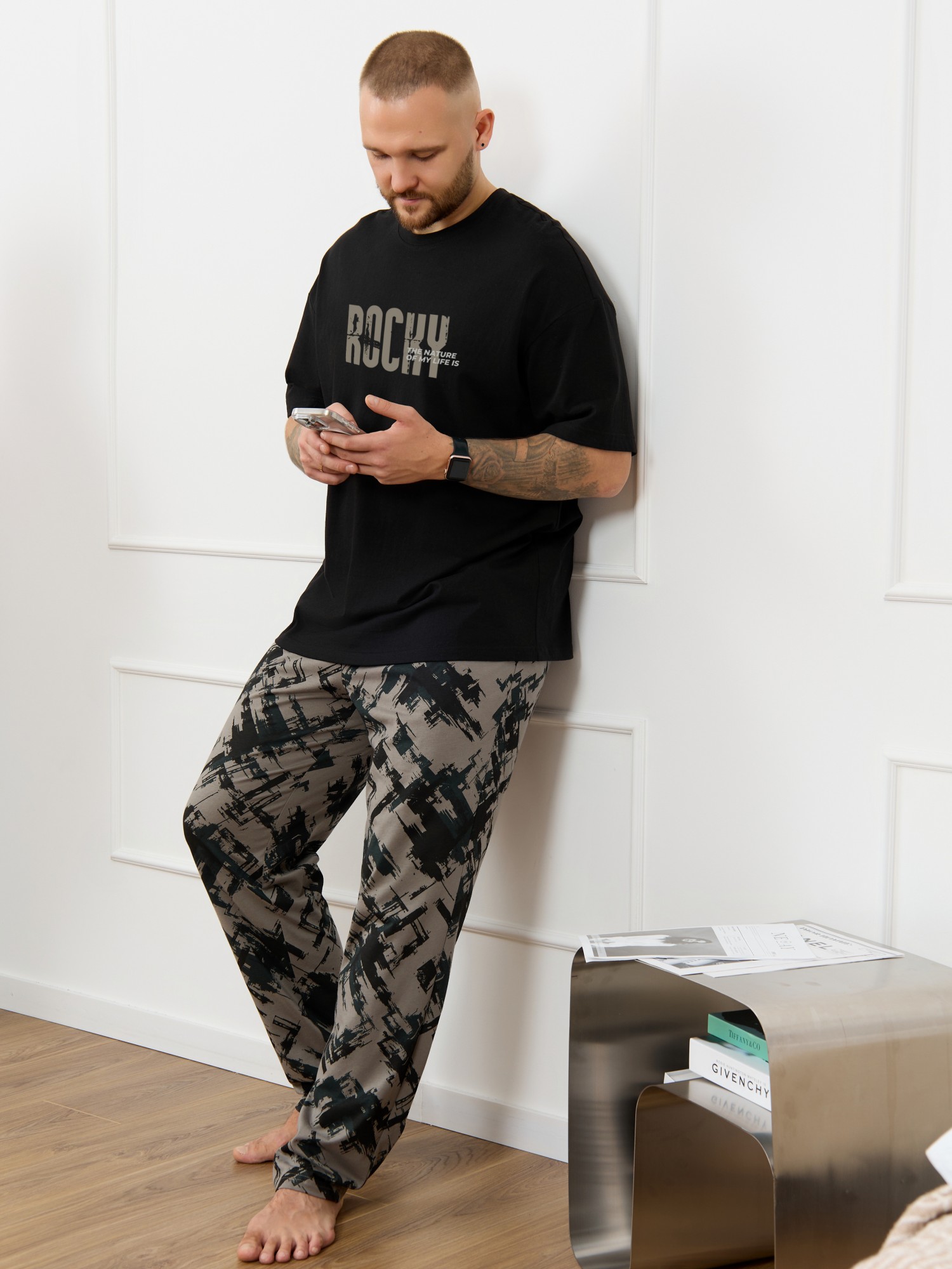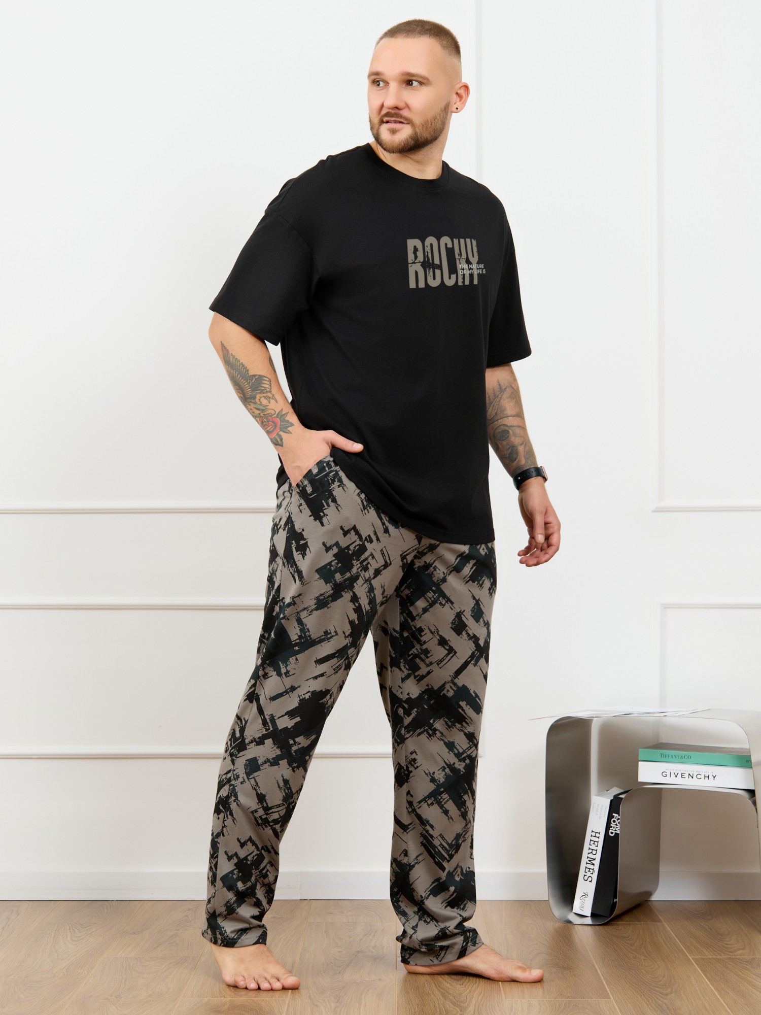 Костюм мужской, состоящий из футболки и брюк. Футболка однотонная с принтом на груди; модель свободная, со спущенной линией плеч, овальным вырезом горловины. Брюки из полотна с набивным рисунком эксклюзивного дизайна, прямые, с боковыми карманами с обтачными входами, на притачном поясе с отстроченной эластичной тесьмой.