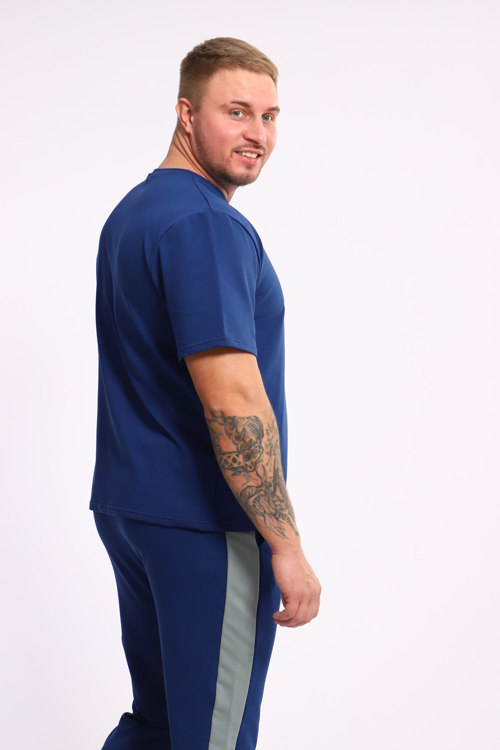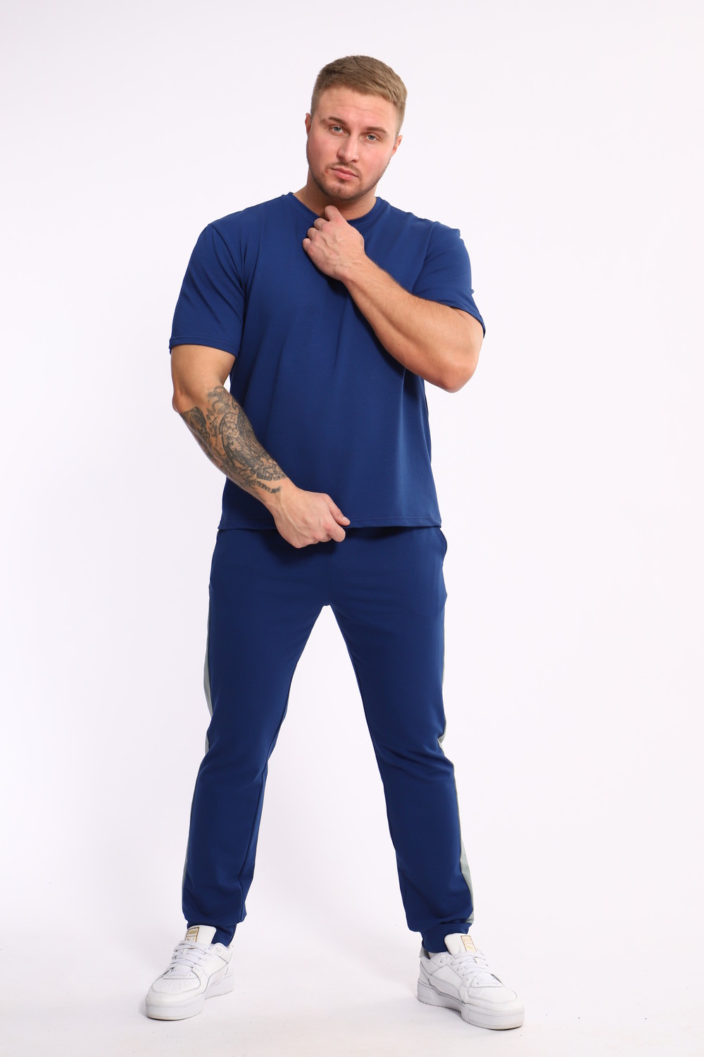 Стильный мужской костюм из мягкого и приятного на ощупь материала . Комплект состоит из футболки свободного кроя и комфортных прямых брюк с эластичным поясом и контрастной вставкой по бокам. Лаконичный дизайн делает этот костюм универсальным выбором для повседневной носки, прогулок или активного отдыха. Идеально сочетается с кроссовками для создания модного спортивного образа.