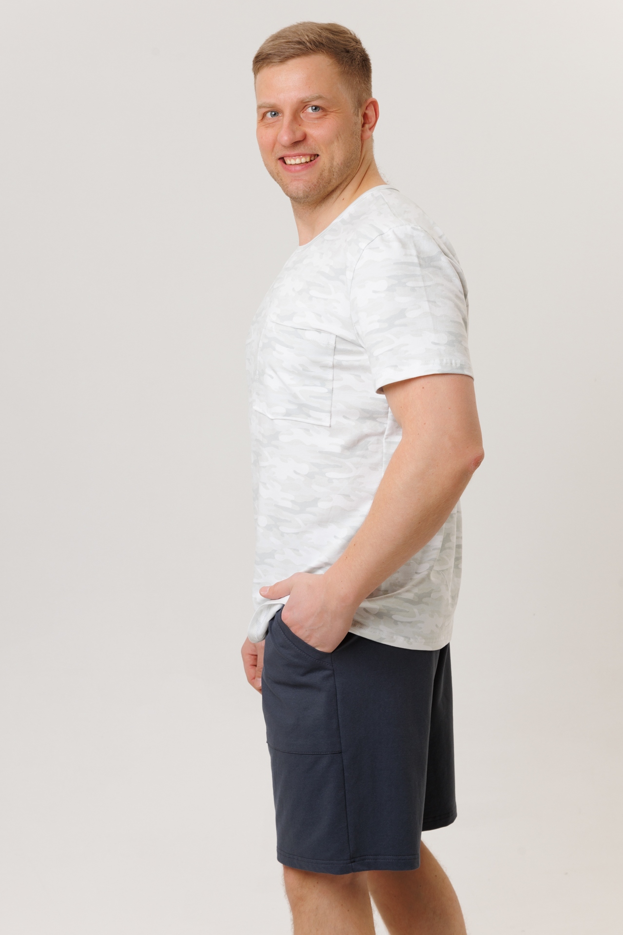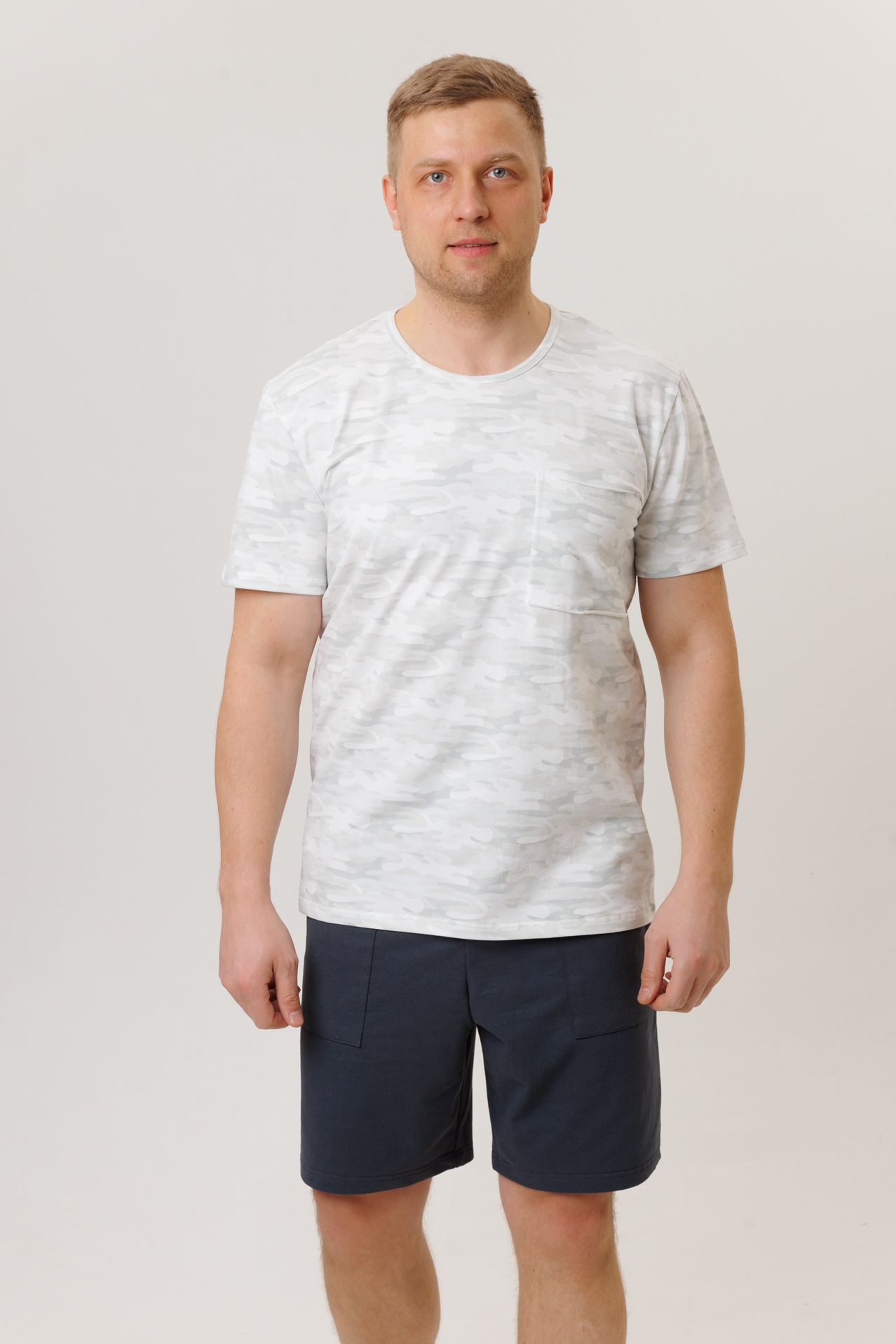 Мужской костюм состоит из футболки (кулирка с лайкрой) и шорт (футер).