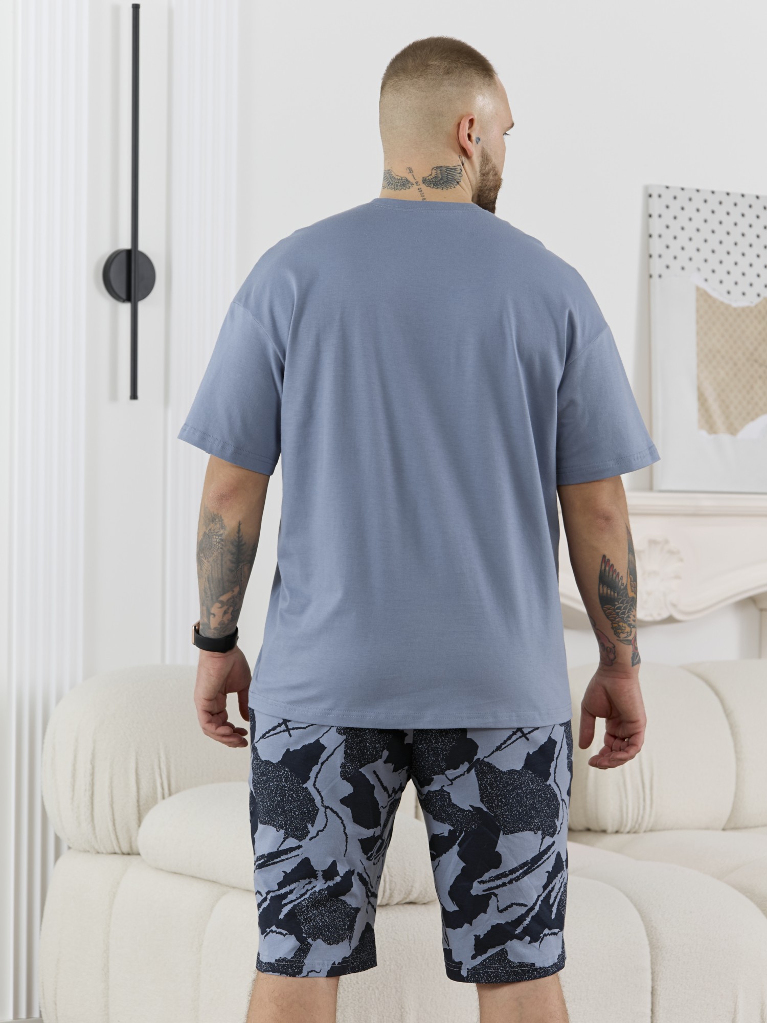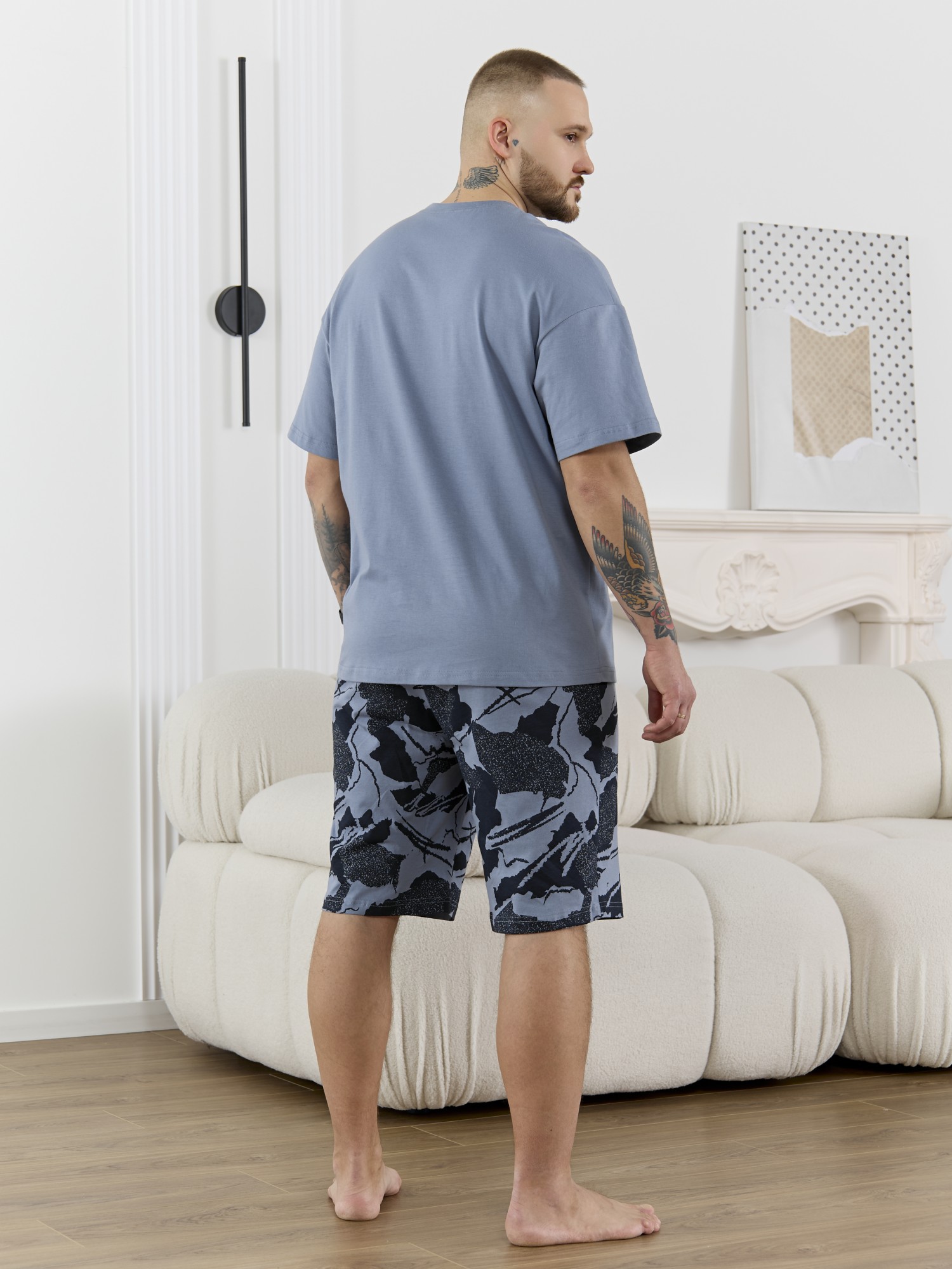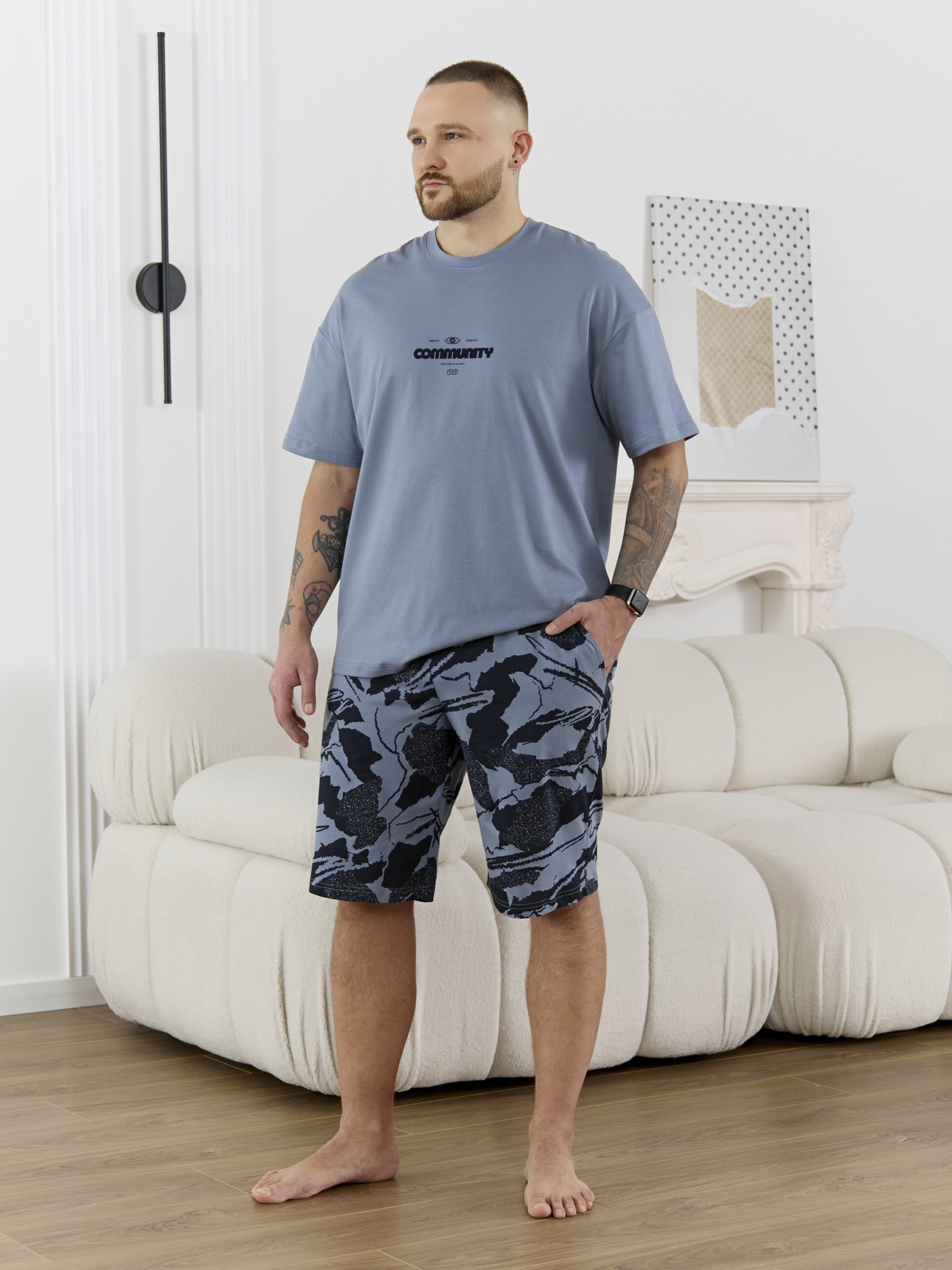 Костюм мужской, состоящий из футболки и шорт. Футболка однотонная с принтом на груди; модель свободная, со спущенной линией плеч, втачными рукавами, овальным вырезом горловины. Шорты из полотна с набивным рисунком эксклюзивного дизайна, с боковыми карманами с обтачными входами, на притачном поясе с отстроченной эластичной тесьмой.