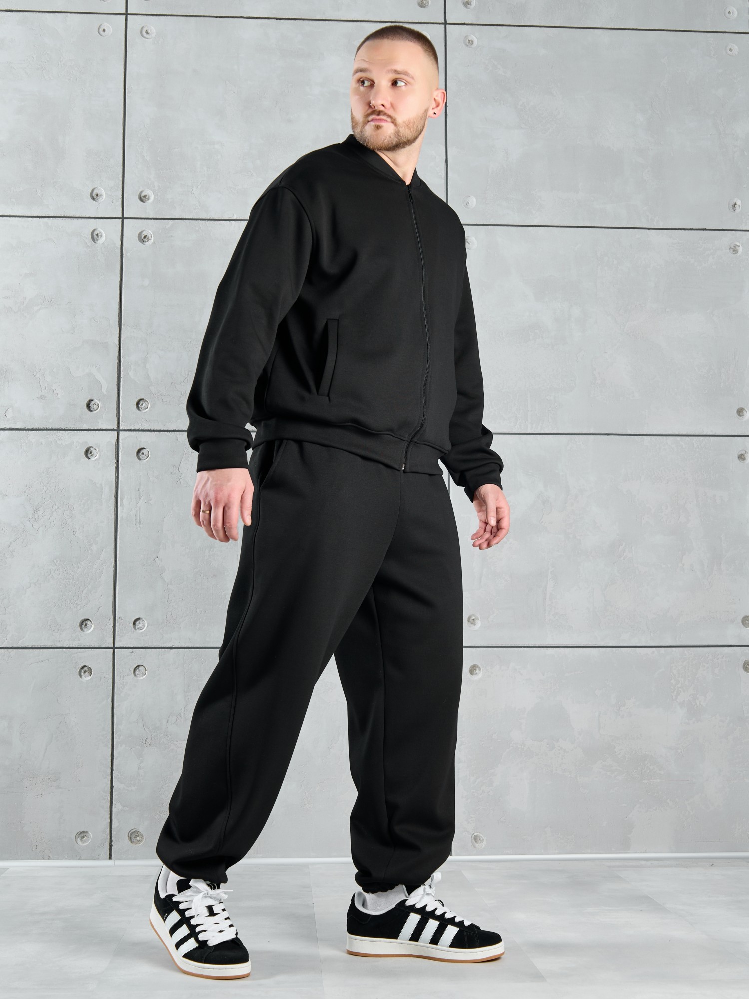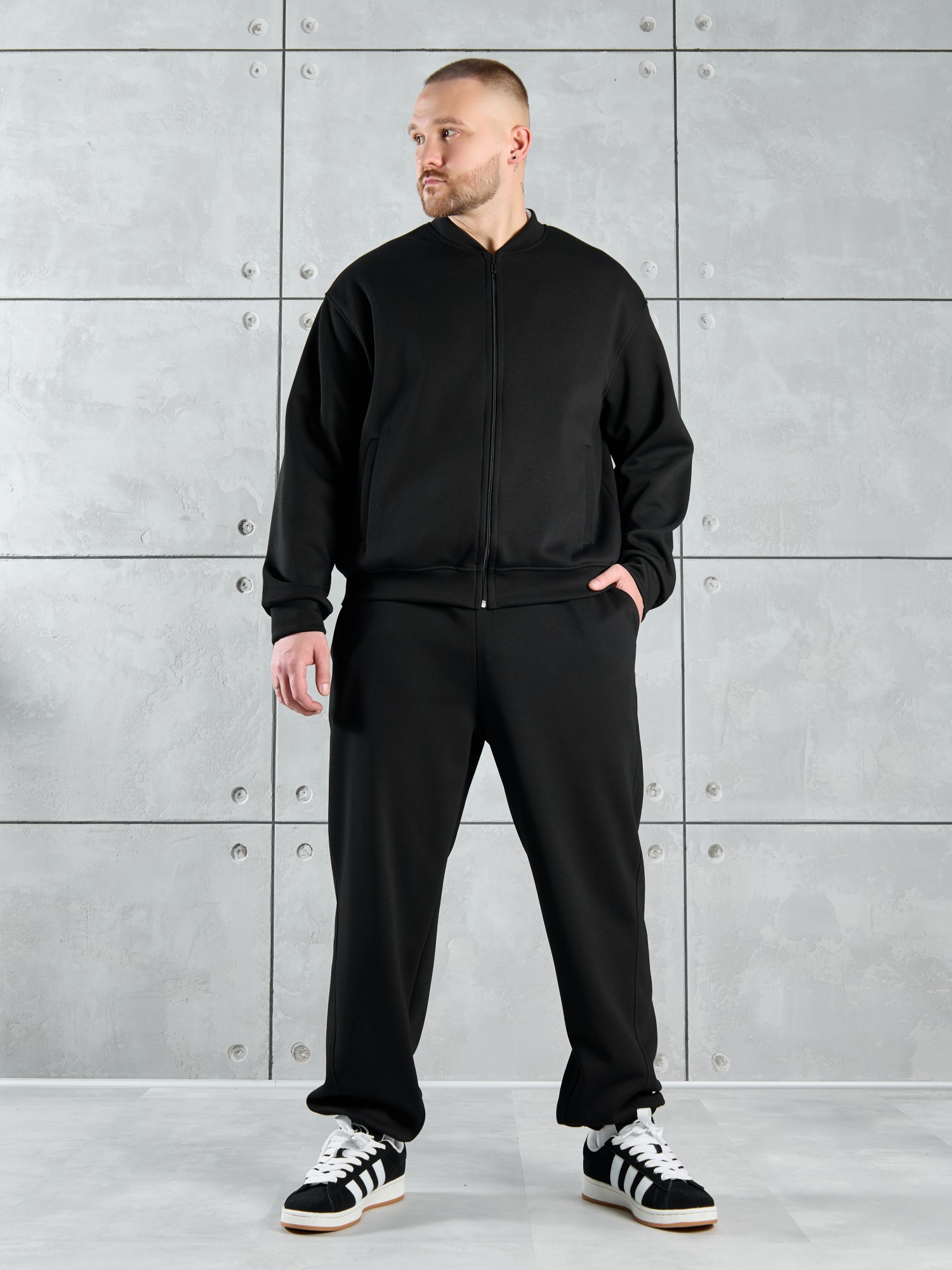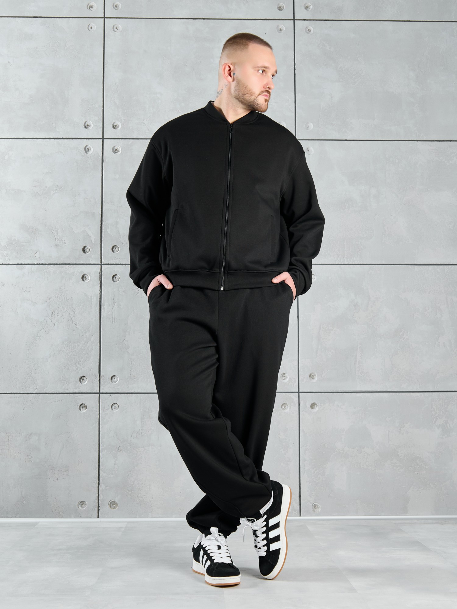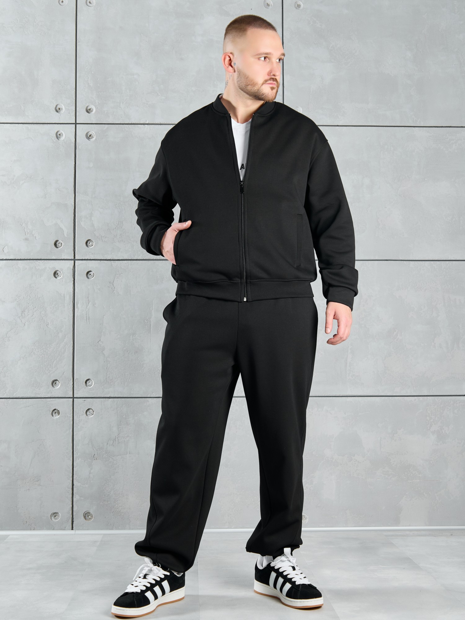 Костюм мужской из трикотажного полотна "лининг", состоящий из бомбера и брюк. Бомбер - с длинными втачными рукавами с притачными манжетами, прорезными карманами с листочками на полочках, центральной бортовой застежкой на тесьму "молния", втачным воротником-стойкой с закругленными концами и притачным поясом по низу. По шву притачивания пояса и проймам настрочены отделочные строчки. Брюки - свободного покроя, со смещенными к центрам передних половин боковыми швами, карманами в боковых швах и притачным поясом с эластичной тесьмой внутри. Нижние срезы обработаны подгибкой с эластичной тесьмой. Для регулирования степени прилегания изделия по талии предусмотрен шнурок, вставленный через две обметанные петли в центре пояса спереди.