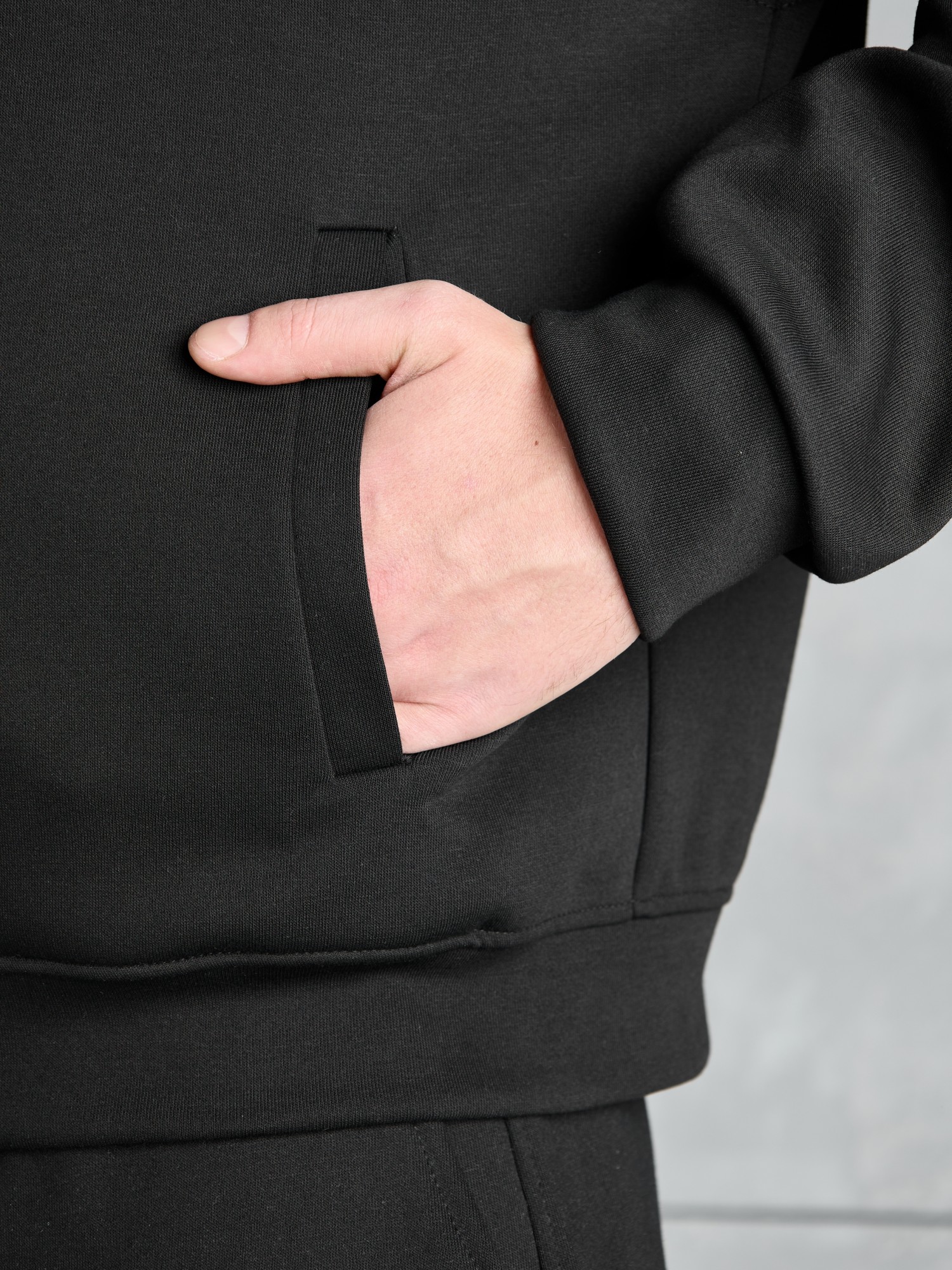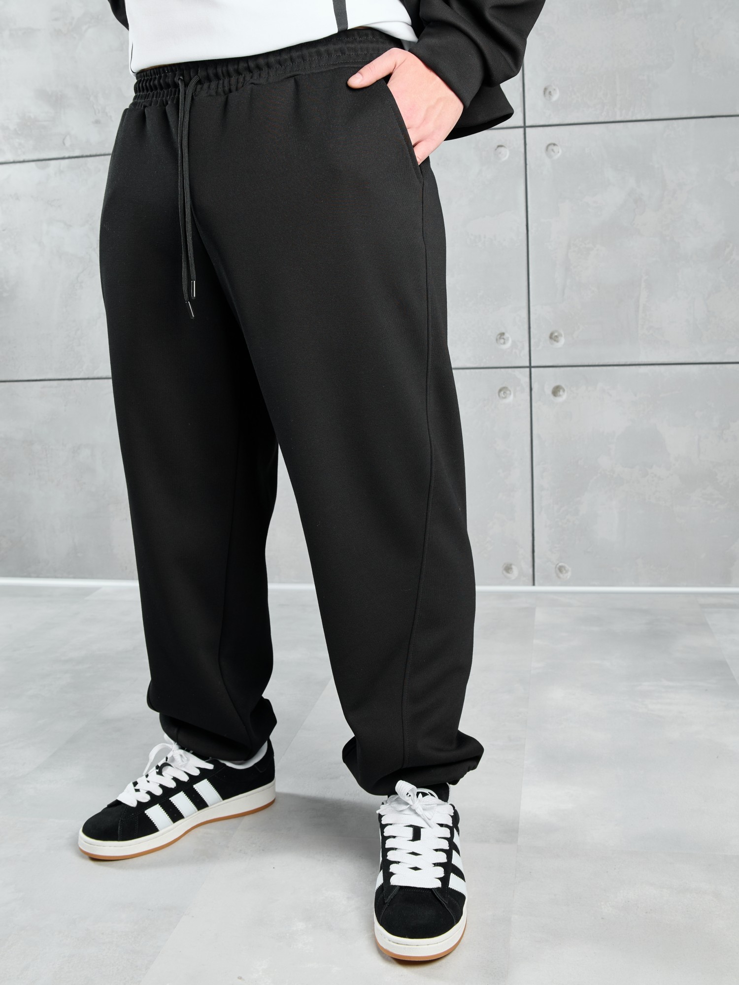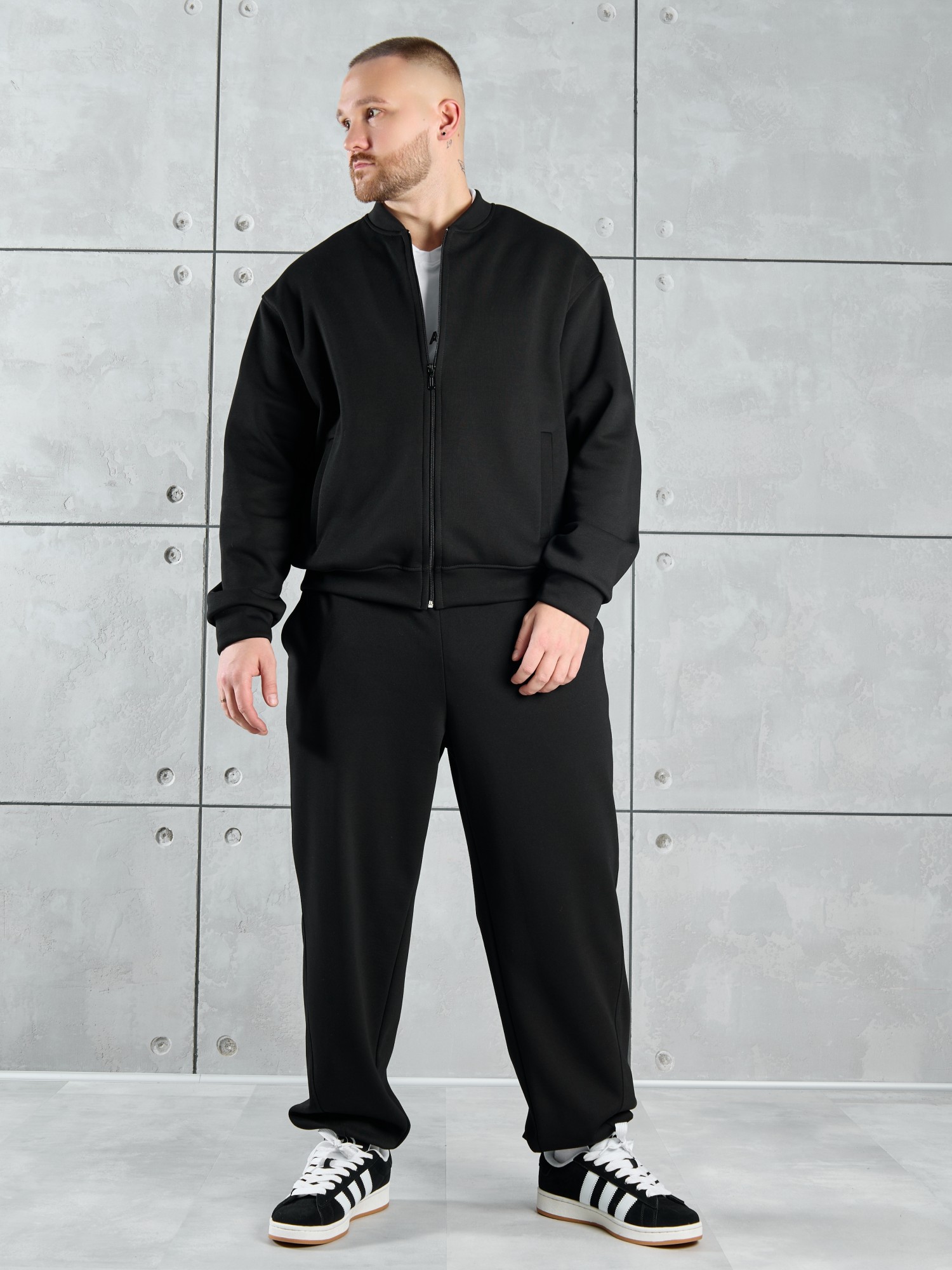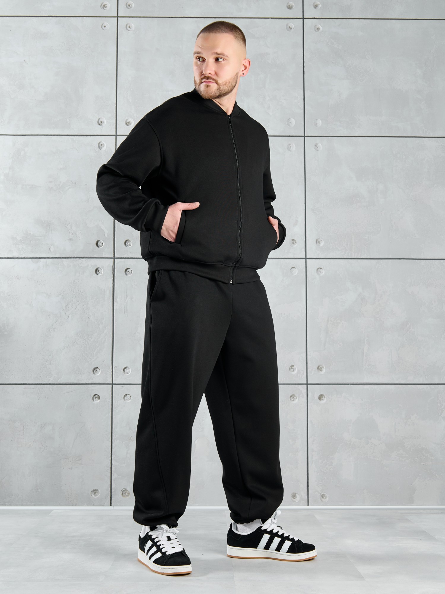 Костюм мужской из трикотажного полотна "лининг", состоящий из бомбера и брюк. Бомбер - с длинными втачными рукавами с притачными манжетами, прорезными карманами с листочками на полочках, центральной бортовой застежкой на тесьму "молния", втачным воротником-стойкой с закругленными концами и притачным поясом по низу. По шву притачивания пояса и проймам настрочены отделочные строчки. Брюки - свободного покроя, со смещенными к центрам передних половин боковыми швами, карманами в боковых швах и притачным поясом с эластичной тесьмой внутри. Нижние срезы обработаны подгибкой с эластичной тесьмой. Для регулирования степени прилегания изделия по талии предусмотрен шнурок, вставленный через две обметанные петли в центре пояса спереди.